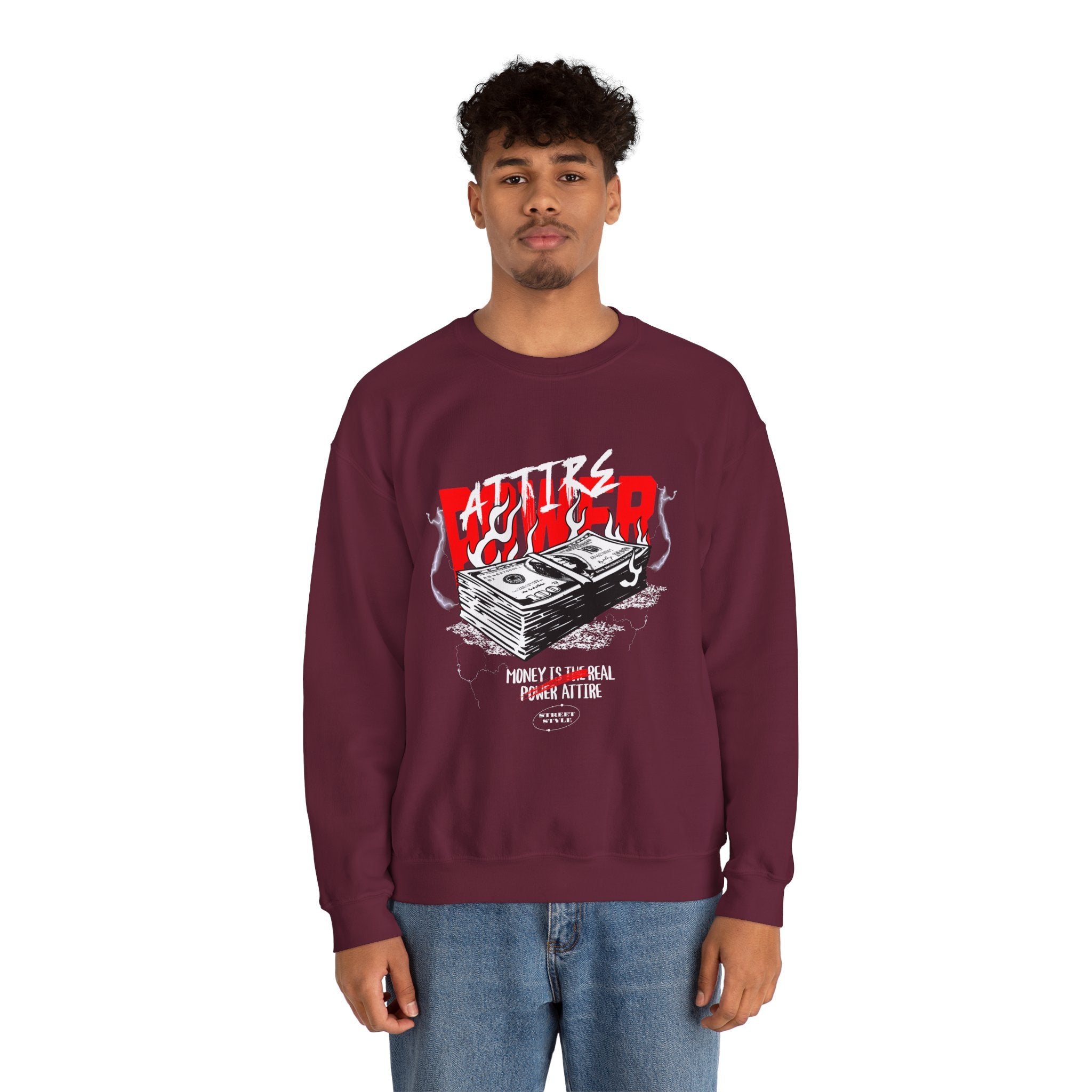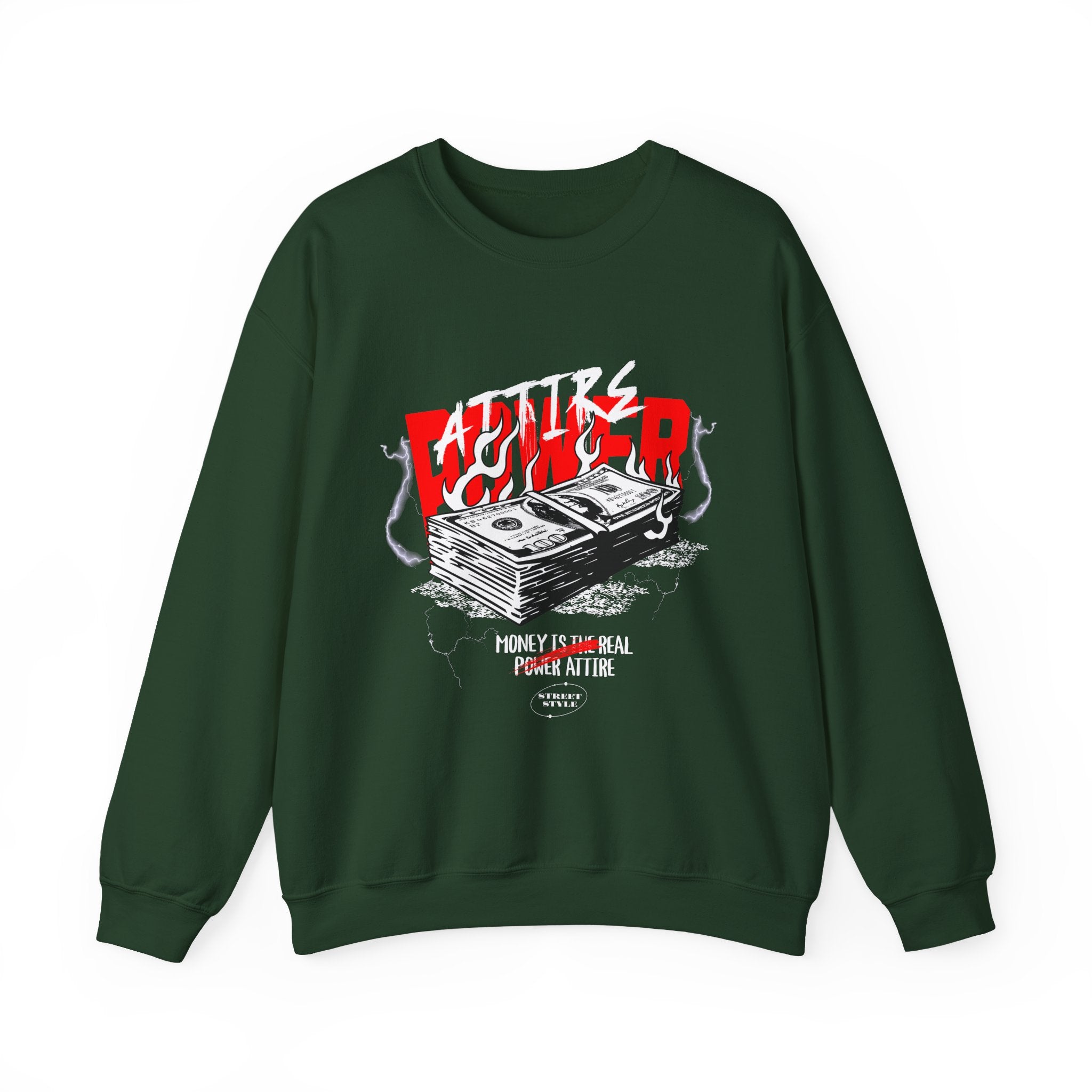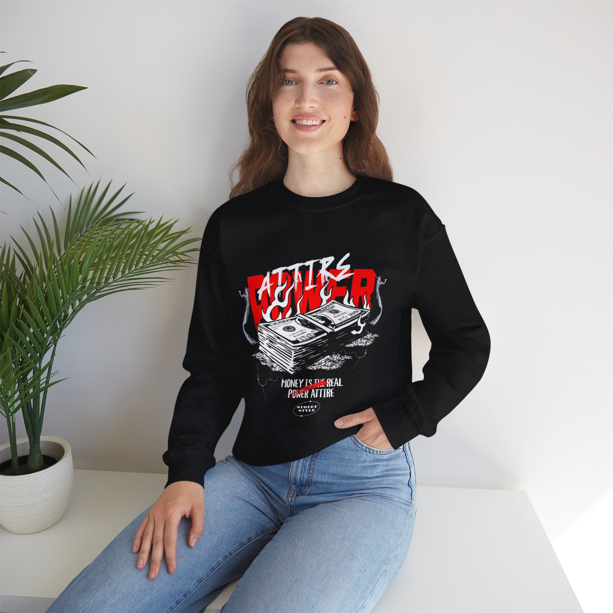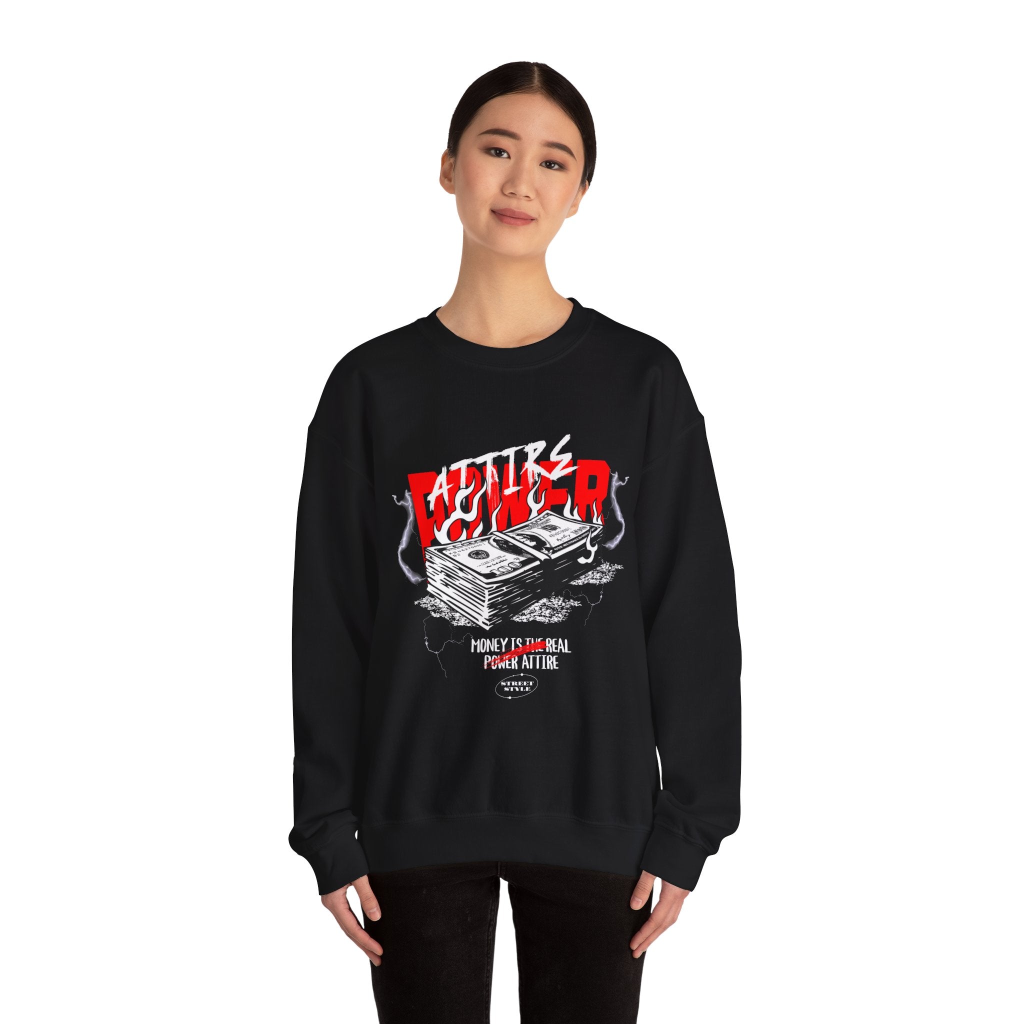 The Attire Power Unisex Heavy Blend™ Crewneck Sweatshirt represents the fusion of wealth, hustle, and ambition in modern streetwear. Featuring a bold money stack graphic with electrifying red and black accents, this sweatshirt is the perfect expression of financial drive and alpha energy.