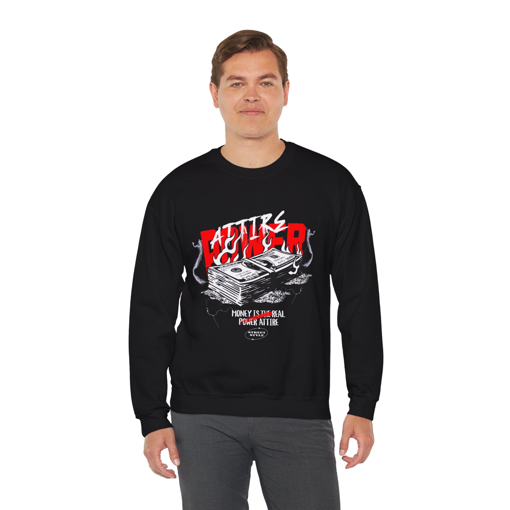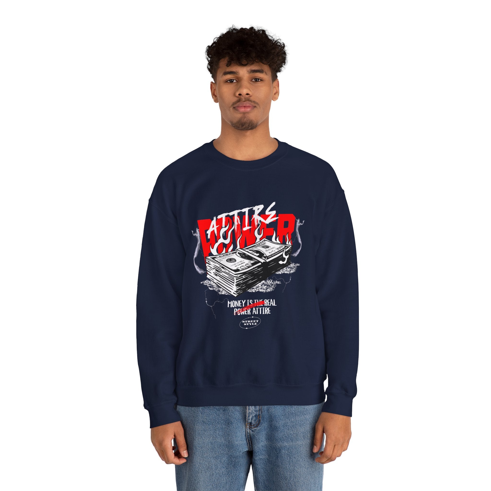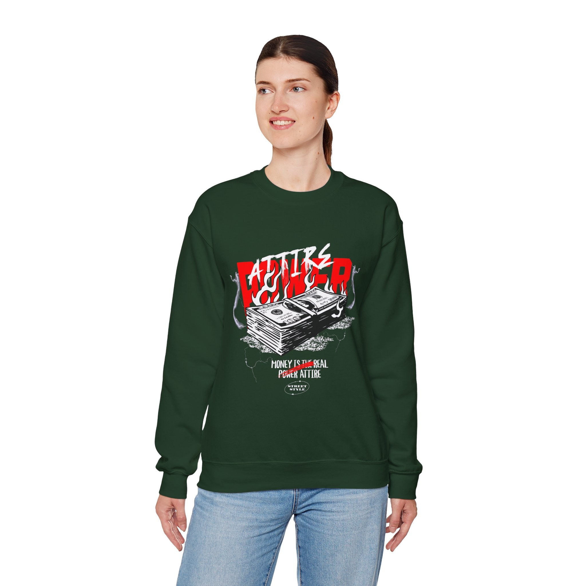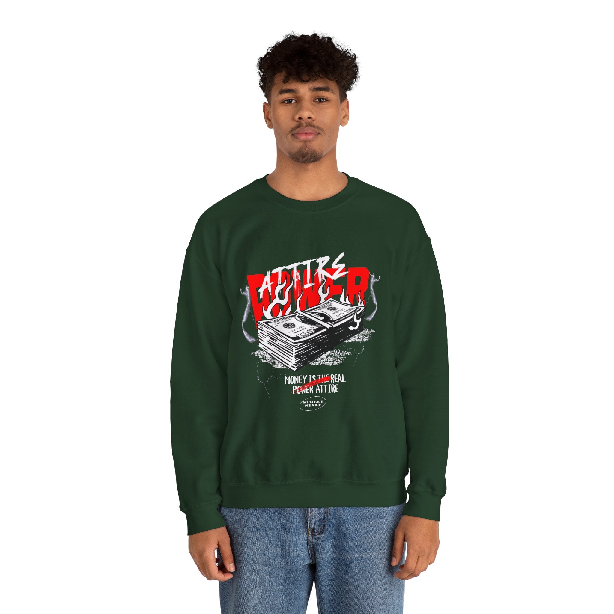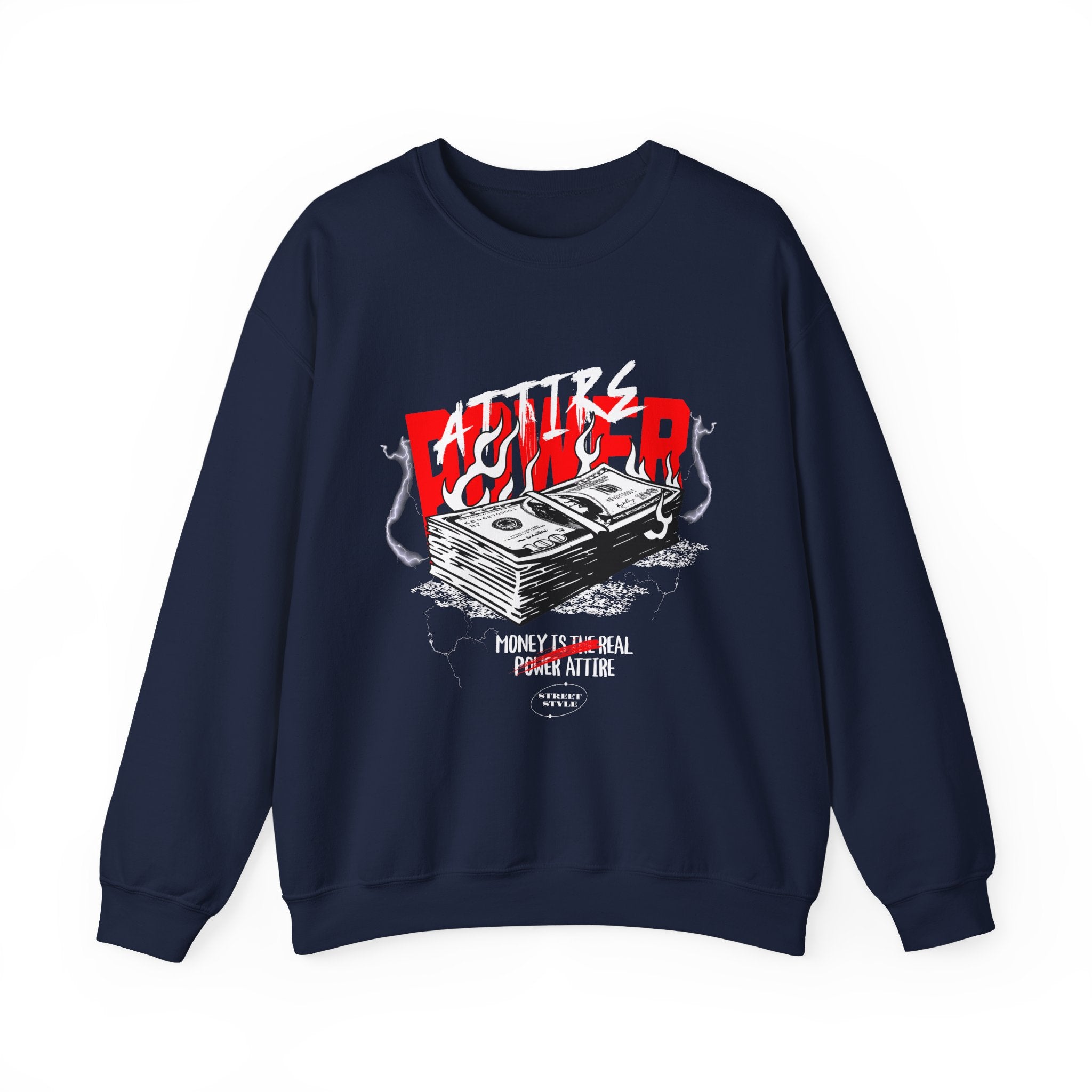 The Attire Power Unisex Heavy Blend™ Crewneck Sweatshirt represents the fusion of wealth, hustle, and ambition in modern streetwear. Featuring a bold money stack graphic with electrifying red and black accents, this sweatshirt is the perfect expression of financial drive and alpha energy.