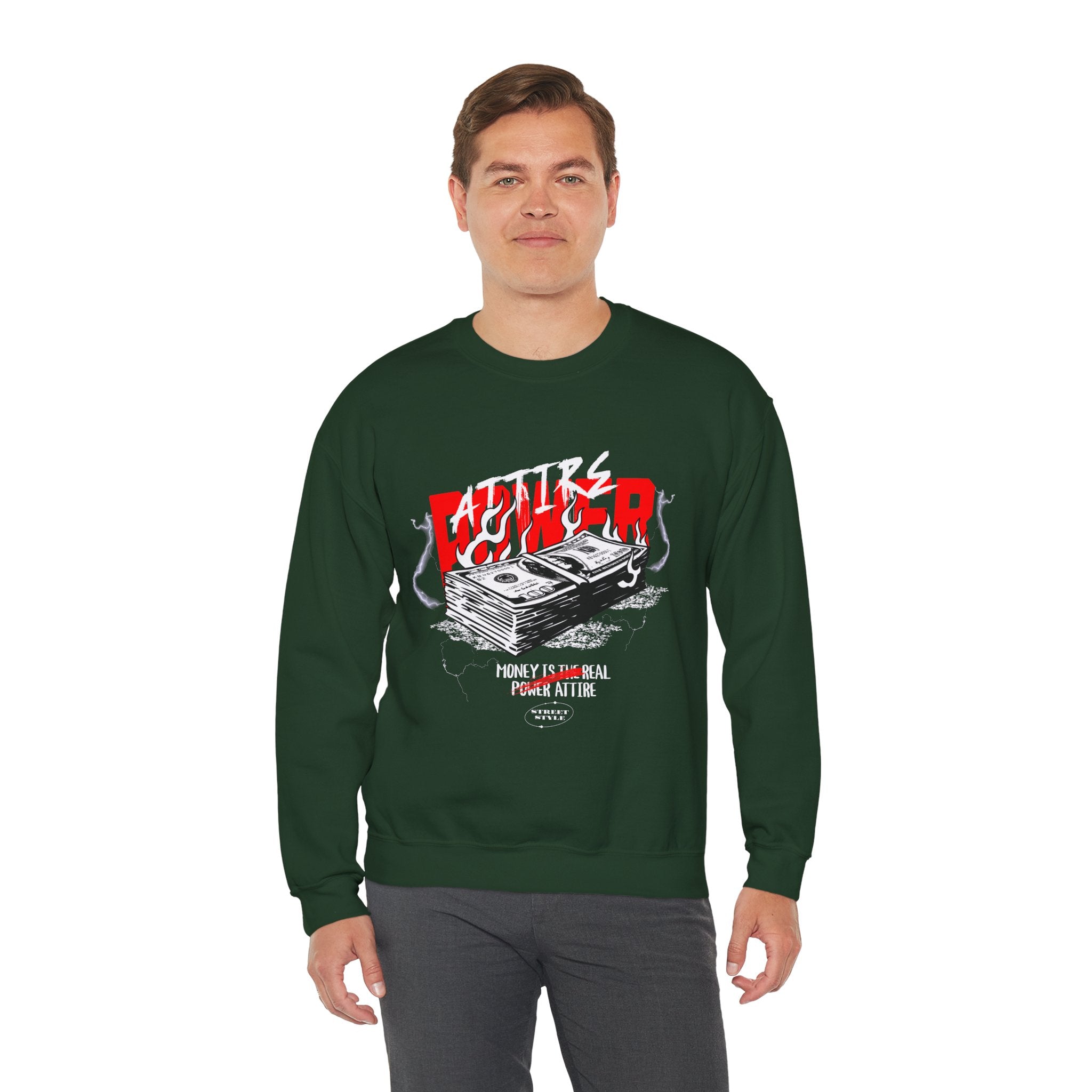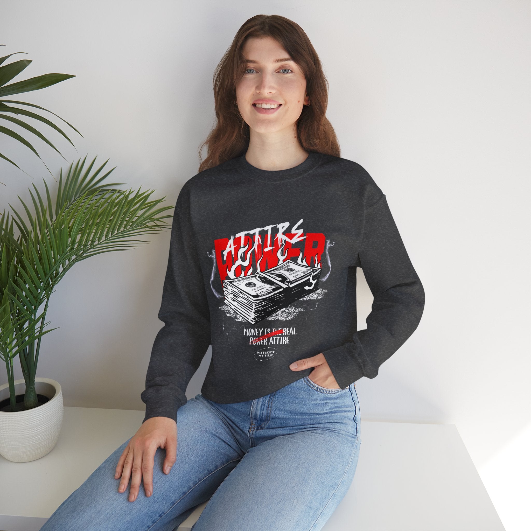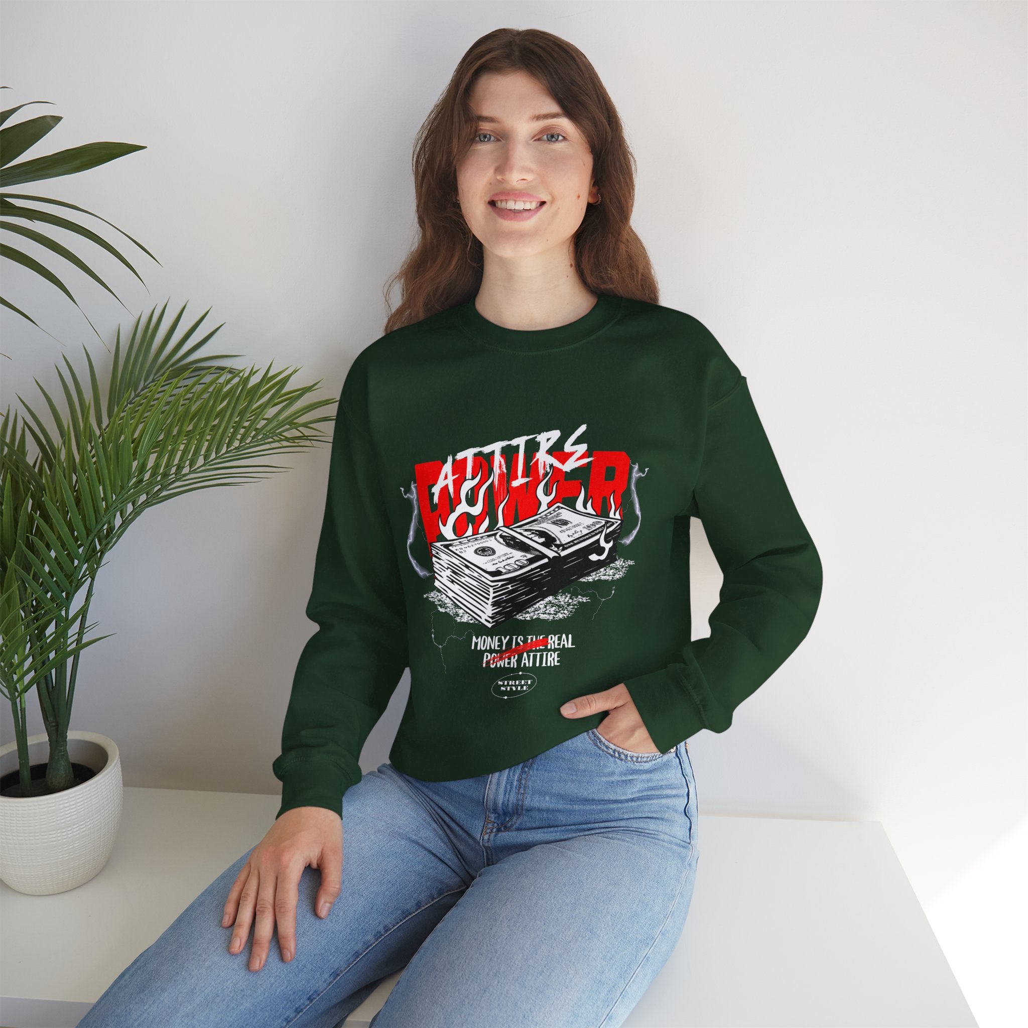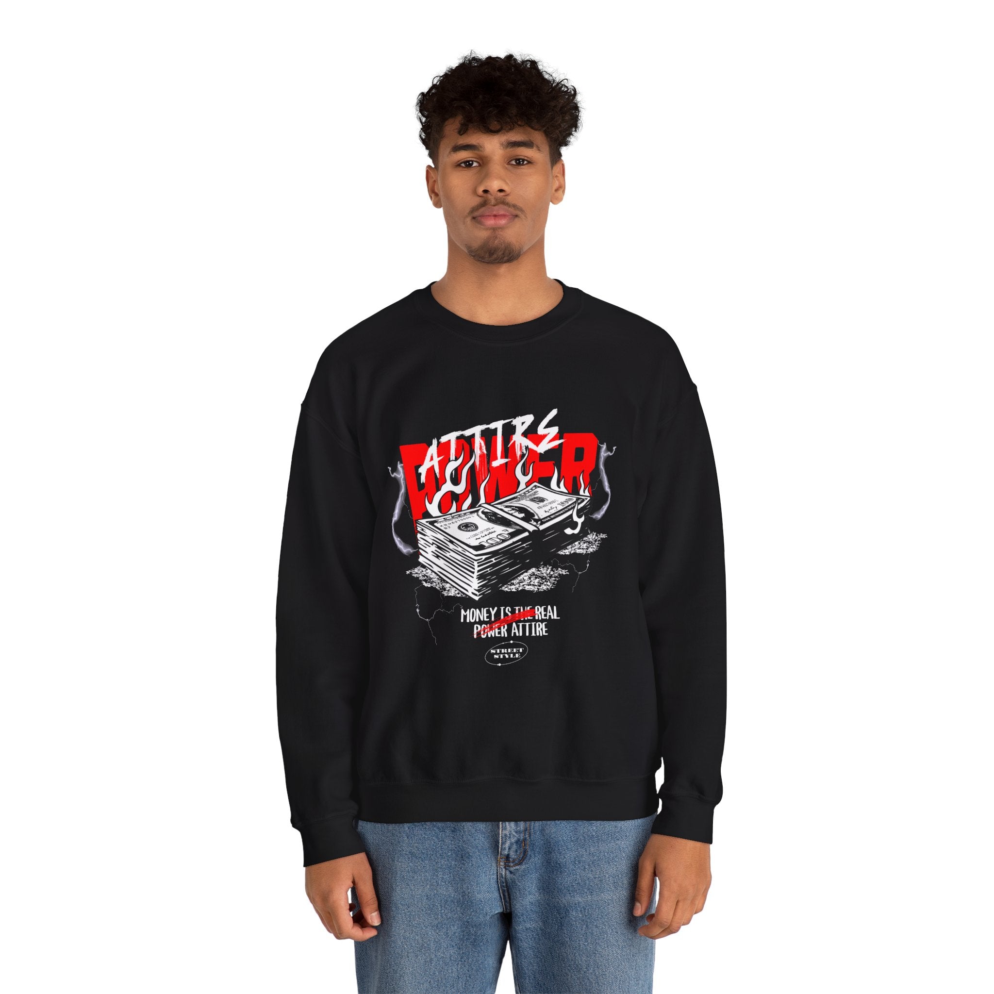 The Attire Power Unisex Heavy Blend™ Crewneck Sweatshirt represents the fusion of wealth, hustle, and ambition in modern streetwear. Featuring a bold money stack graphic with electrifying red and black accents, this sweatshirt is the perfect expression of financial drive and alpha energy.