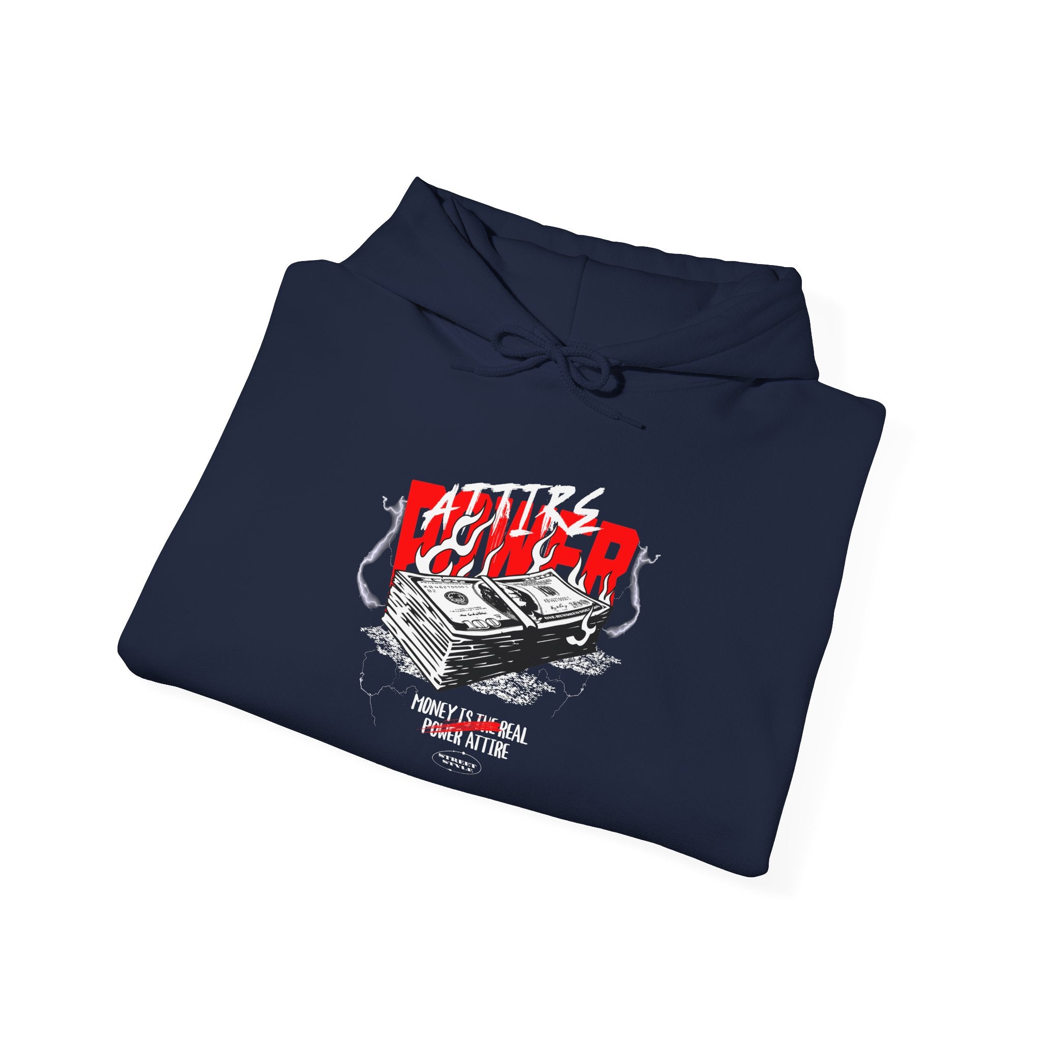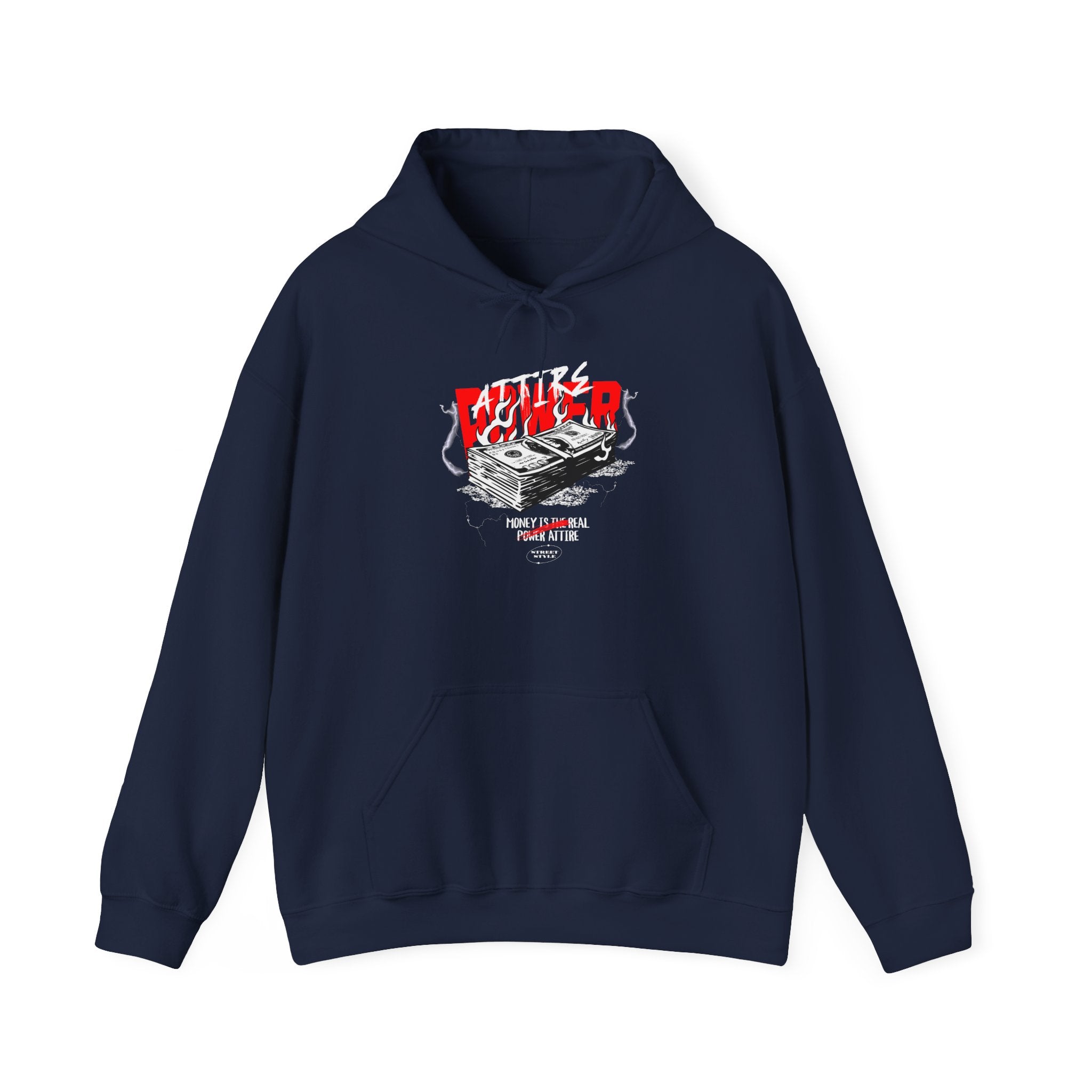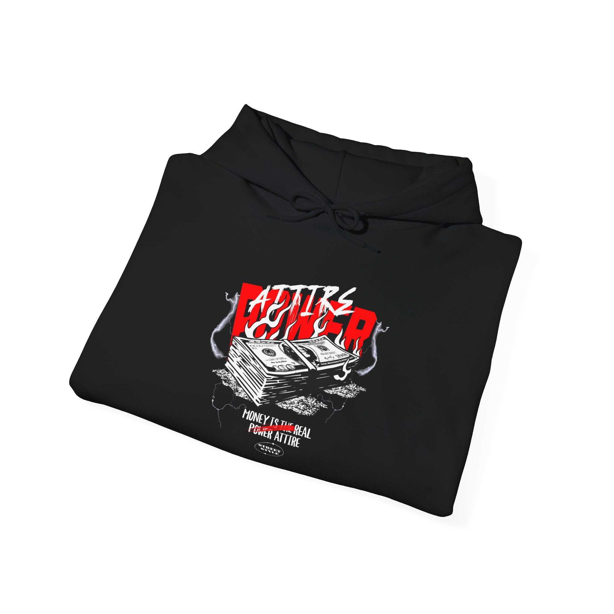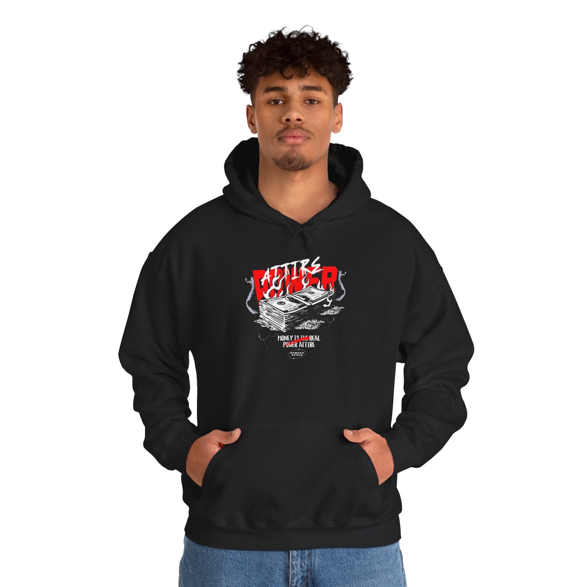 The Attire Power Unisex Heavy Blend™ Hooded Sweatshirt embodies the energy of wealth, hustle, and ambition. Featuring a stack of money with bold red and black electrified details, this hoodie is designed for entrepreneurs, hustlers, and streetwear fans who live by the mindset that money is the ultimate power attire.