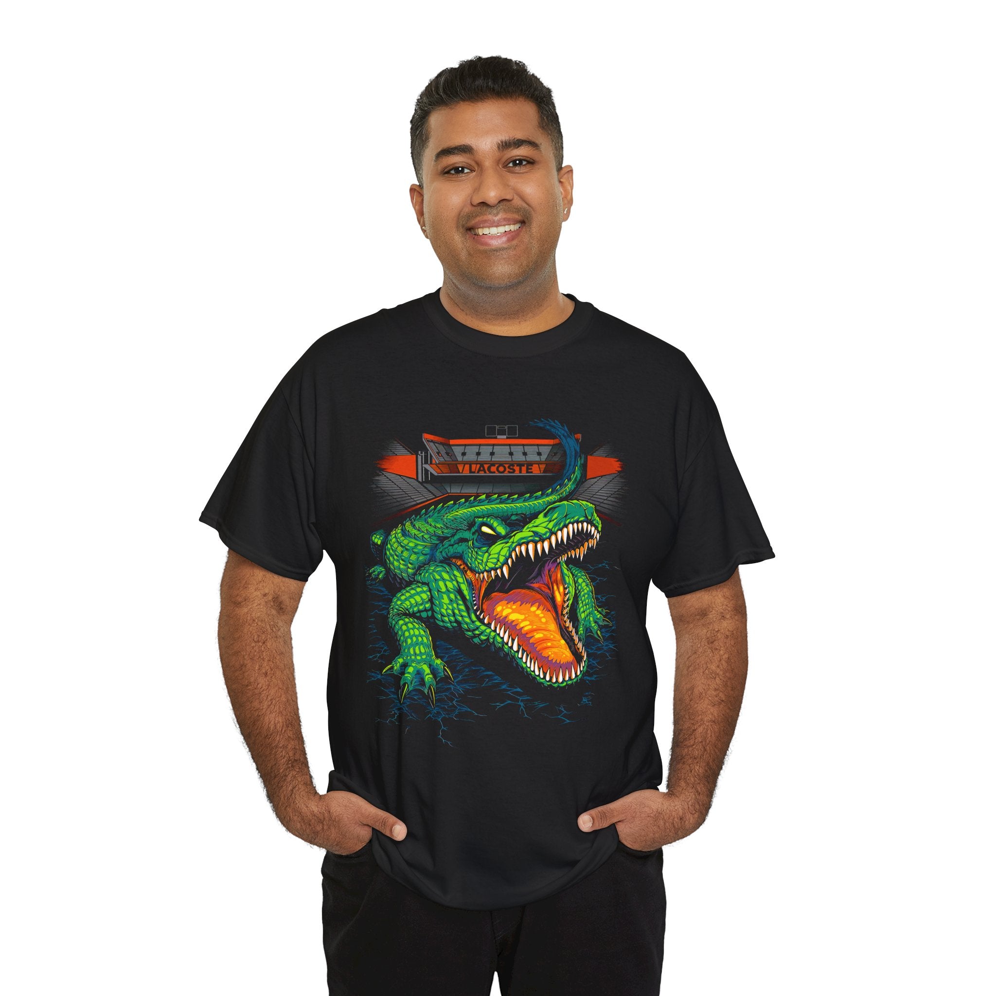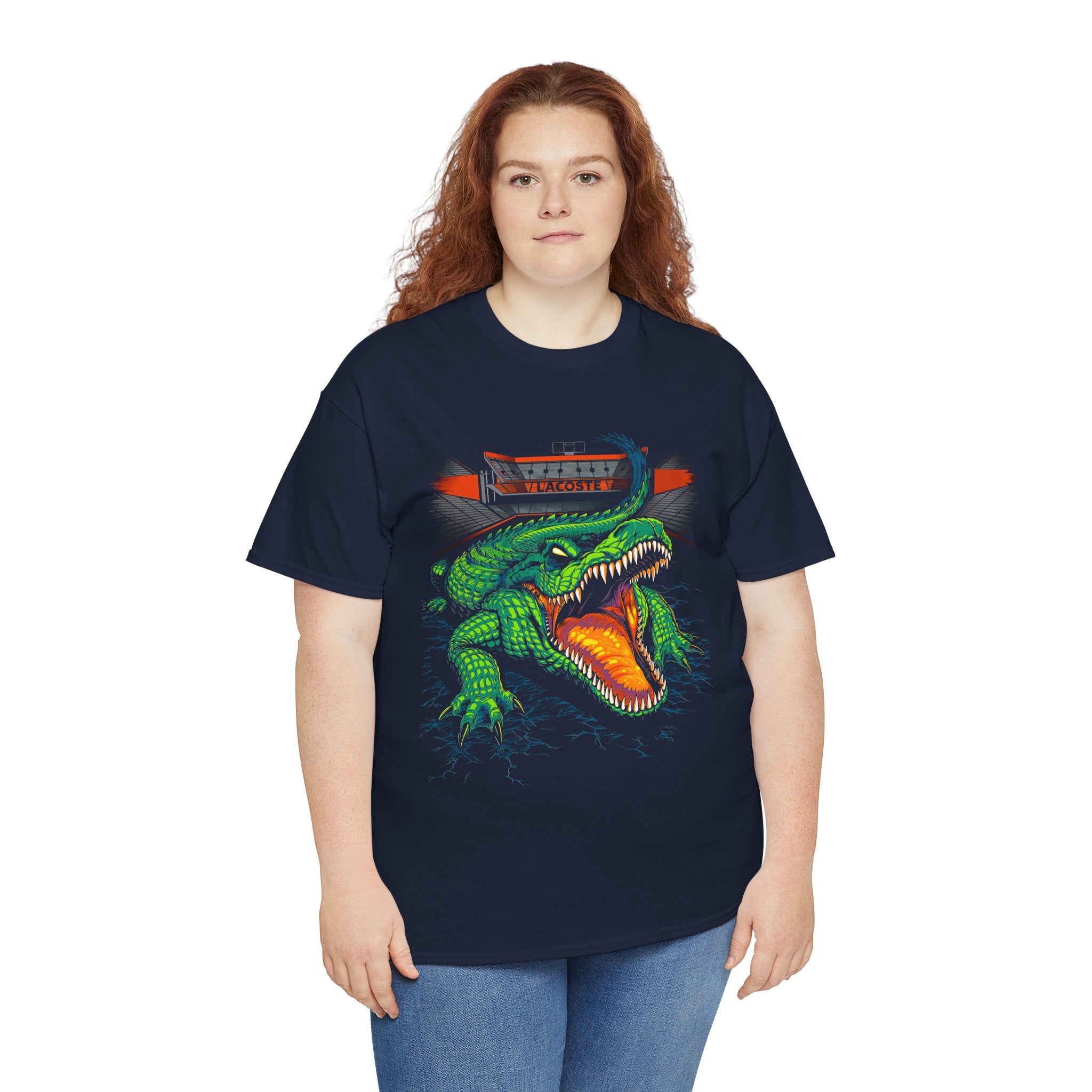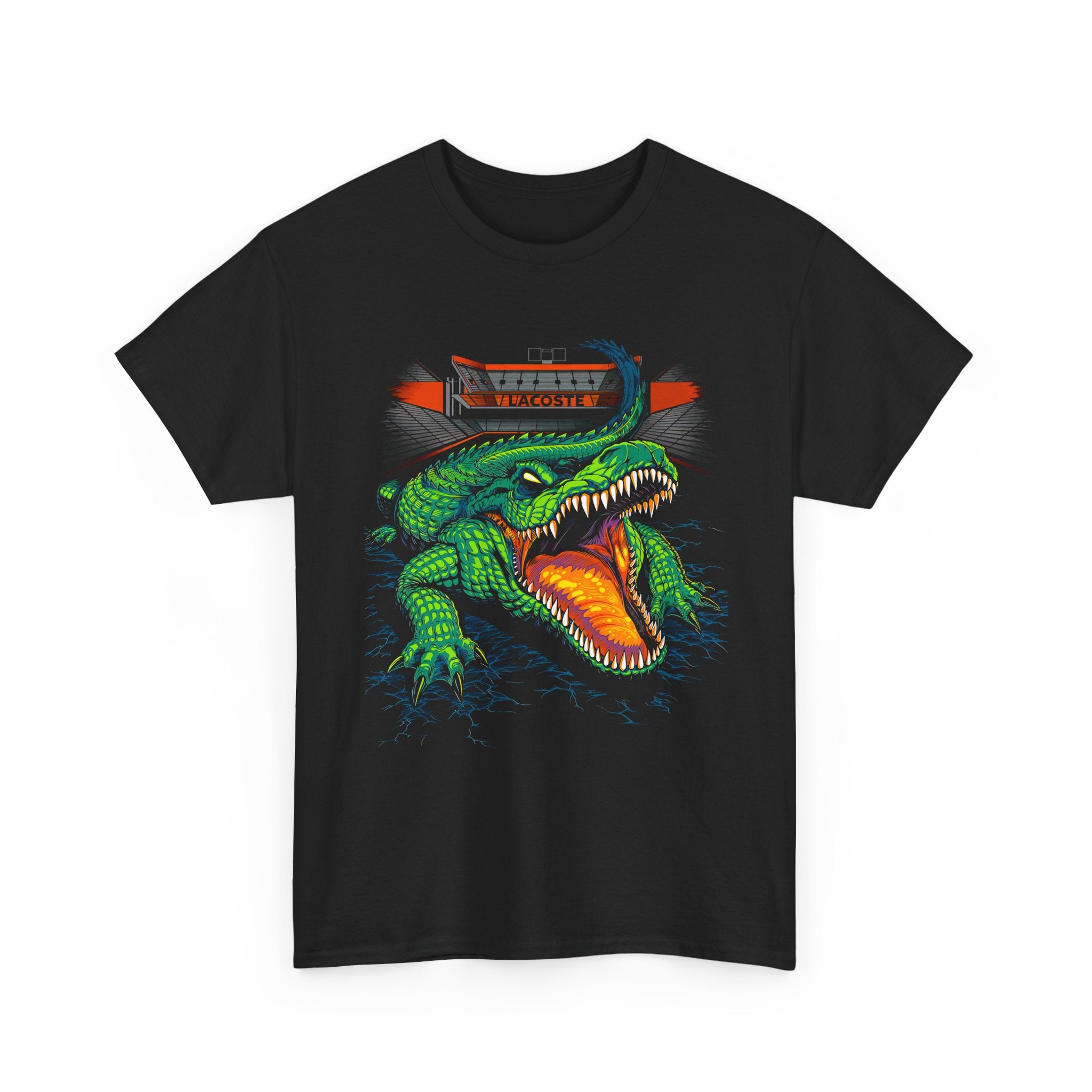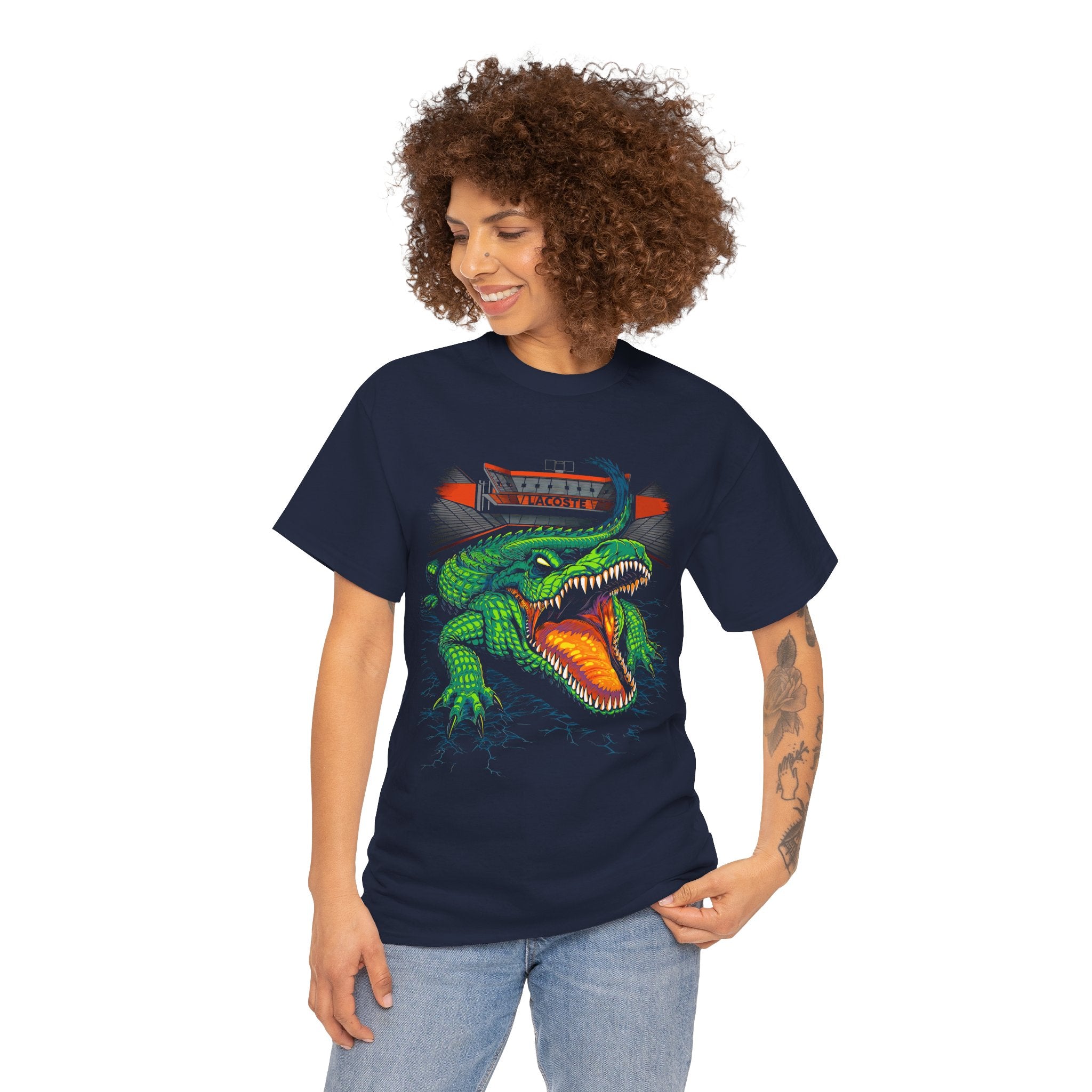 Meet the Beast of the Stadium — a powerful crocodile roaring with primal energy and glowing in shades of neon green, amber, and electric violet.