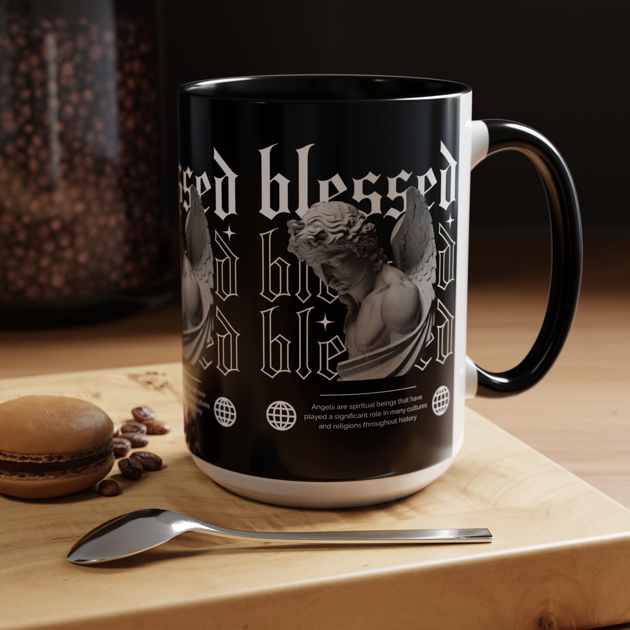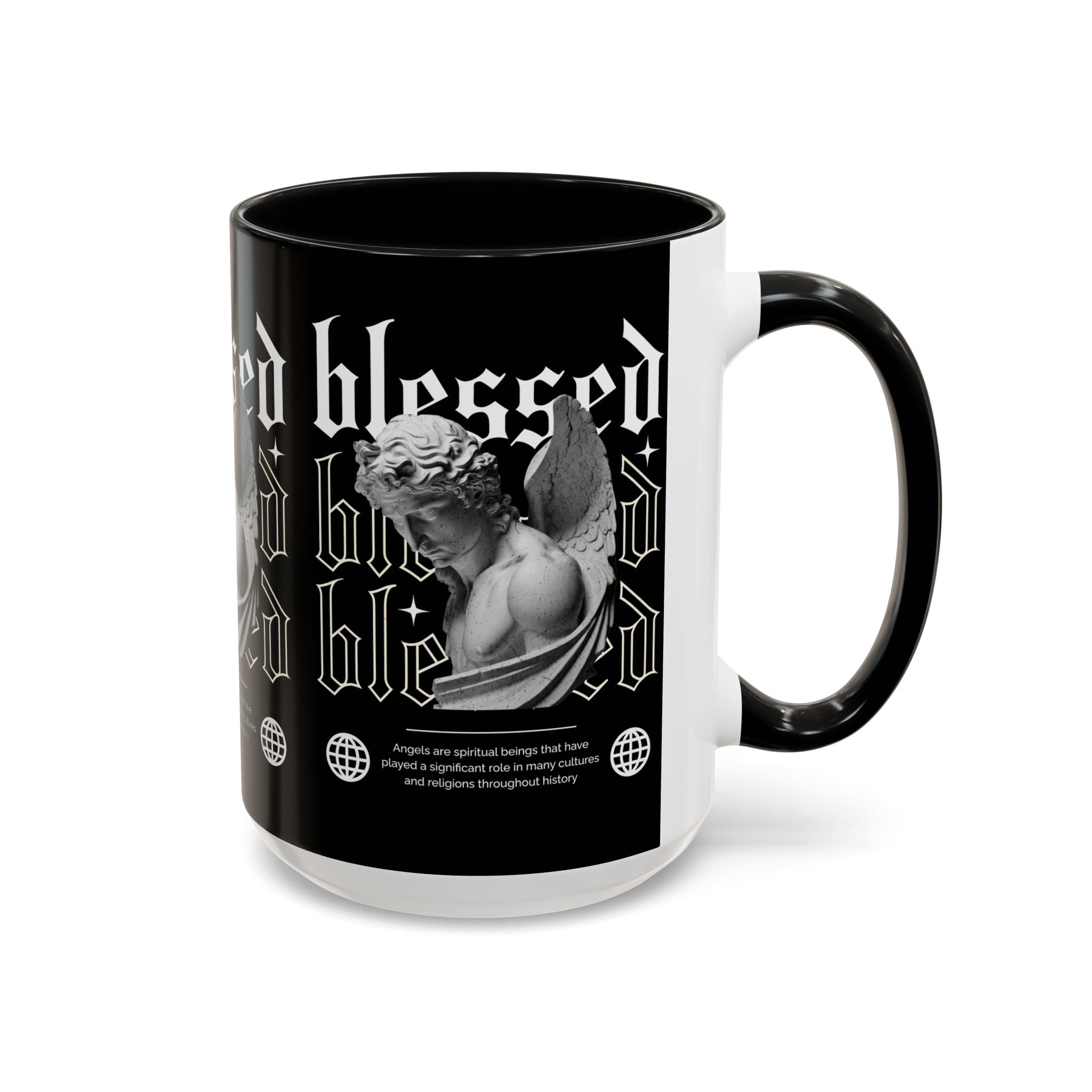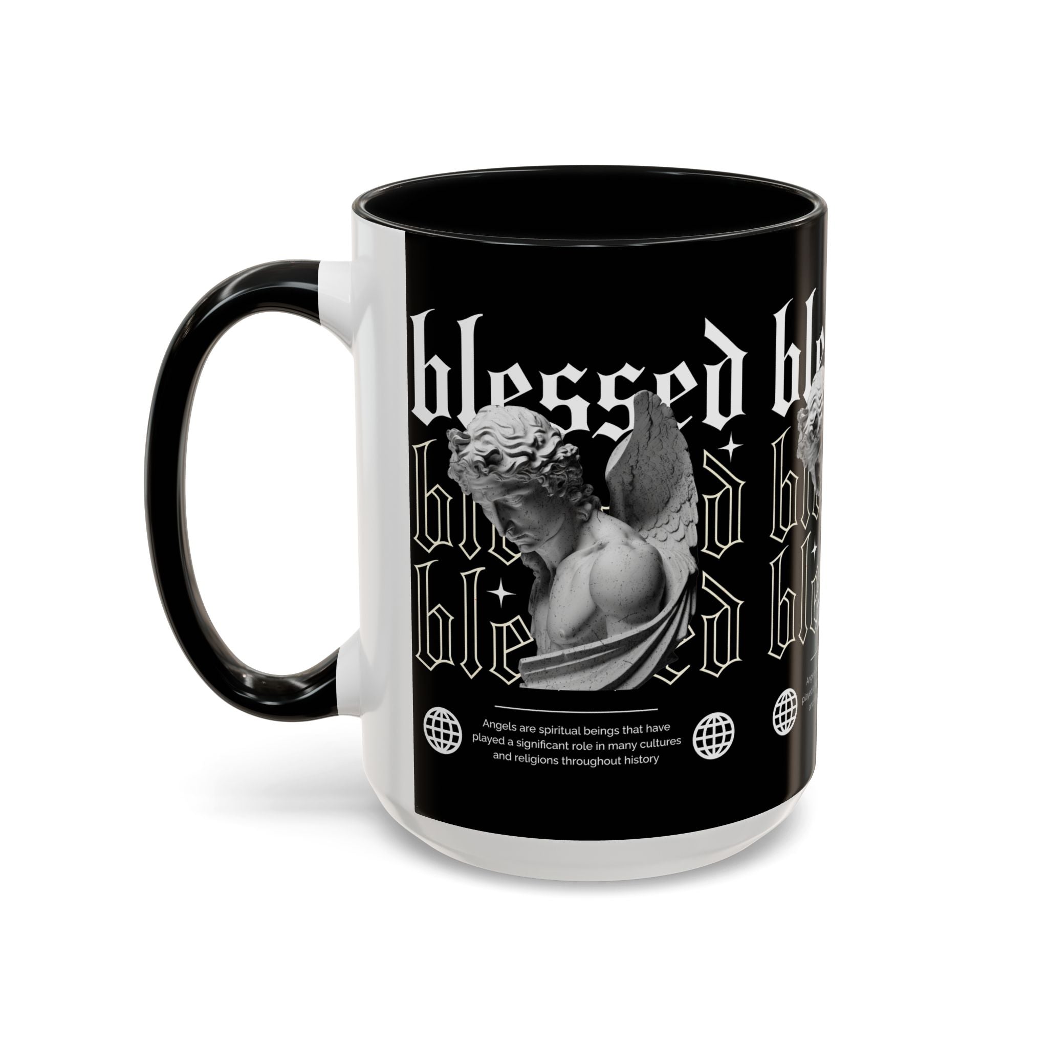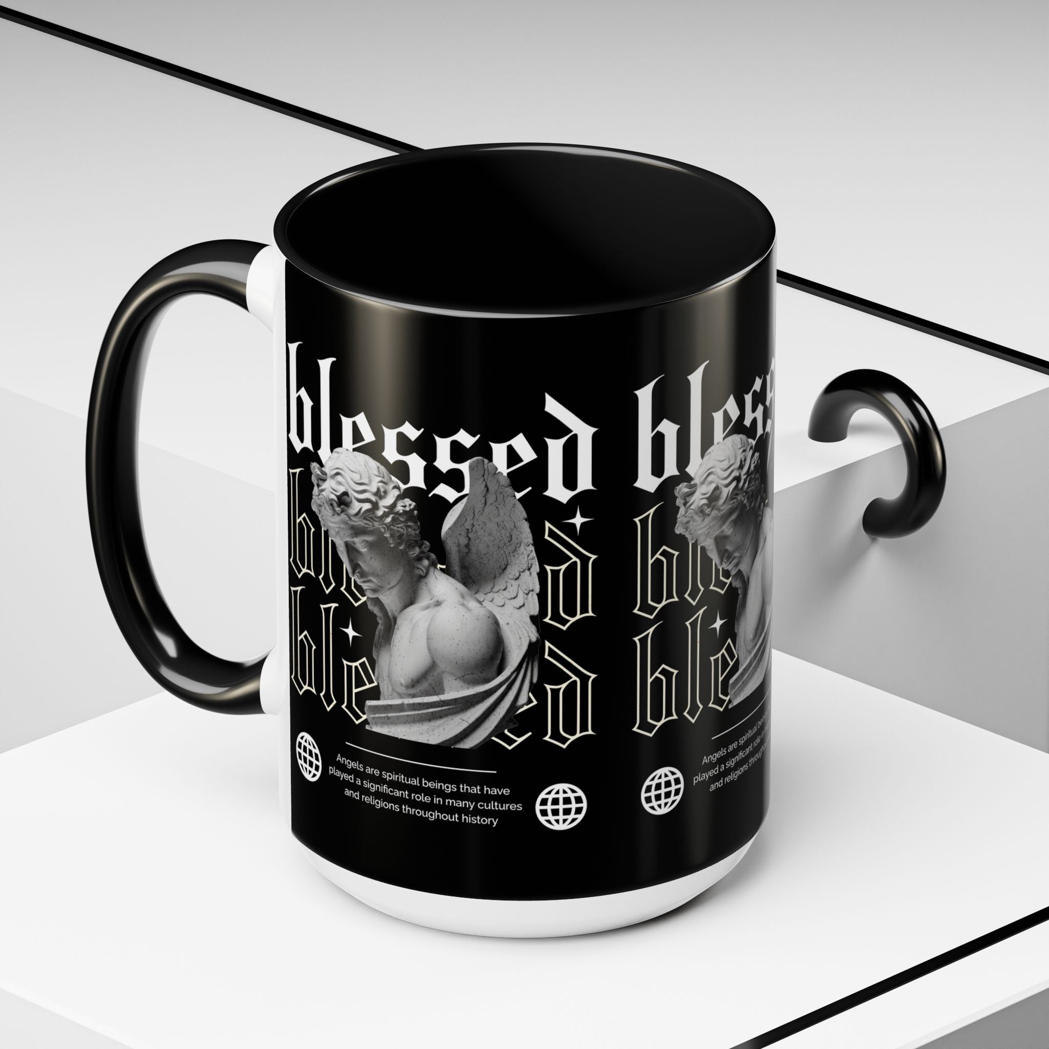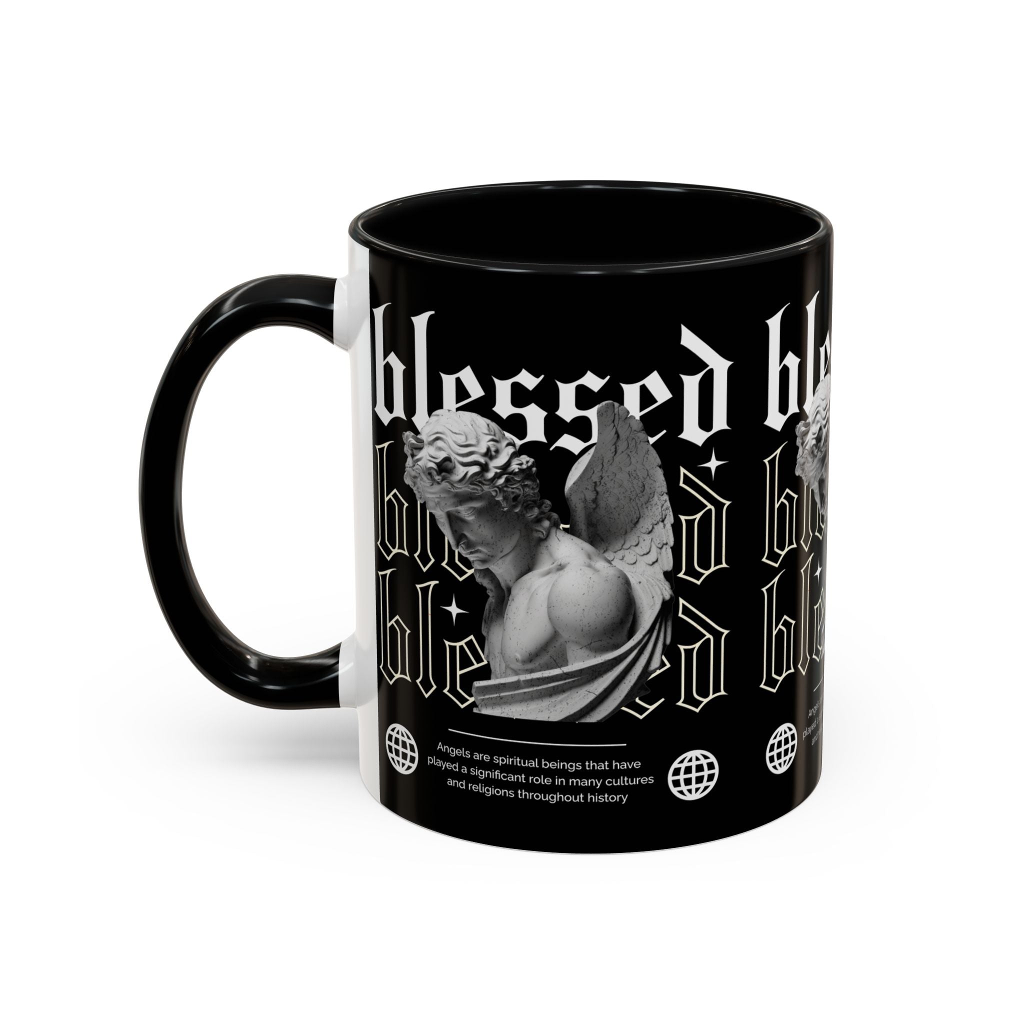 Start your day with more than just coffee—start it with faith, art, and bold design. The Blessed Accent Coffee Mug features a sculpted angel statue graphic paired with gothic “Blessed” lettering, turning your daily drinkware into a statement of spirituality and strength.