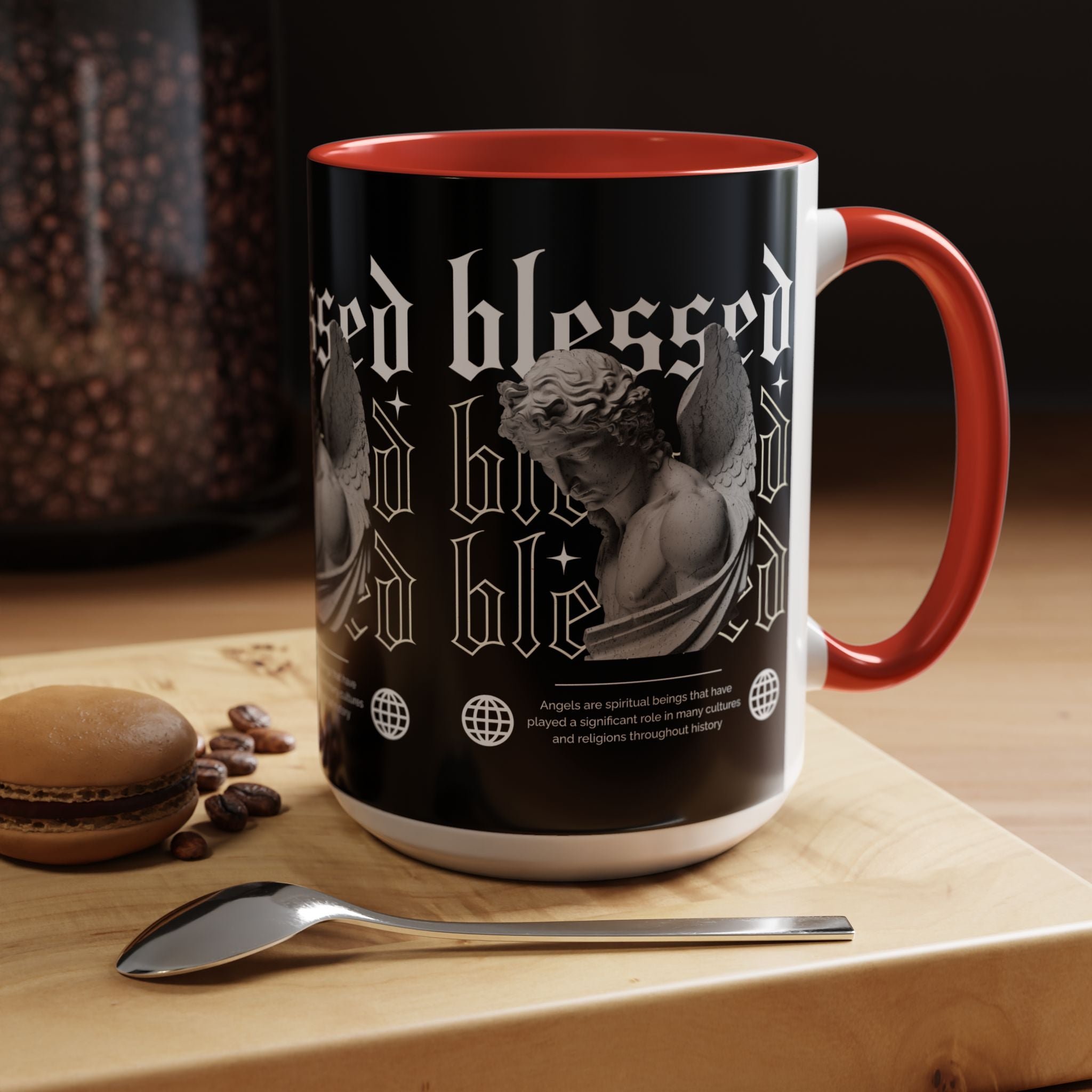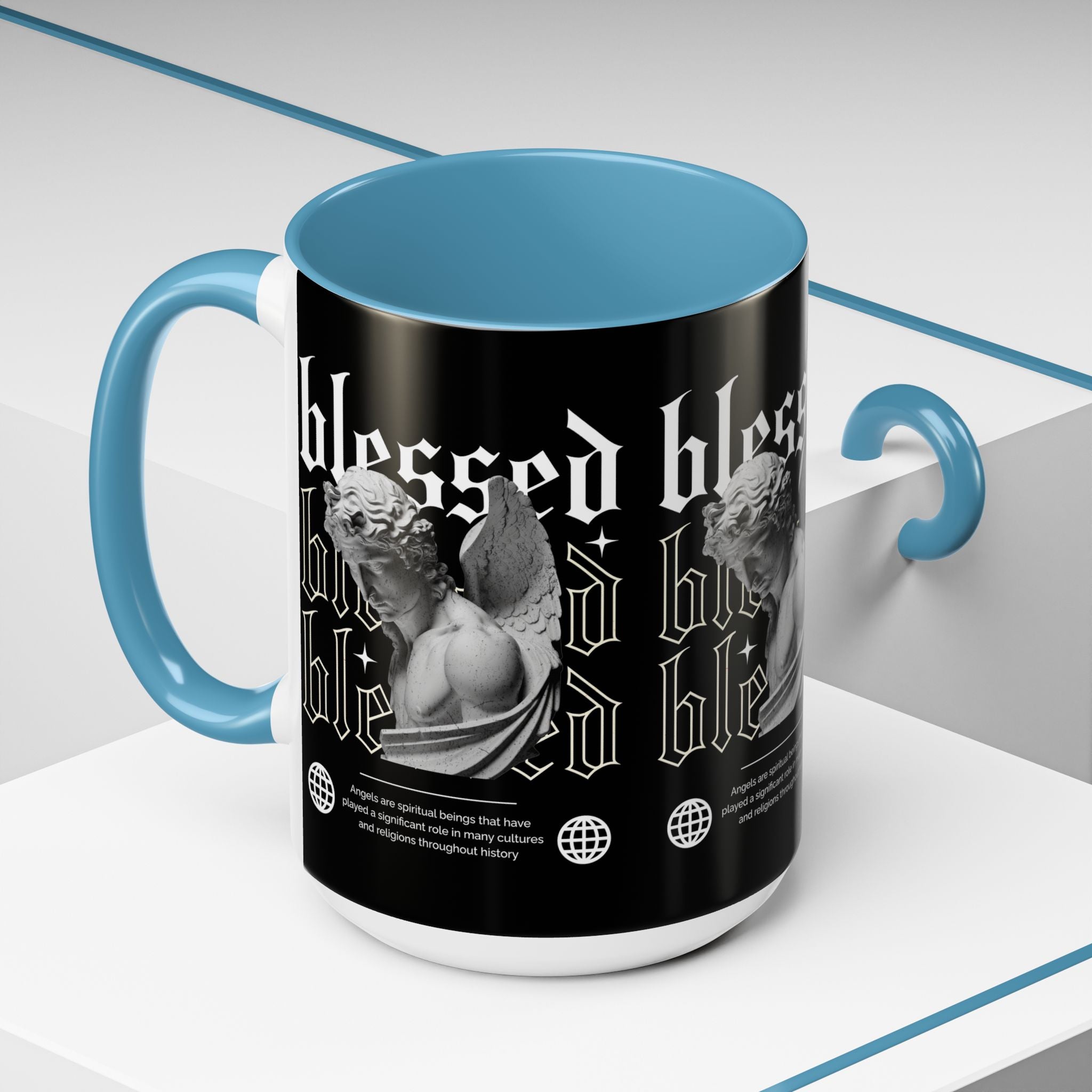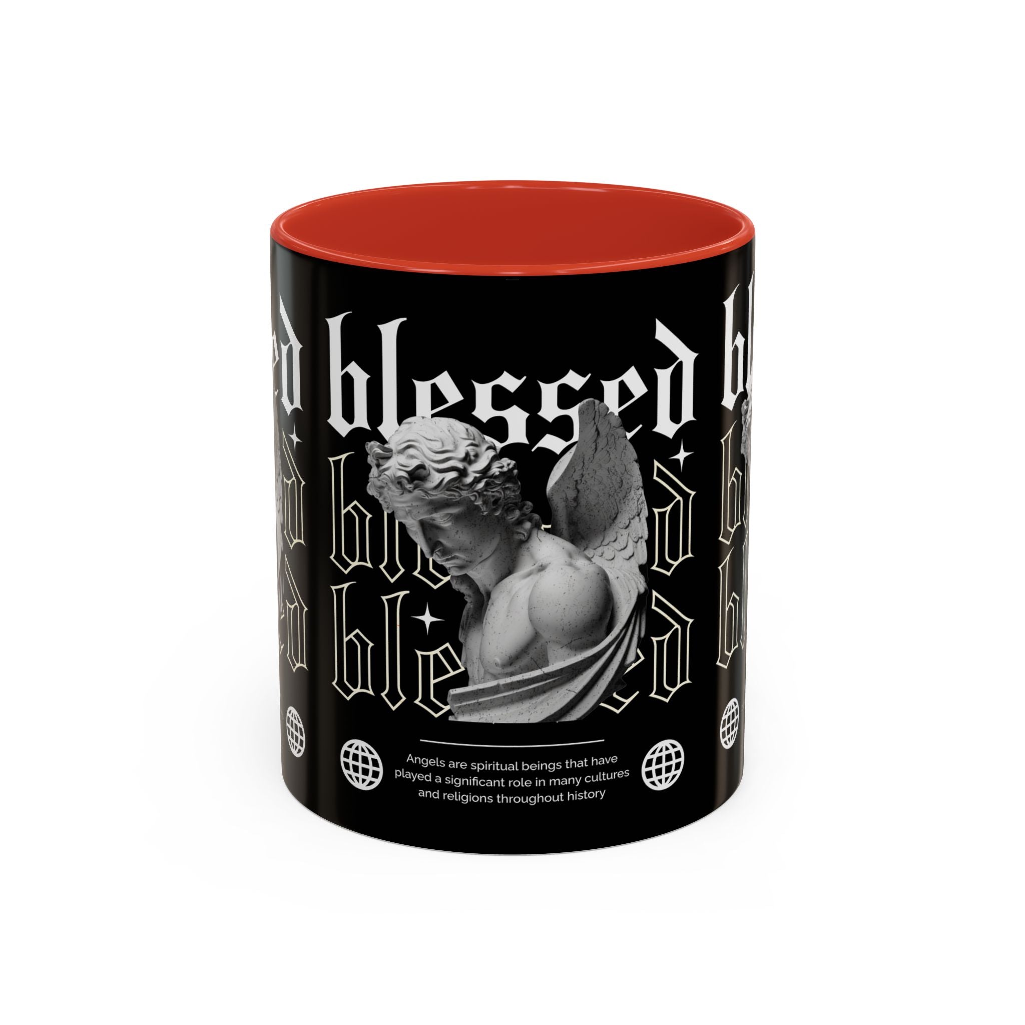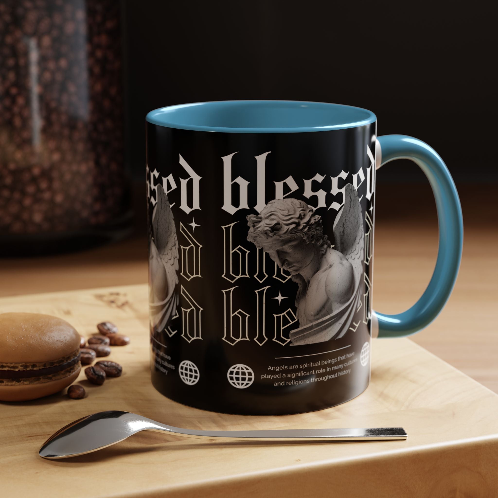 Start your day with more than just coffee—start it with faith, art, and bold design. The Blessed Accent Coffee Mug features a sculpted angel statue graphic paired with gothic “Blessed” lettering, turning your daily drinkware into a statement of spirituality and strength.