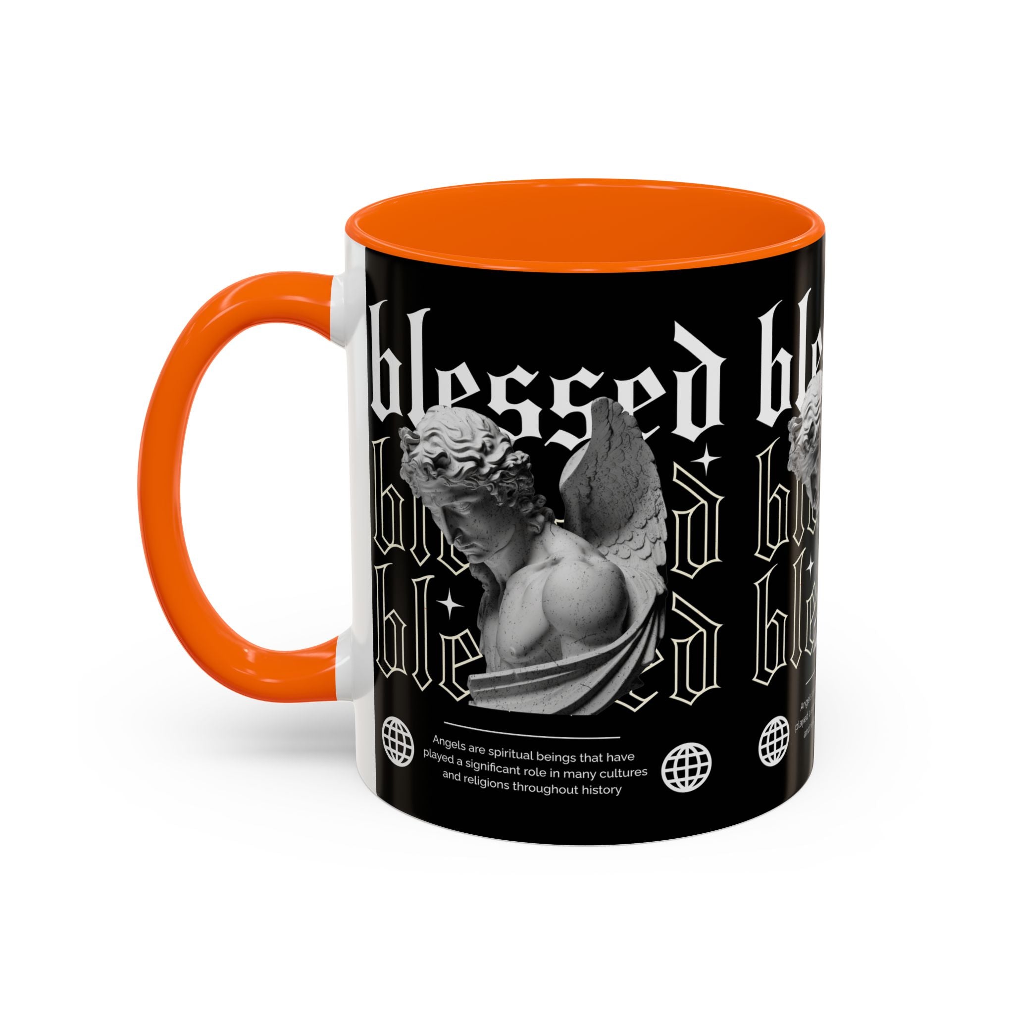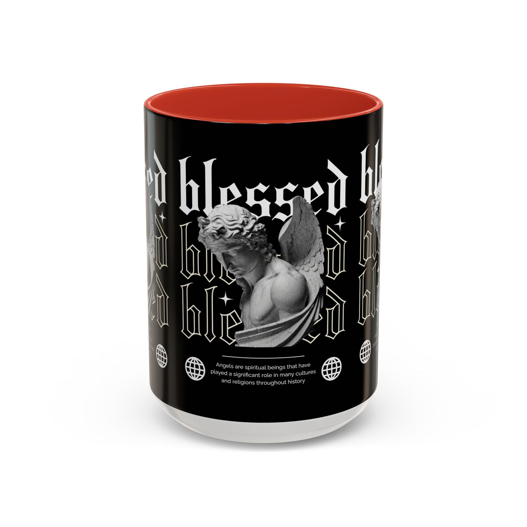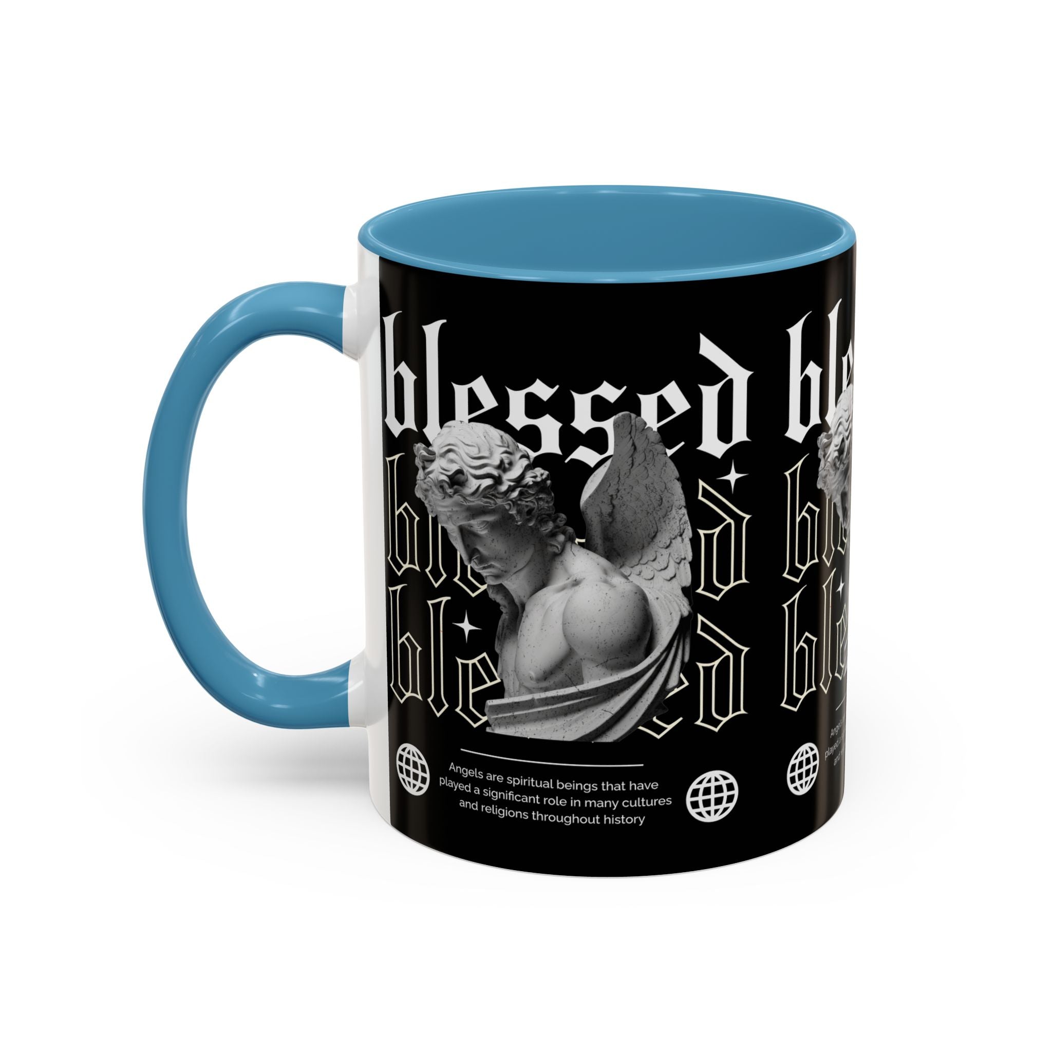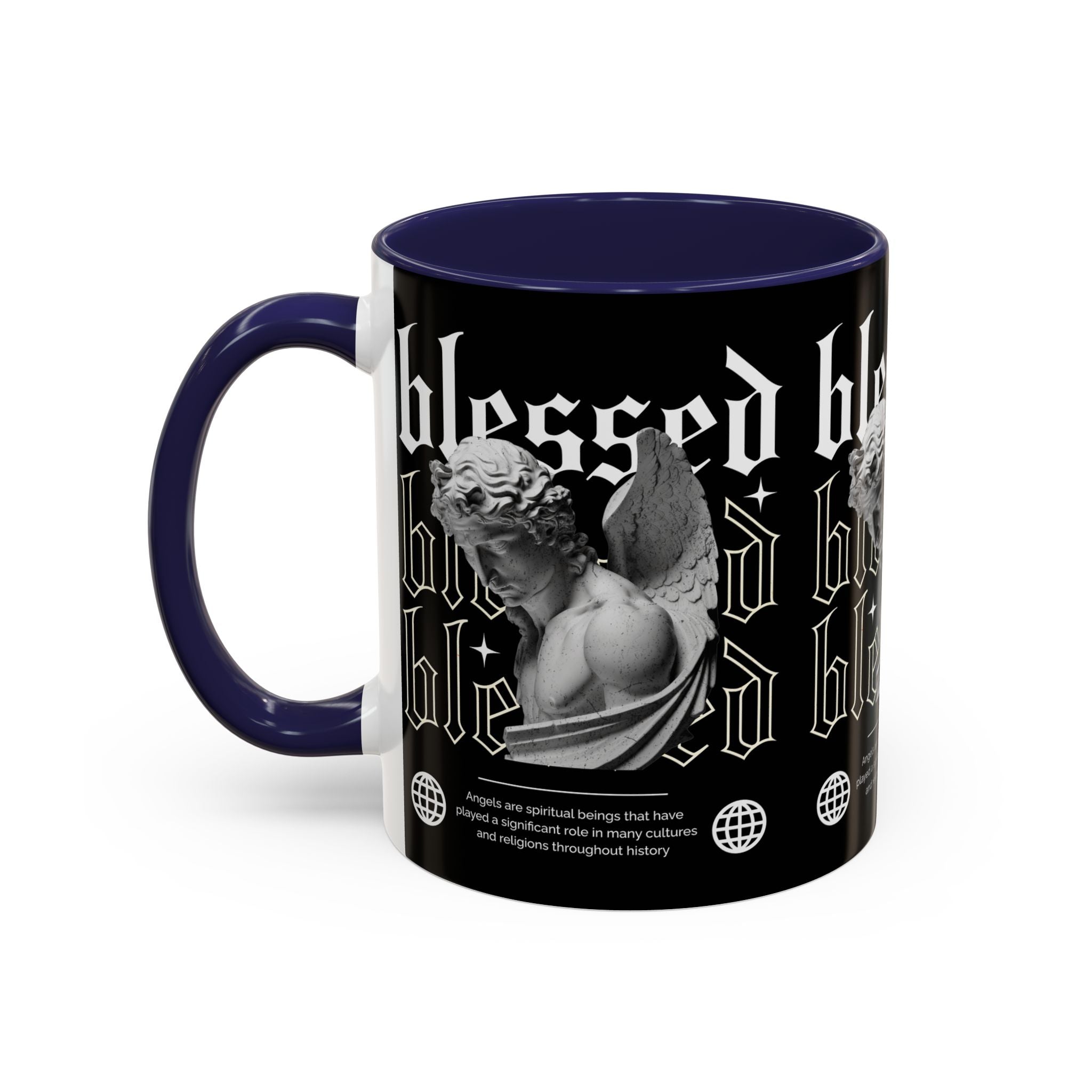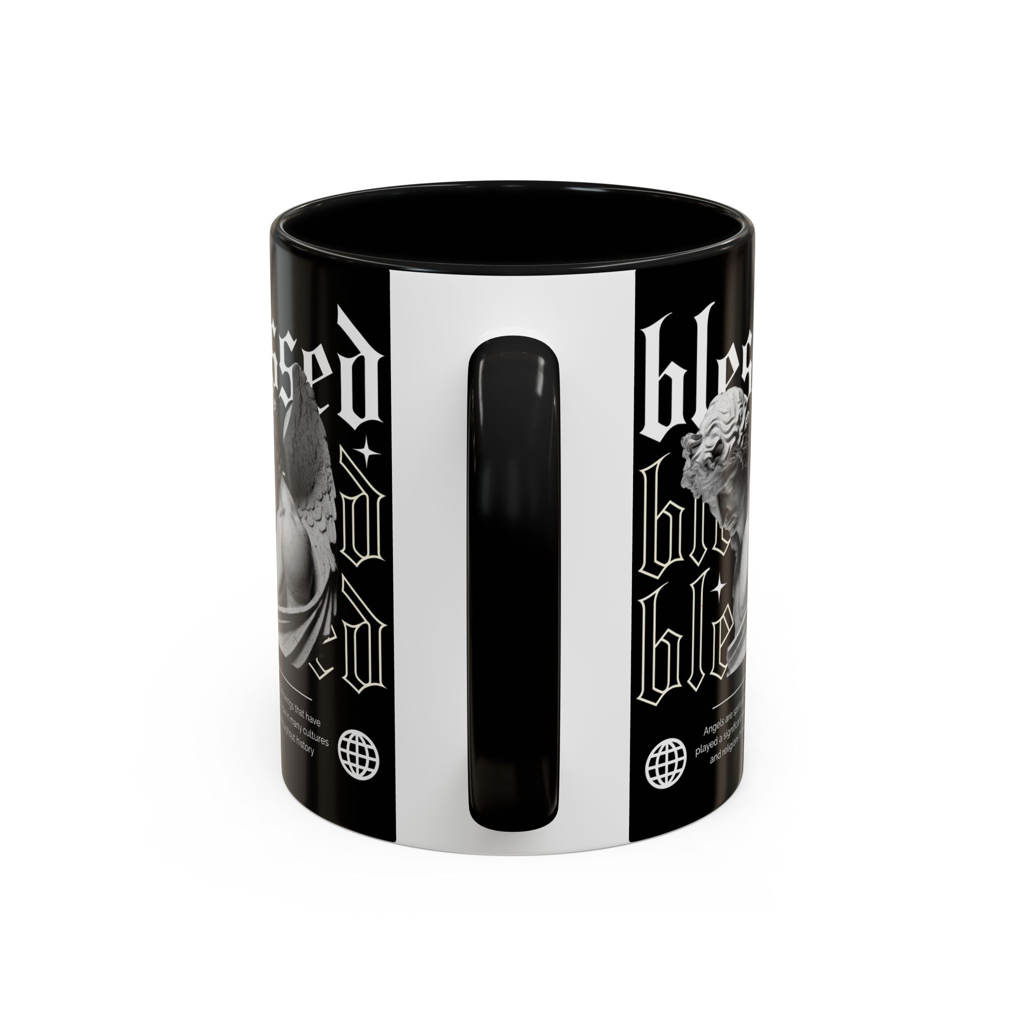 Start your day with more than just coffee—start it with faith, art, and bold design. The Blessed Accent Coffee Mug features a sculpted angel statue graphic paired with gothic “Blessed” lettering, turning your daily drinkware into a statement of spirituality and strength.