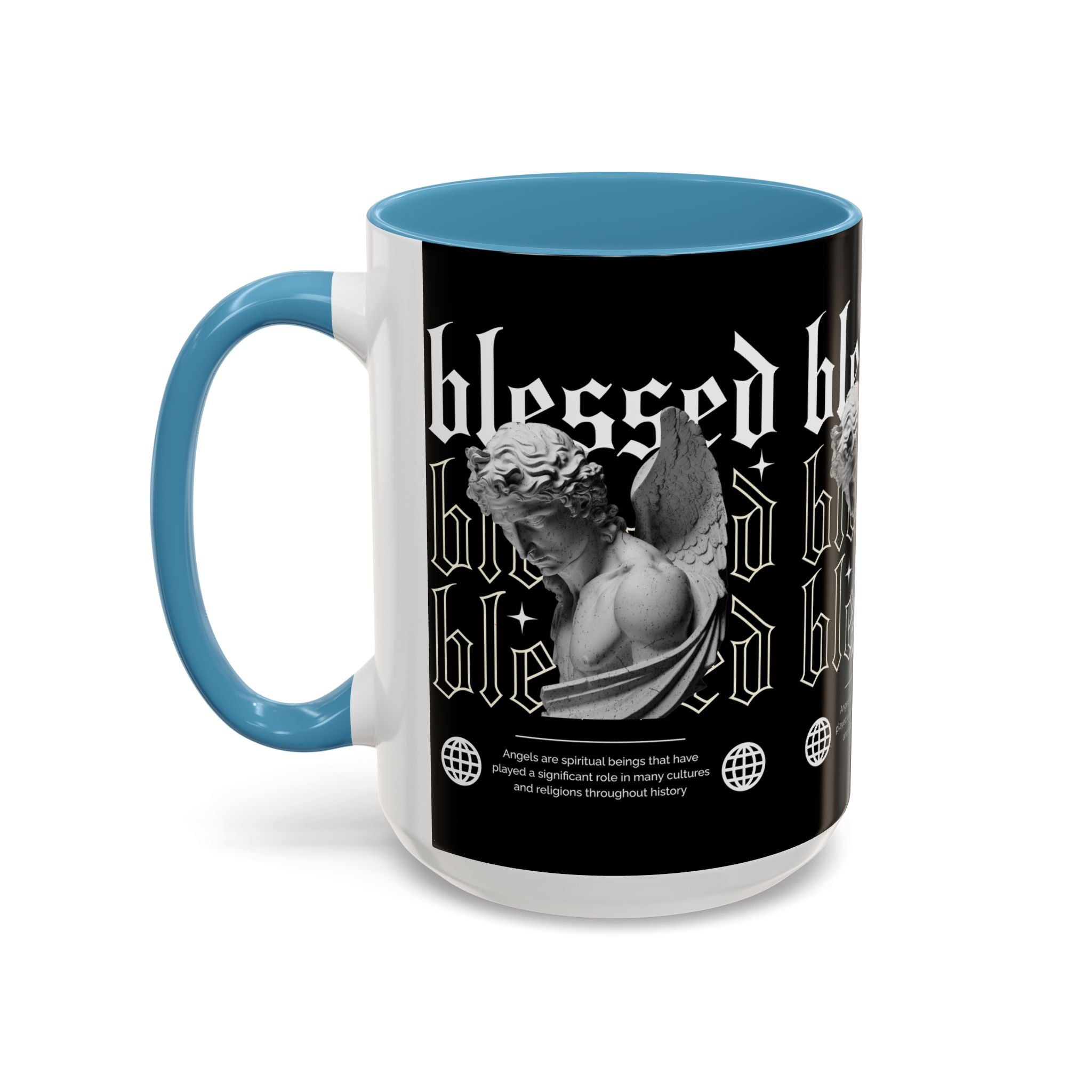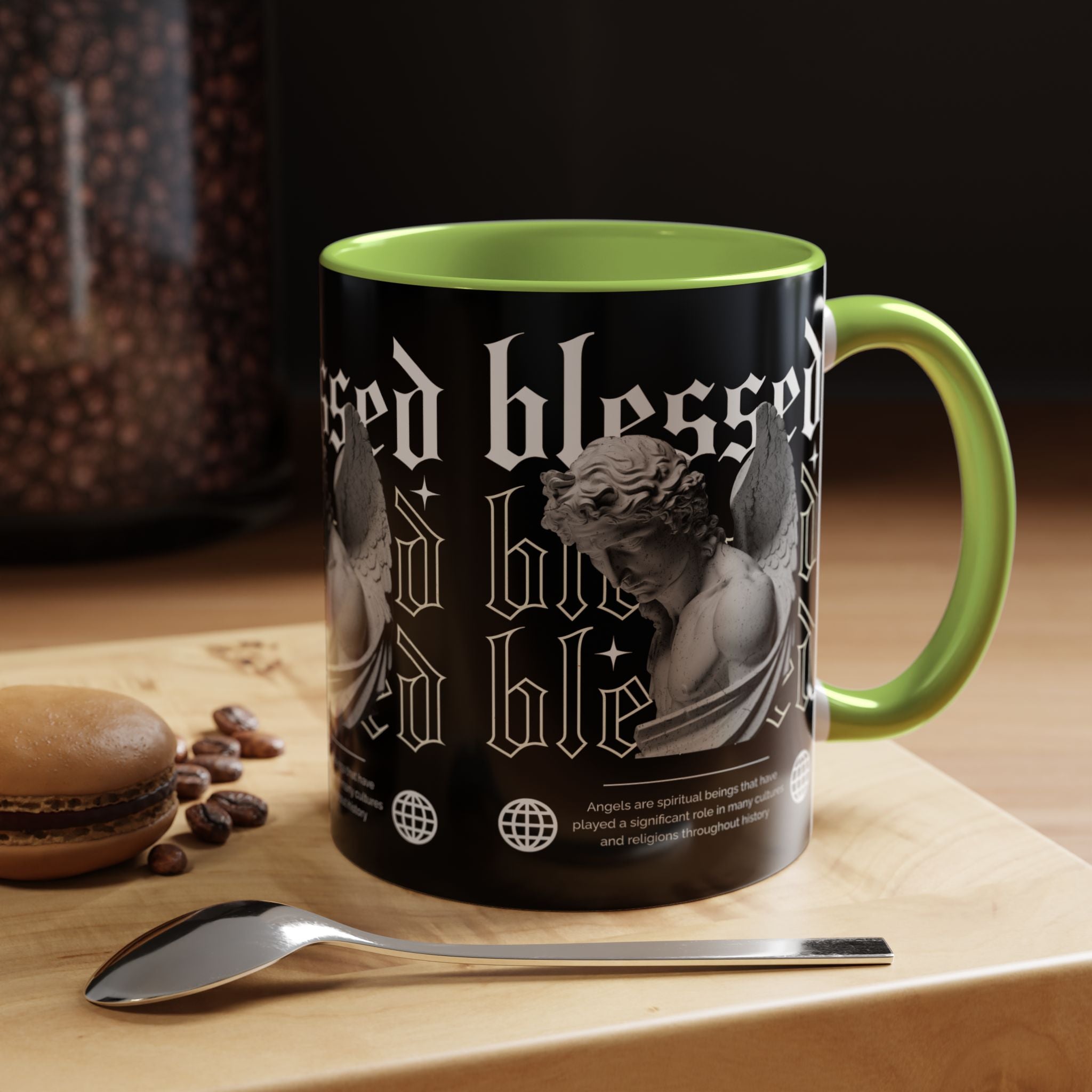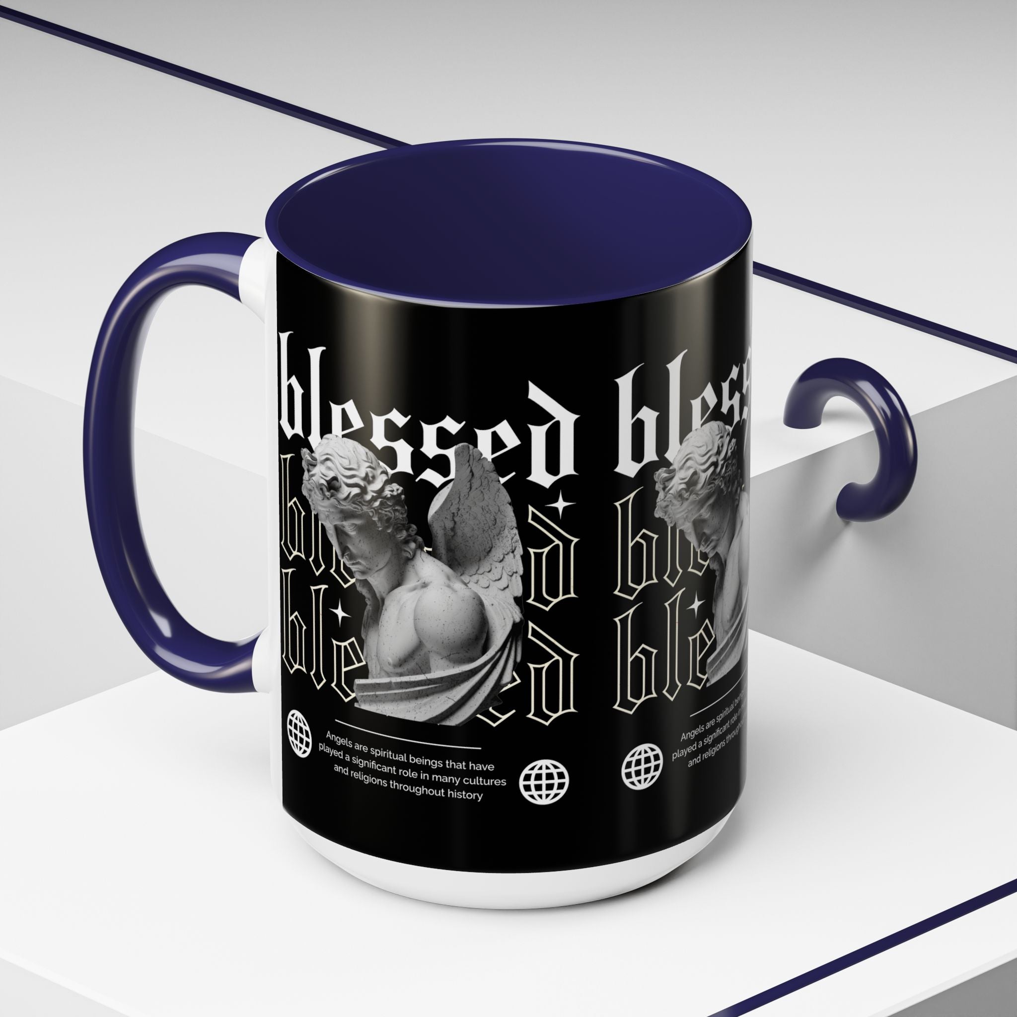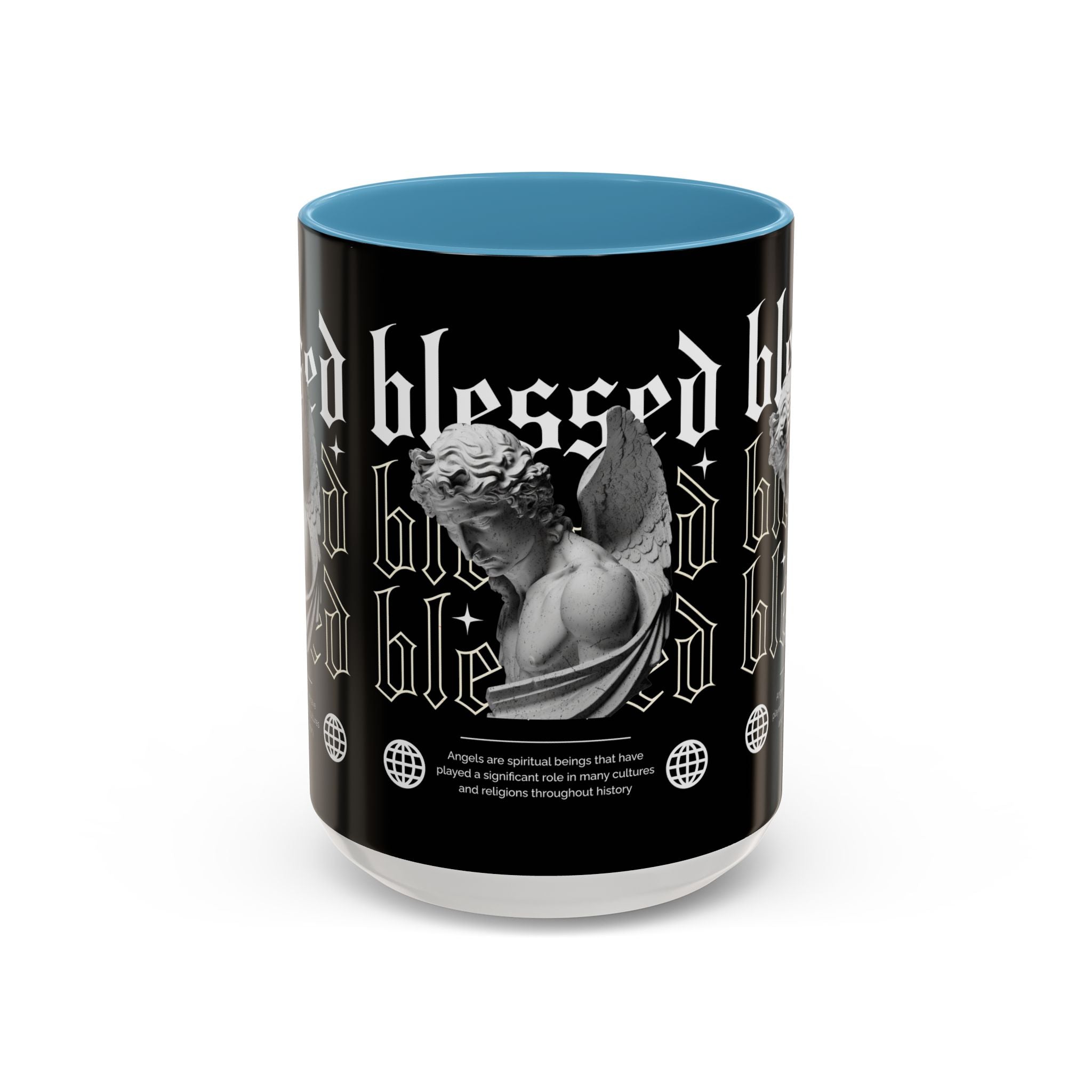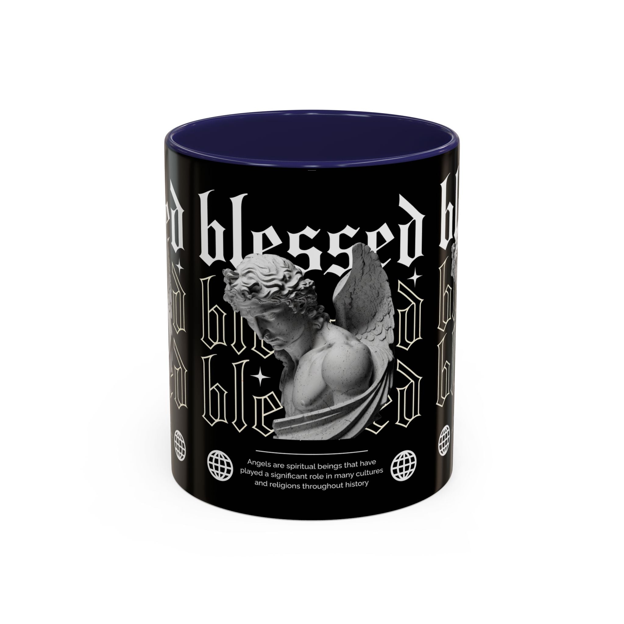 Start your day with more than just coffee—start it with faith, art, and bold design. The Blessed Accent Coffee Mug features a sculpted angel statue graphic paired with gothic “Blessed” lettering, turning your daily drinkware into a statement of spirituality and strength.