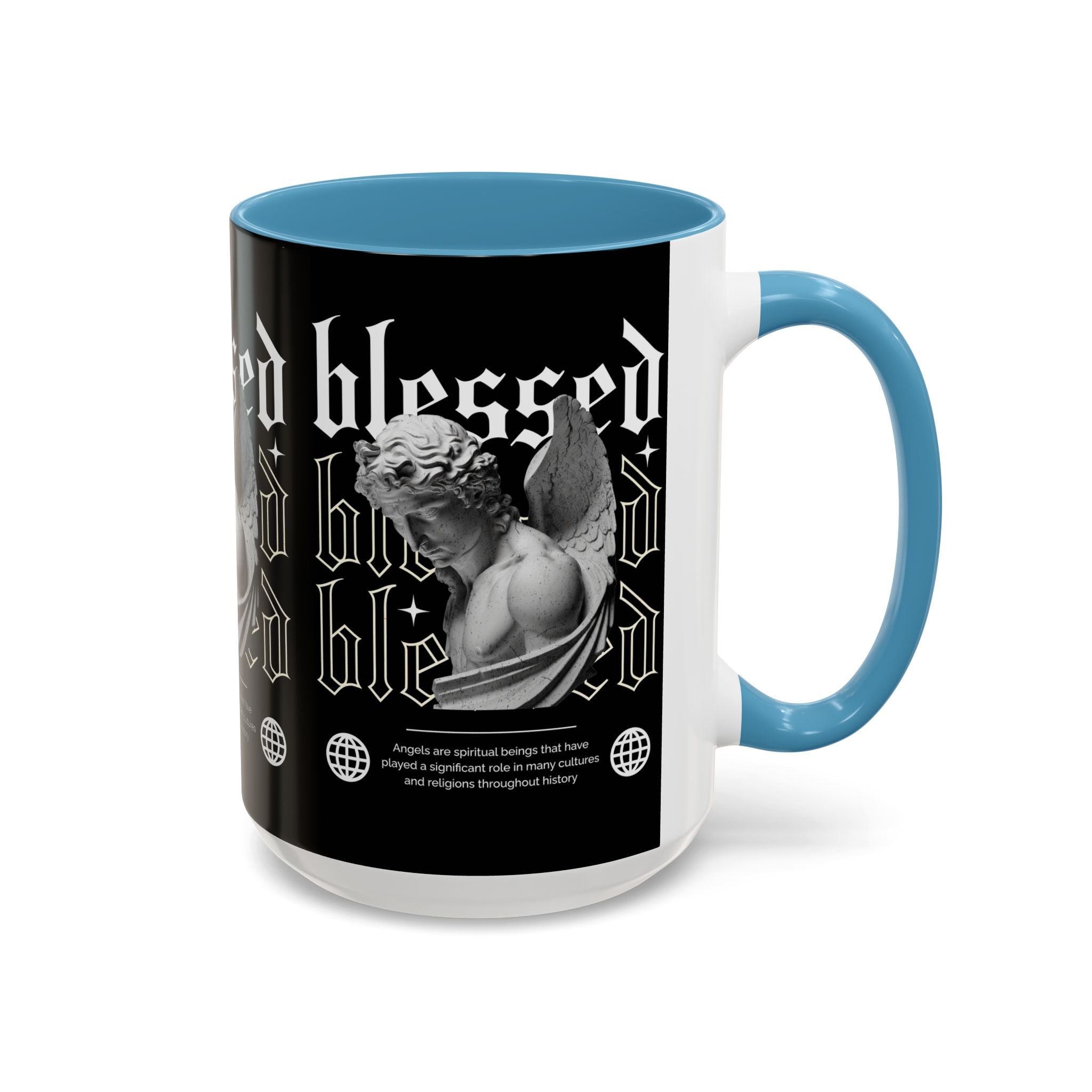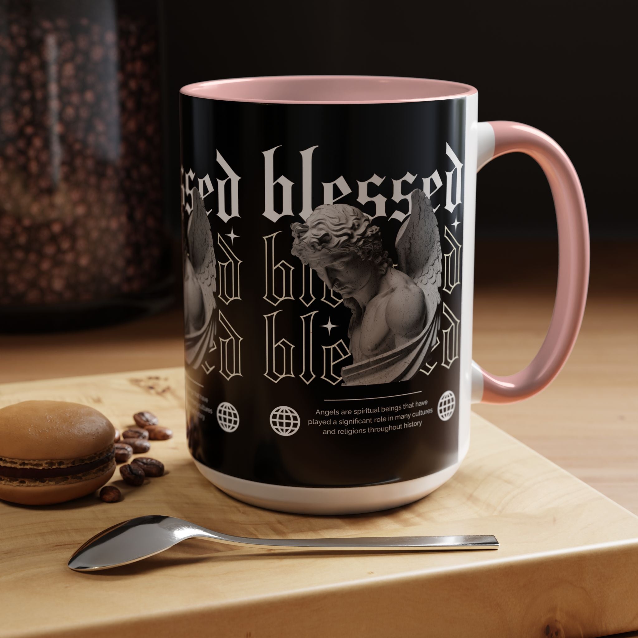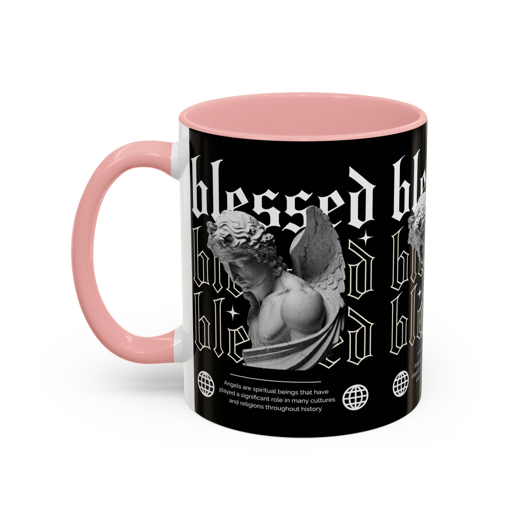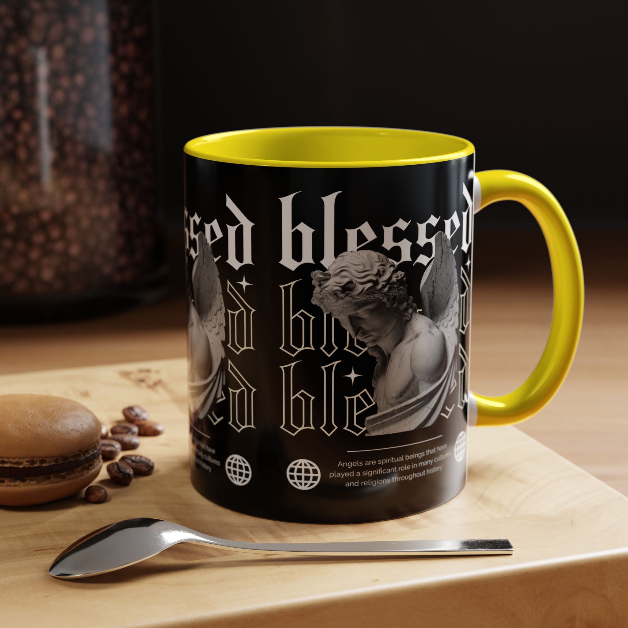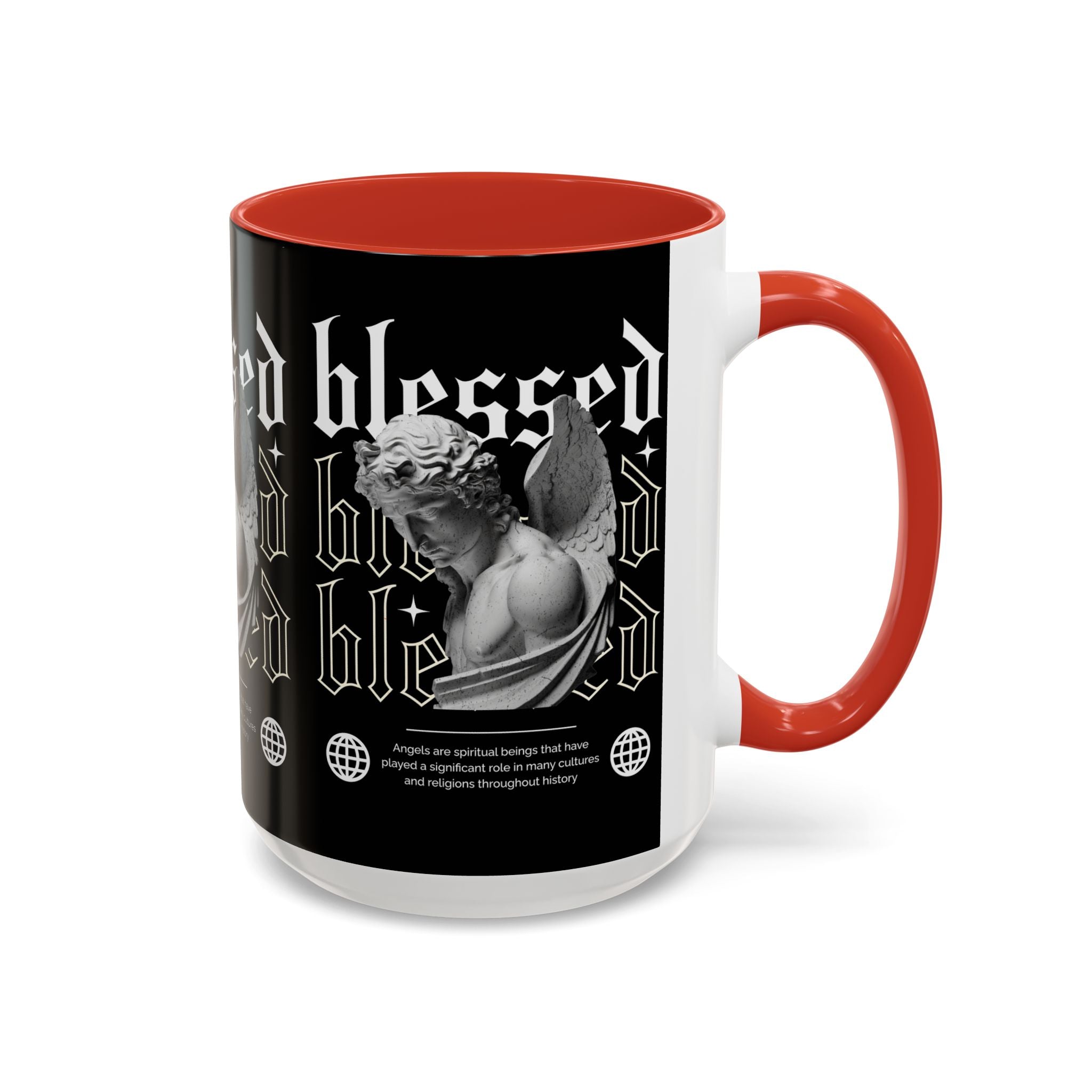 Start your day with more than just coffee—start it with faith, art, and bold design. The Blessed Accent Coffee Mug features a sculpted angel statue graphic paired with gothic “Blessed” lettering, turning your daily drinkware into a statement of spirituality and strength.