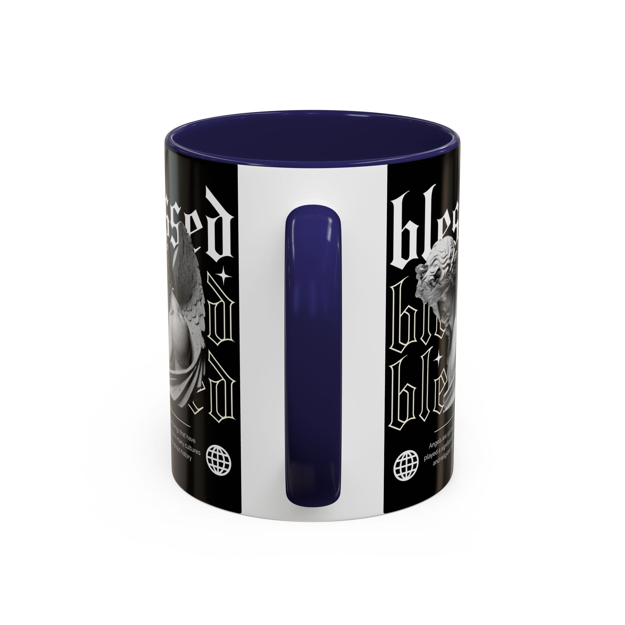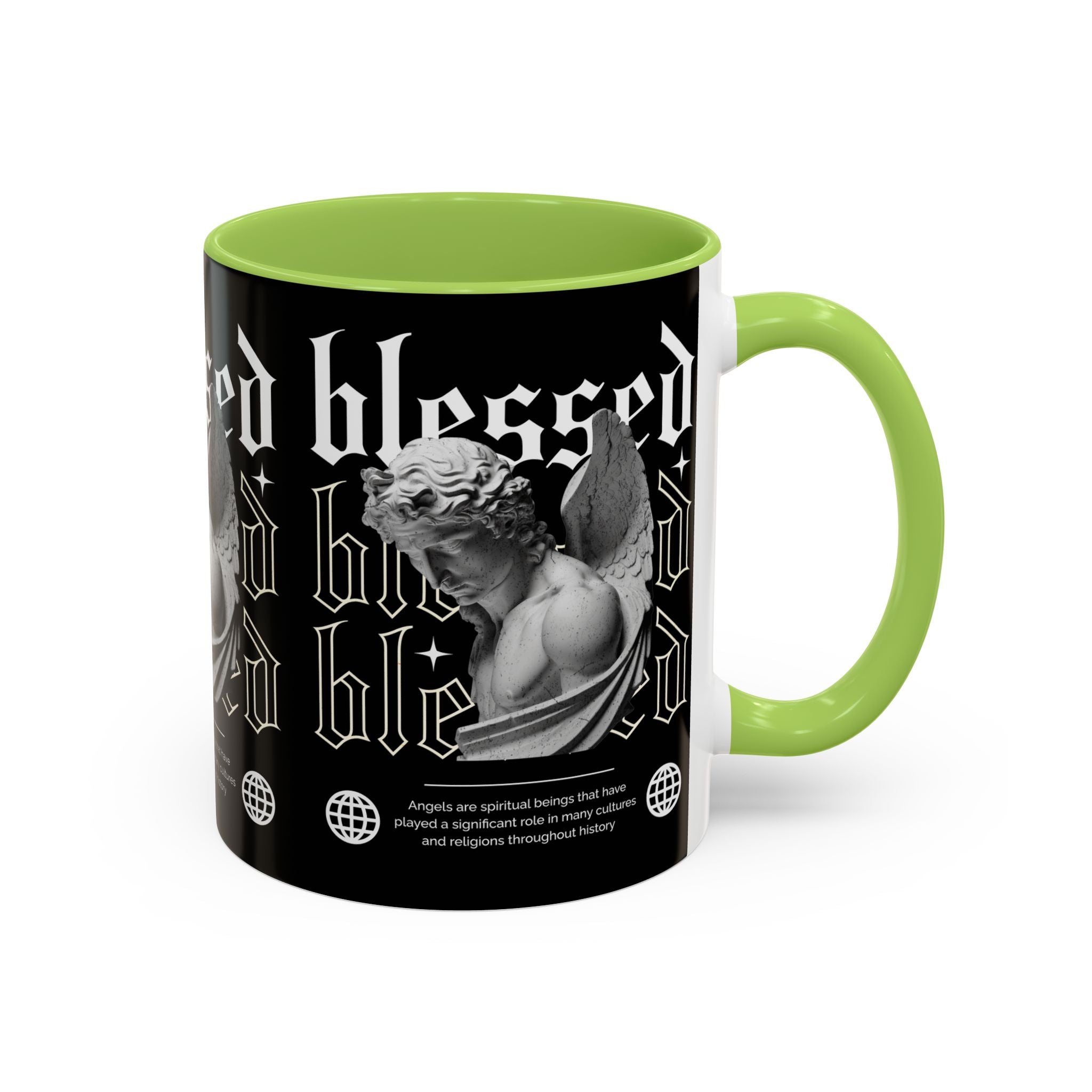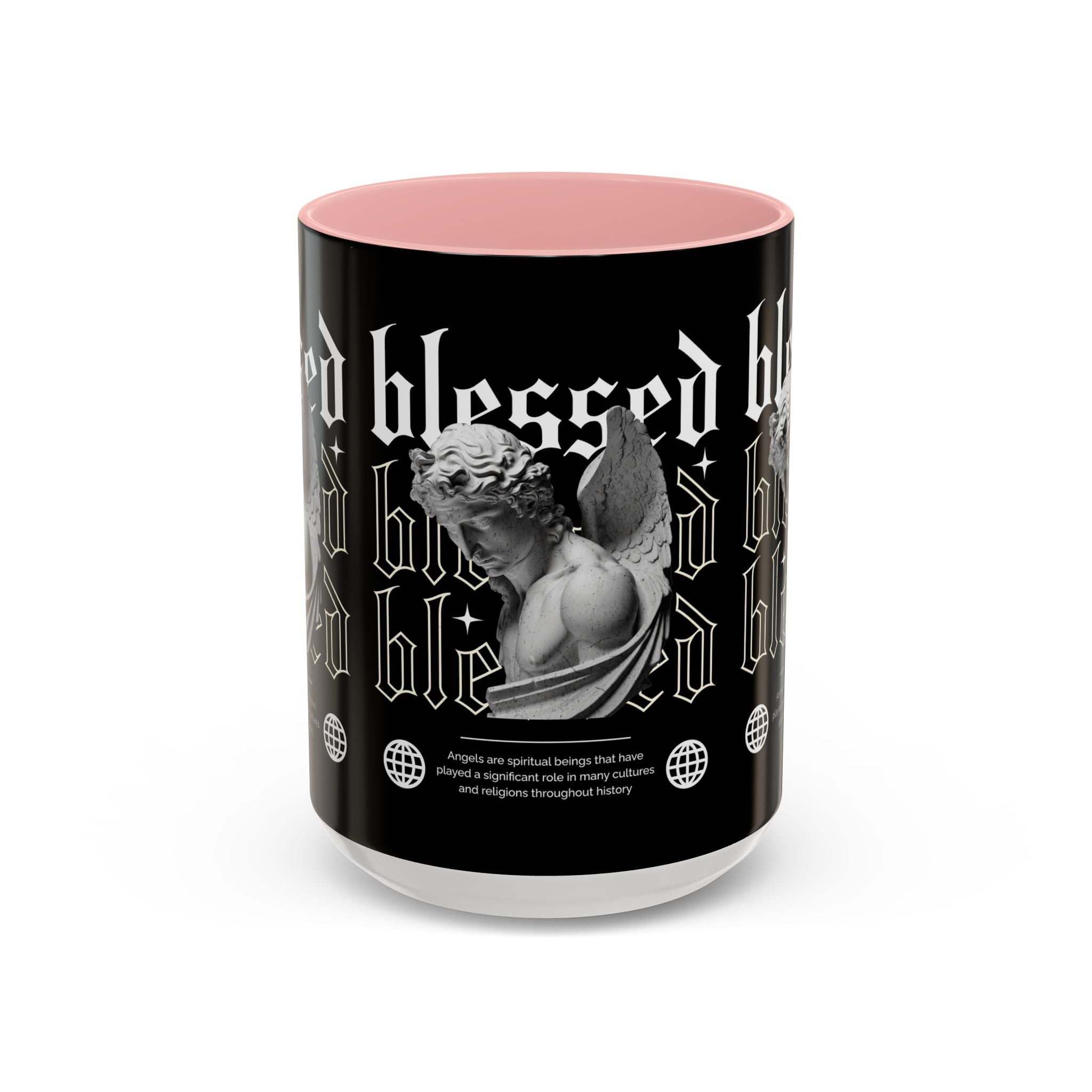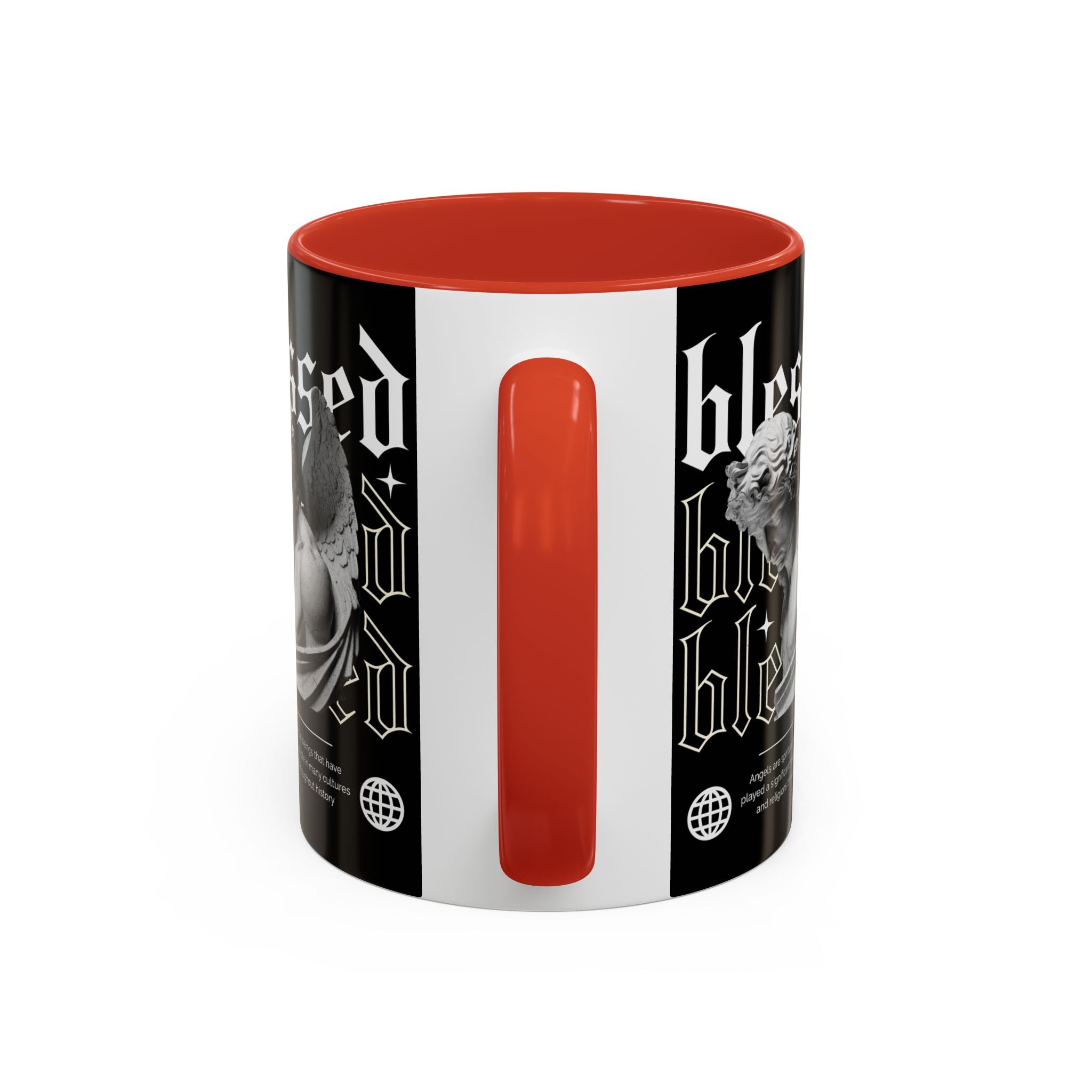 Start your day with more than just coffee—start it with faith, art, and bold design. The Blessed Accent Coffee Mug features a sculpted angel statue graphic paired with gothic “Blessed” lettering, turning your daily drinkware into a statement of spirituality and strength.