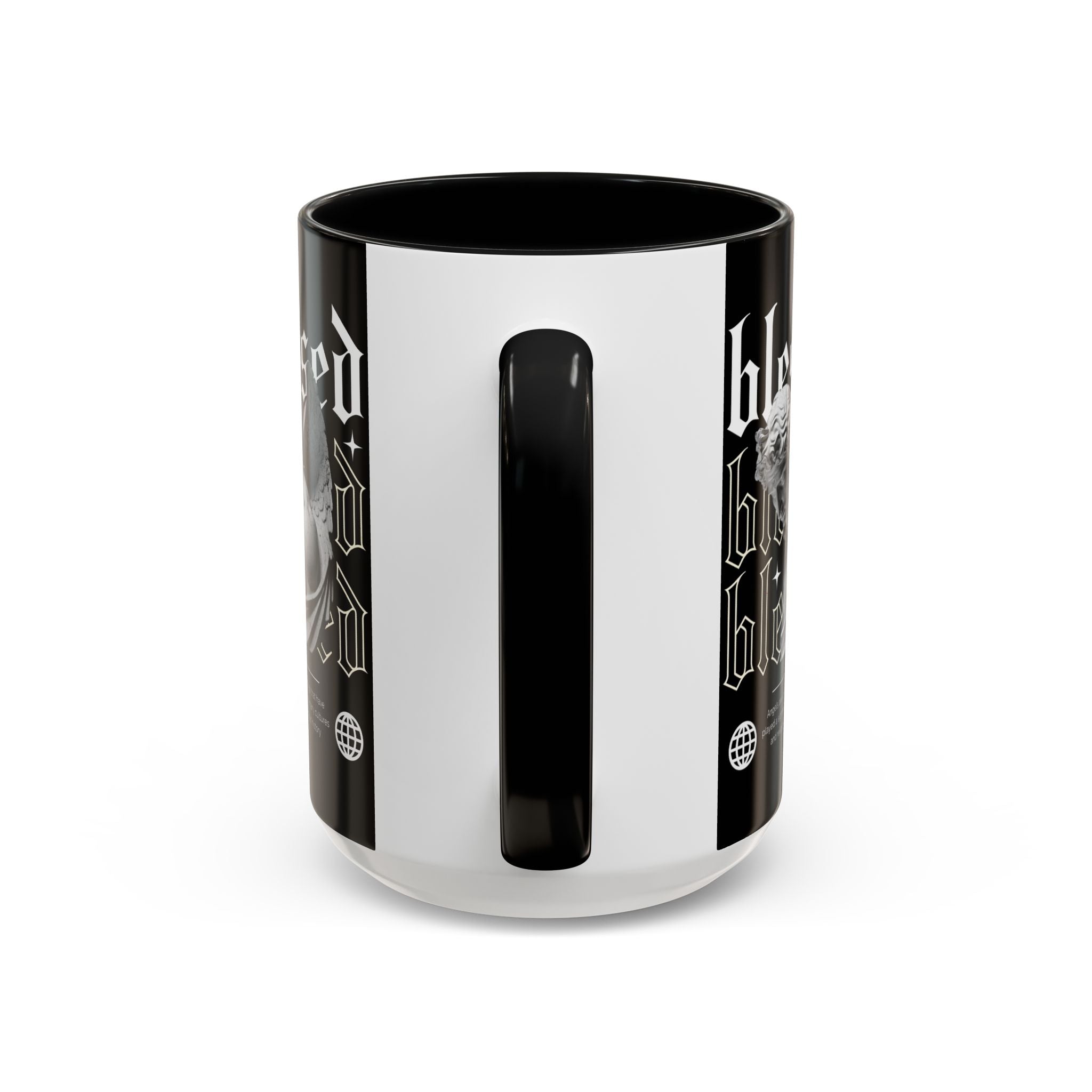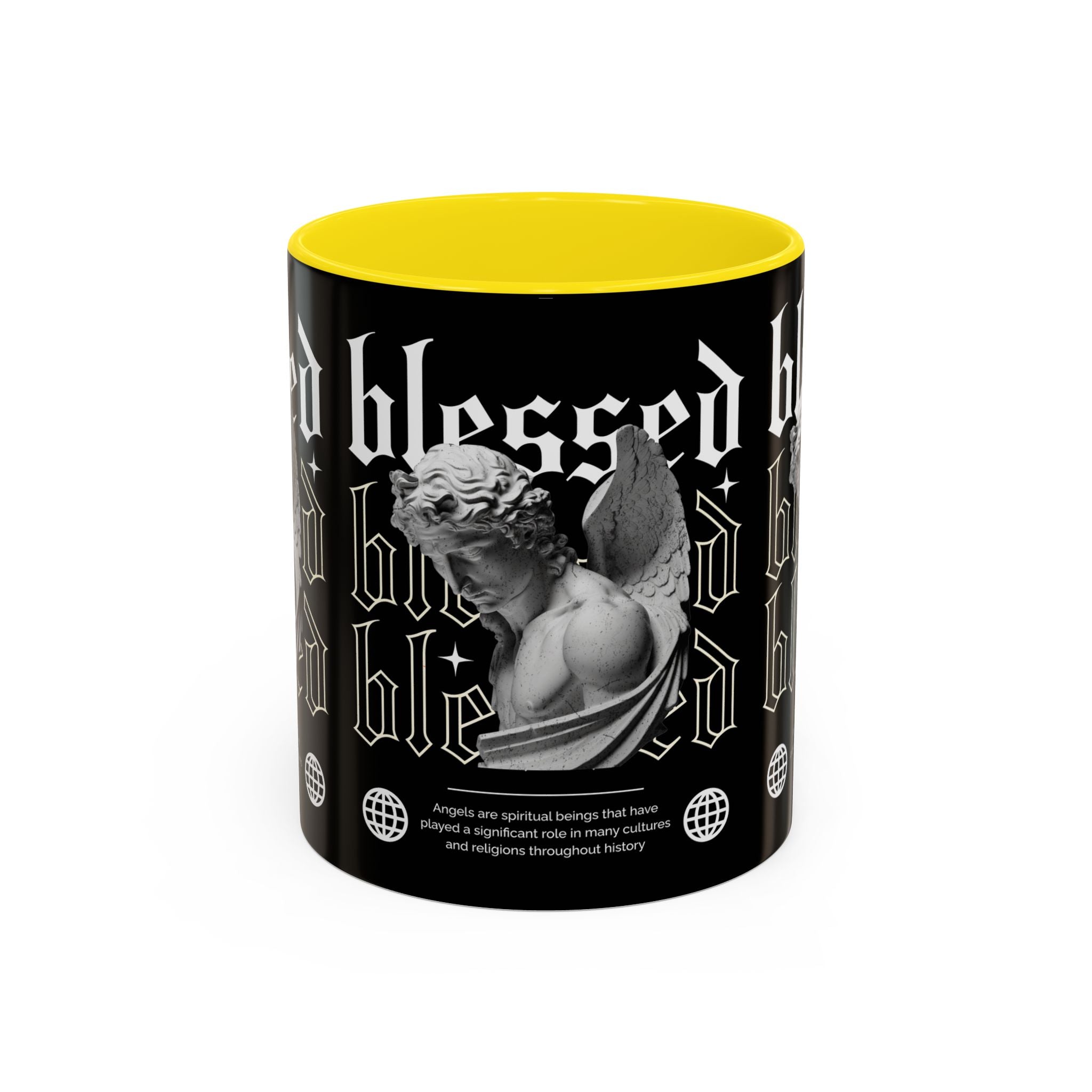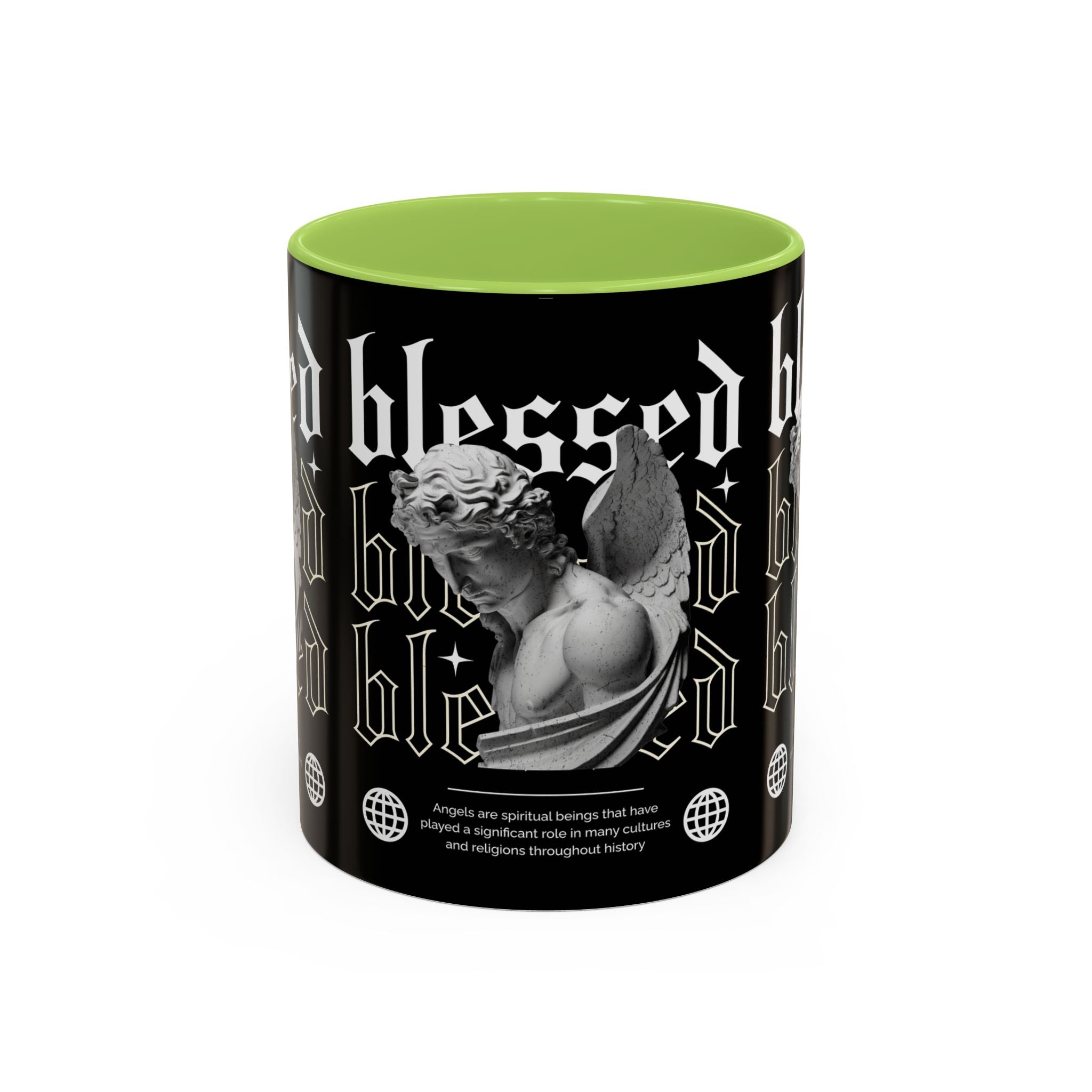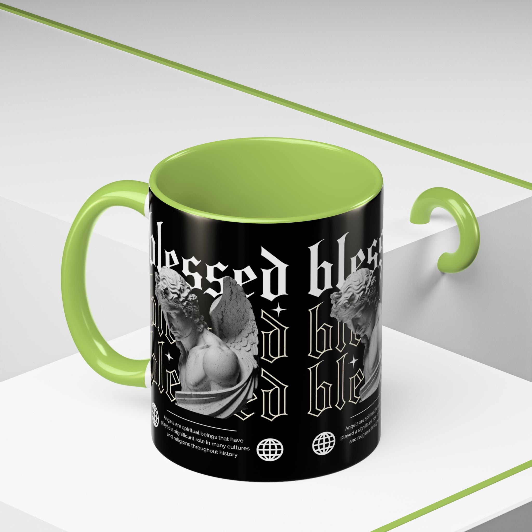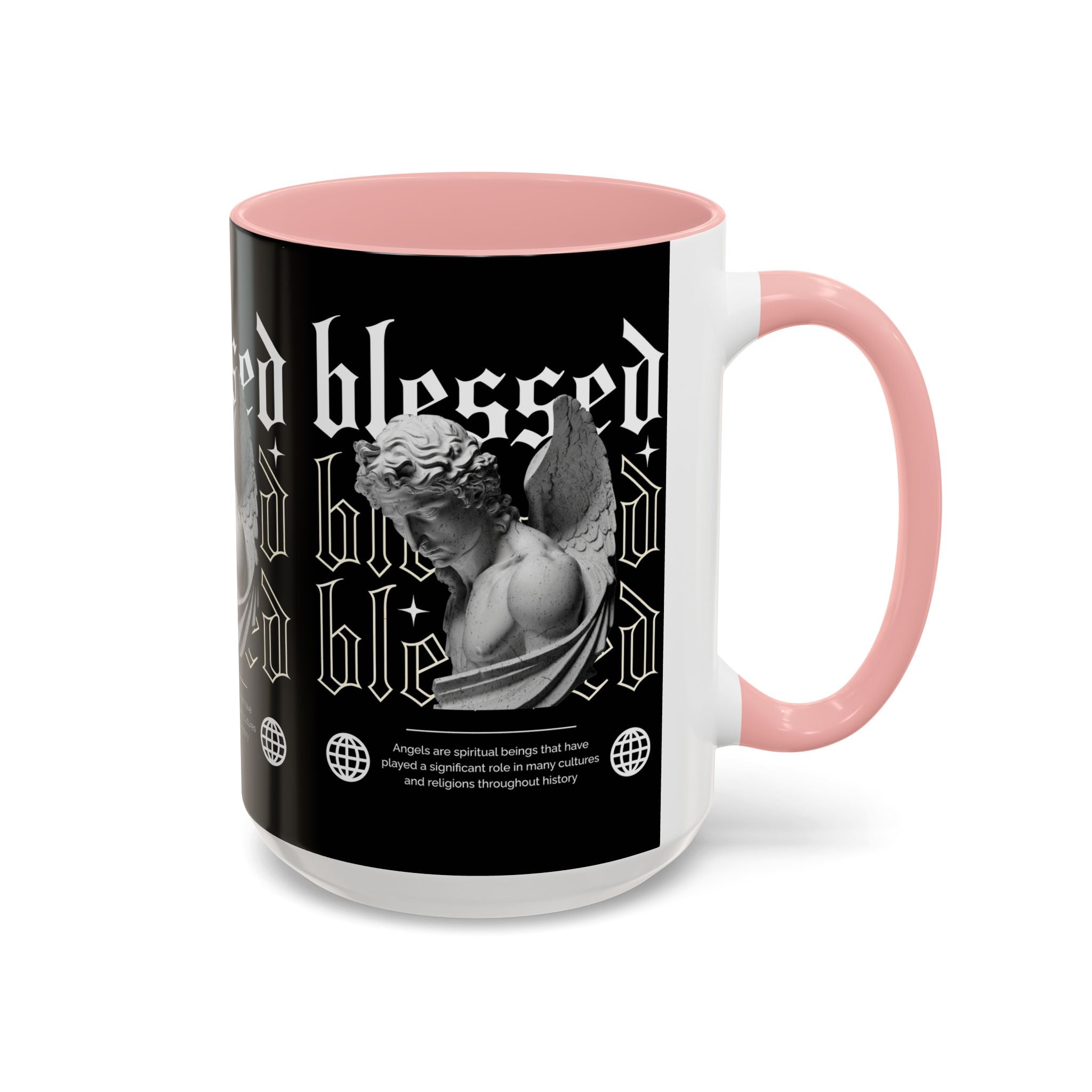 Start your day with more than just coffee—start it with faith, art, and bold design. The Blessed Accent Coffee Mug features a sculpted angel statue graphic paired with gothic “Blessed” lettering, turning your daily drinkware into a statement of spirituality and strength.