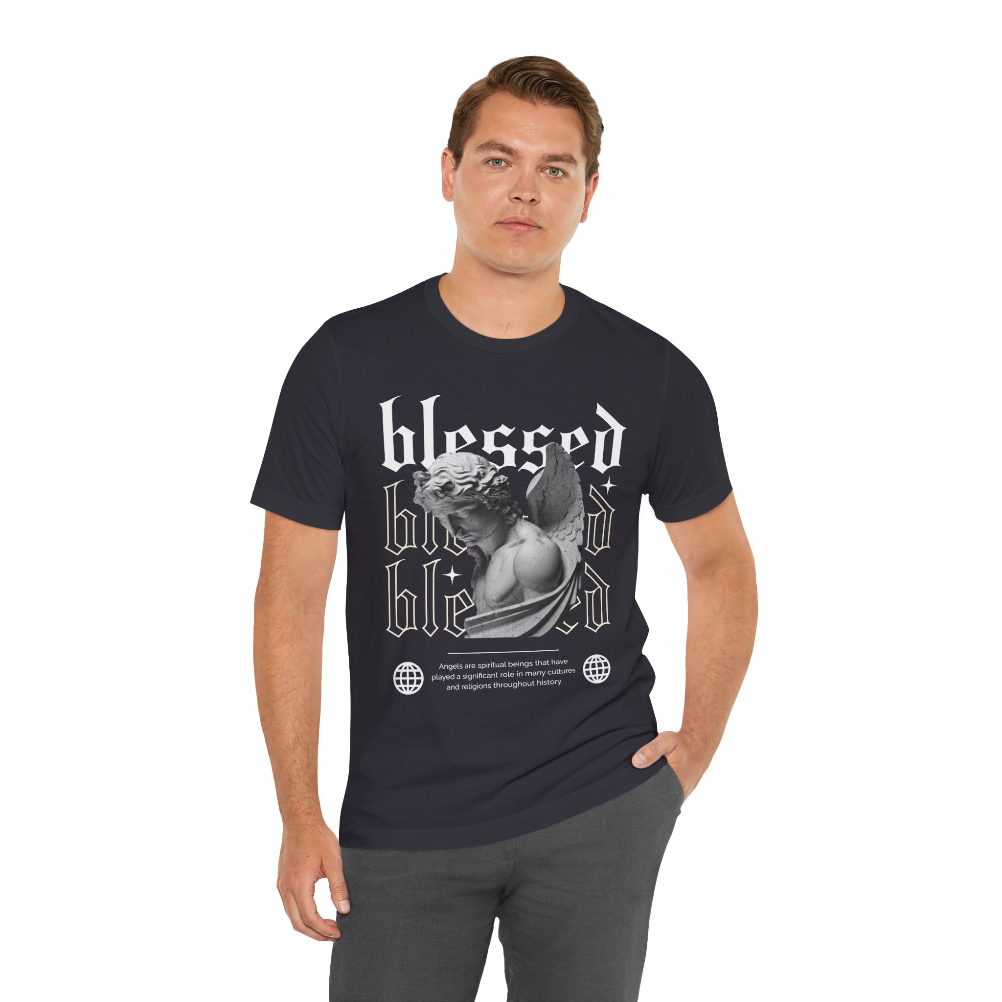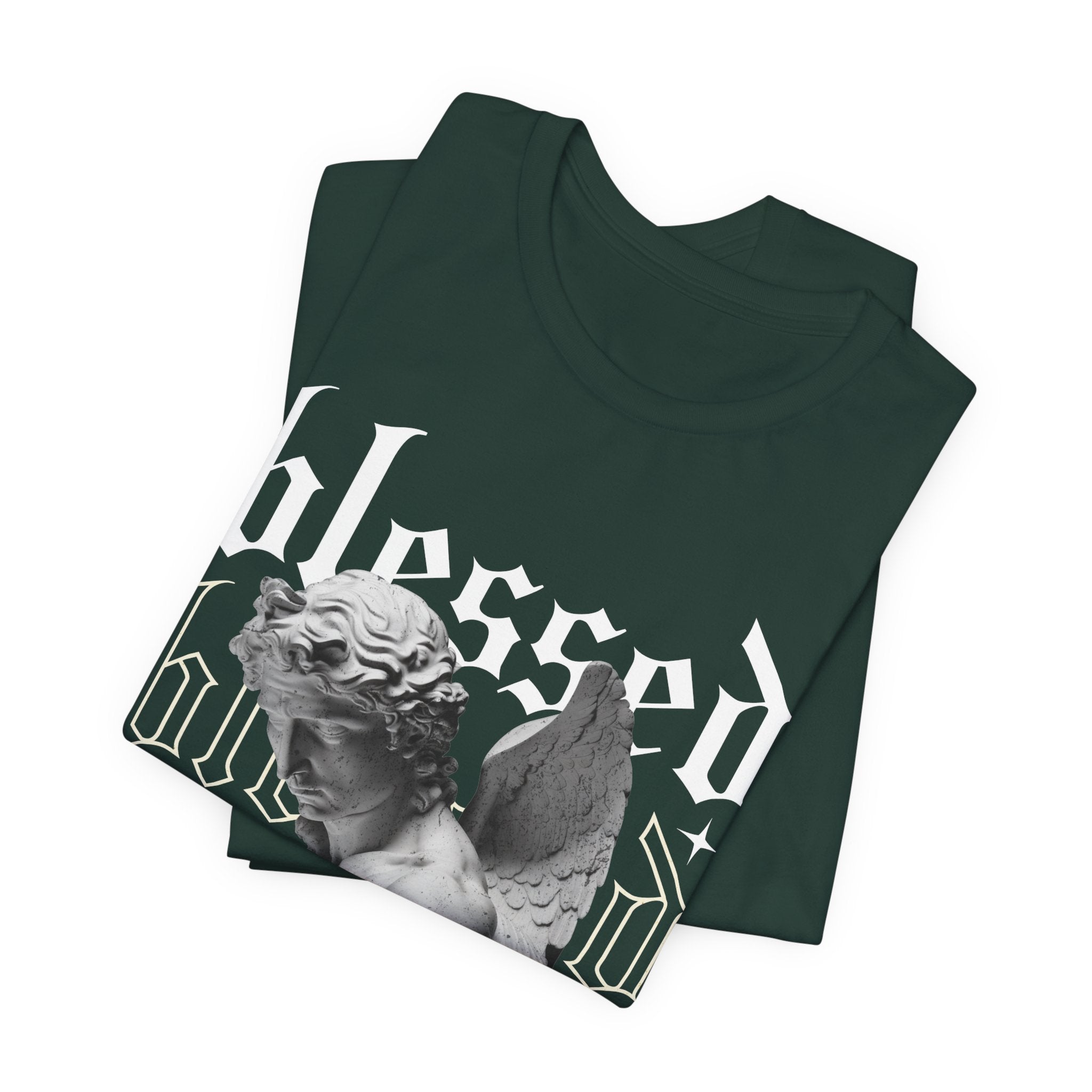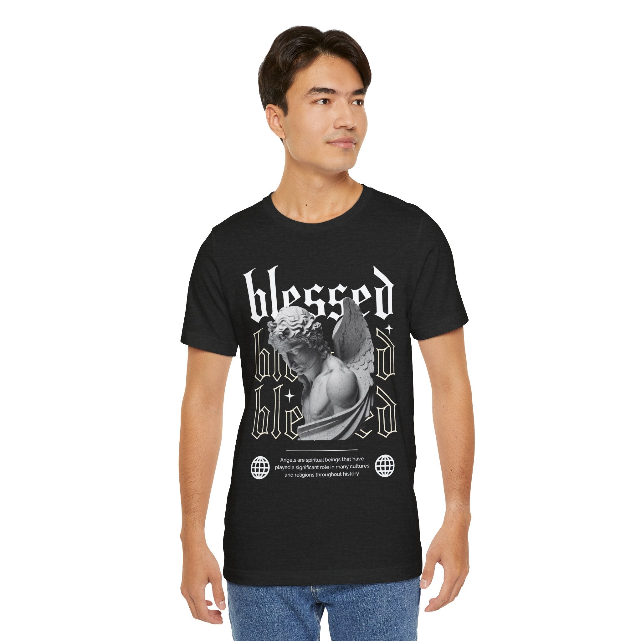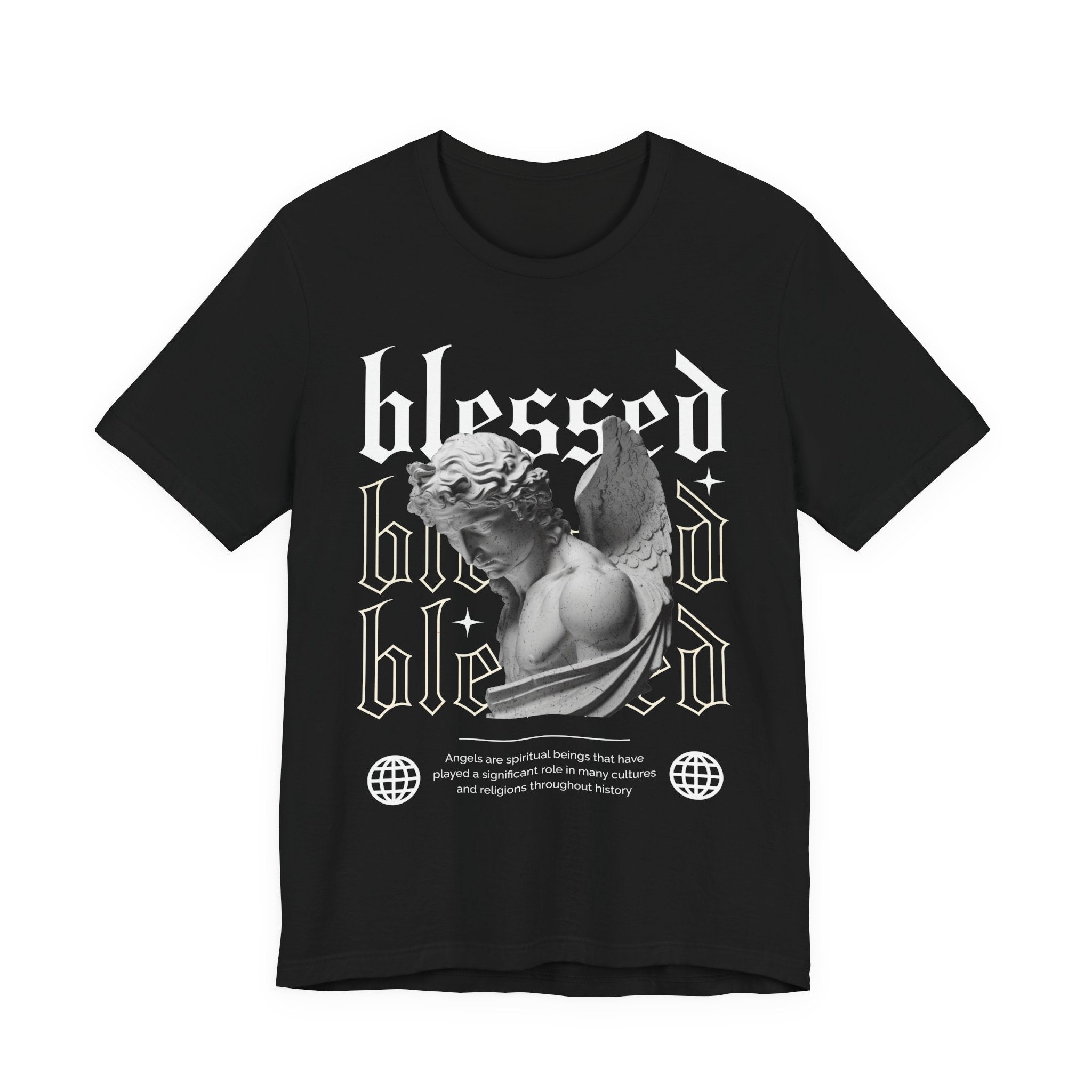 The Blessed Unisex Jersey Short Sleeve Tee blends timeless spirituality, gothic artistry, and modern streetwear aesthetics into one powerful piece. Featuring a sculpted angel statue graphic with bold gothic lettering, this tee represents protection, faith, and culture—making it more than just clothing, but a statement of belief and resilience.