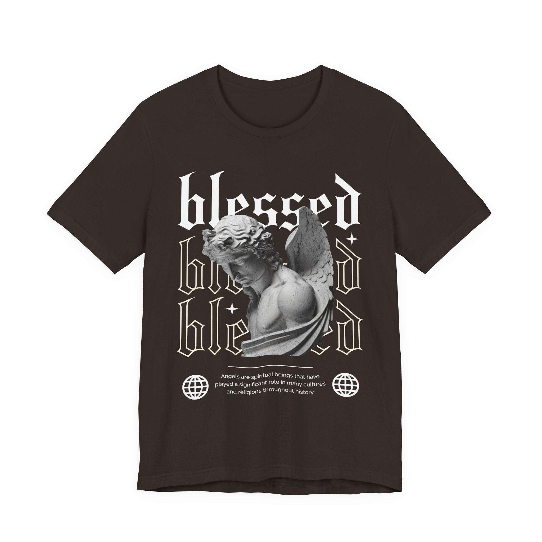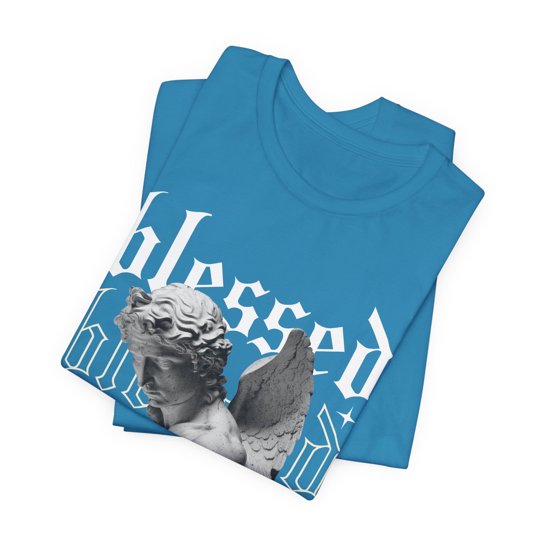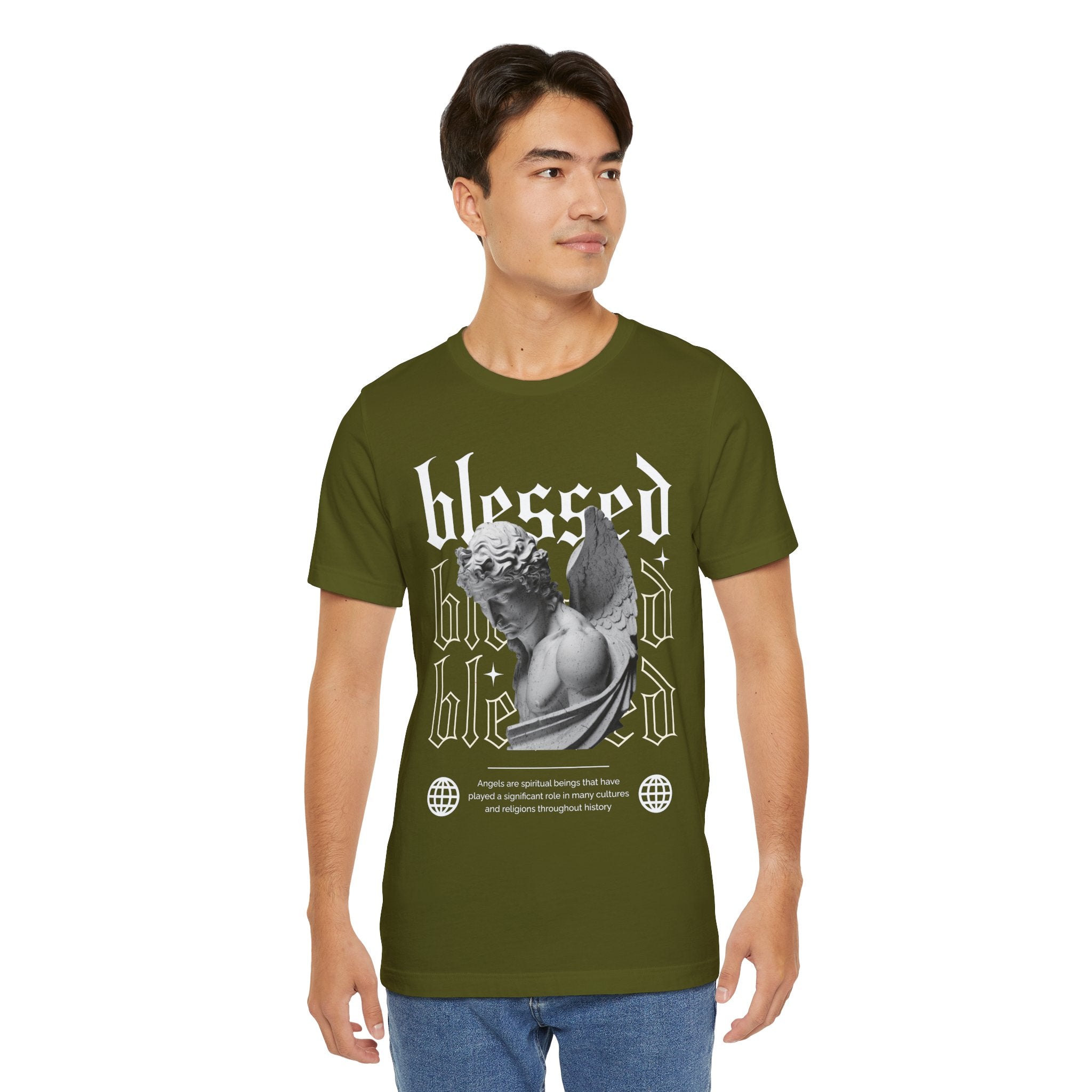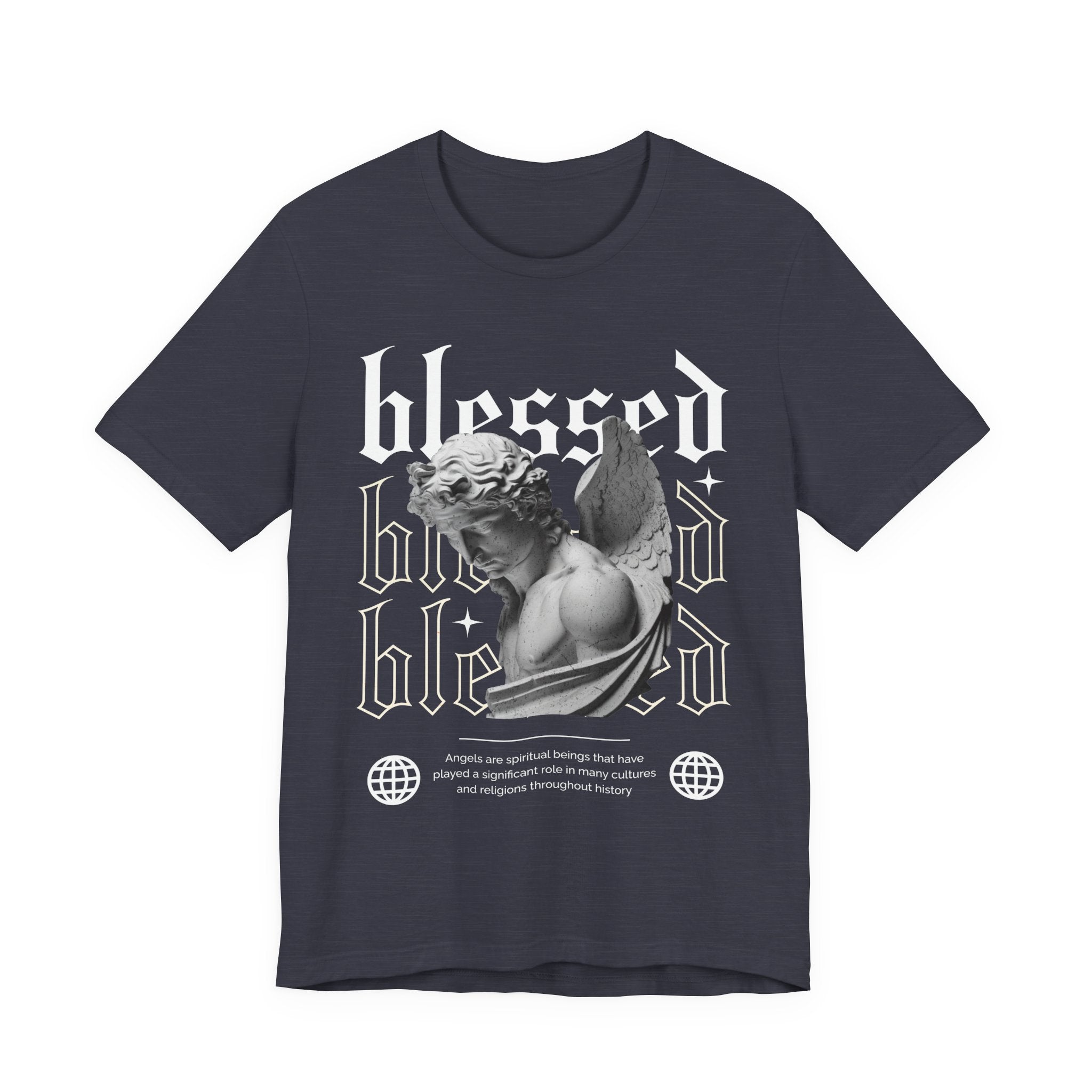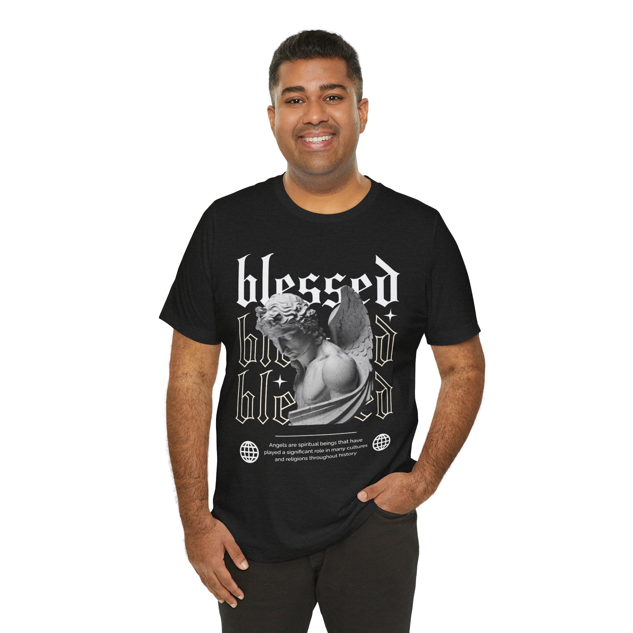 The Blessed Unisex Jersey Short Sleeve Tee blends timeless spirituality, gothic artistry, and modern streetwear aesthetics into one powerful piece. Featuring a sculpted angel statue graphic with bold gothic lettering, this tee represents protection, faith, and culture—making it more than just clothing, but a statement of belief and resilience.