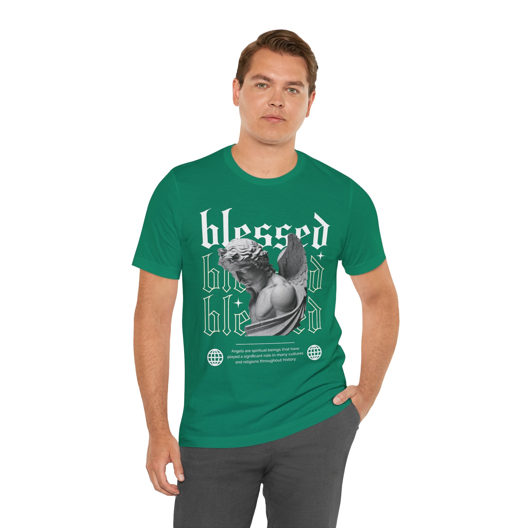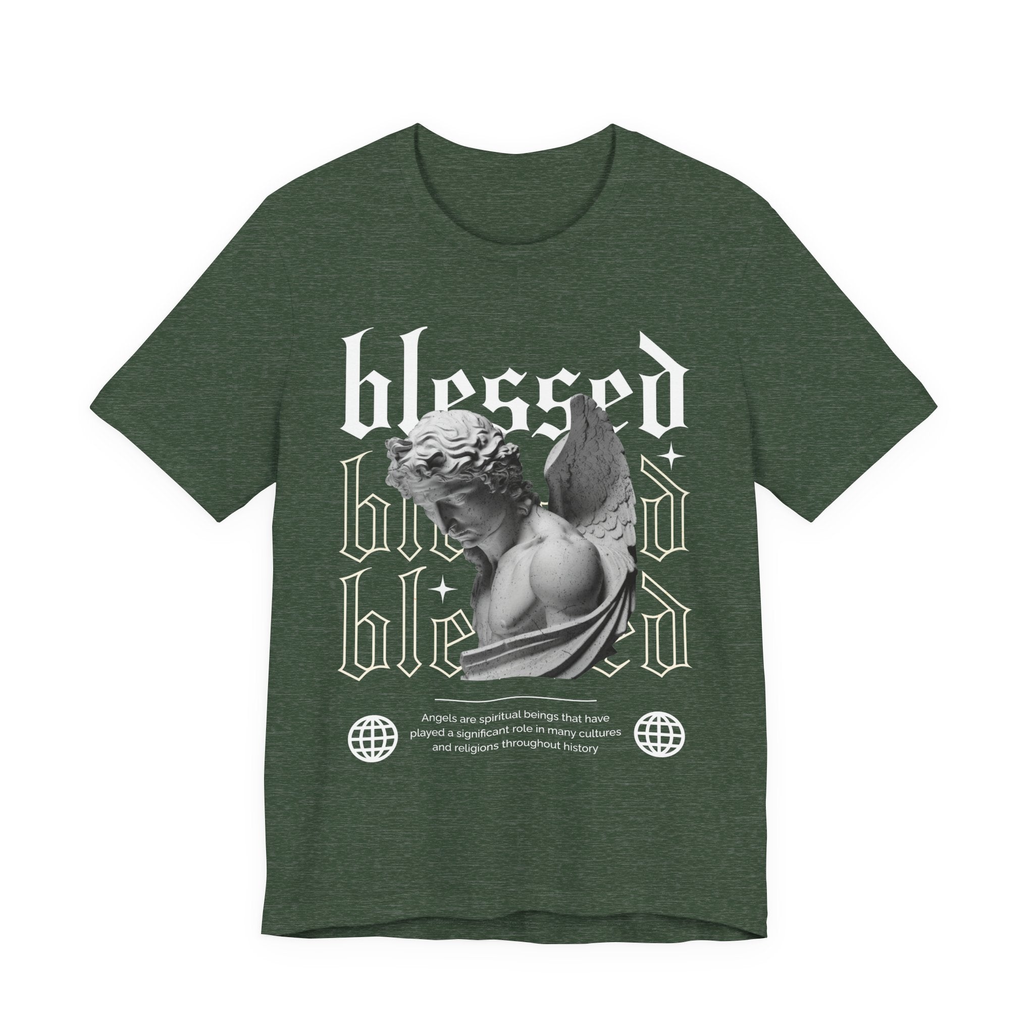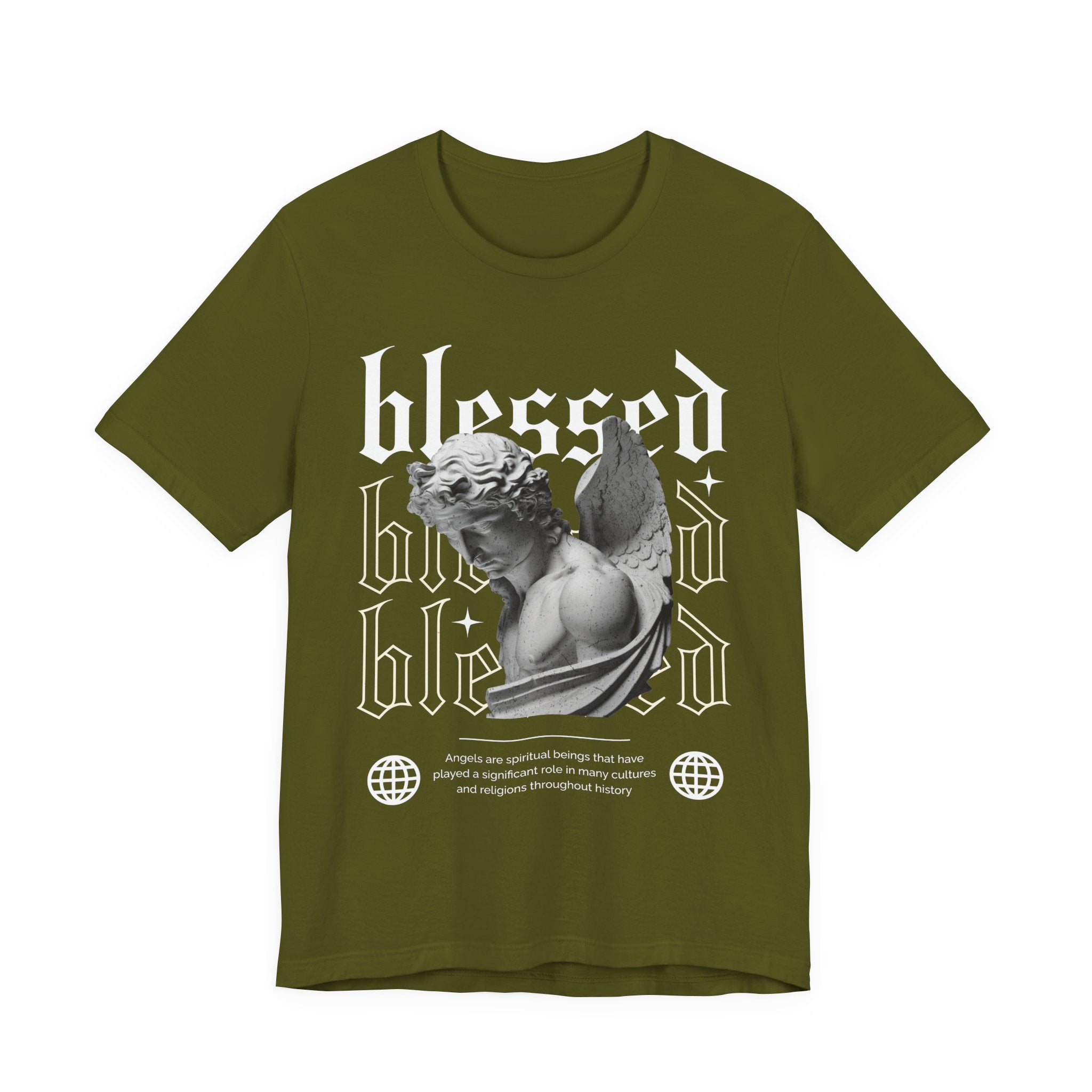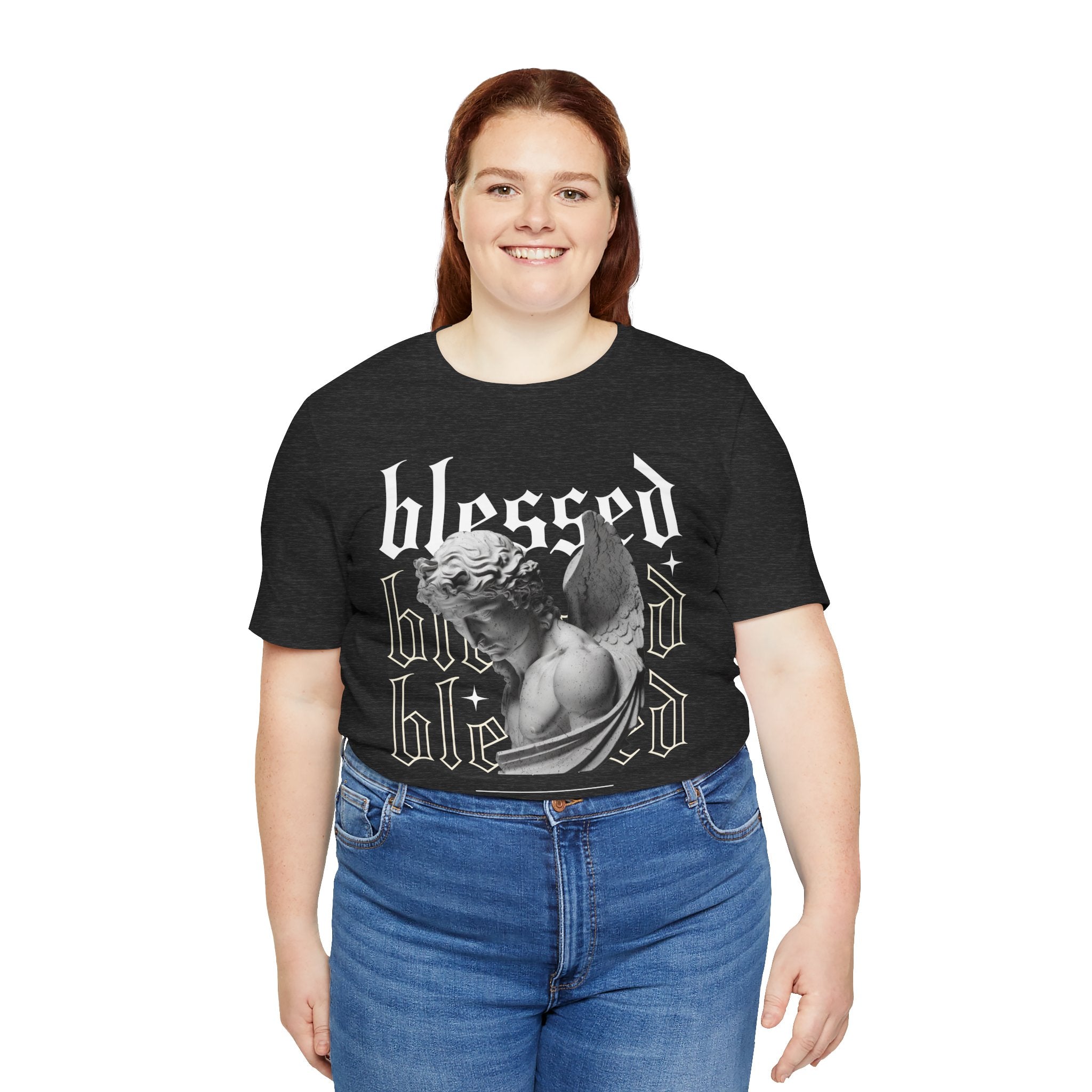 The Blessed Unisex Jersey Short Sleeve Tee blends timeless spirituality, gothic artistry, and modern streetwear aesthetics into one powerful piece. Featuring a sculpted angel statue graphic with bold gothic lettering, this tee represents protection, faith, and culture—making it more than just clothing, but a statement of belief and resilience.