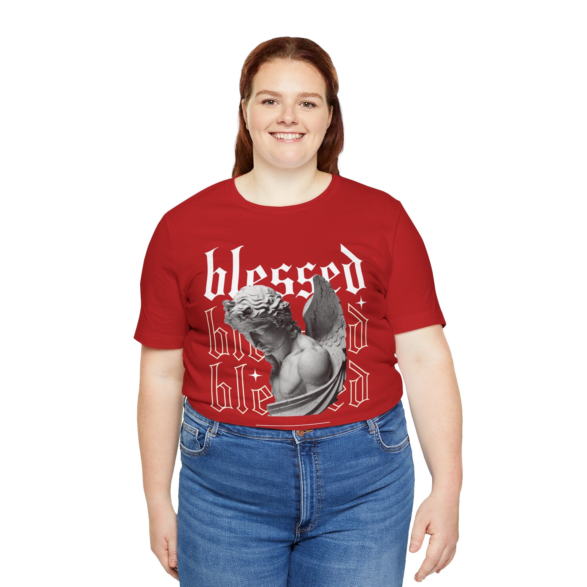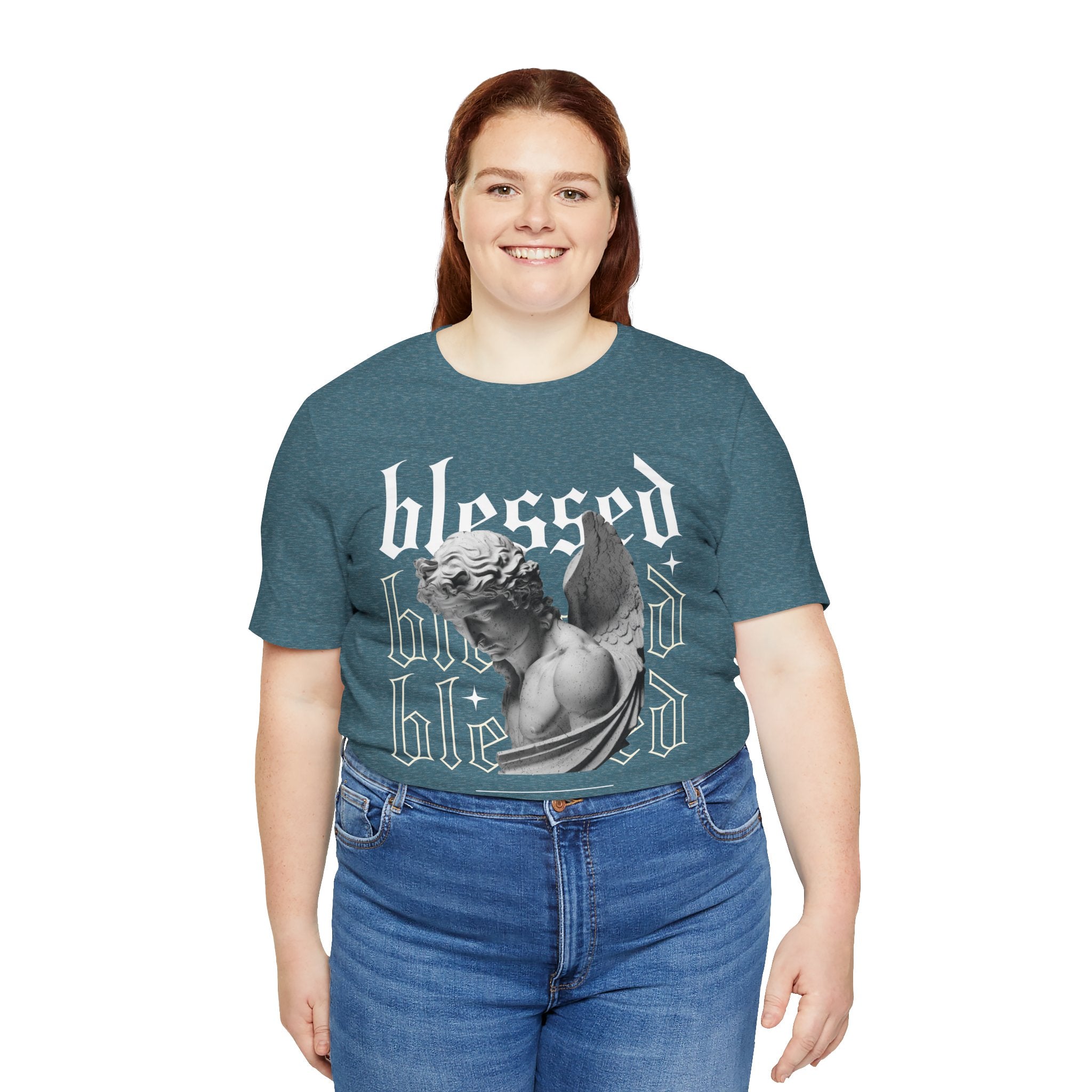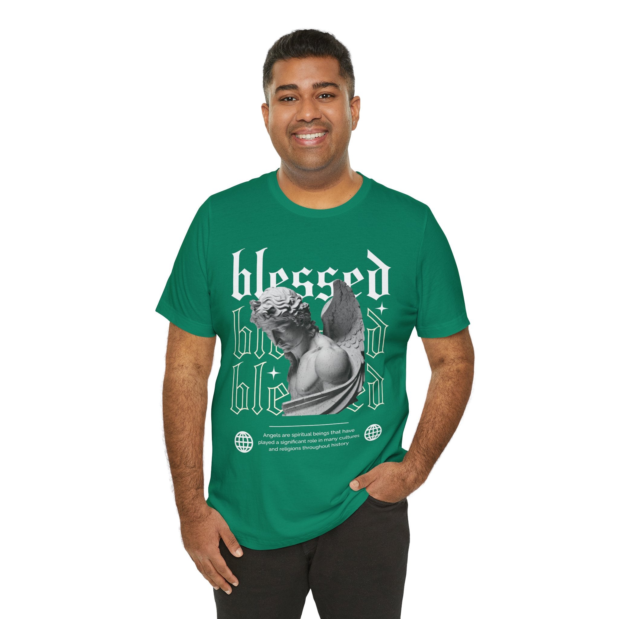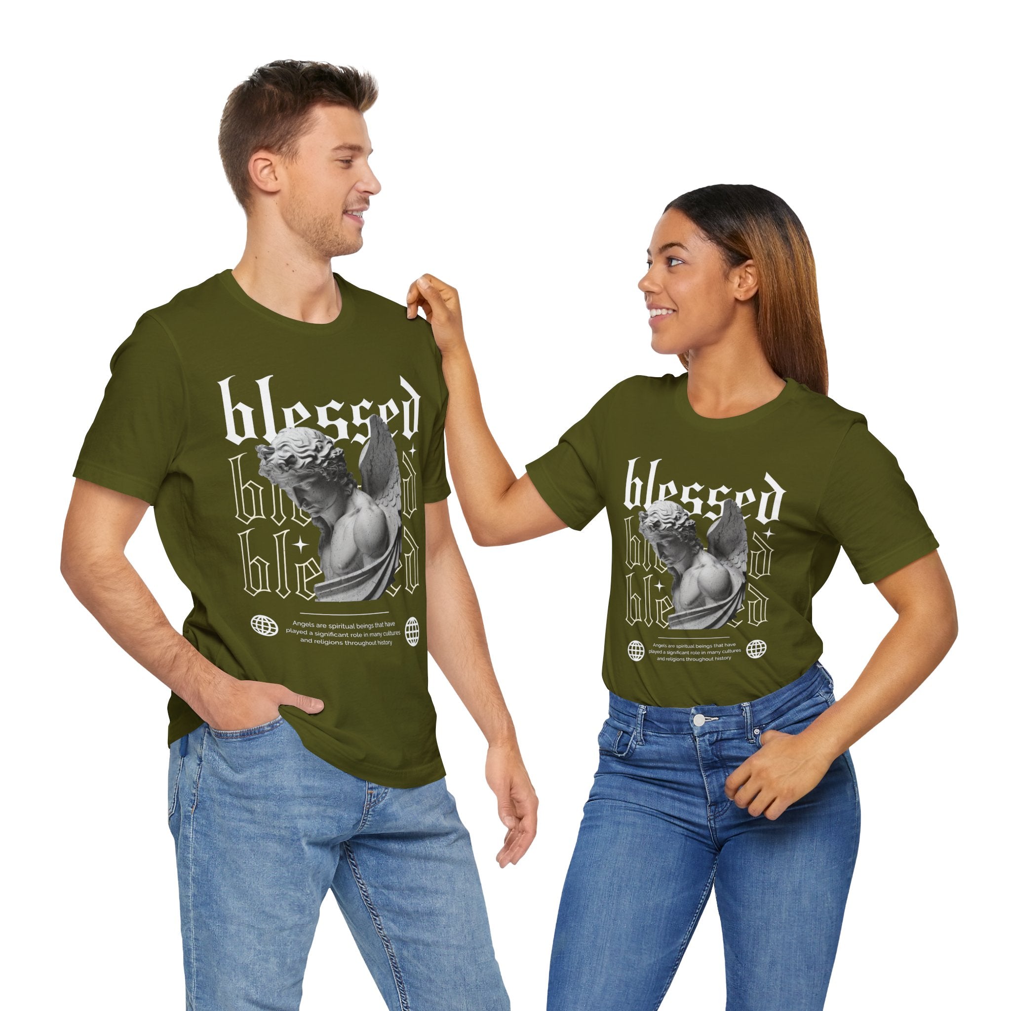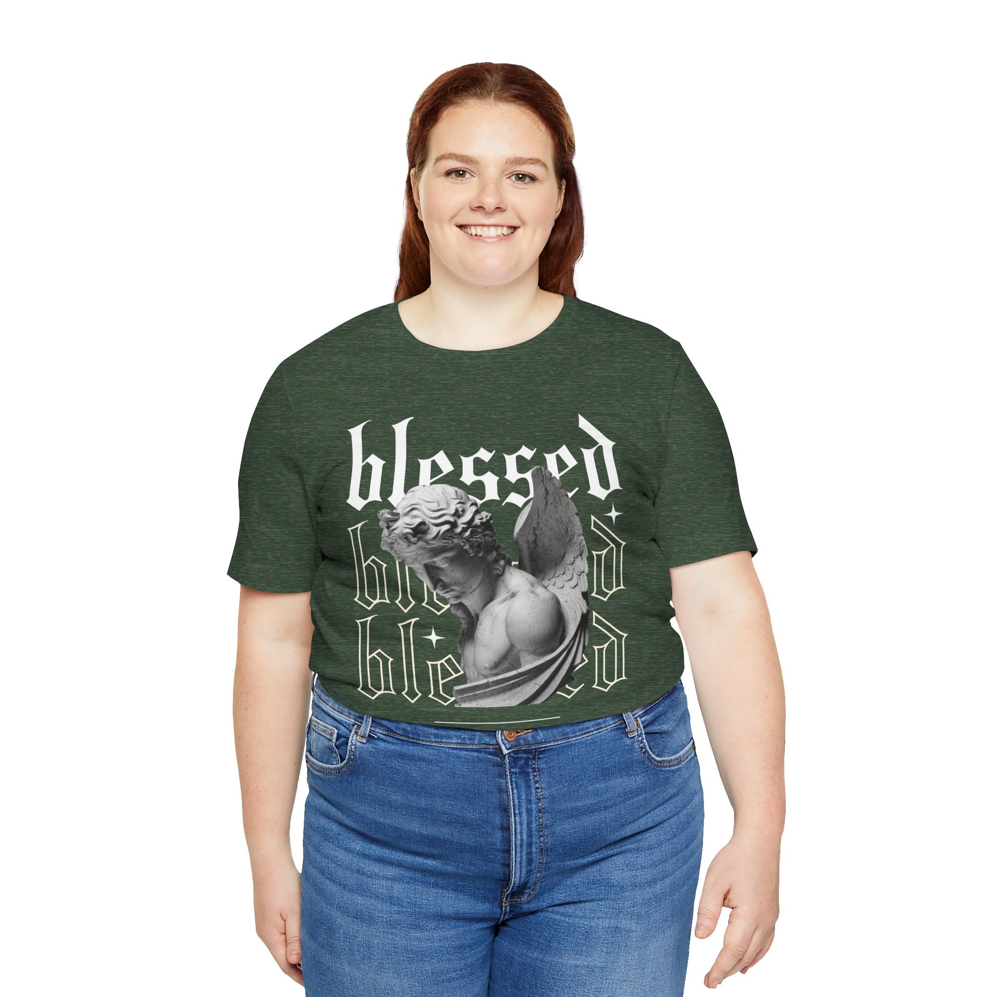 The Blessed Unisex Jersey Short Sleeve Tee blends timeless spirituality, gothic artistry, and modern streetwear aesthetics into one powerful piece. Featuring a sculpted angel statue graphic with bold gothic lettering, this tee represents protection, faith, and culture—making it more than just clothing, but a statement of belief and resilience.
