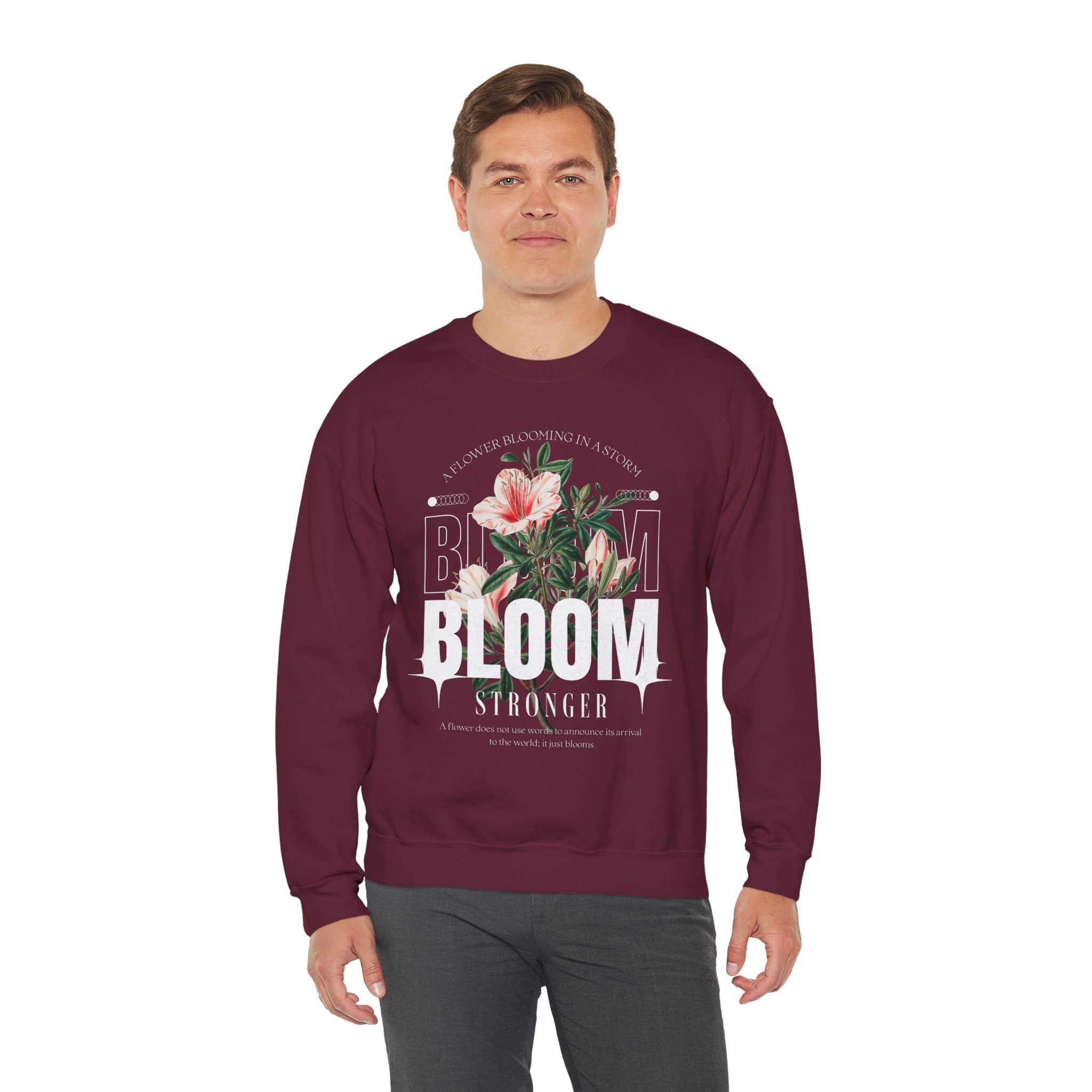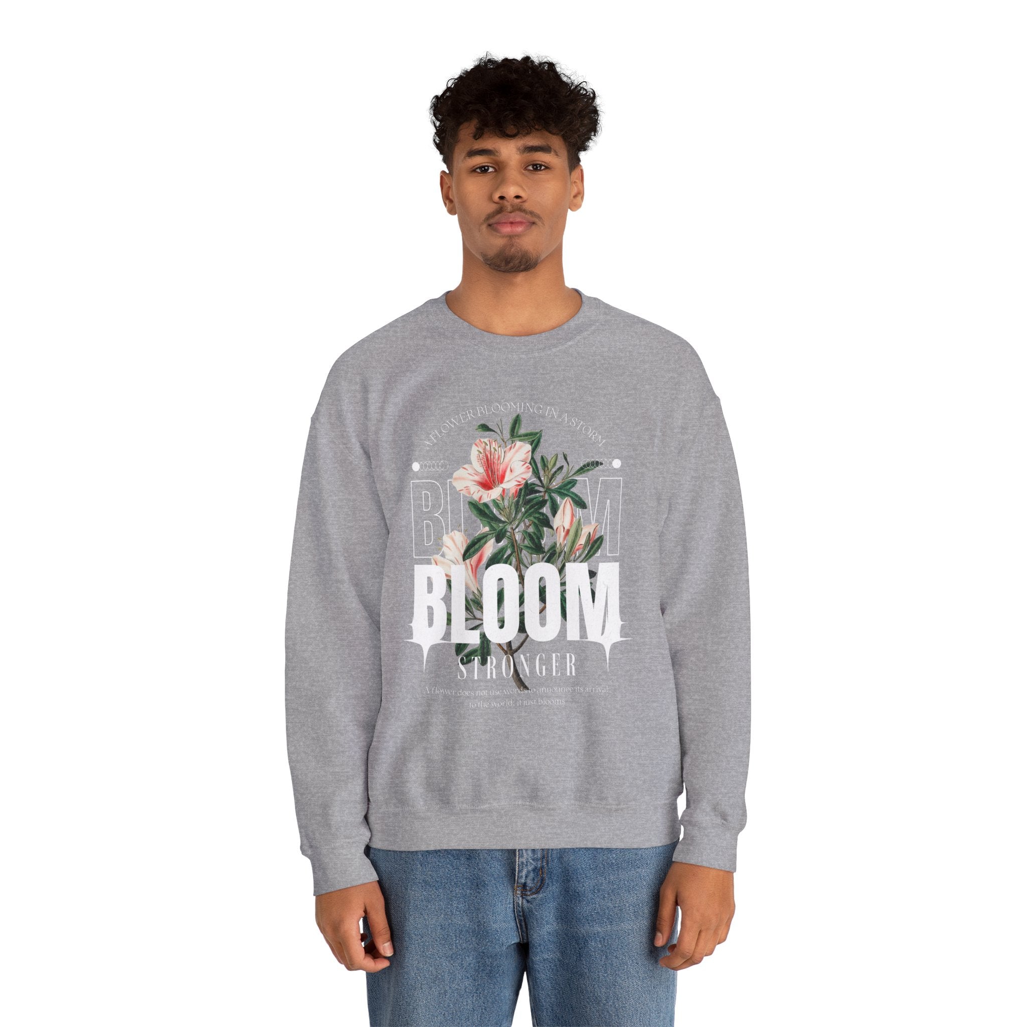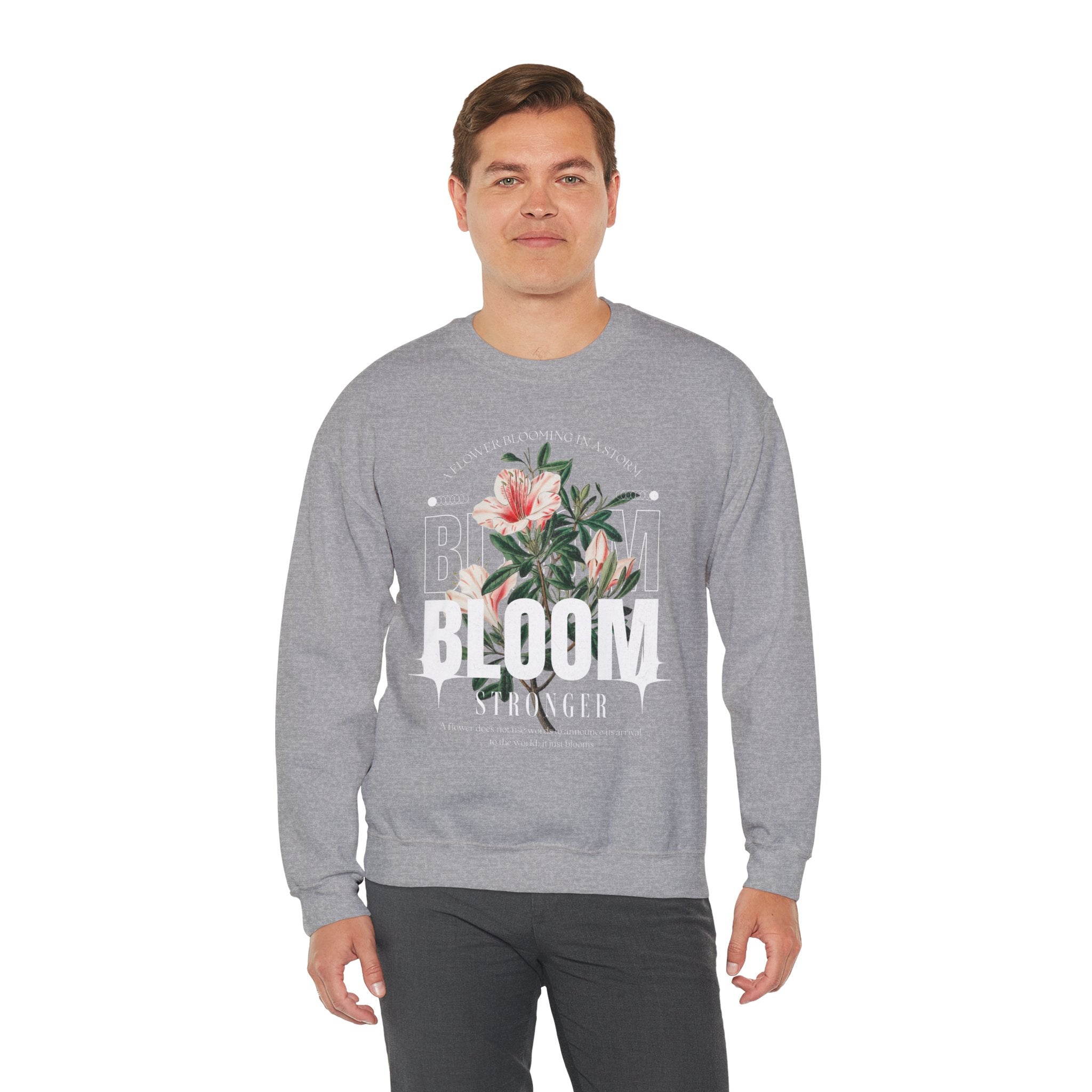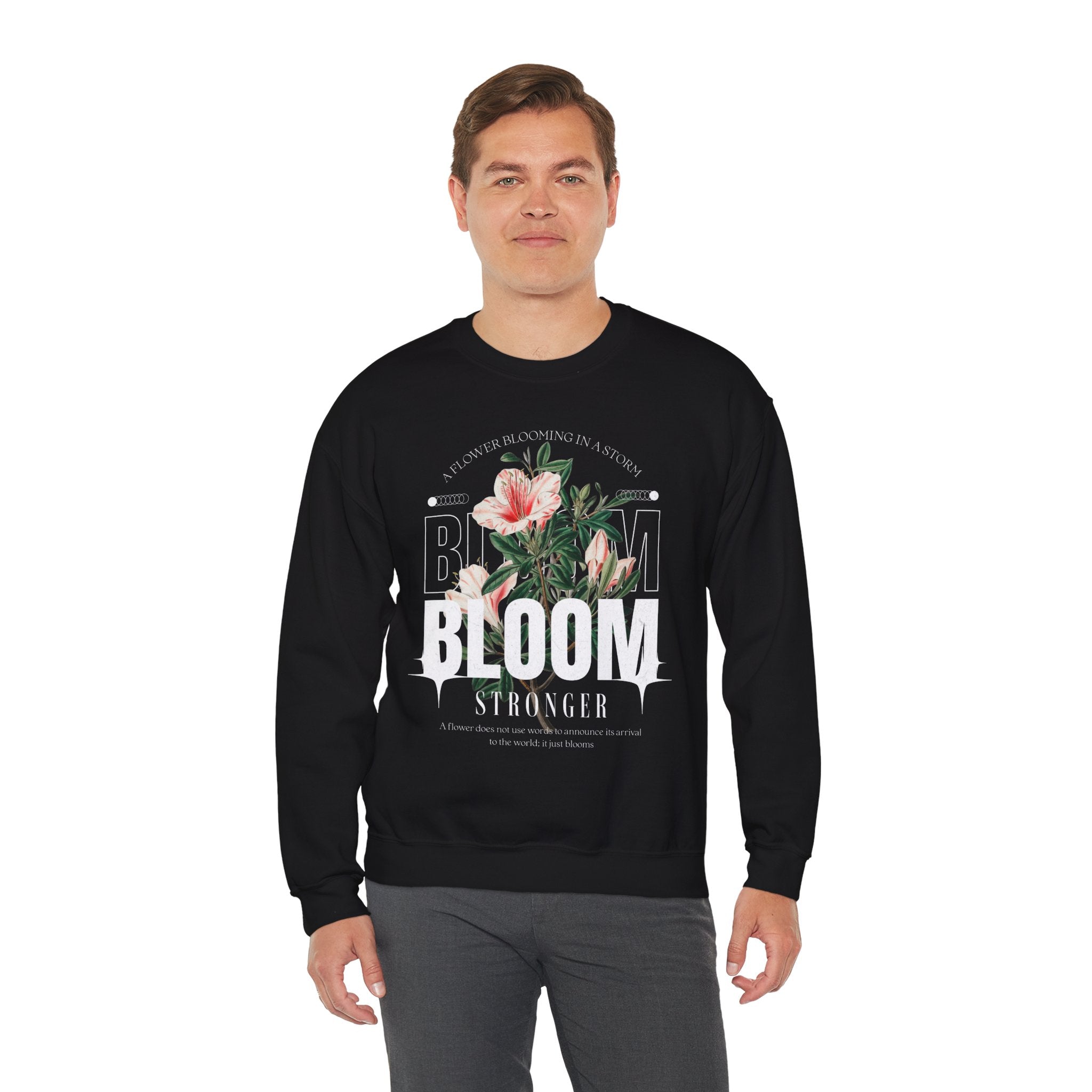 Carry the spirit of resilience with the Bloom Stronger Crewneck Sweatshirt, a timeless blend of motivation and style. Featuring a beautifully detailed floral graphic with the uplifting message “A Flower Blooming in a Storm,” this sweatshirt is a reminder that growth often comes through challenges.
