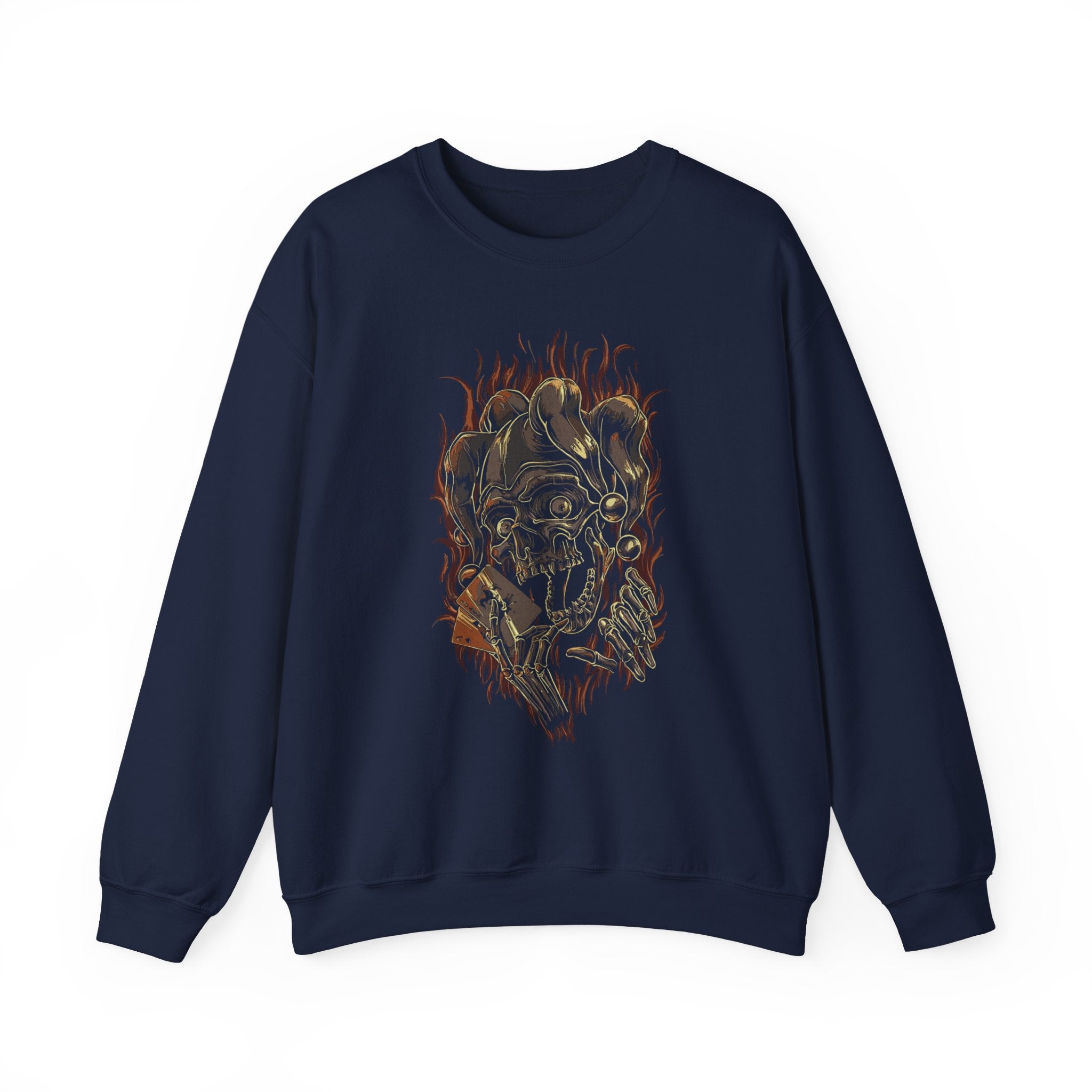 Step into your power with the Burning Jester Skull Sweatshirt — a dark symphony of flames, madness, and style.