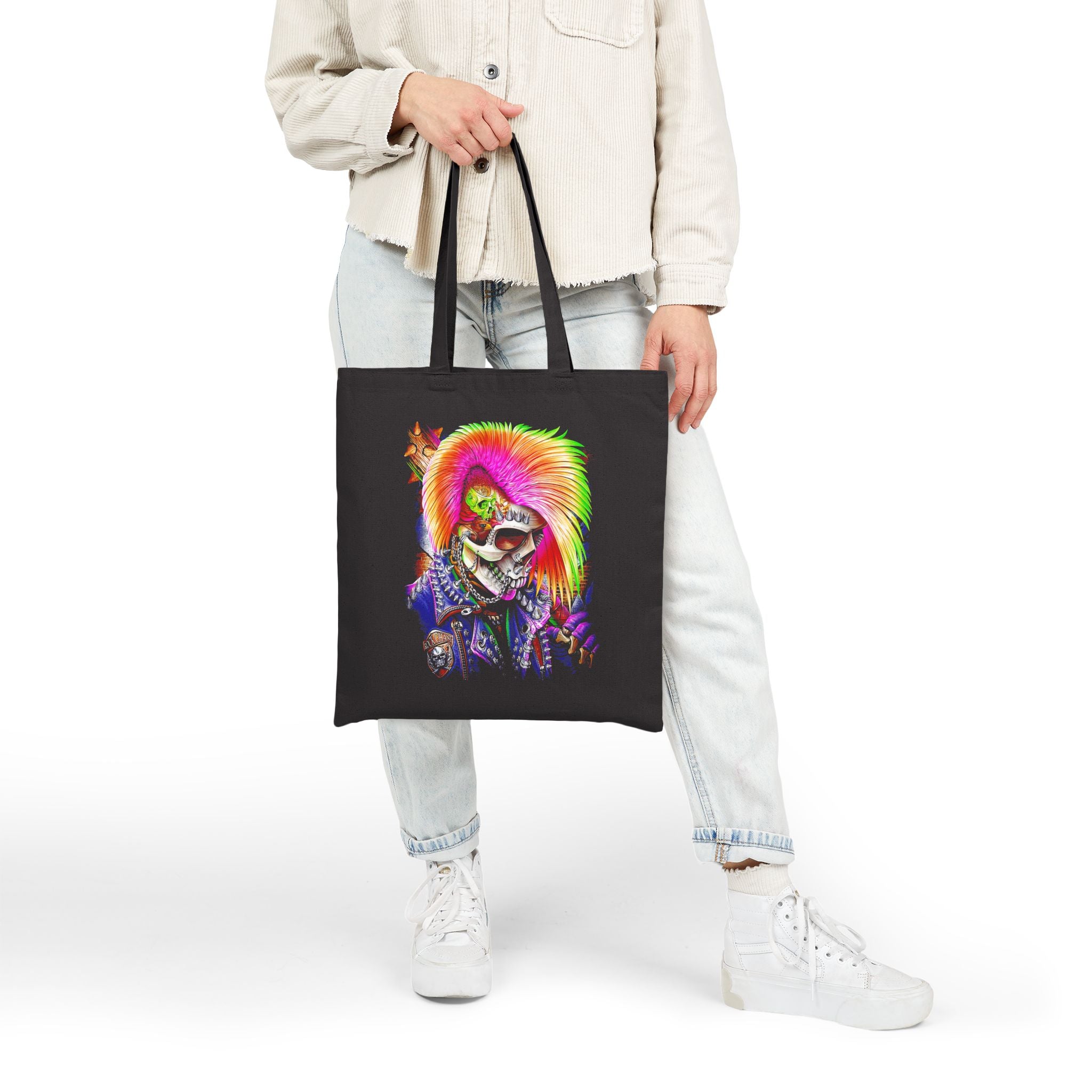 Featuring the iconic neon mohawked skull surrounded by electrifying colors, this tote doesn’t just carry your stuff — it carries your attitude.