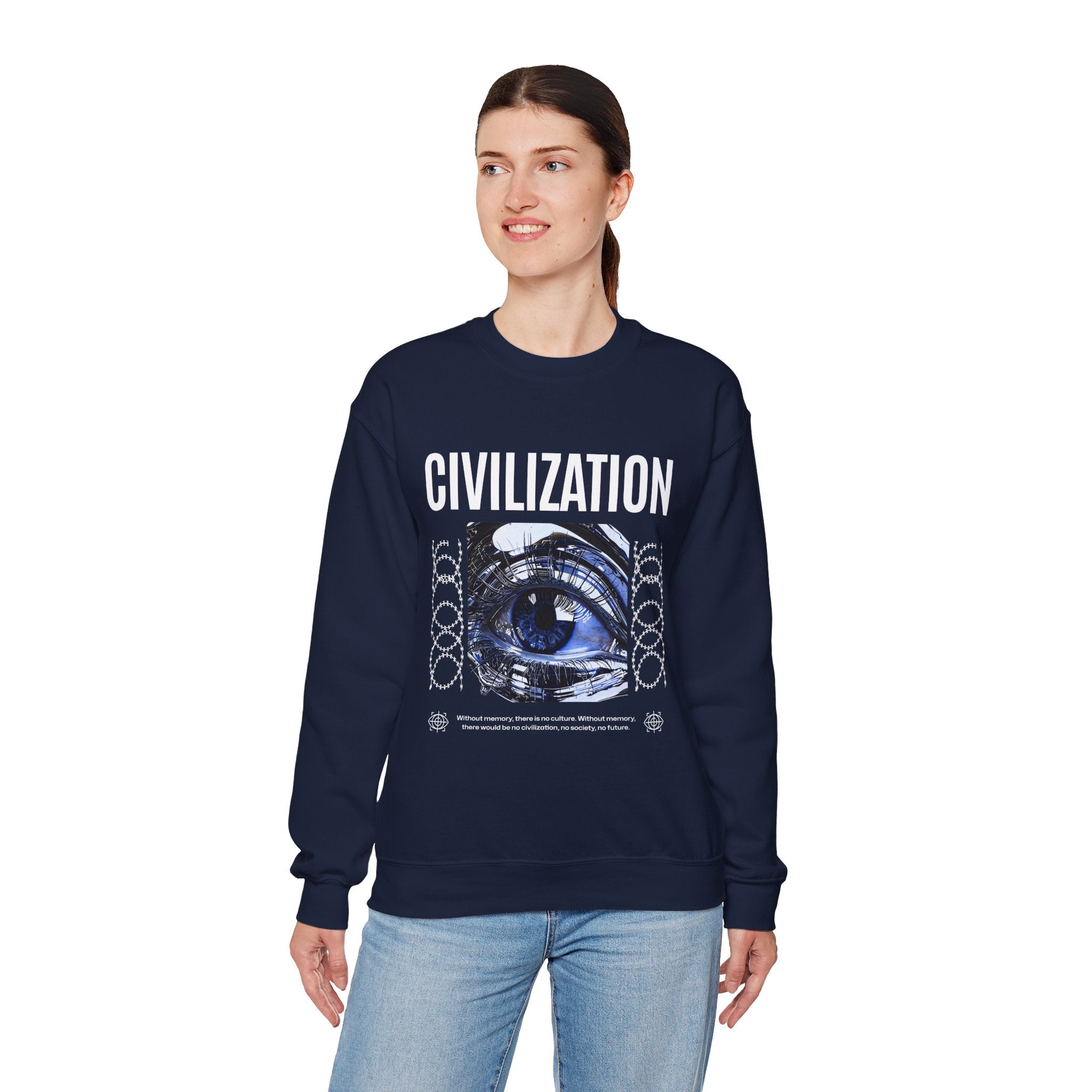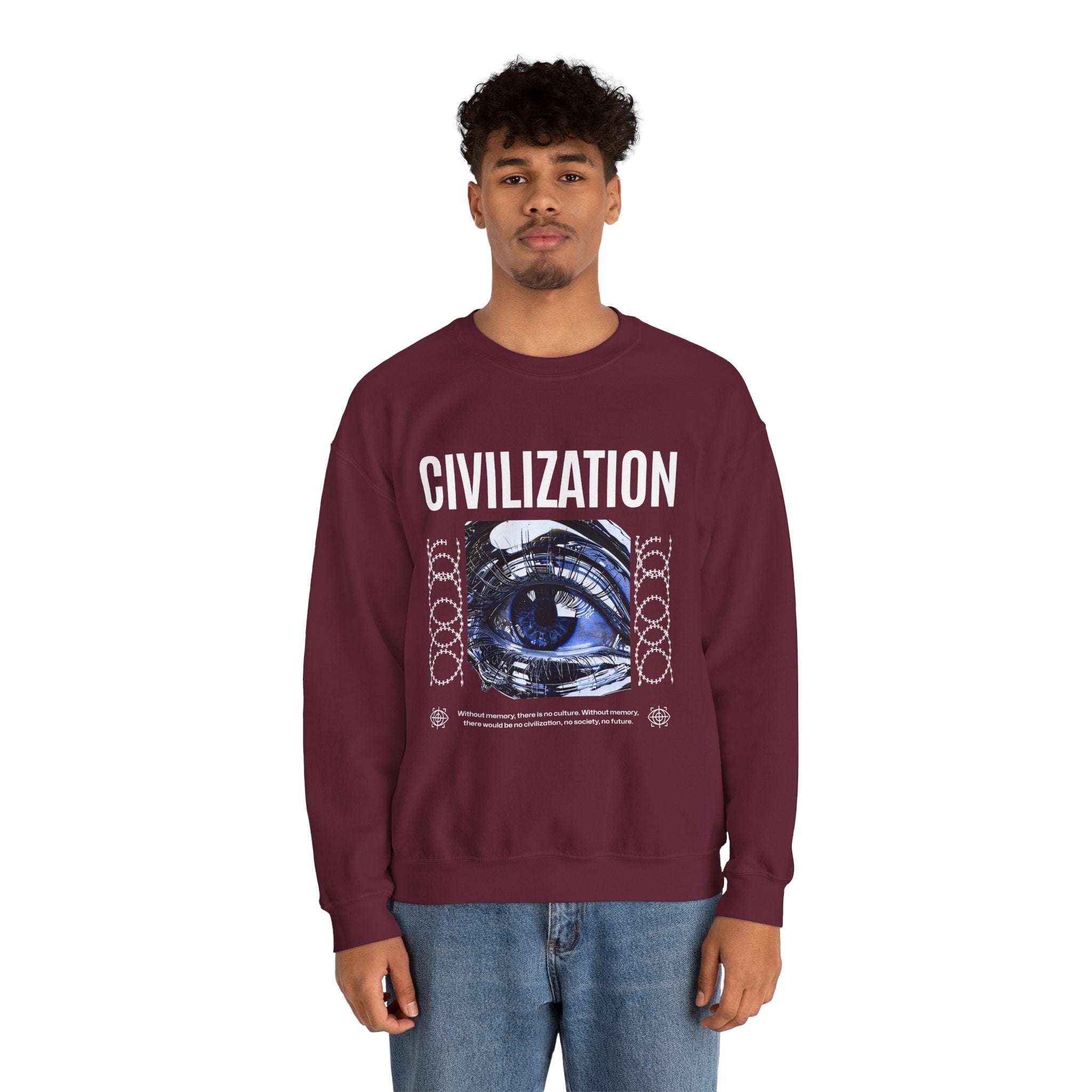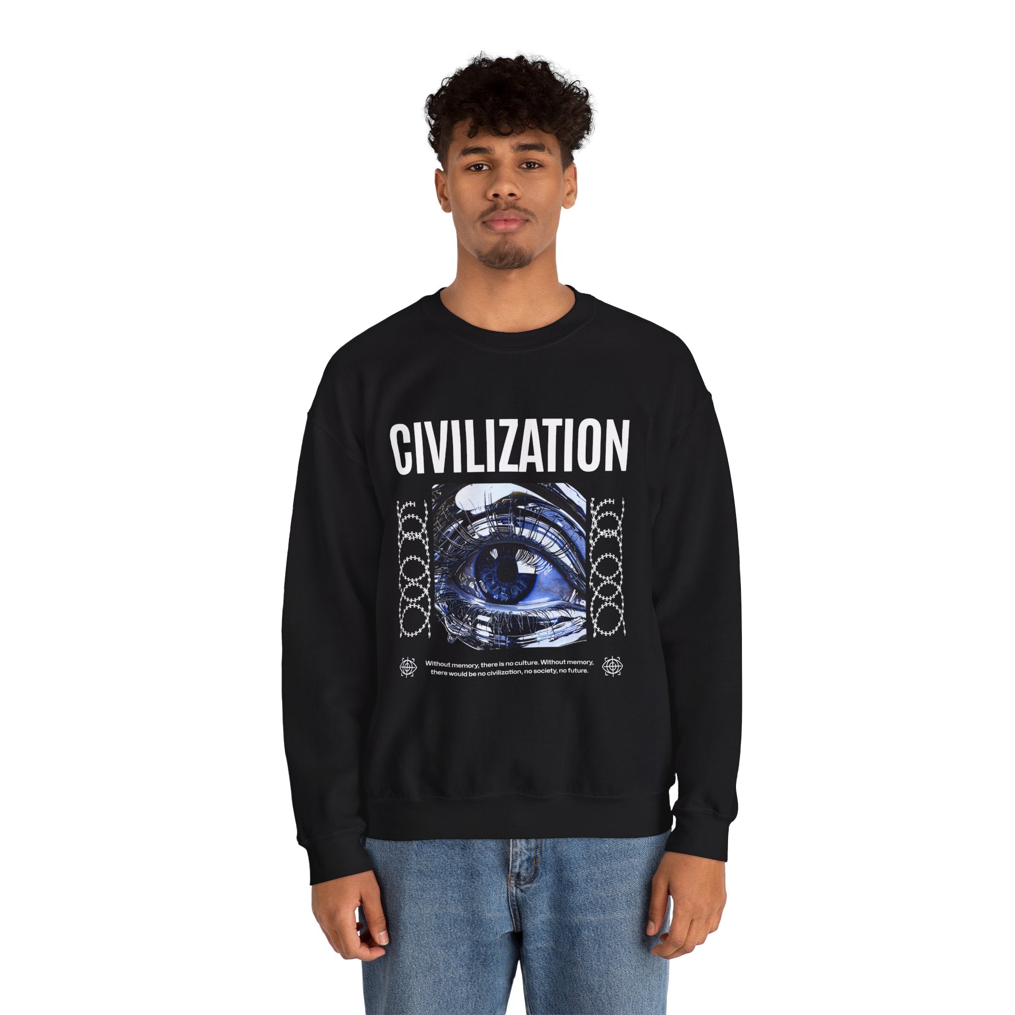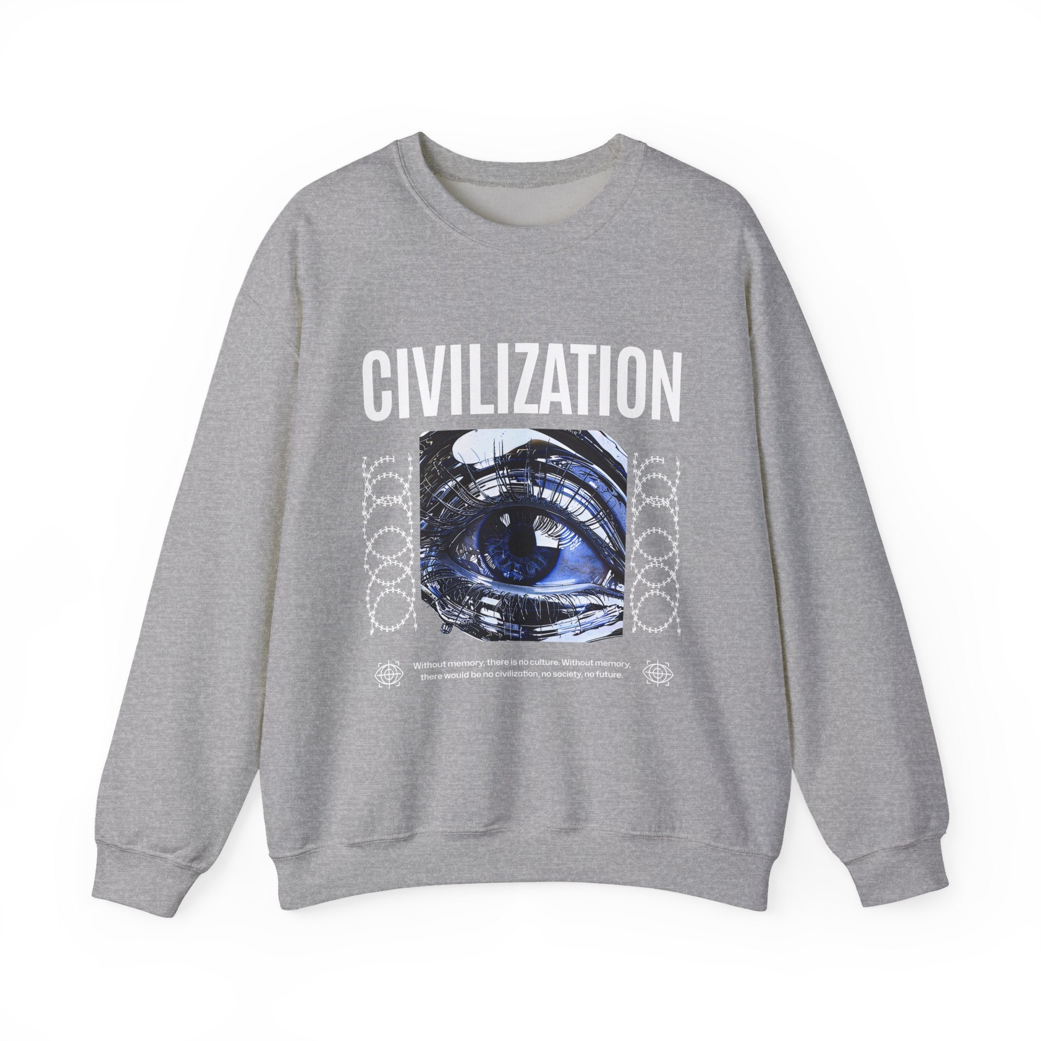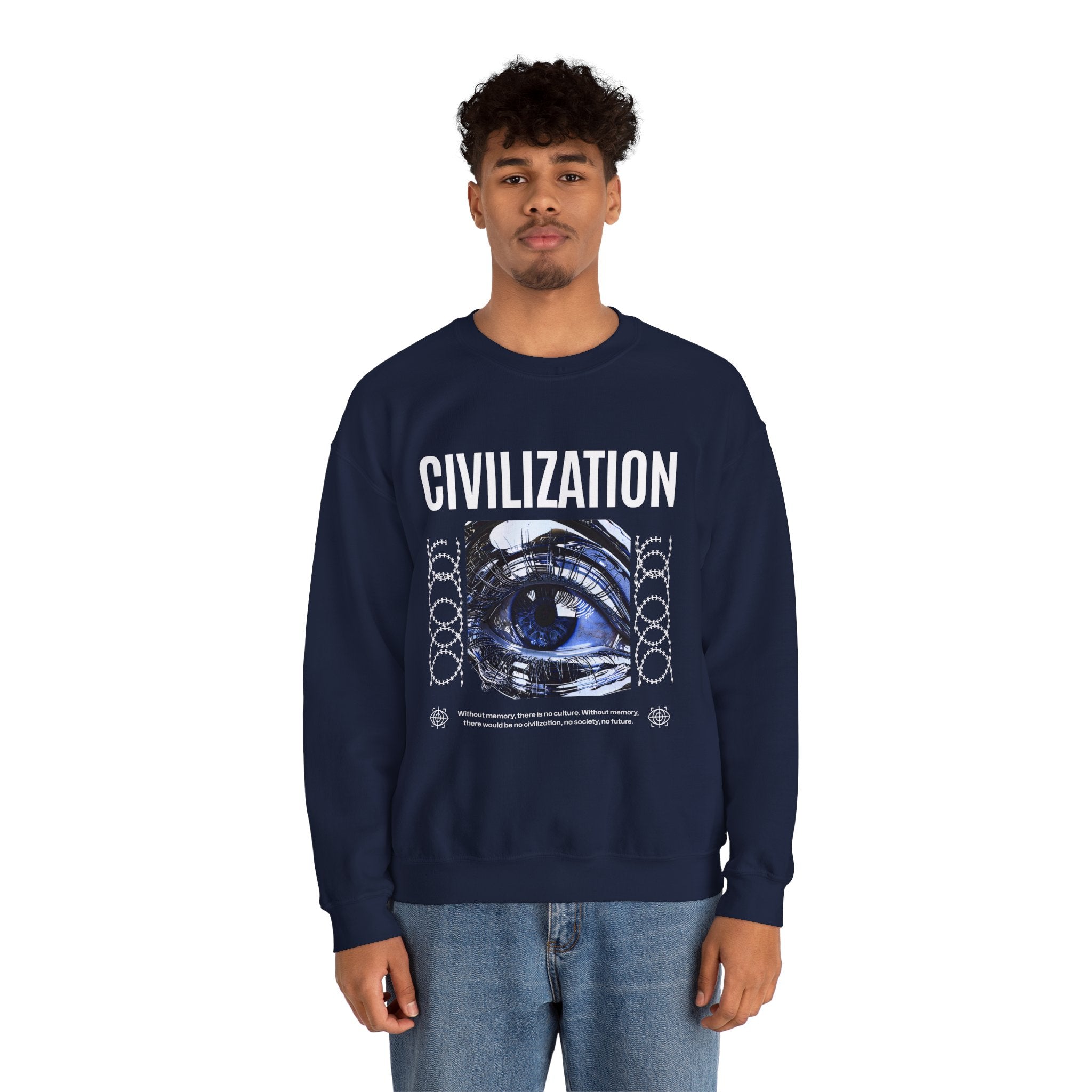 The Civilization Unisex Heavy Blend™ Crewneck Sweatshirt transforms streetwear into abstract futuristic art. The bold blue digital eye graphic framed with symbolic geometric patterns and the word Civilization makes this pullover a statement of awareness, memory, and cultural evolution. It’s designed for those who value artistic fashion, futurism, and visionary streetwear.