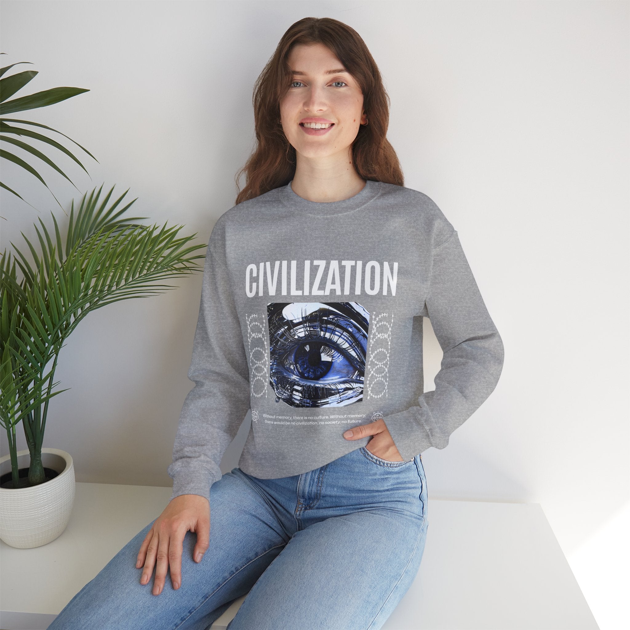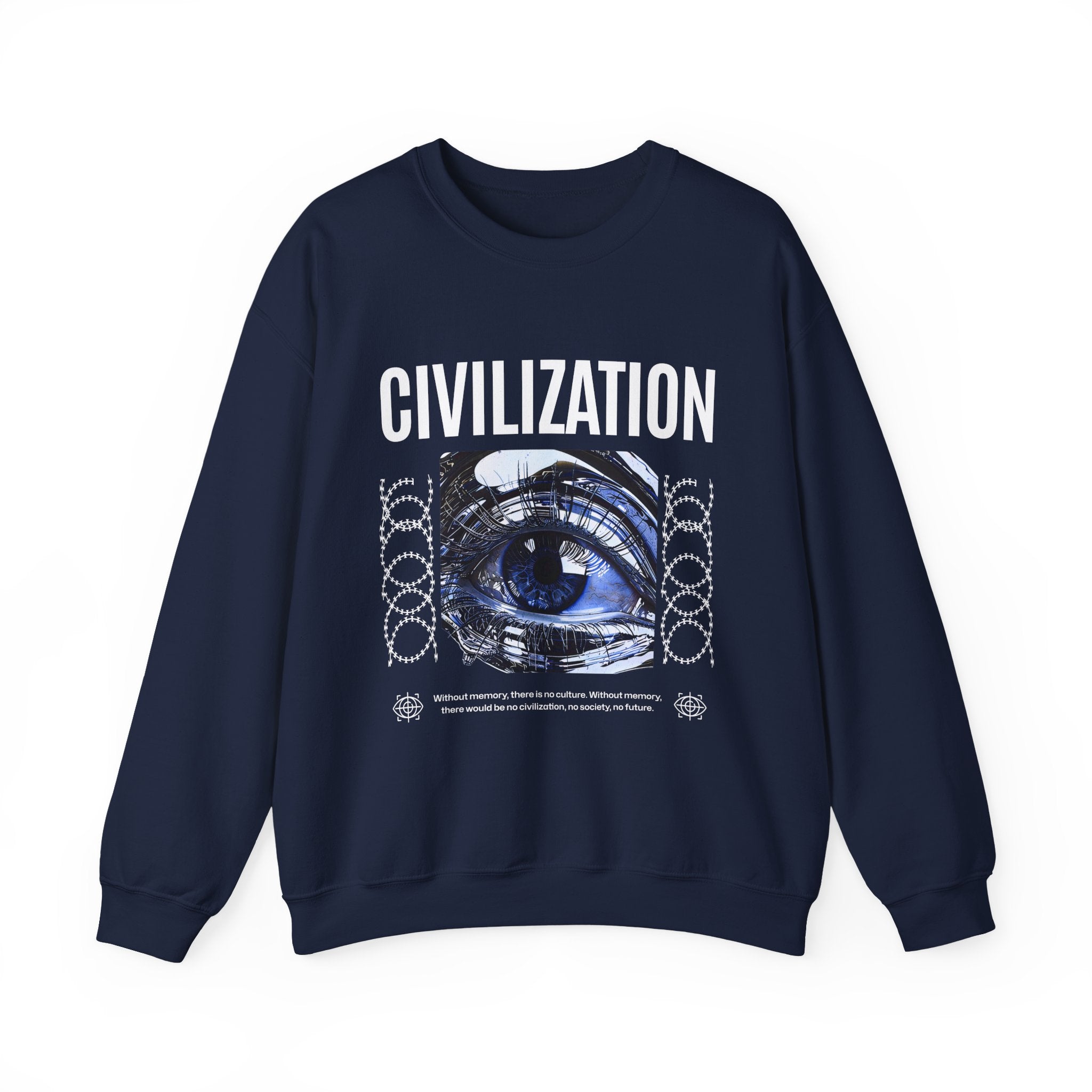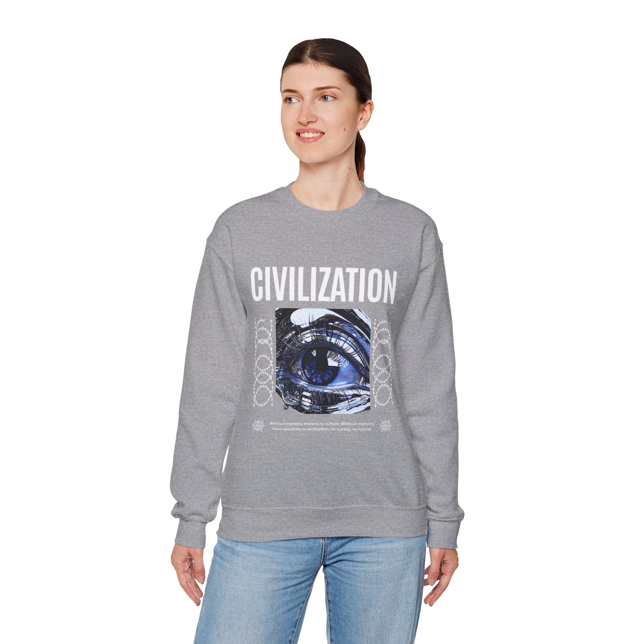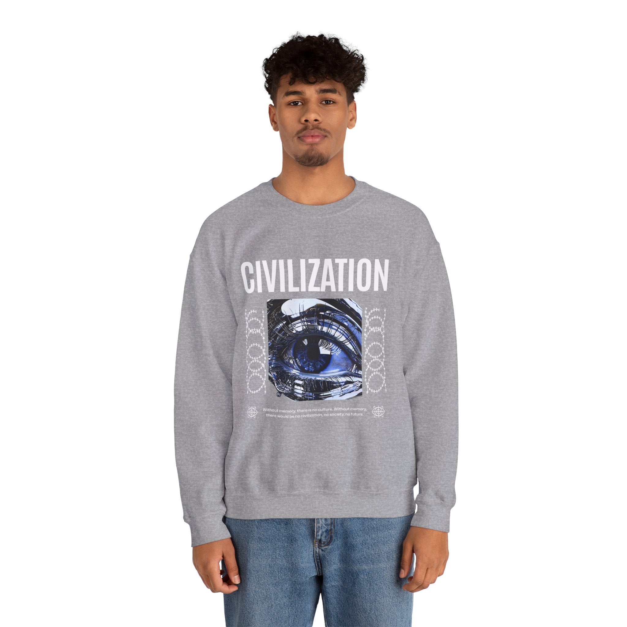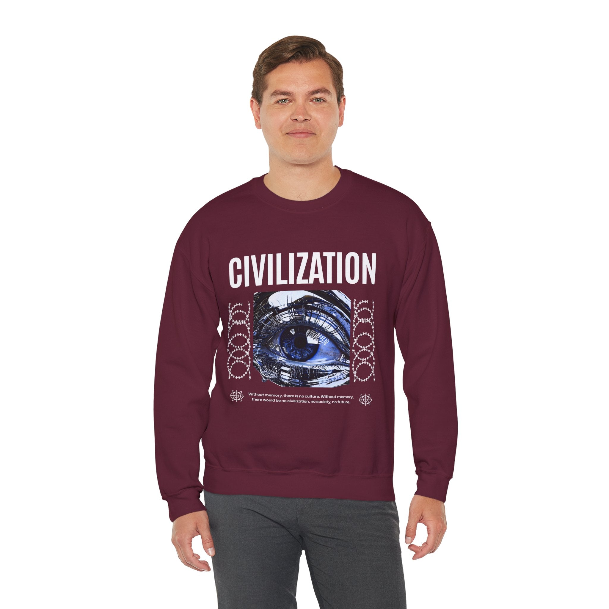 The Civilization Unisex Heavy Blend™ Crewneck Sweatshirt transforms streetwear into abstract futuristic art. The bold blue digital eye graphic framed with symbolic geometric patterns and the word Civilization makes this pullover a statement of awareness, memory, and cultural evolution. It’s designed for those who value artistic fashion, futurism, and visionary streetwear.