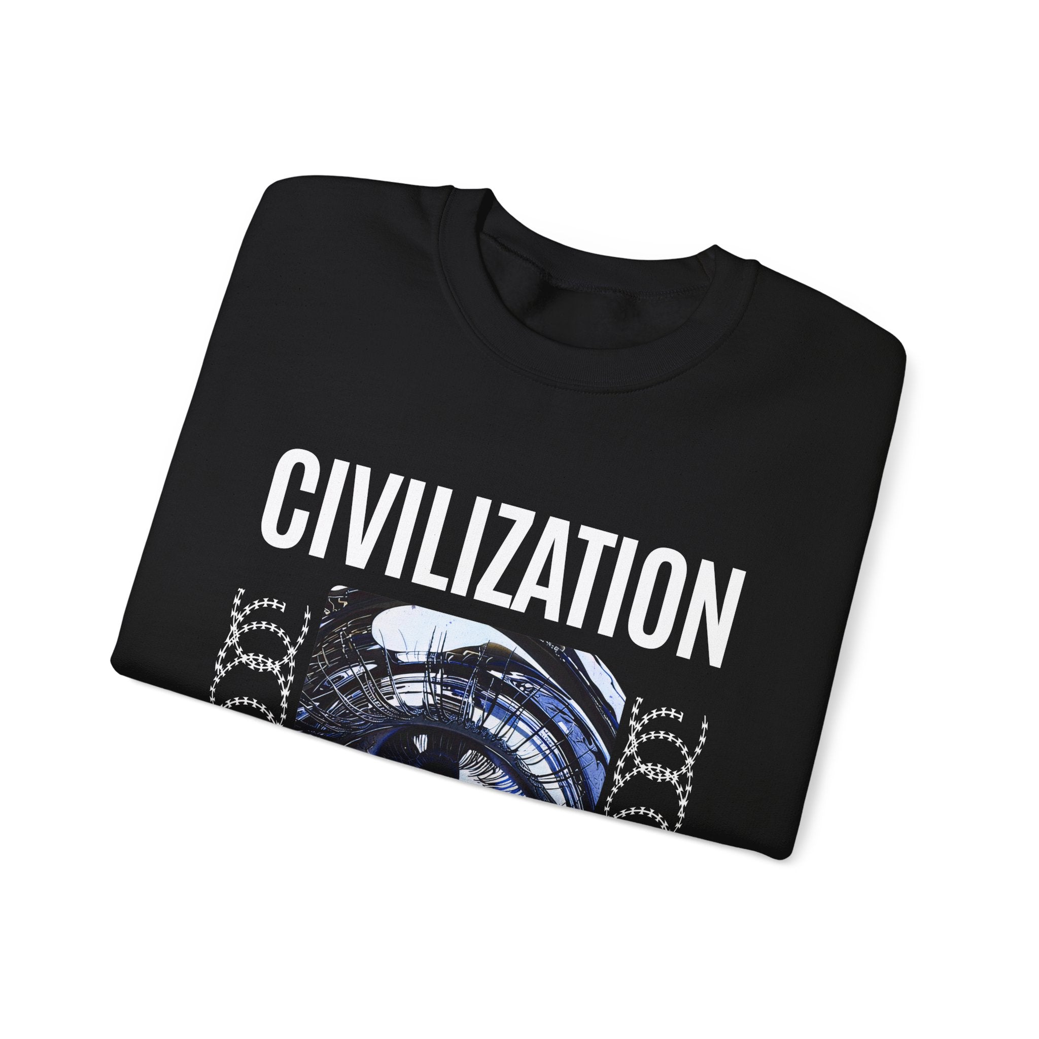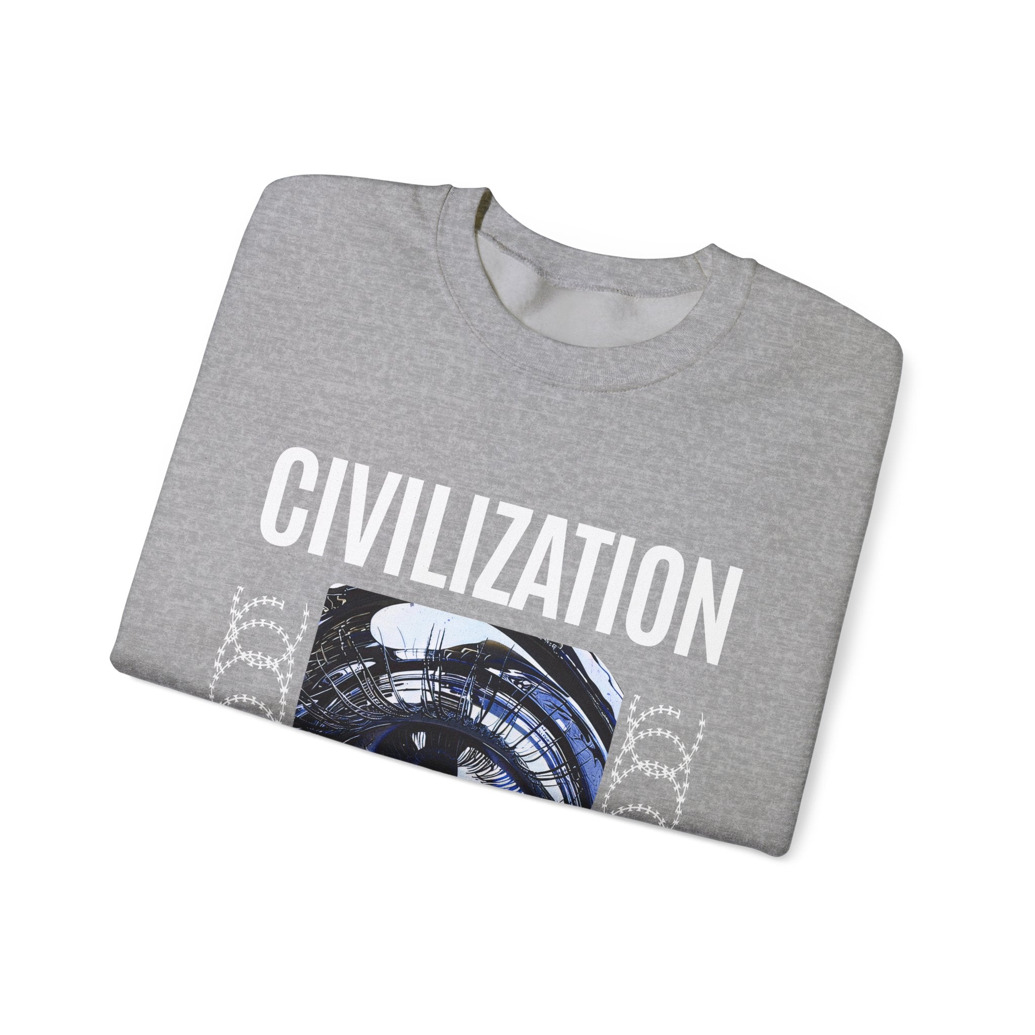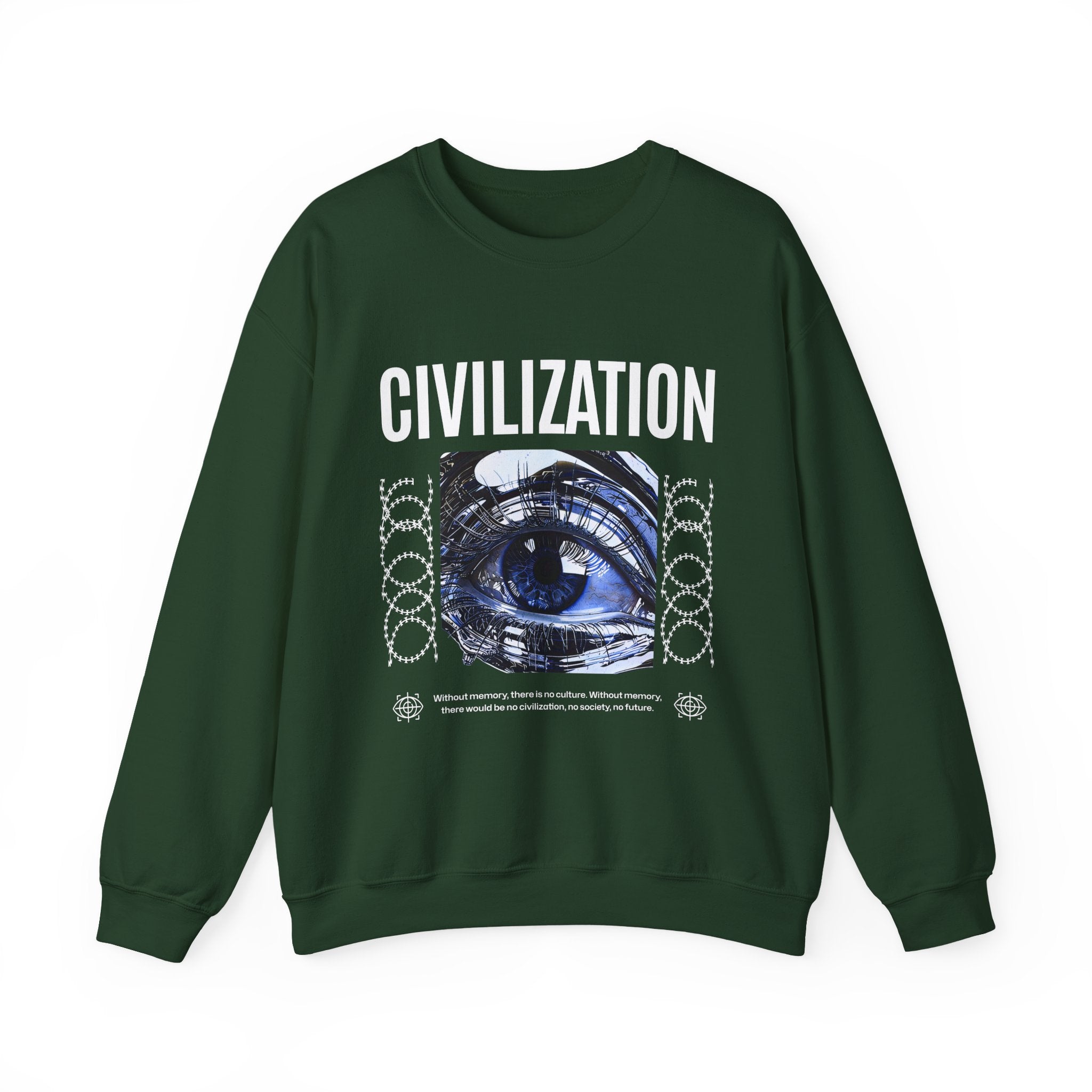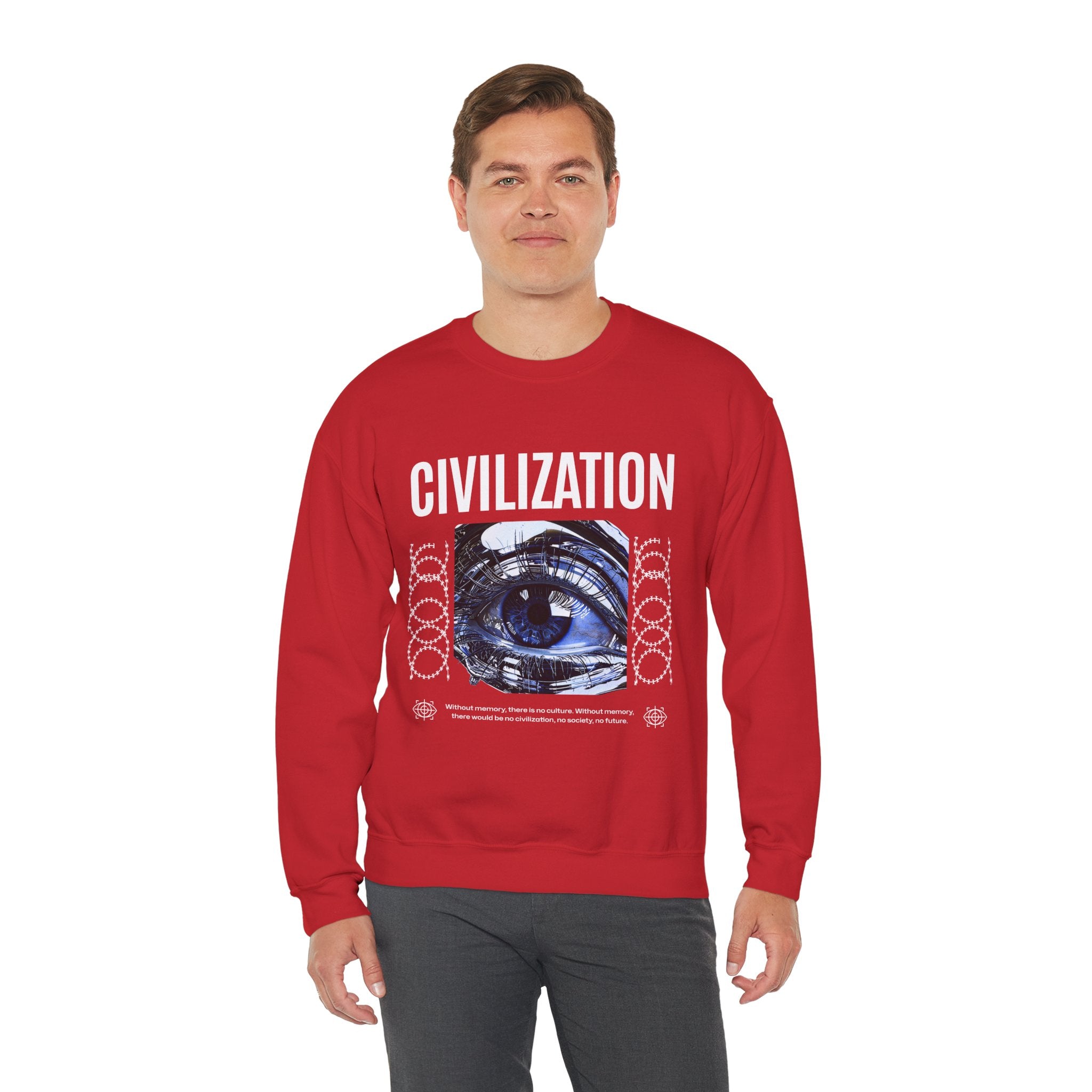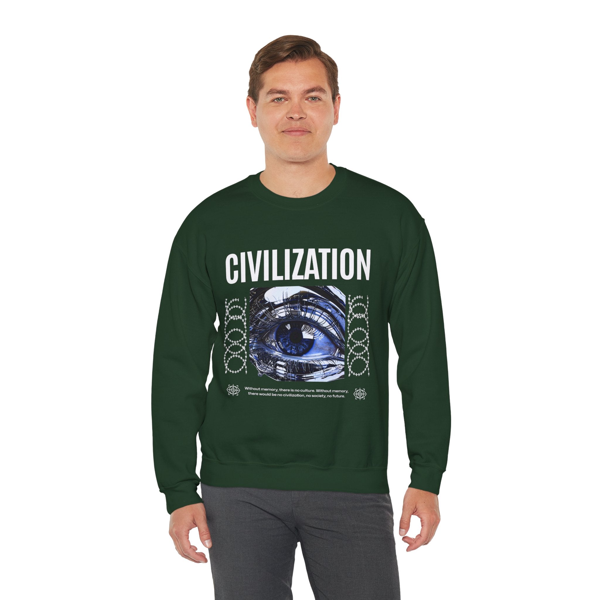 The Civilization Unisex Heavy Blend™ Crewneck Sweatshirt transforms streetwear into abstract futuristic art. The bold blue digital eye graphic framed with symbolic geometric patterns and the word Civilization makes this pullover a statement of awareness, memory, and cultural evolution. It’s designed for those who value artistic fashion, futurism, and visionary streetwear.