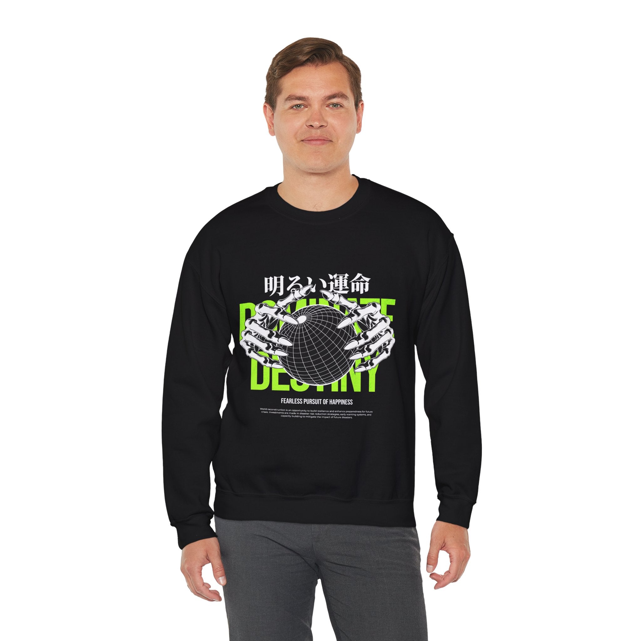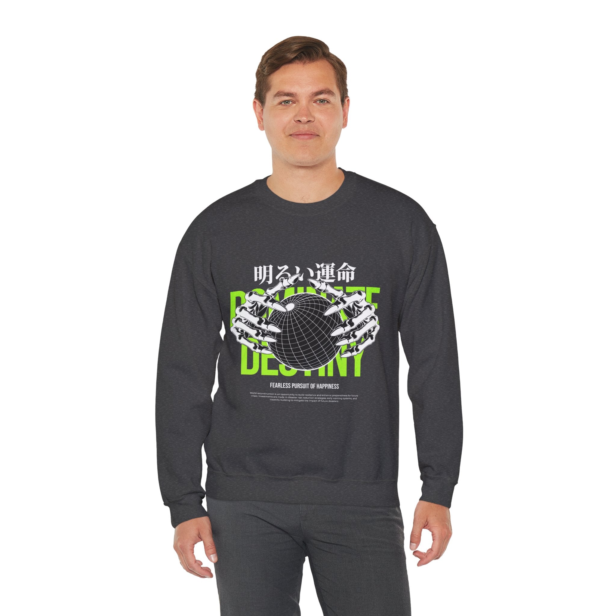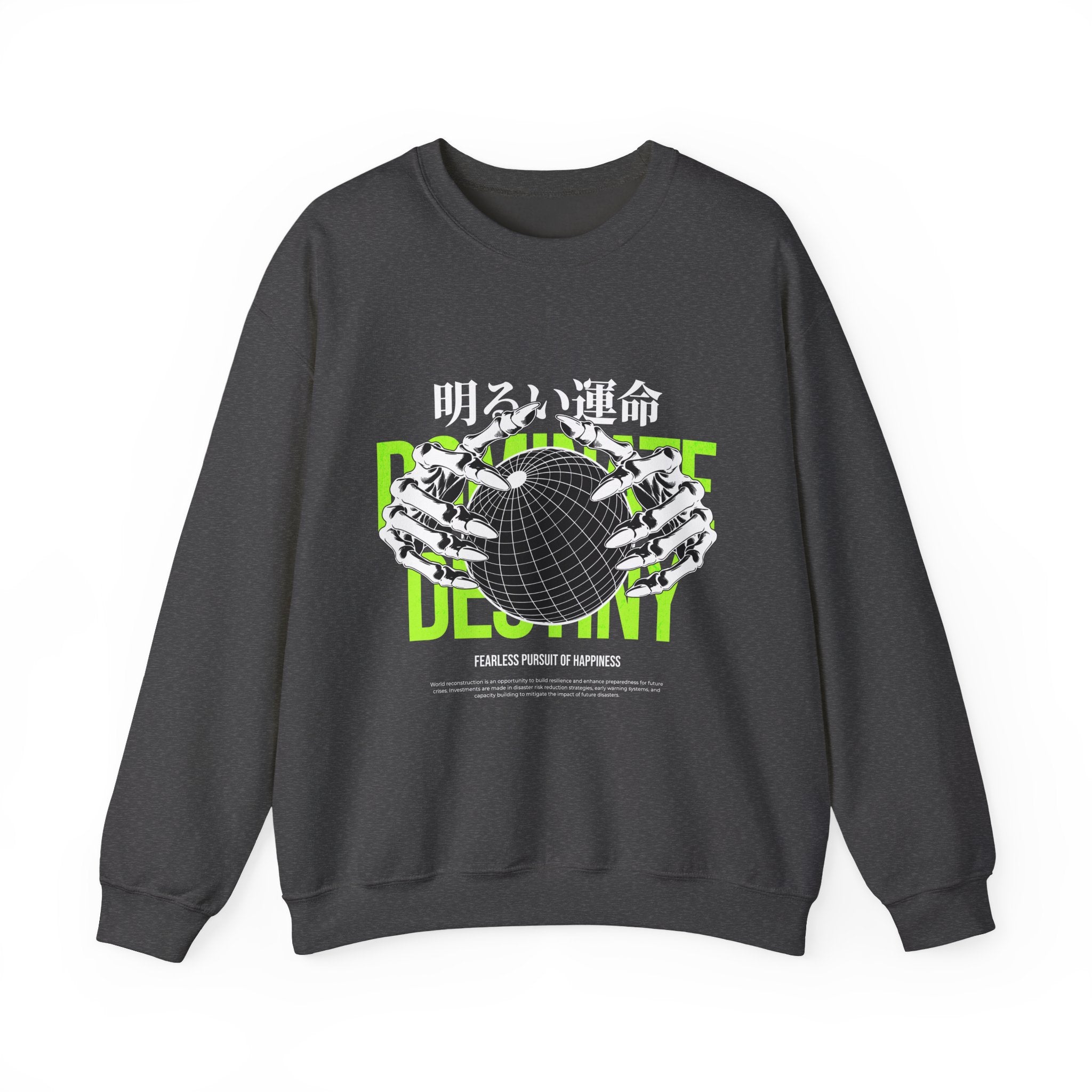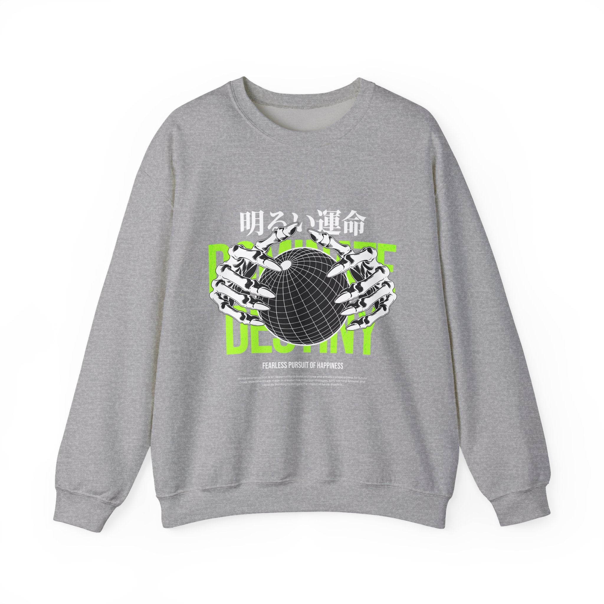The Destiny Fearless Pursuit of Happiness Unisex Heavy Blend™ Crewneck Sweatshirt is a bold blend of dark aesthetics, gothic streetwear, and motivational edge. Featuring skeleton hands gripping a globe with neon green accents and Japanese gothic typography, this pullover speaks to those who chase ambition with no fear.