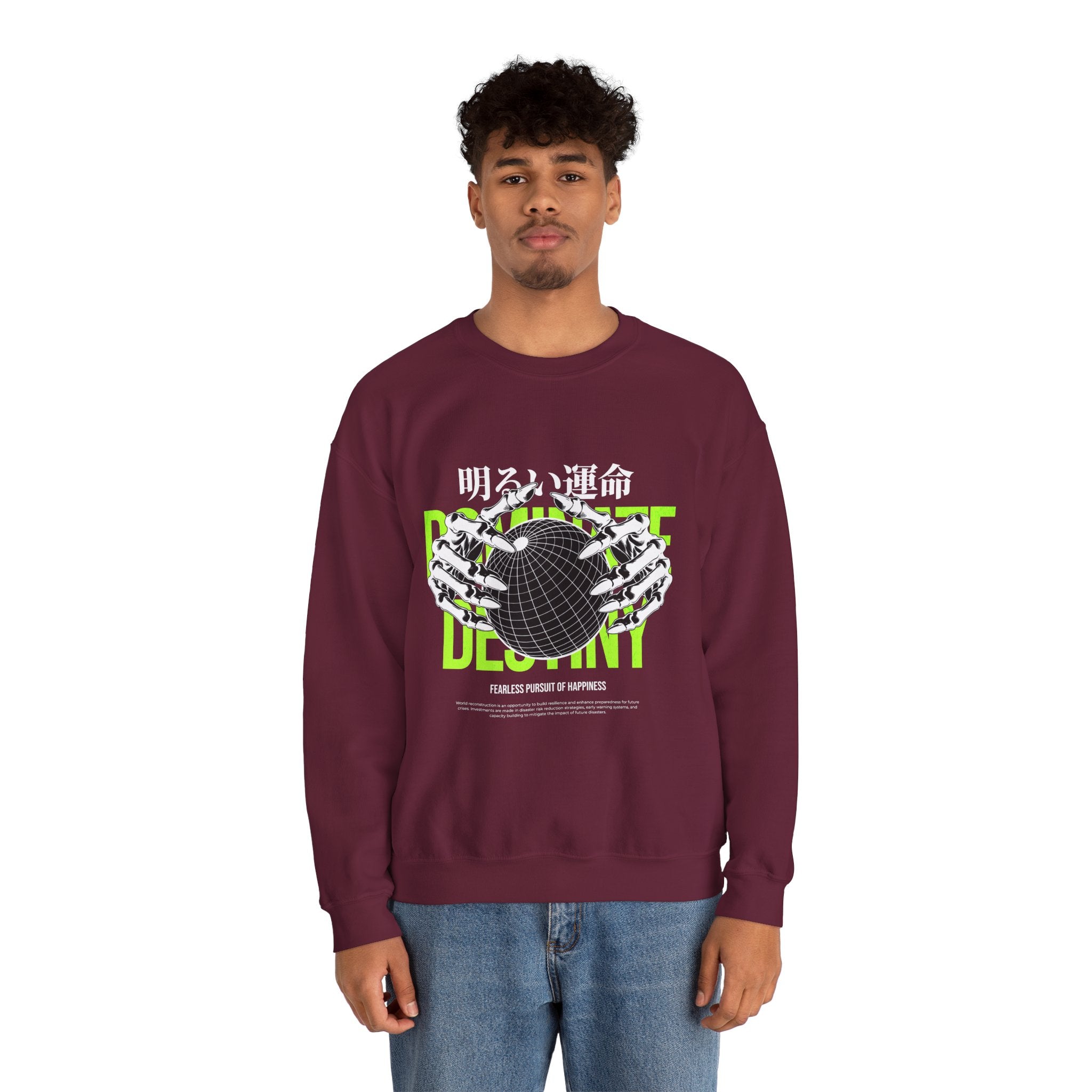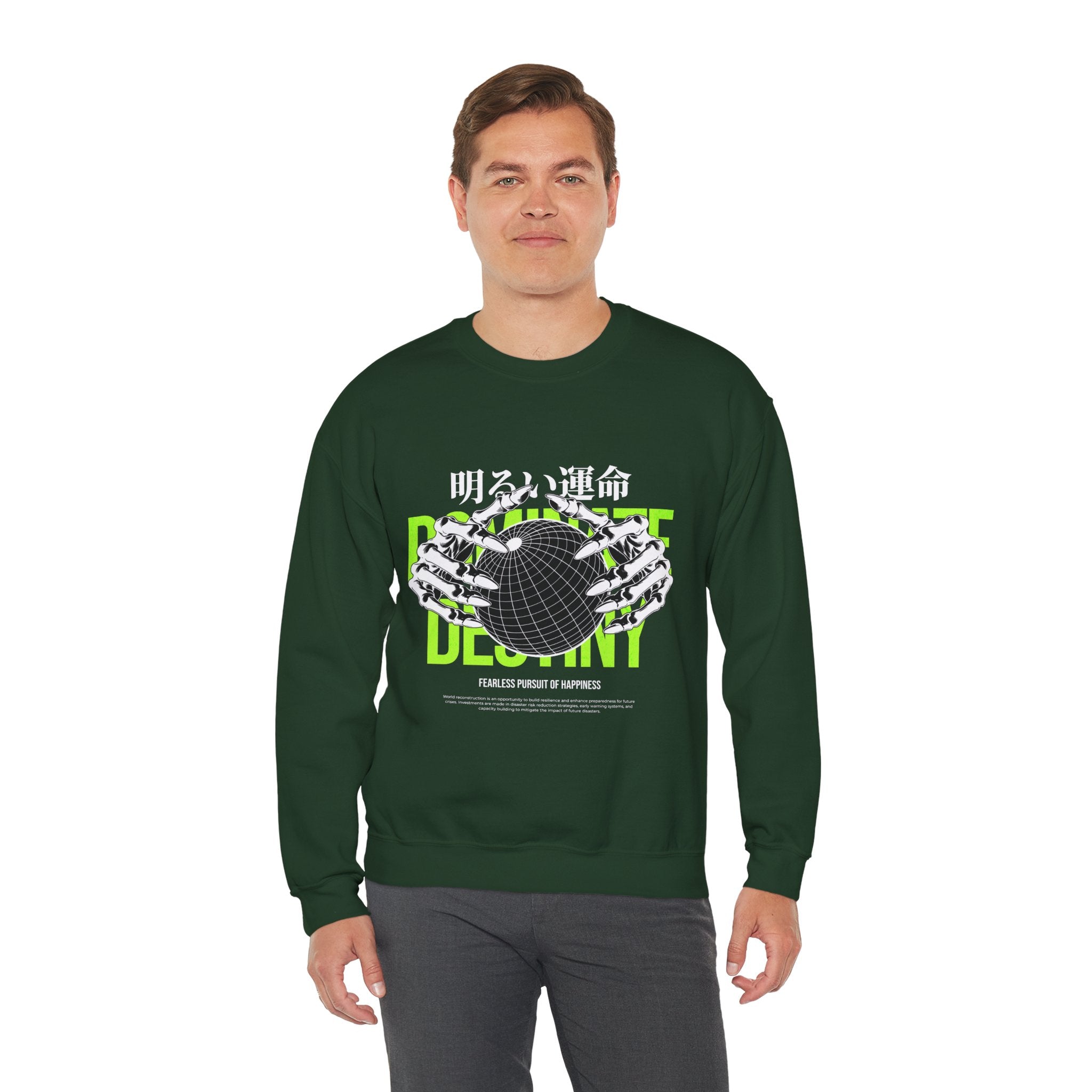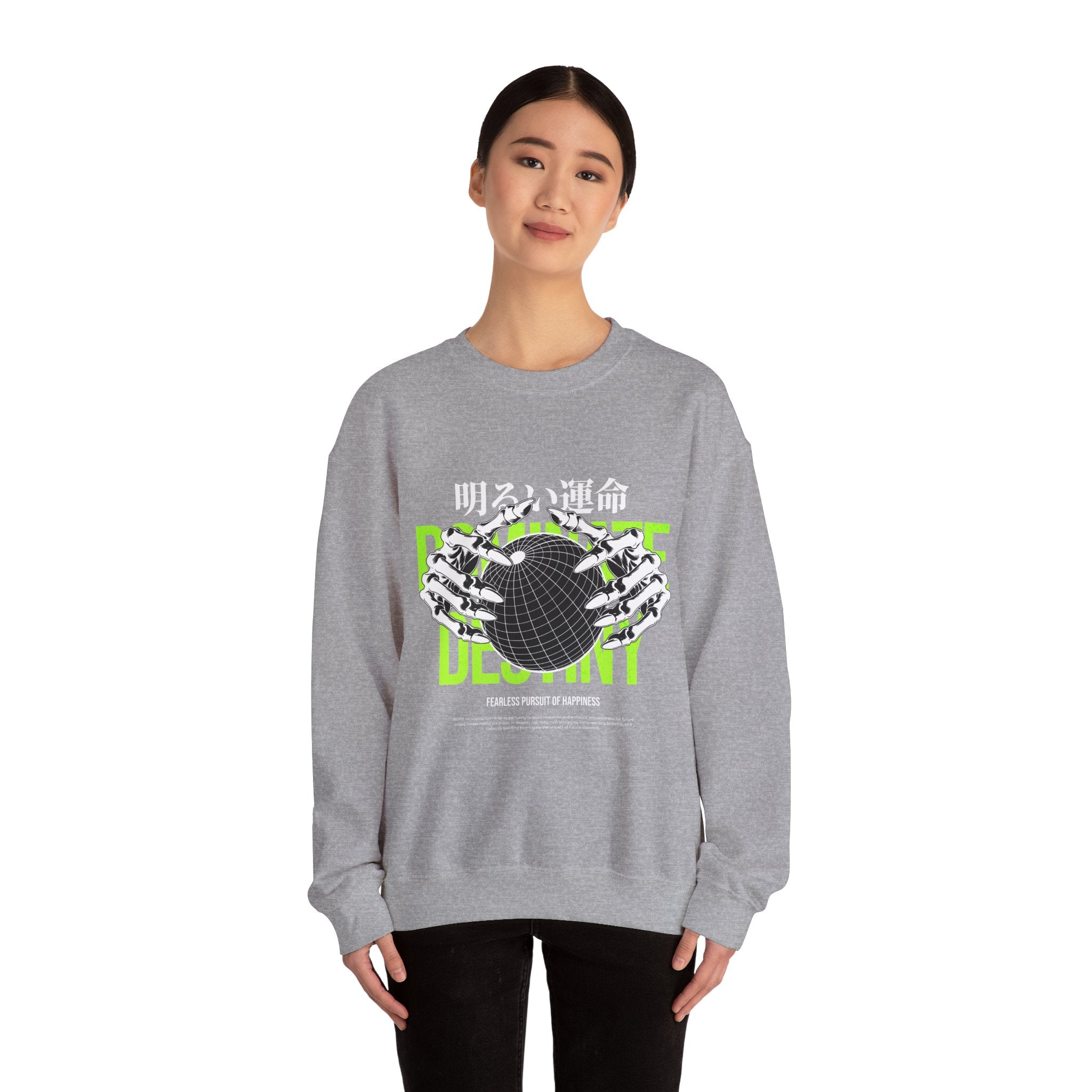 The Destiny Fearless Pursuit of Happiness Unisex Heavy Blend™ Crewneck Sweatshirt is a bold blend of dark aesthetics, gothic streetwear, and motivational edge. Featuring skeleton hands gripping a globe with neon green accents and Japanese gothic typography, this pullover speaks to those who chase ambition with no fear.