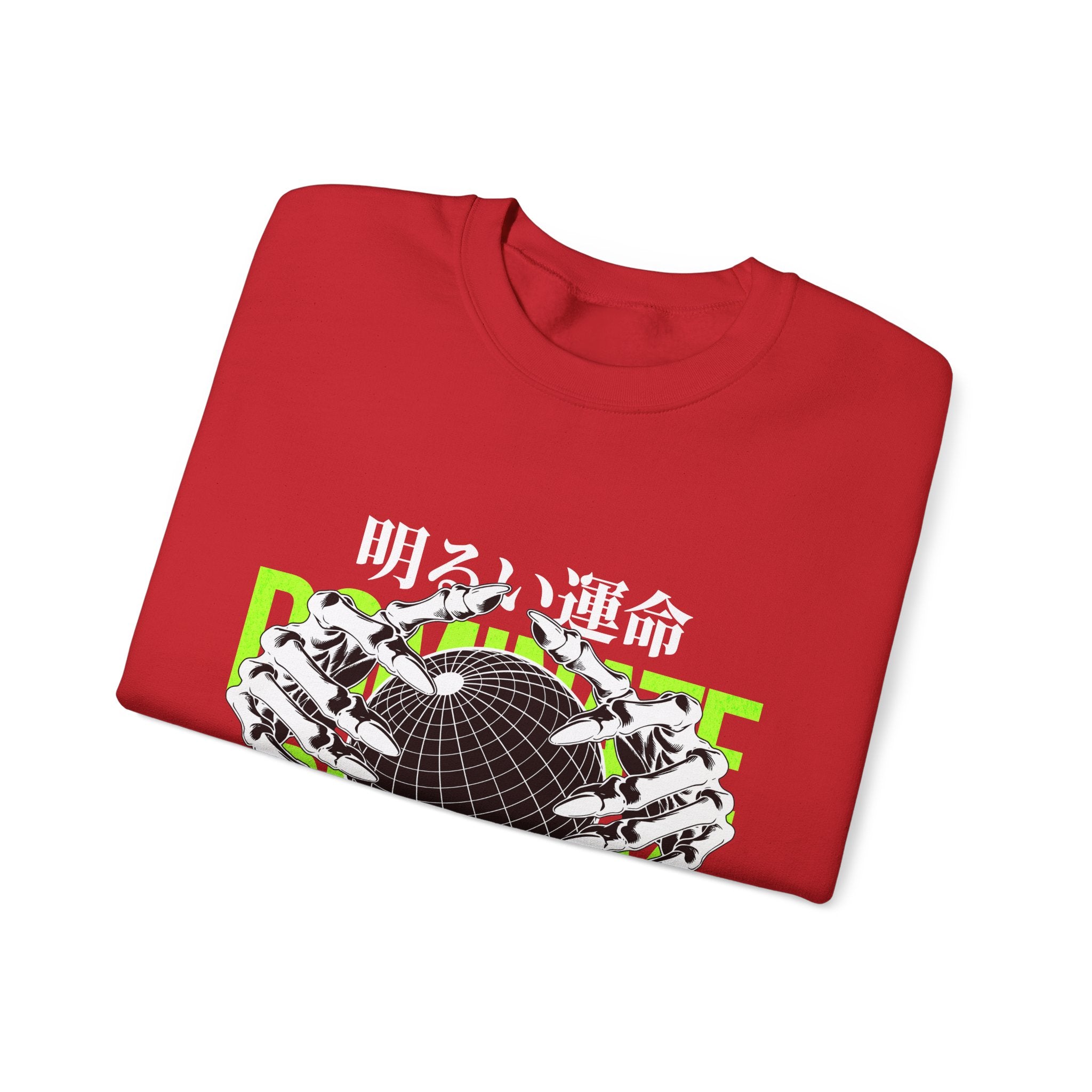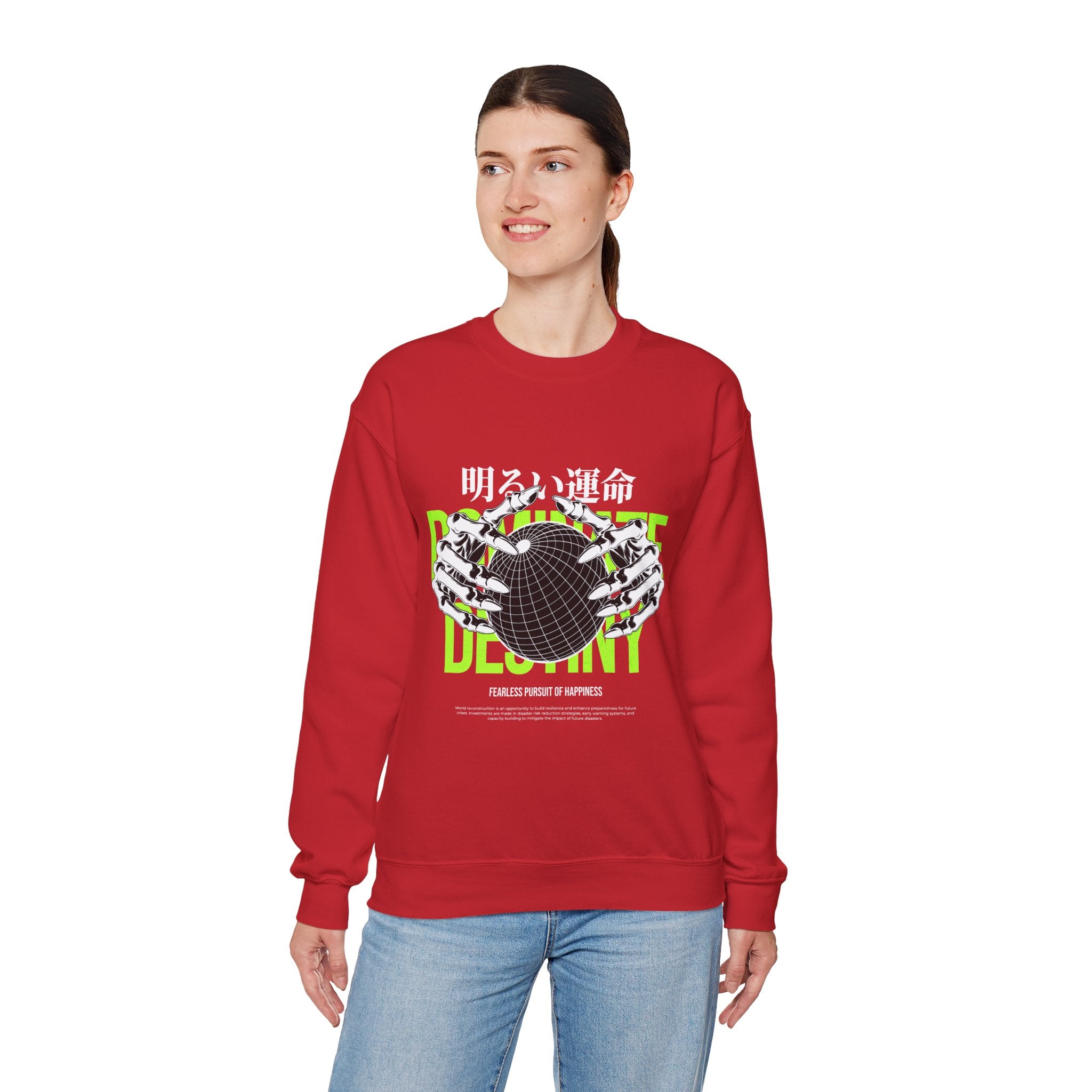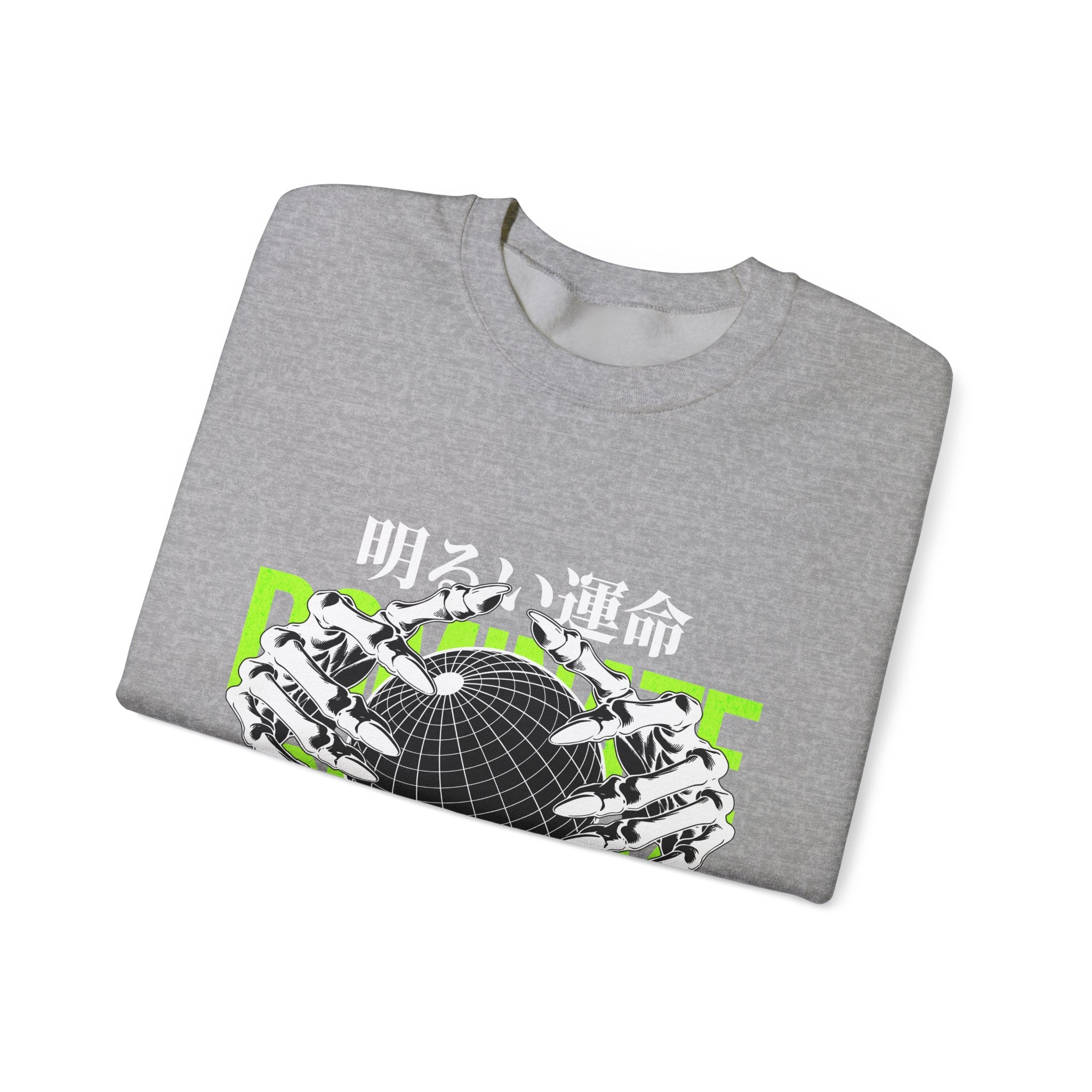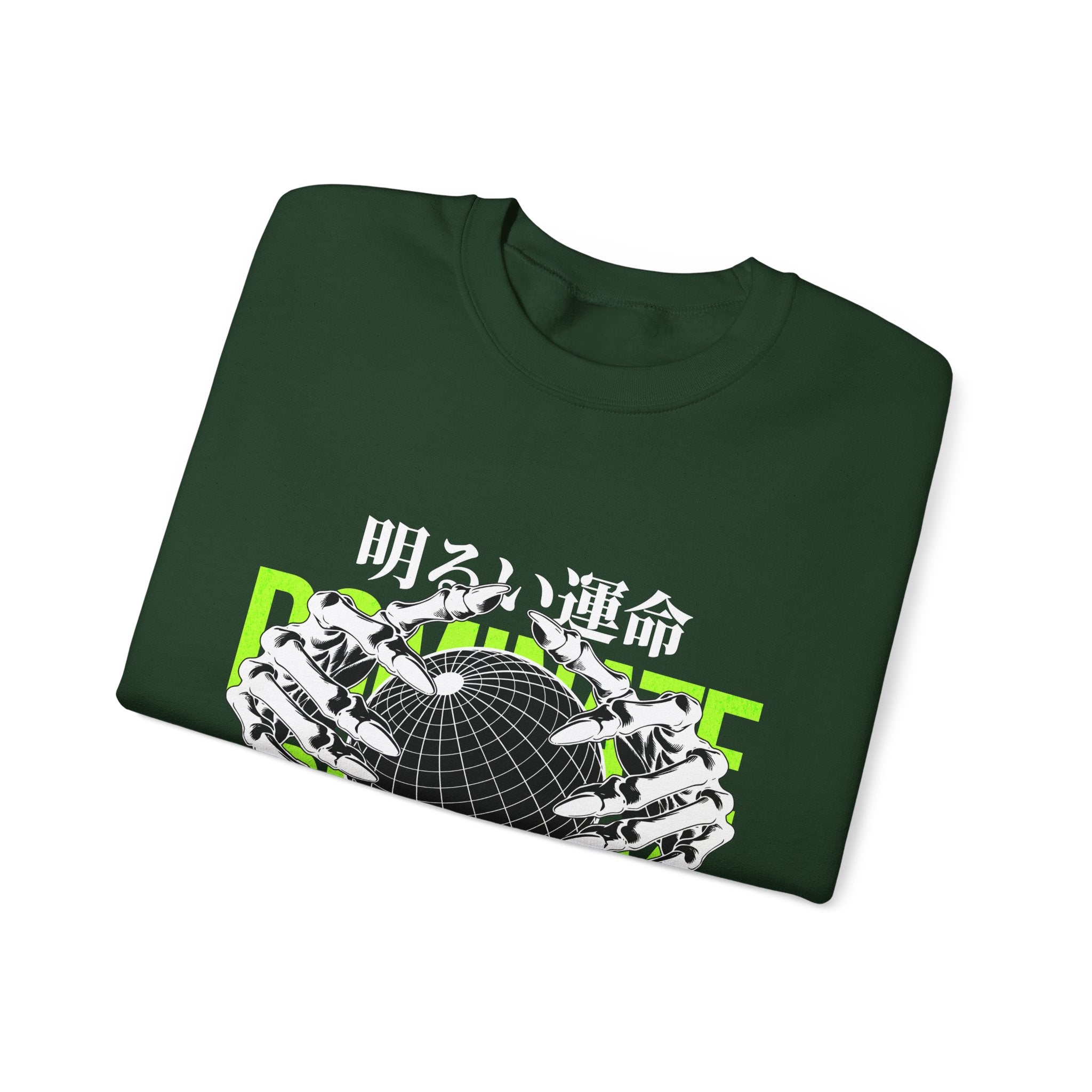 The Destiny Fearless Pursuit of Happiness Unisex Heavy Blend™ Crewneck Sweatshirt is a bold blend of dark aesthetics, gothic streetwear, and motivational edge. Featuring skeleton hands gripping a globe with neon green accents and Japanese gothic typography, this pullover speaks to those who chase ambition with no fear.