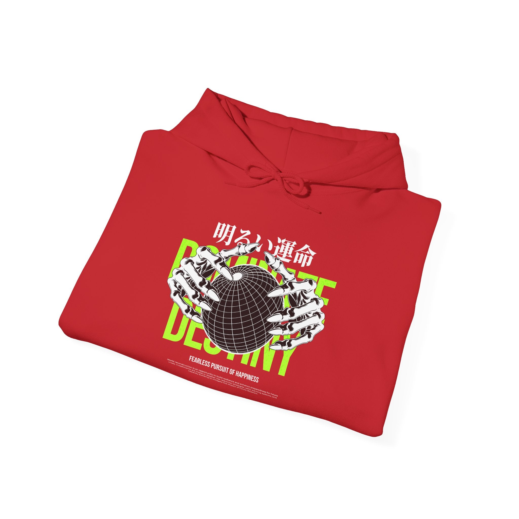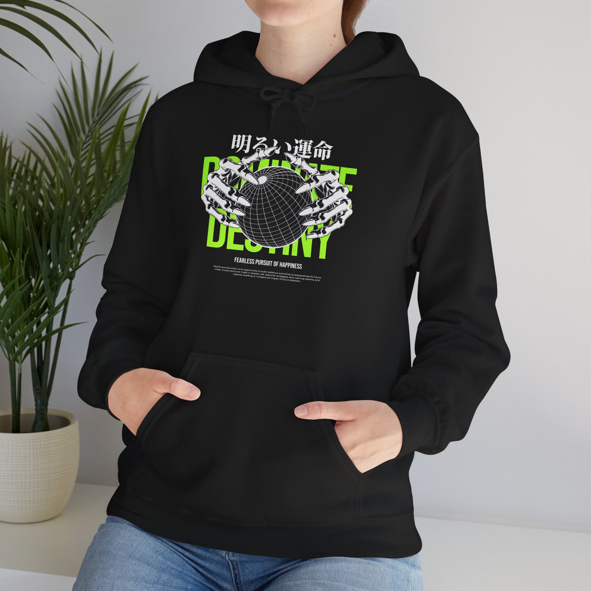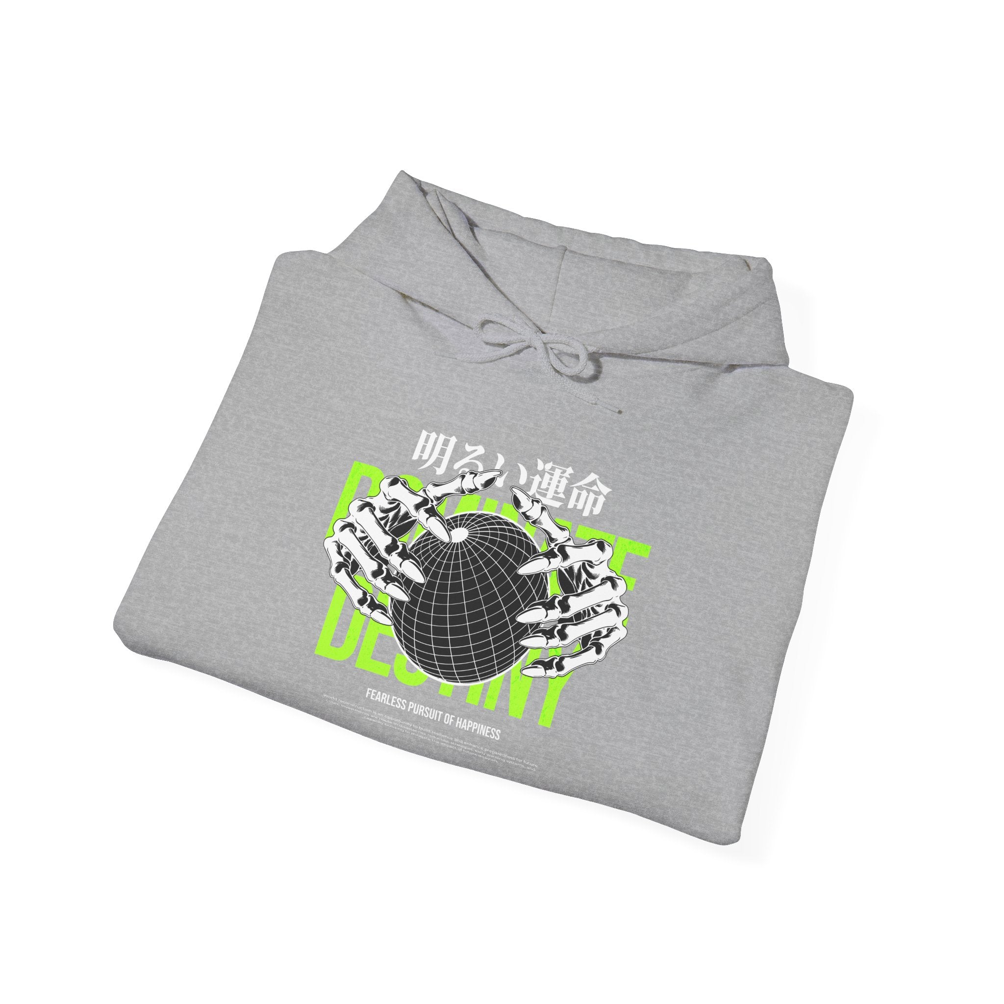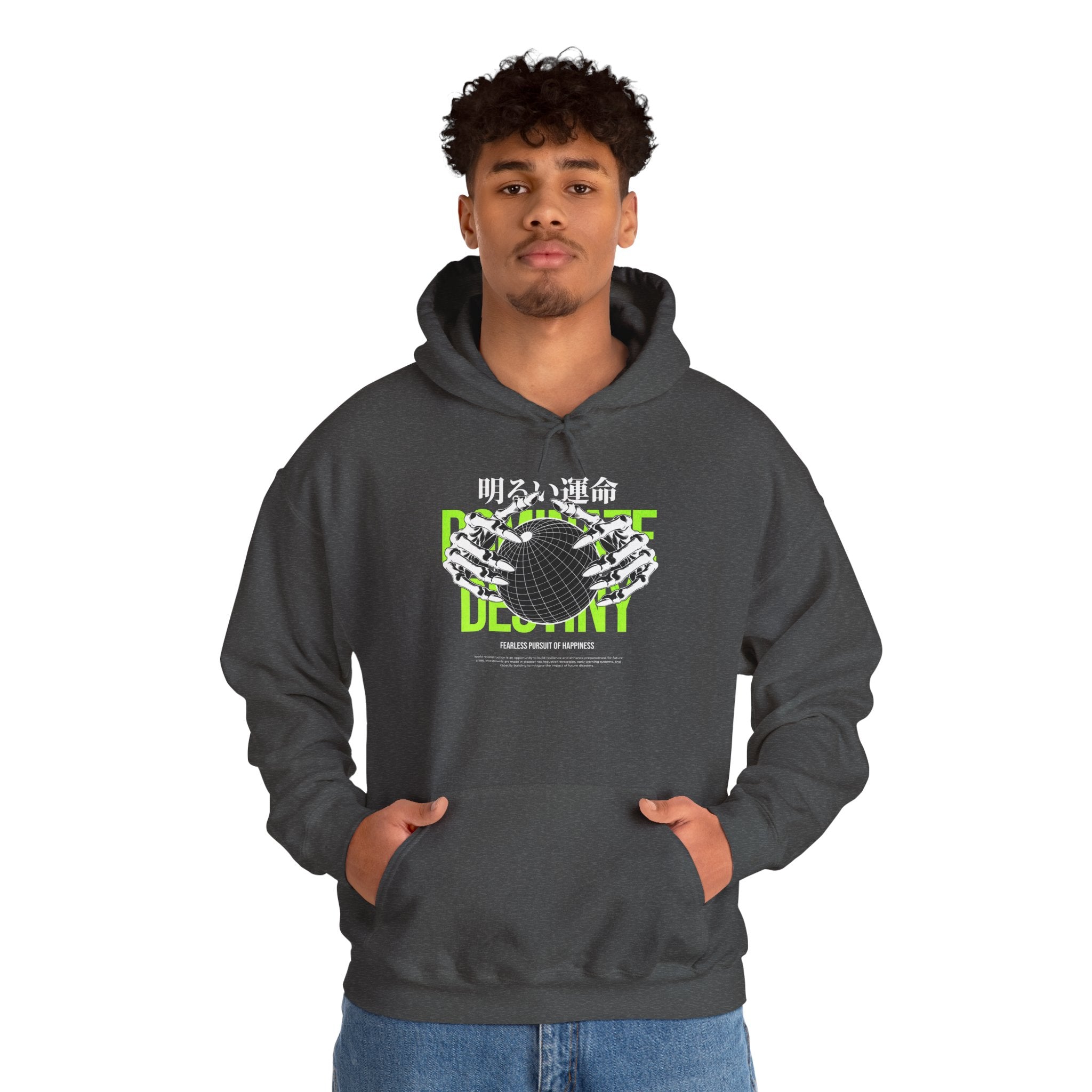 The Destiny Fearless Pursuit of Happiness Unisex Heavy Blend™ Hooded Sweatshirt is a bold fusion of gothic art, motivation, and streetwear edge. Featuring skeleton hands gripping a globe, accented with neon green typography and Japanese gothic text, this hoodie embodies ambition, fearlessness, and the relentless pursuit of dreams.
