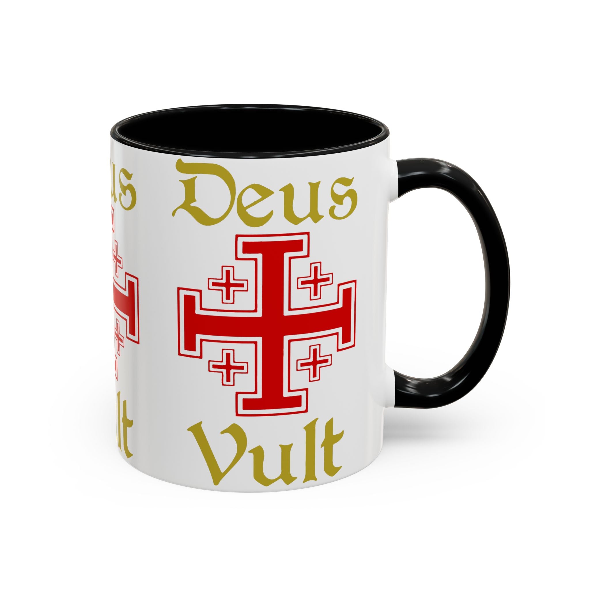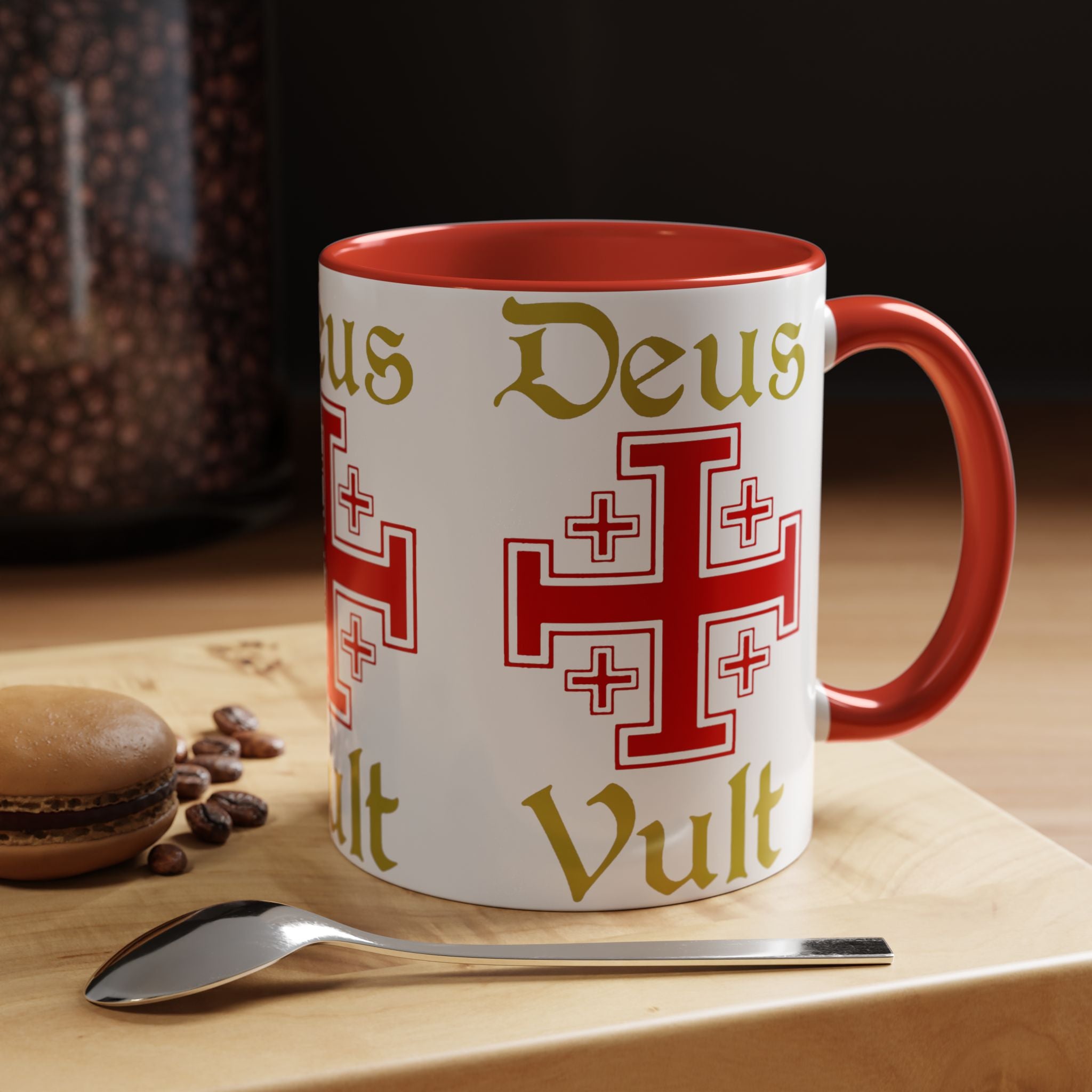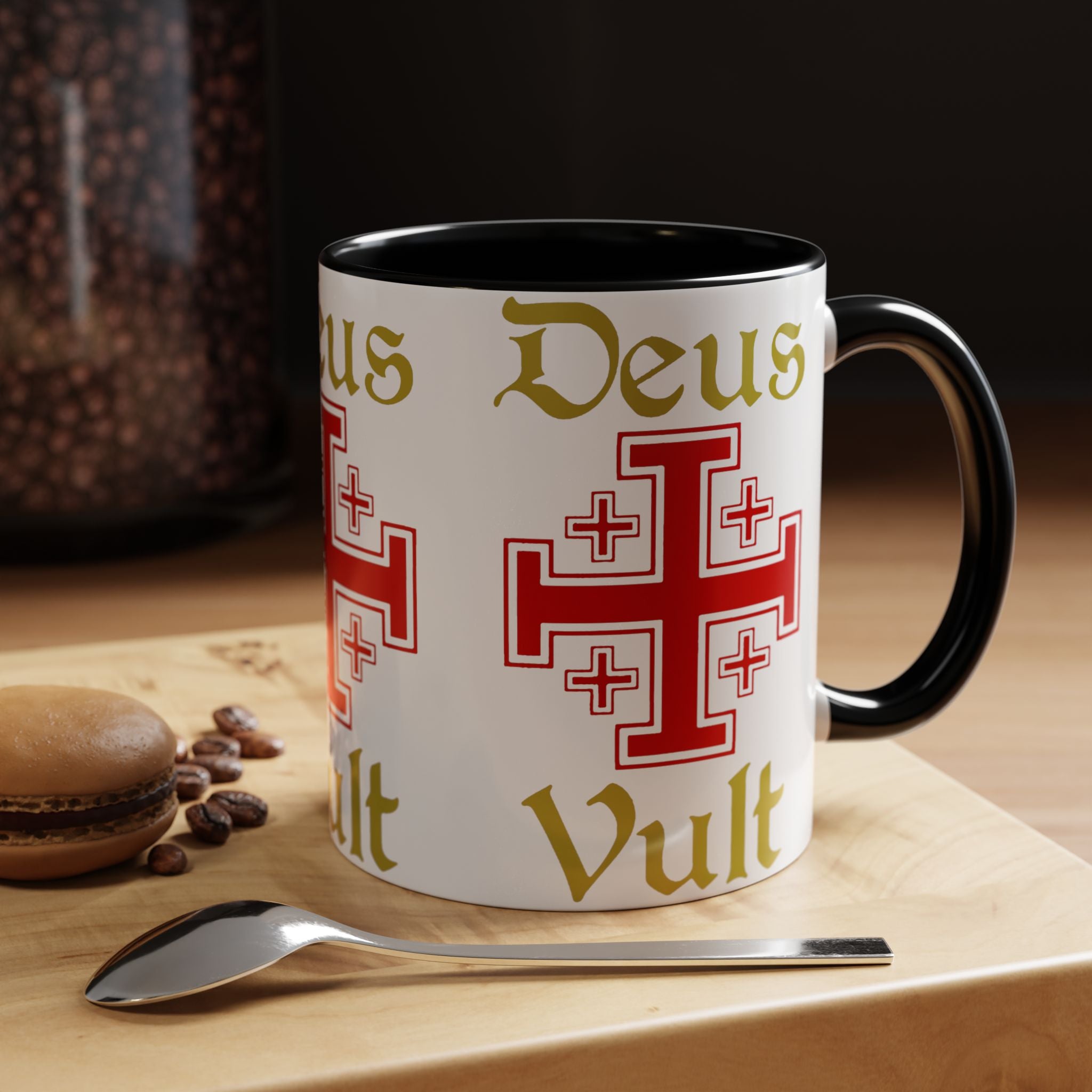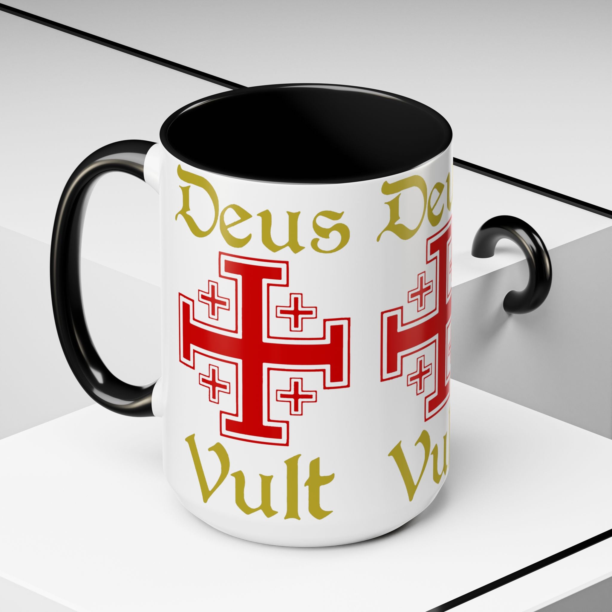 The Deus Vult Accent Coffee Mug combines powerful medieval symbolism with modern durability. Featuring the red Jerusalem cross with bold “Deus Vult” lettering in gold, this mug is more than just drinkware — it’s a declaration of courage, resilience, and faith.