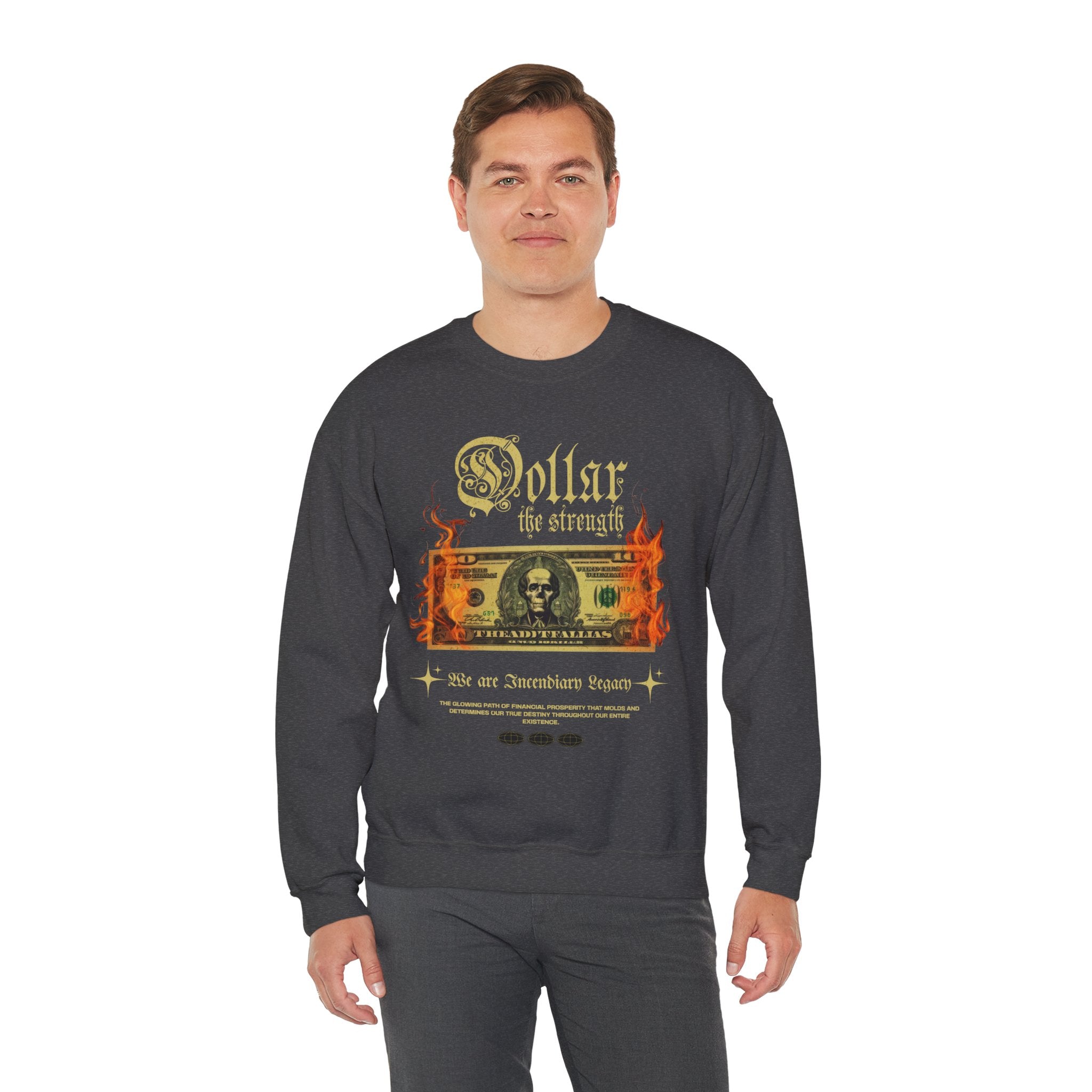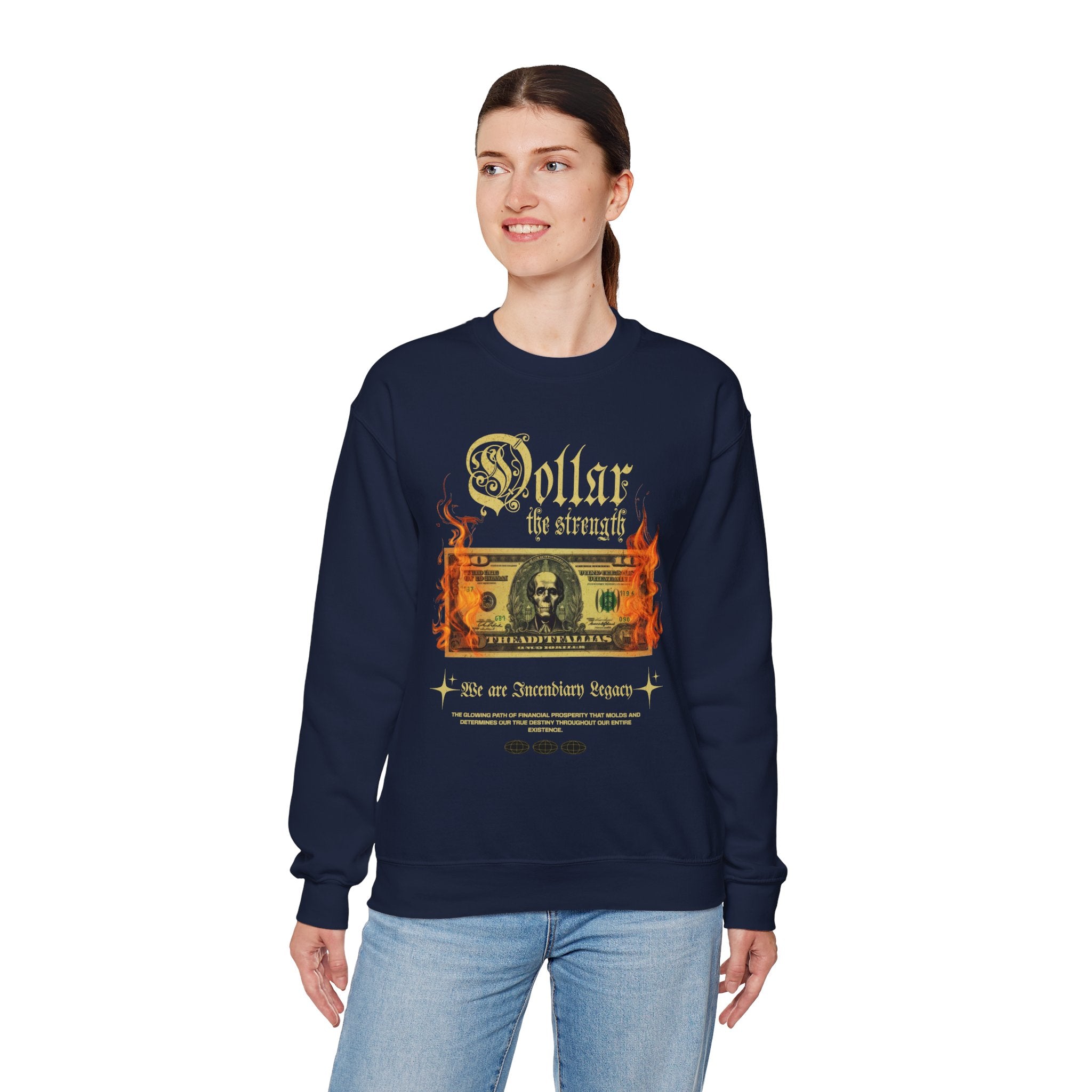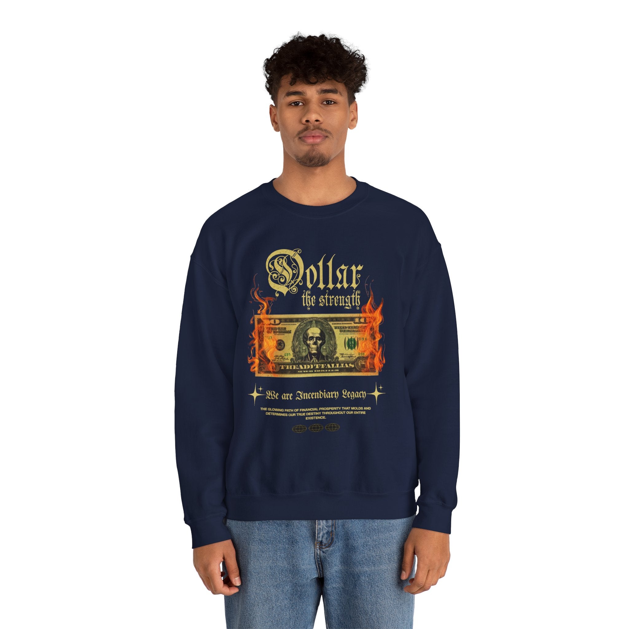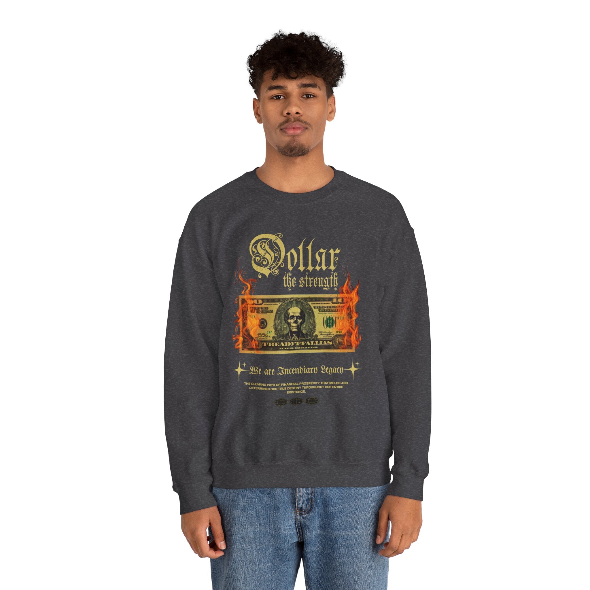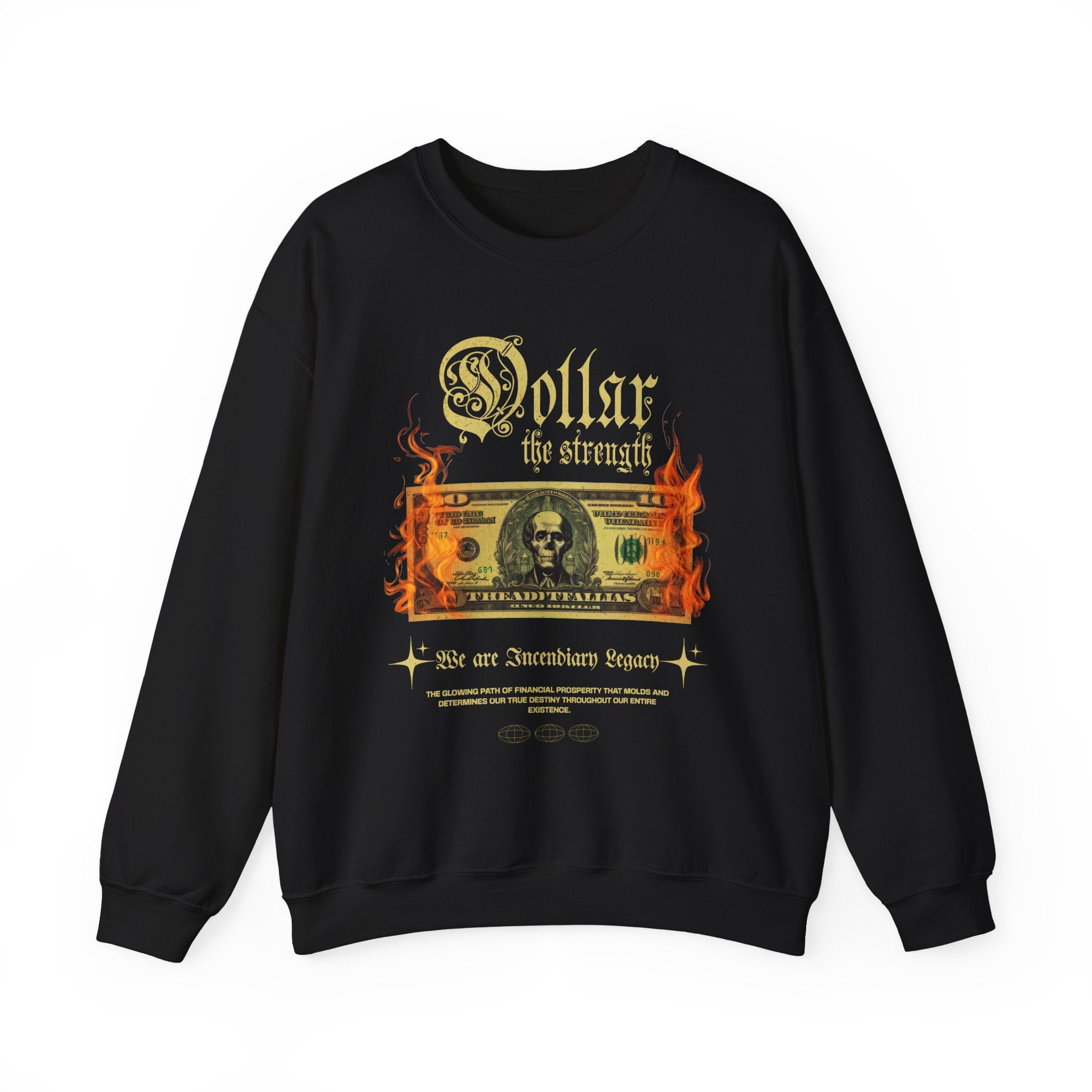 The Dollar The Strength Unisex Heavy Blend™ Crewneck Sweatshirt embodies the hustler’s mentality and fiery pursuit of success. With its burning dollar bill graphic in roaring flames, gothic-inspired lettering, and motivational slogan “We Are Incendiary Legacy”, this pullover is a powerful fashion statement for those who chase prosperity and legacy fearlessly.