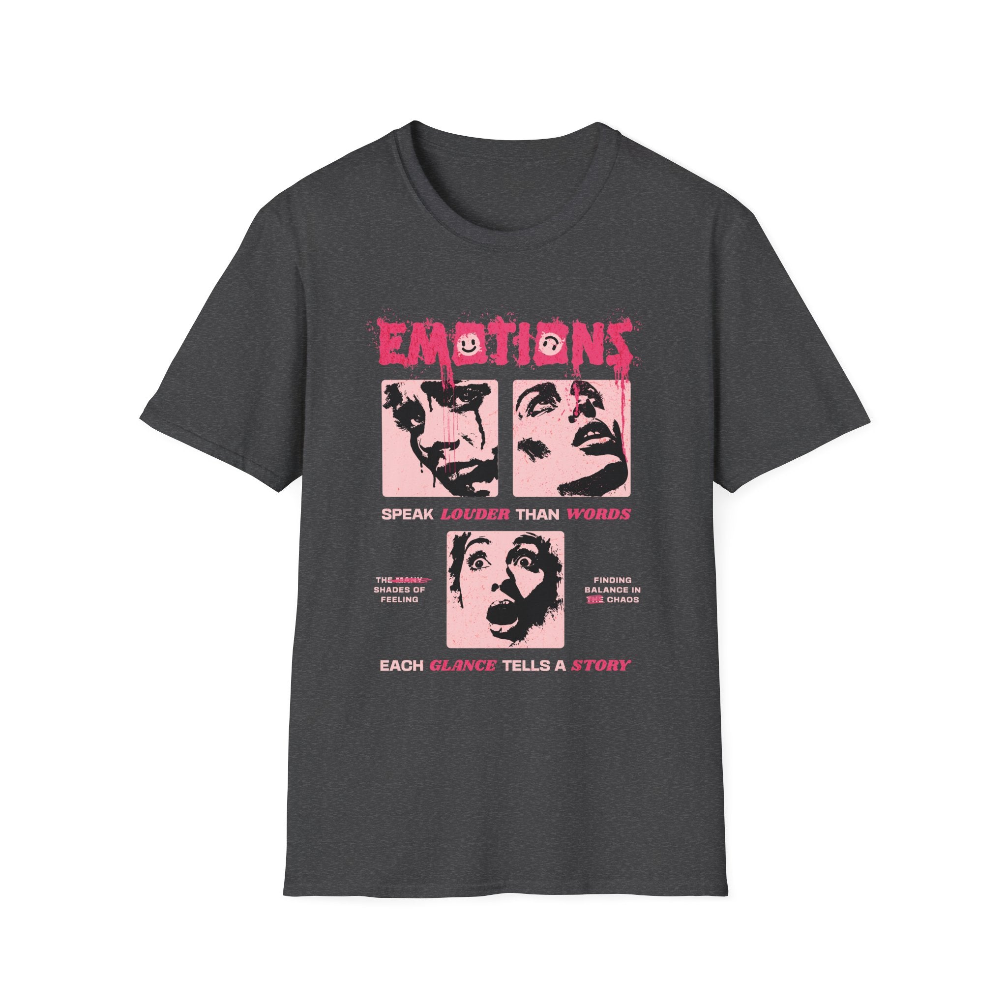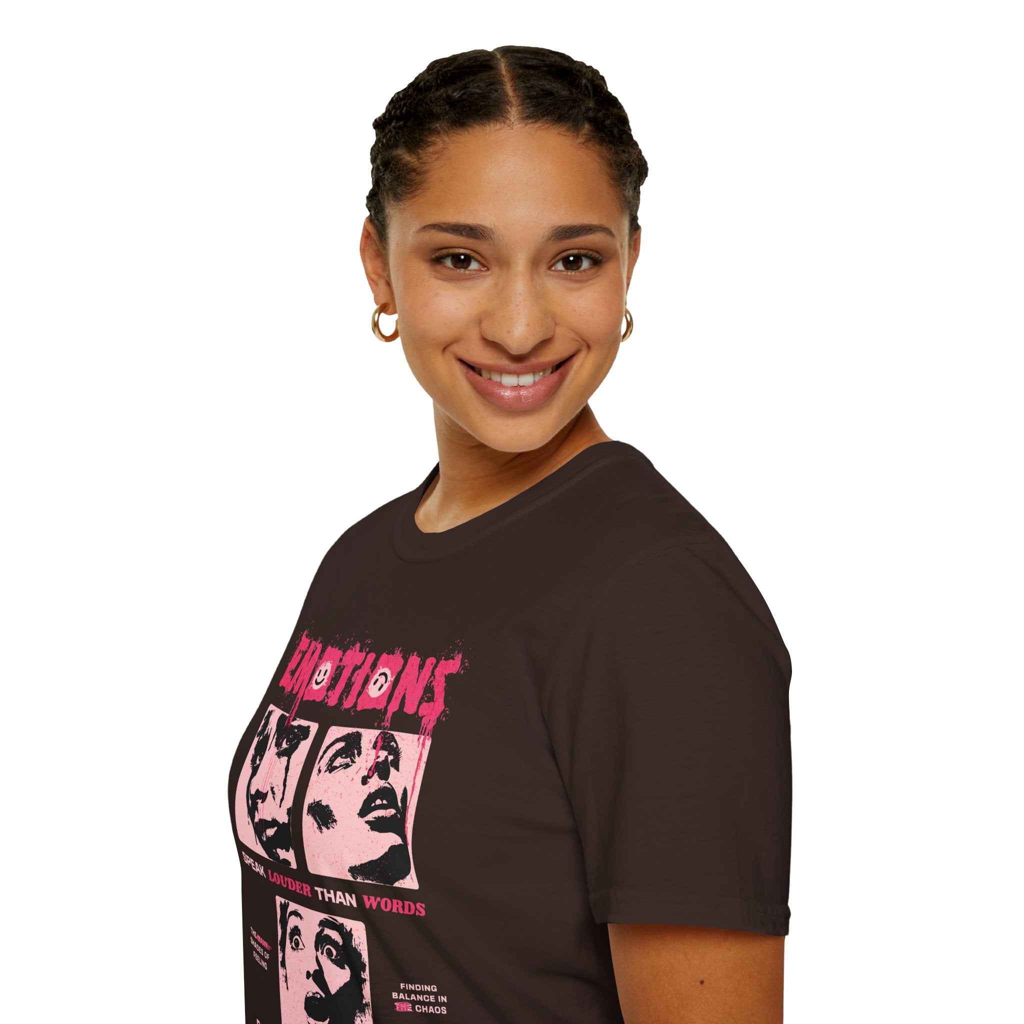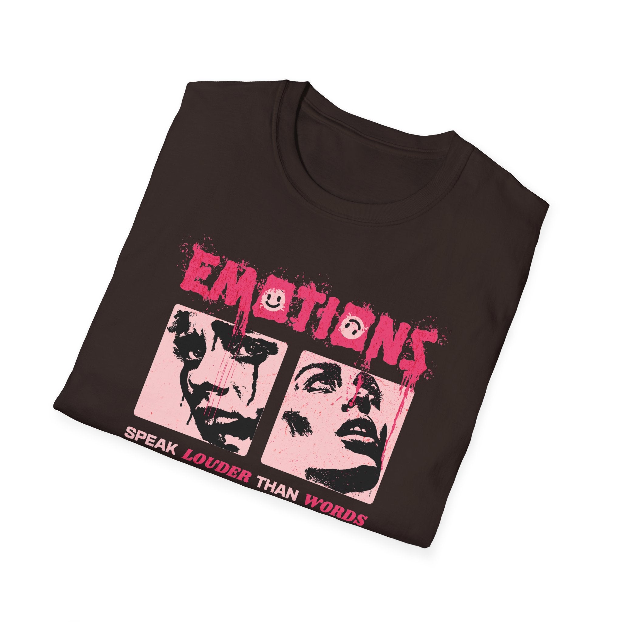 The Emotions Speak Louder Than Words Unisex Softstyle T-Shirt is a canvas of raw human expression. With striking pink and black pop-art graphics, it showcases the power of emotions—every glance telling its own story.