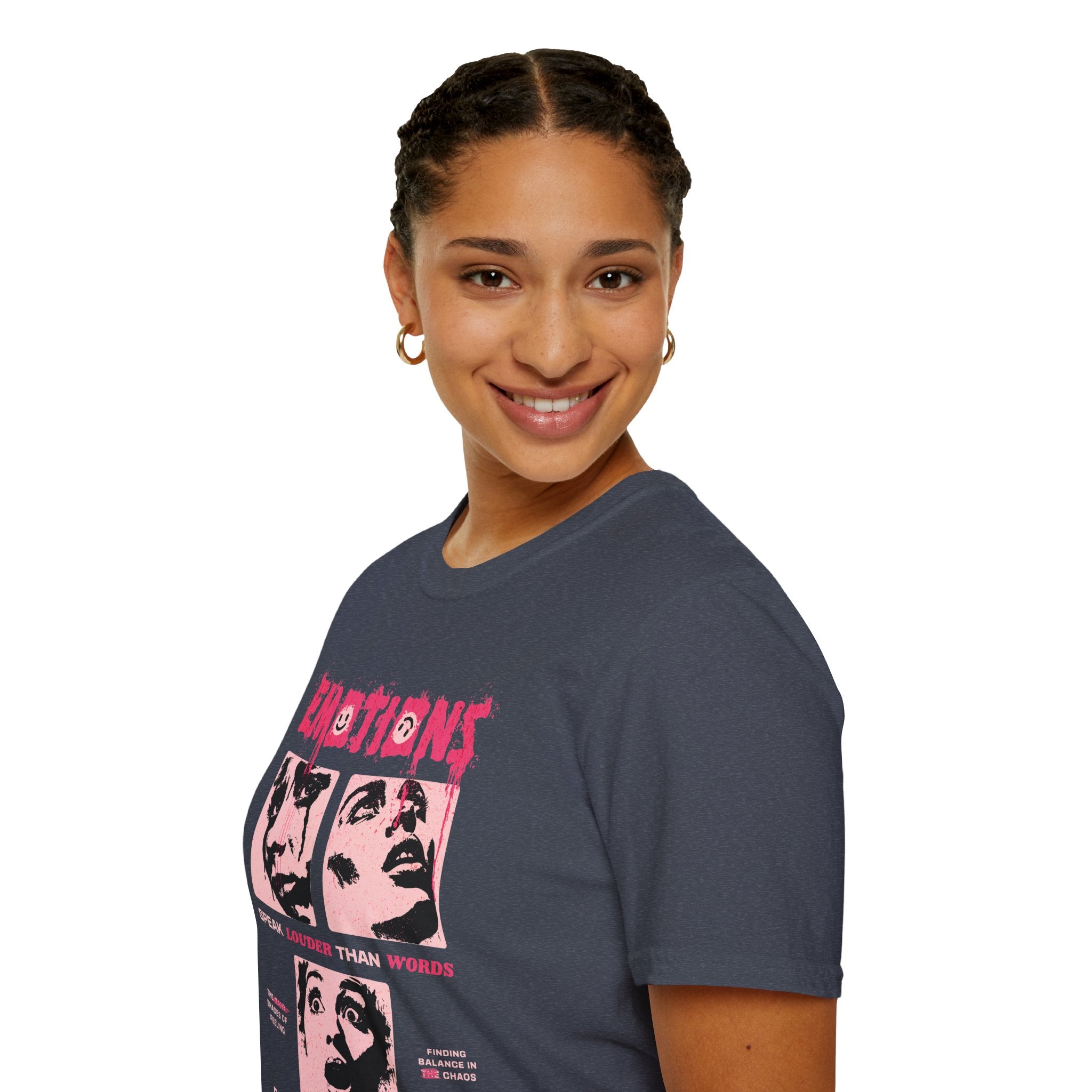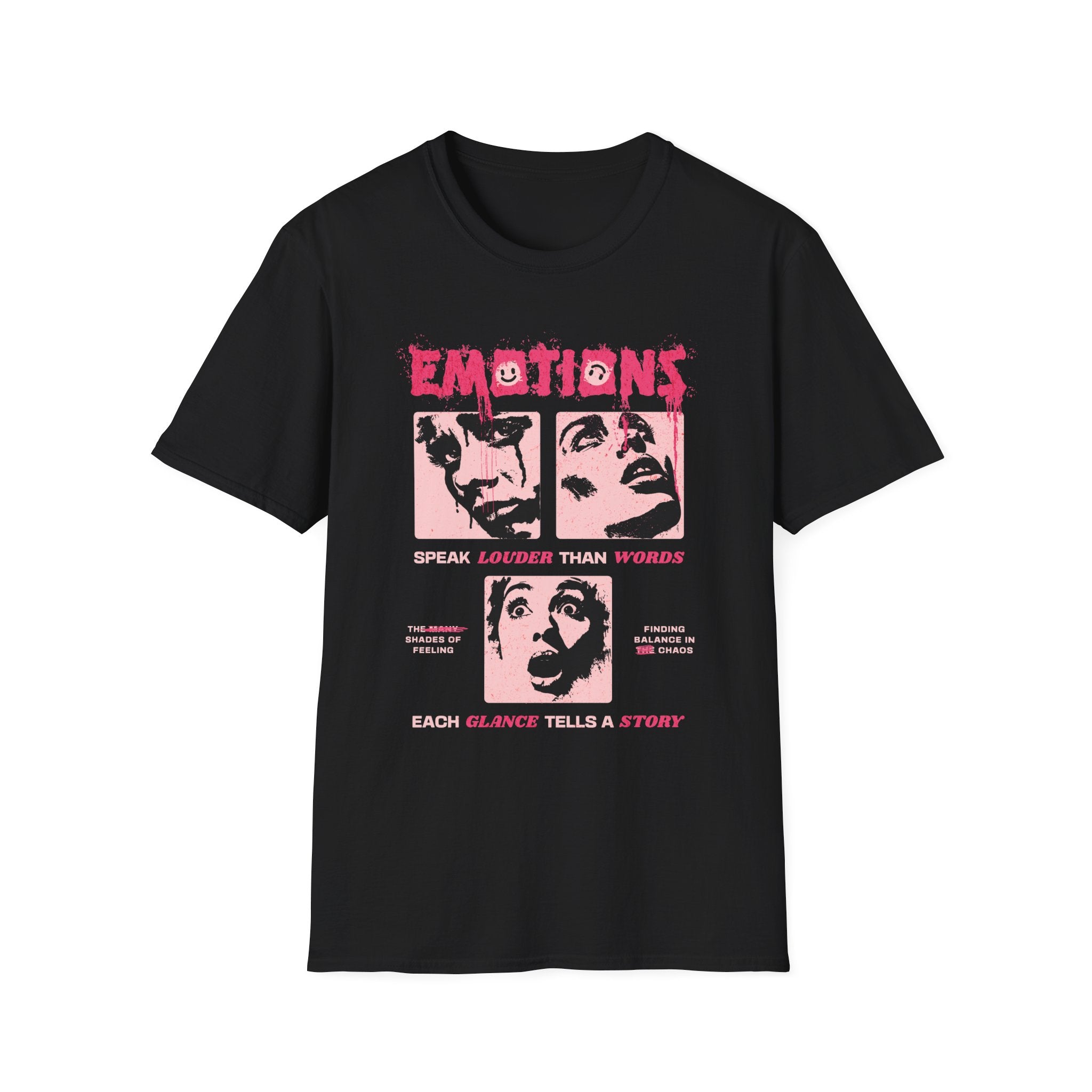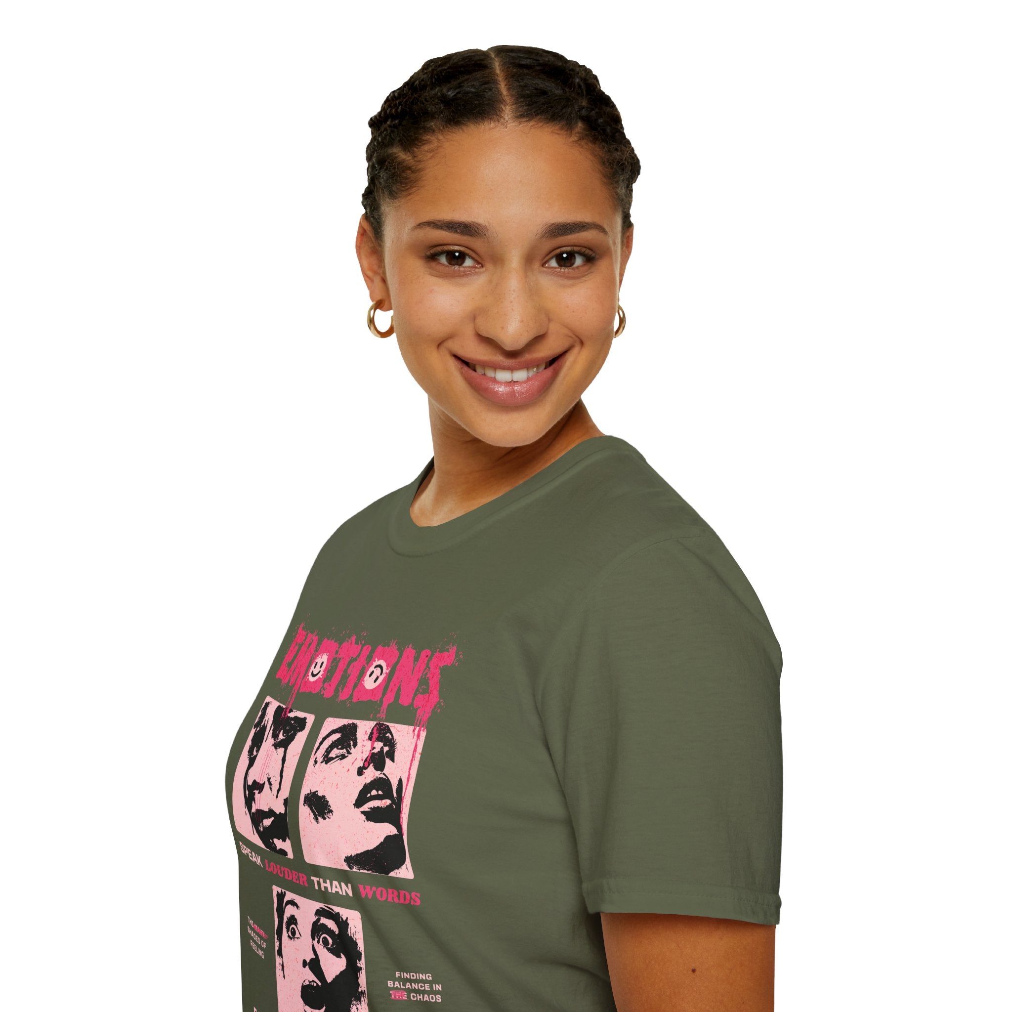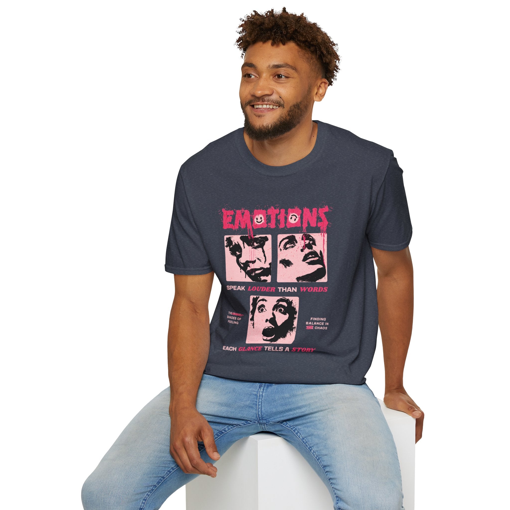 The Emotions Speak Louder Than Words Unisex Softstyle T-Shirt is a canvas of raw human expression. With striking pink and black pop-art graphics, it showcases the power of emotions—every glance telling its own story.