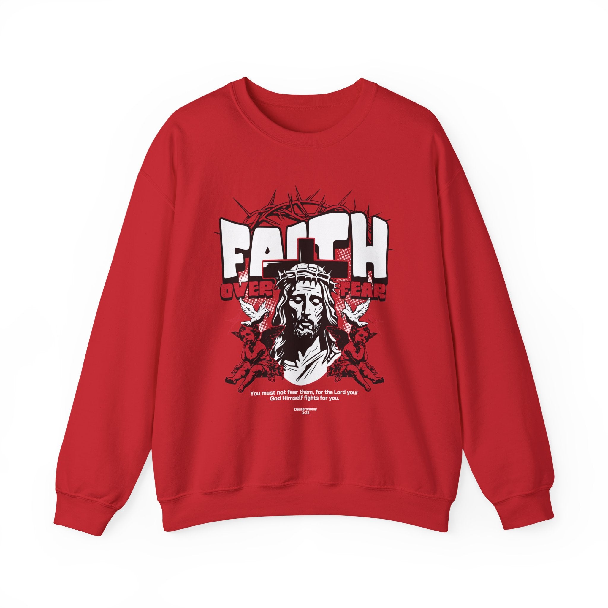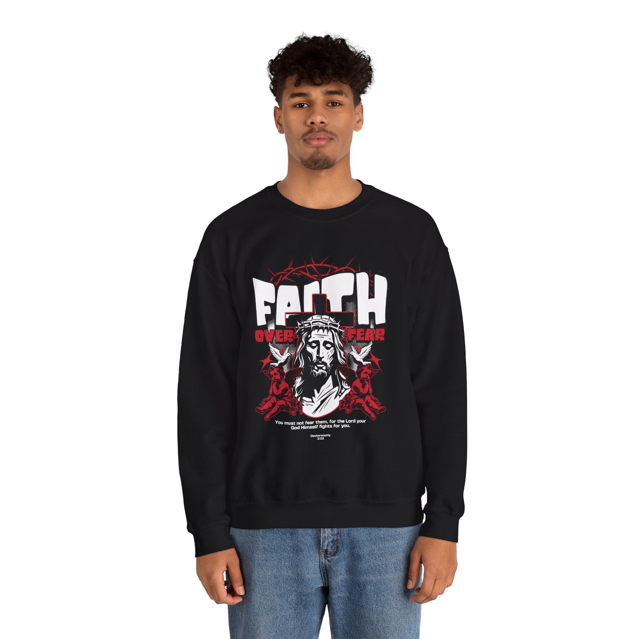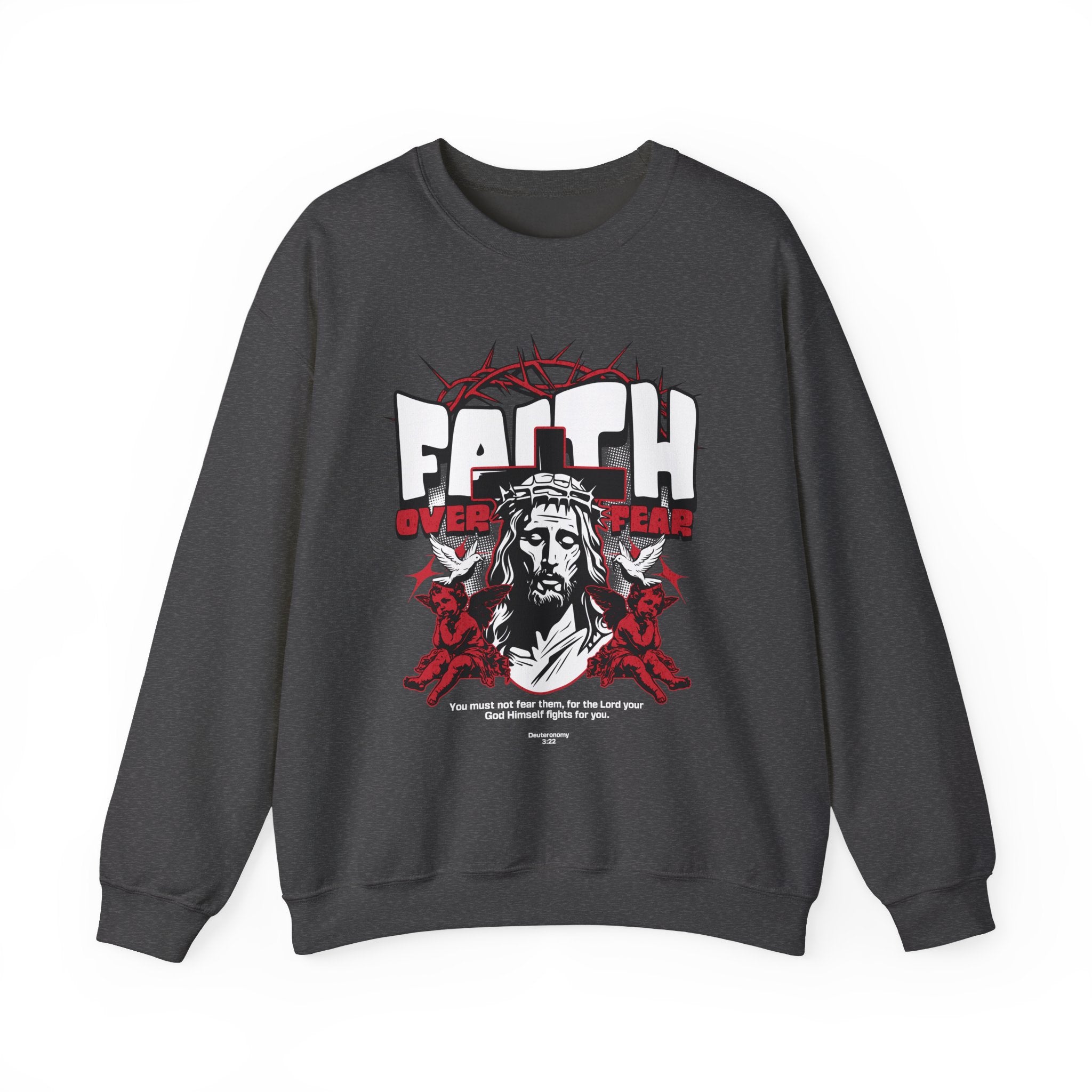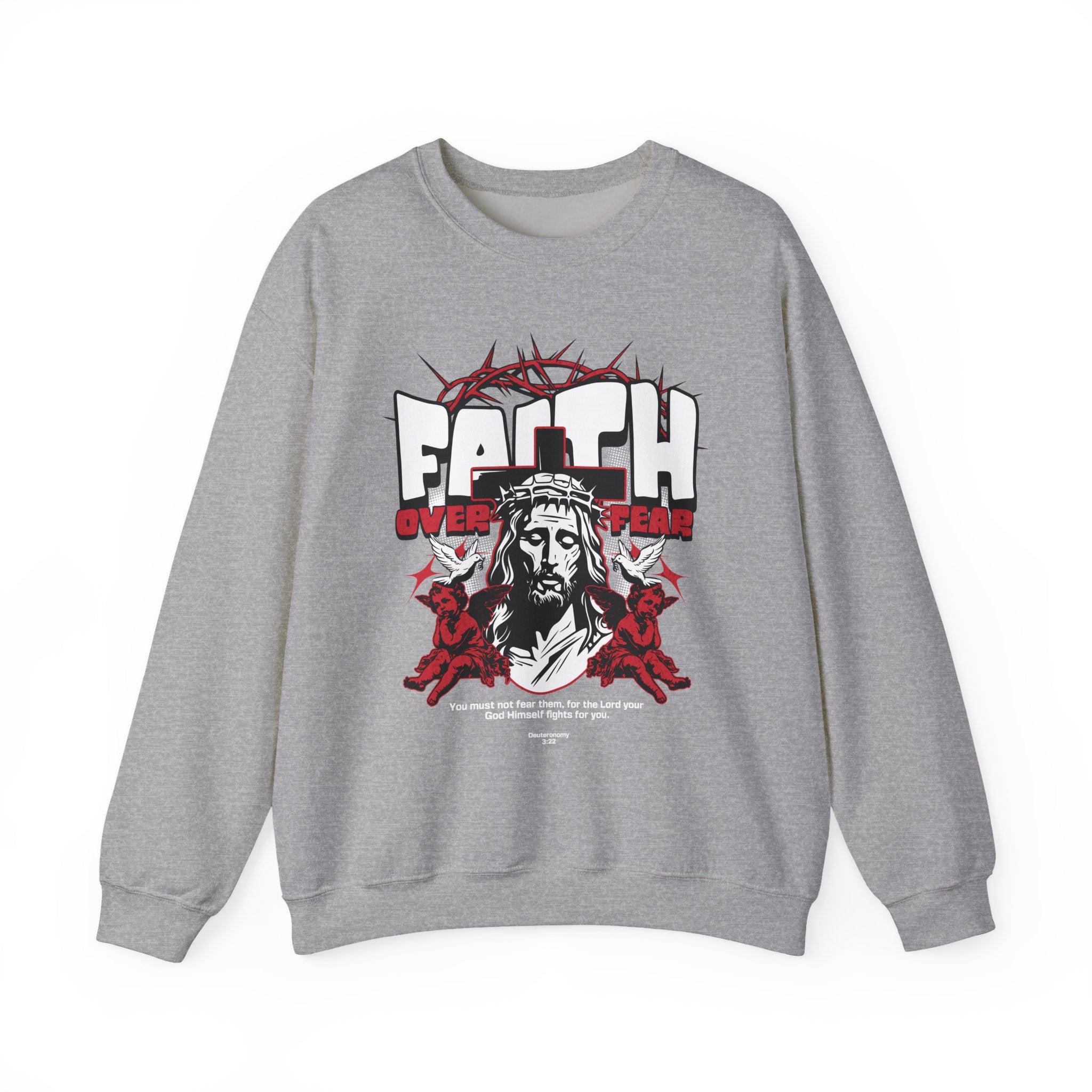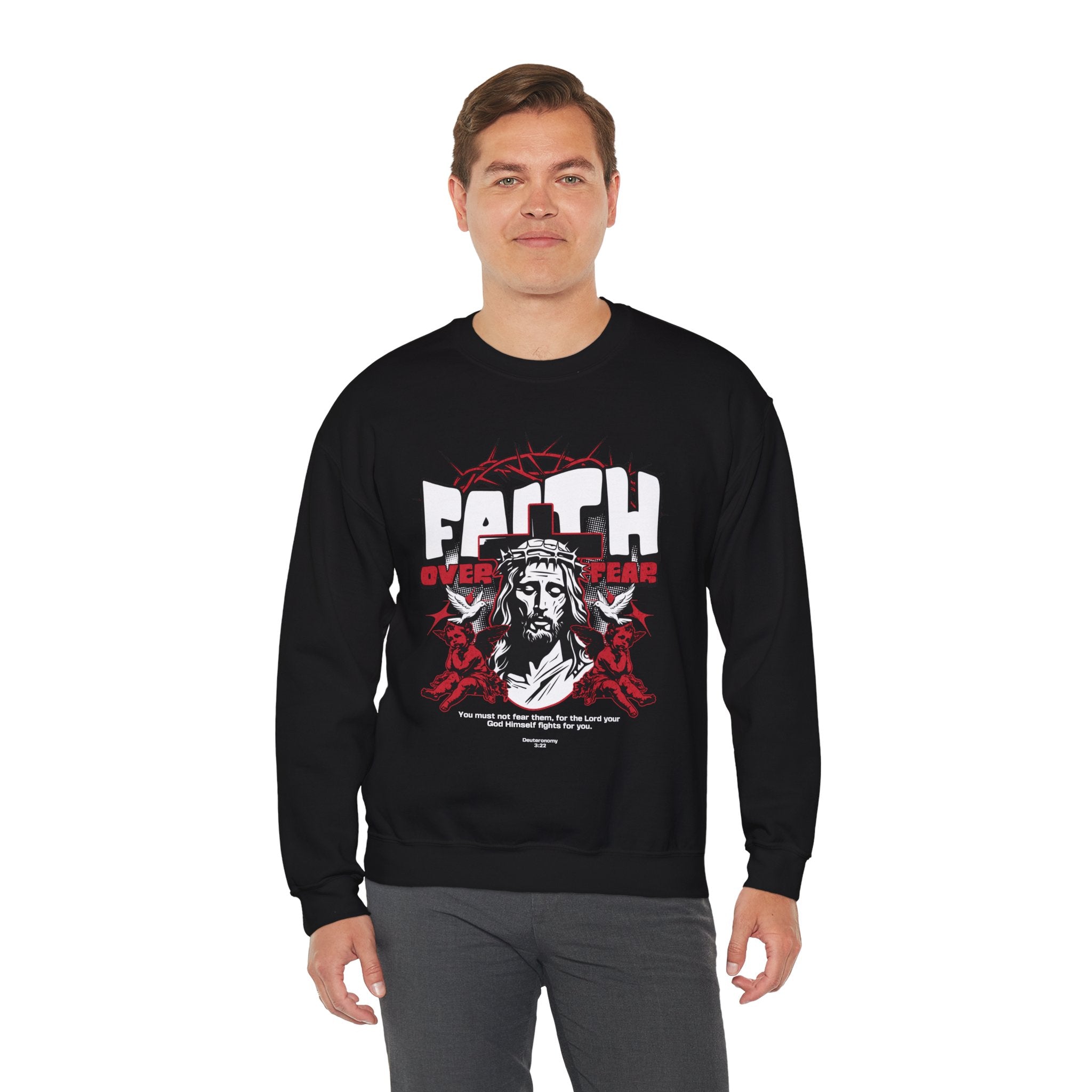 The Faith Over Fear Unisex Heavy Blend™ Crewneck Sweatshirt is a bold reminder that faith is stronger than fear. Featuring a striking image of Jesus with the crown of thorns, flanked by angels and paired with the verse “You must not fear them, for the Lord your God Himself fights for you” (Deuteronomy 3:22), this sweatshirt serves as a wearable testimony of courage, hope, and divine strength.