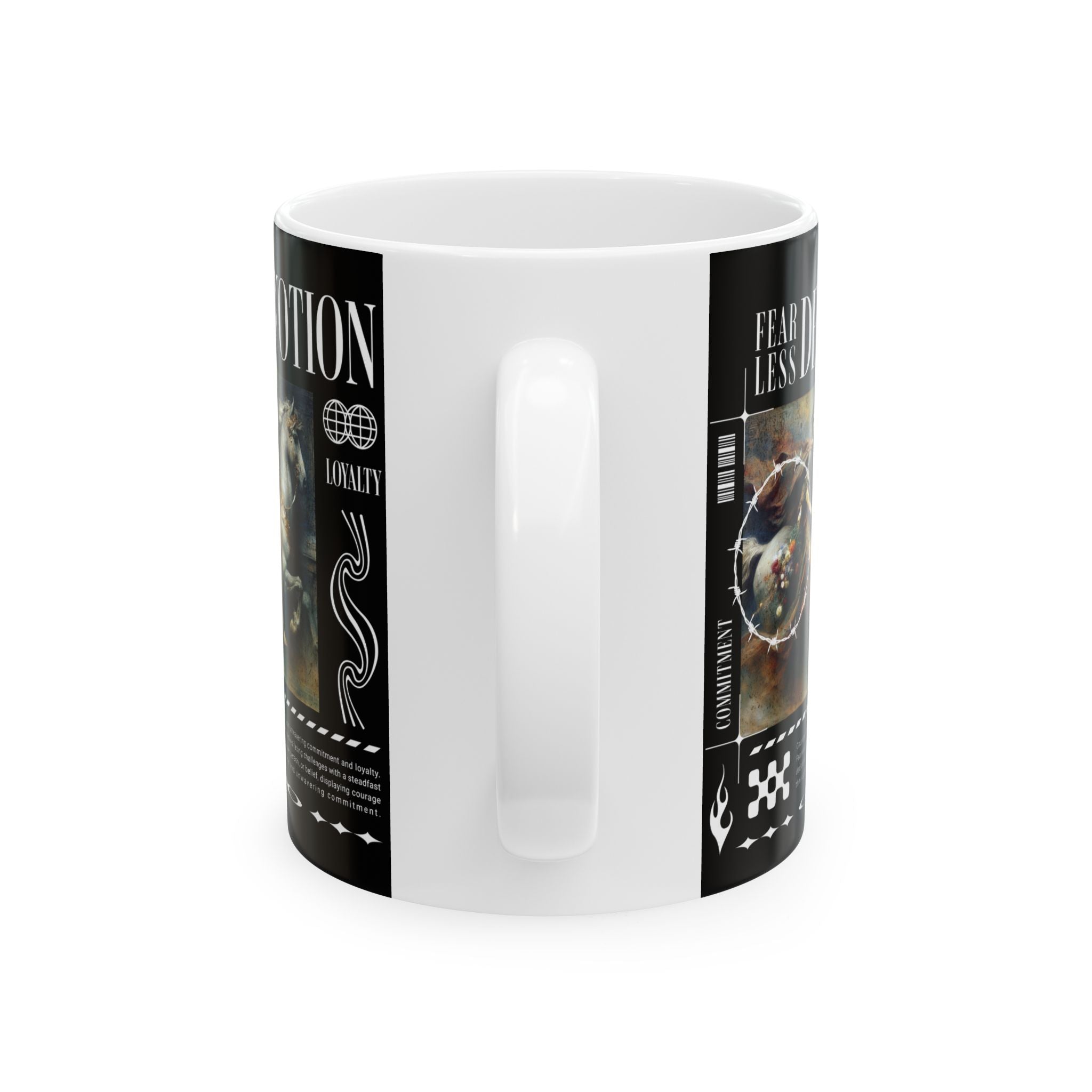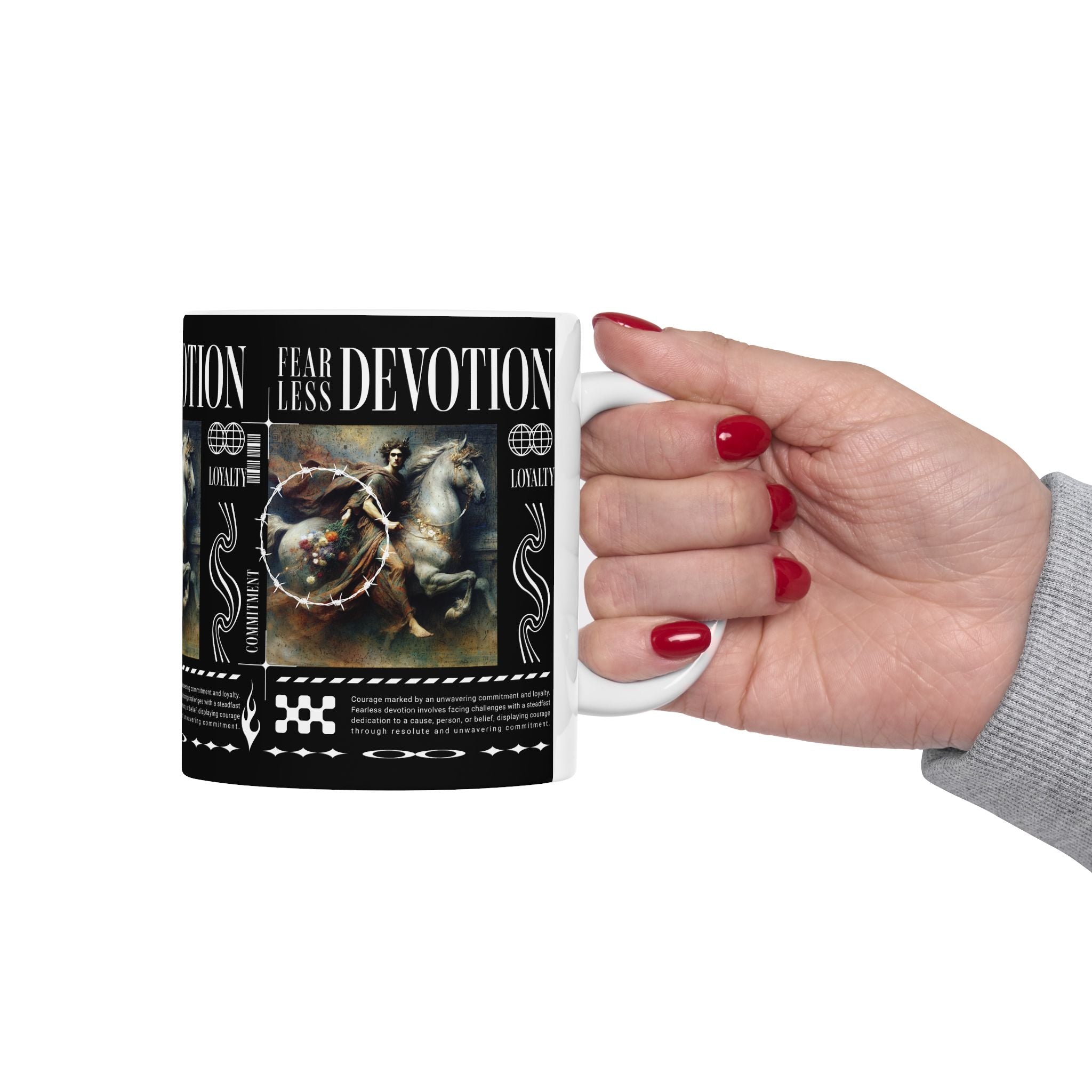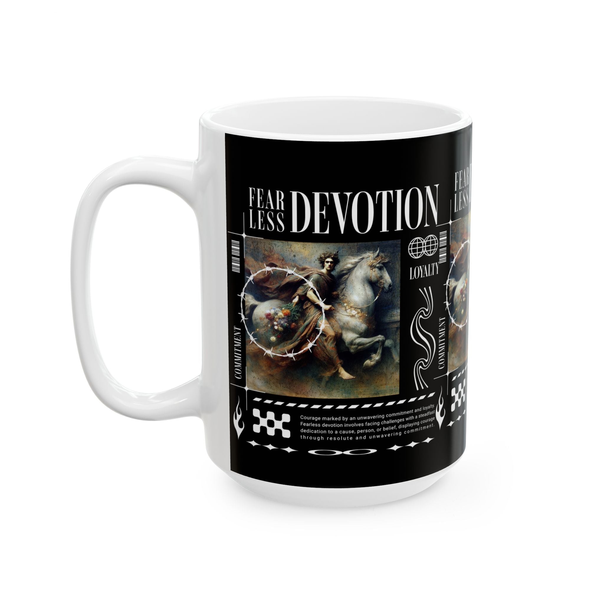The Fearless Devotion Ceramic Mug is more than just a cup—it’s a symbol of strength, loyalty, and resilience. Featuring a bold classical artwork with modern streetwear vibes, this mug turns your daily coffee or tea ritual into a reminder of fearless living and unwavering devotion.
