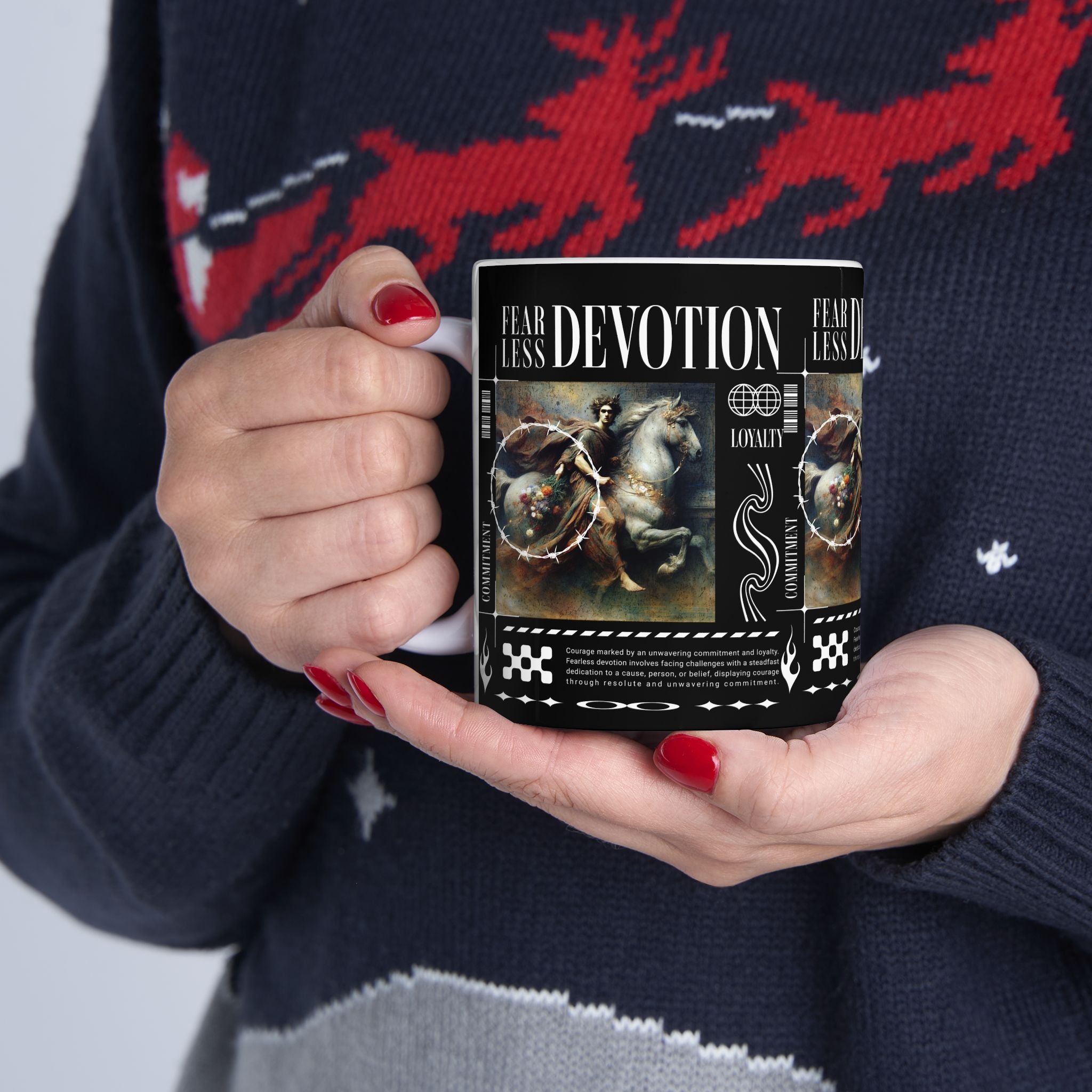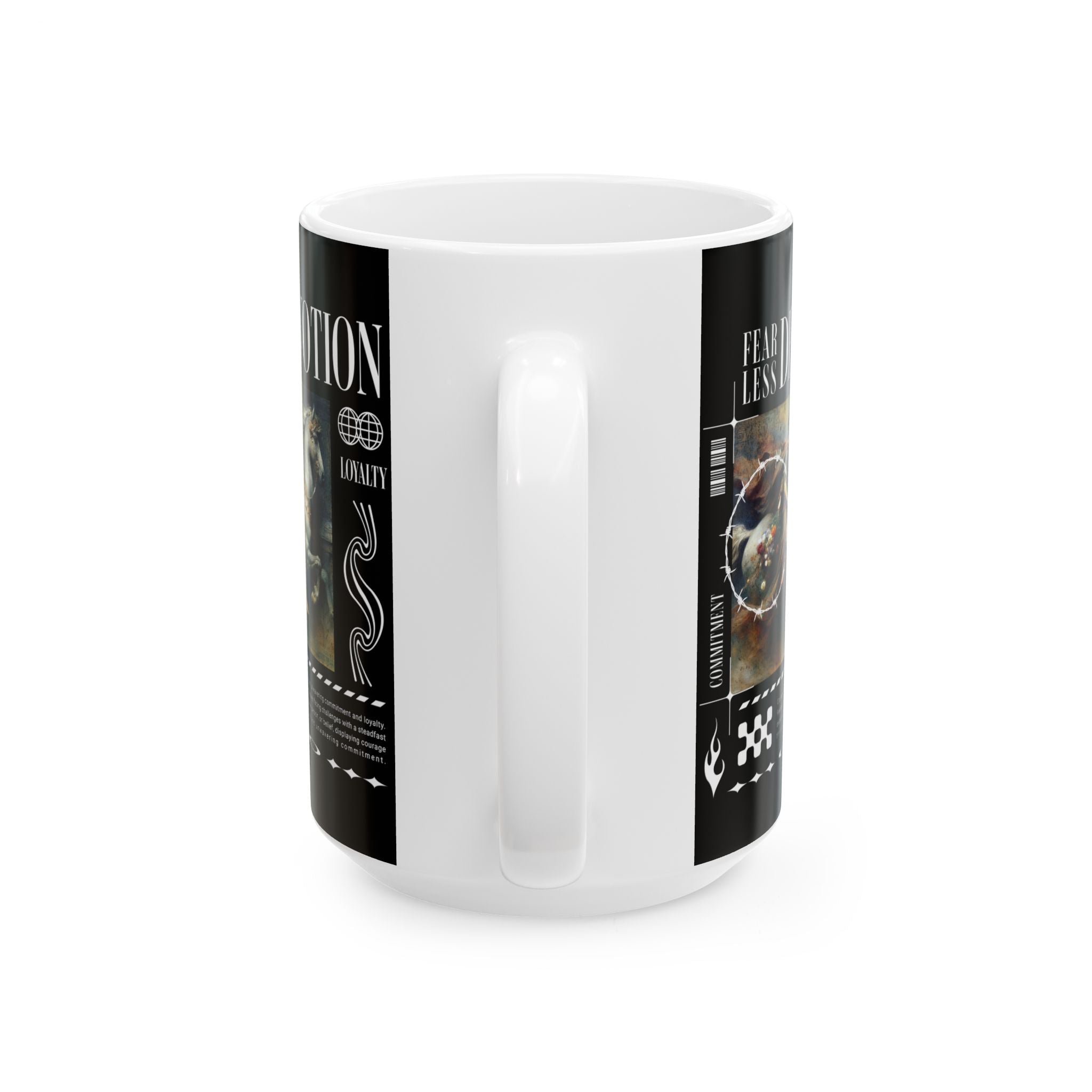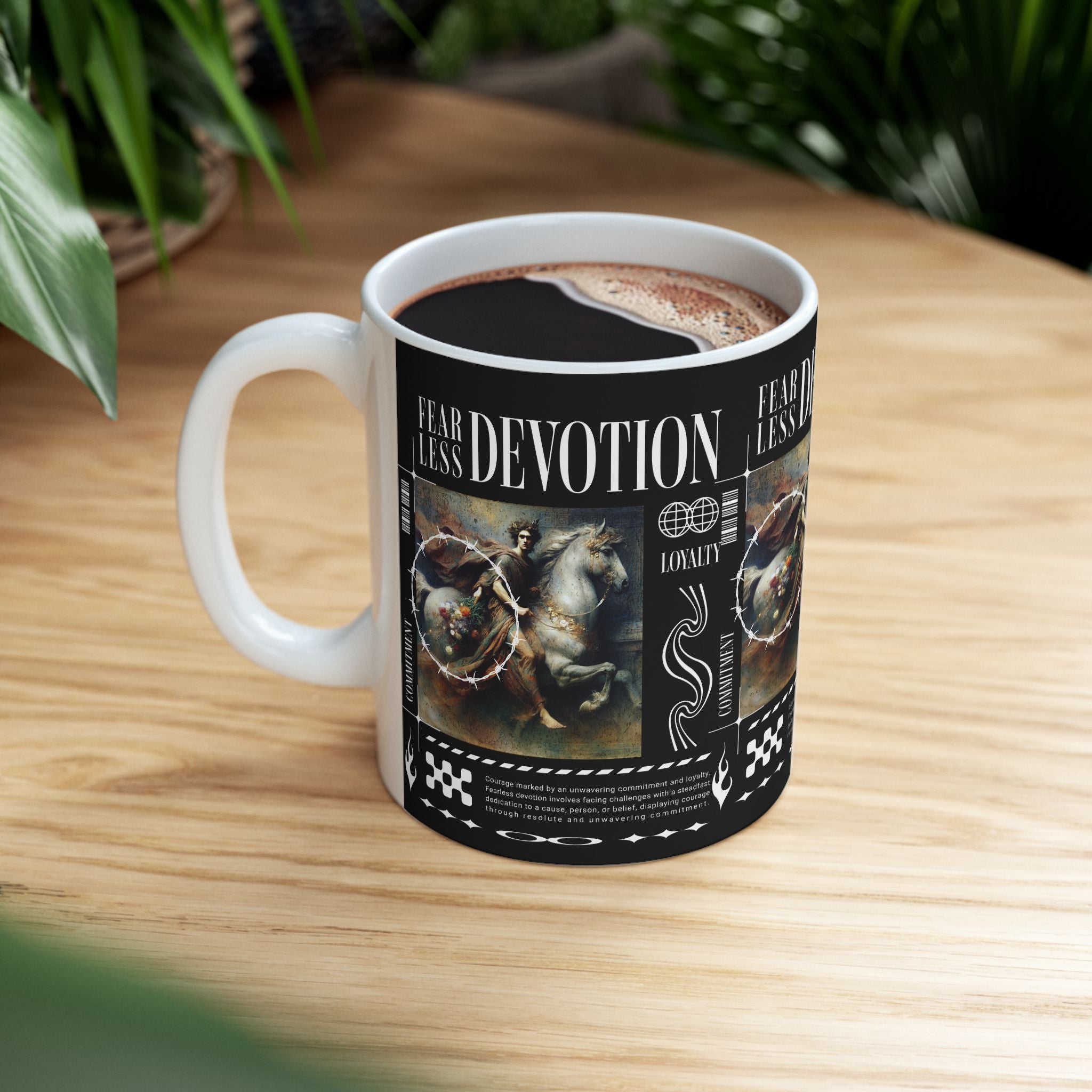 The Fearless Devotion Ceramic Mug is more than just a cup—it’s a symbol of strength, loyalty, and resilience. Featuring a bold classical artwork with modern streetwear vibes, this mug turns your daily coffee or tea ritual into a reminder of fearless living and unwavering devotion.