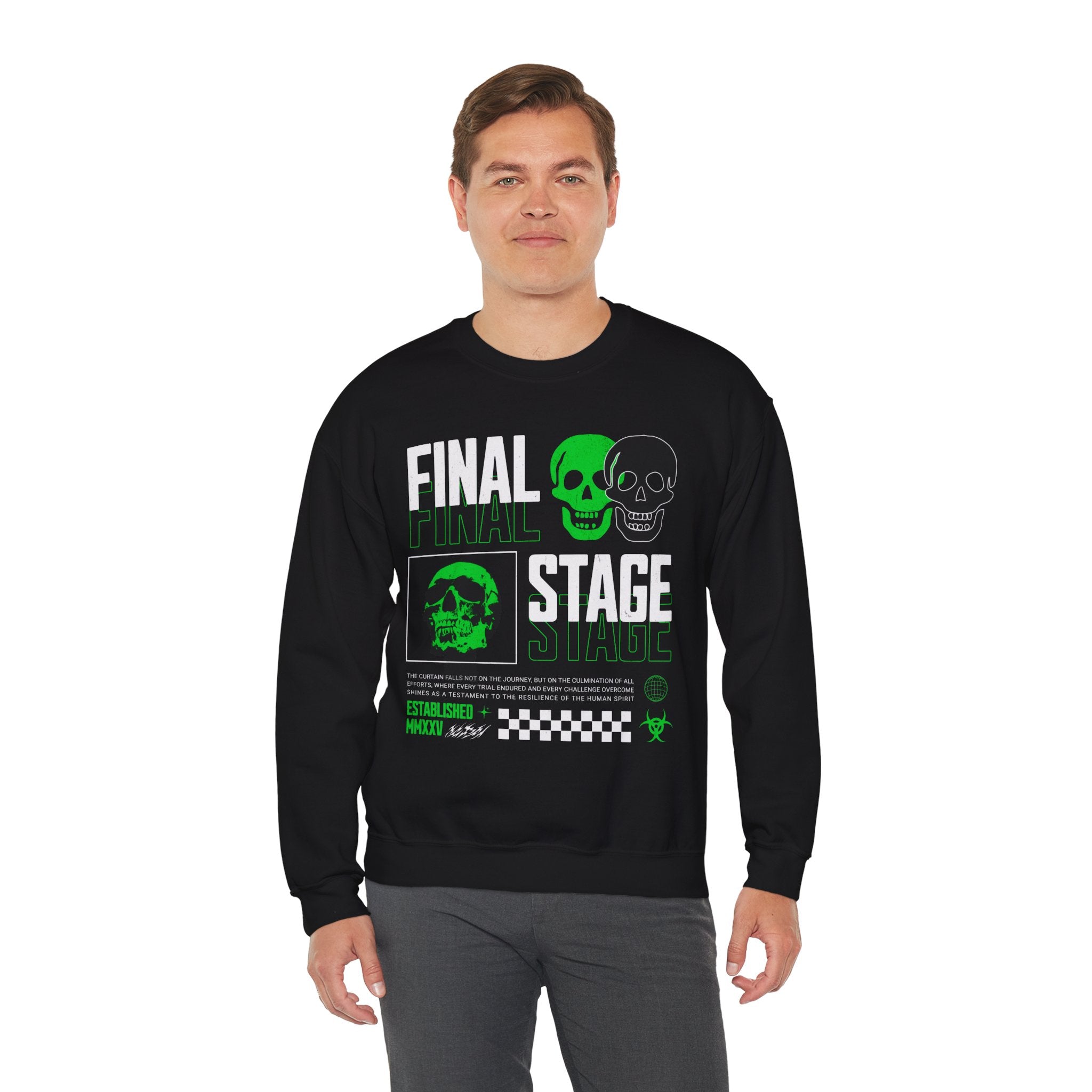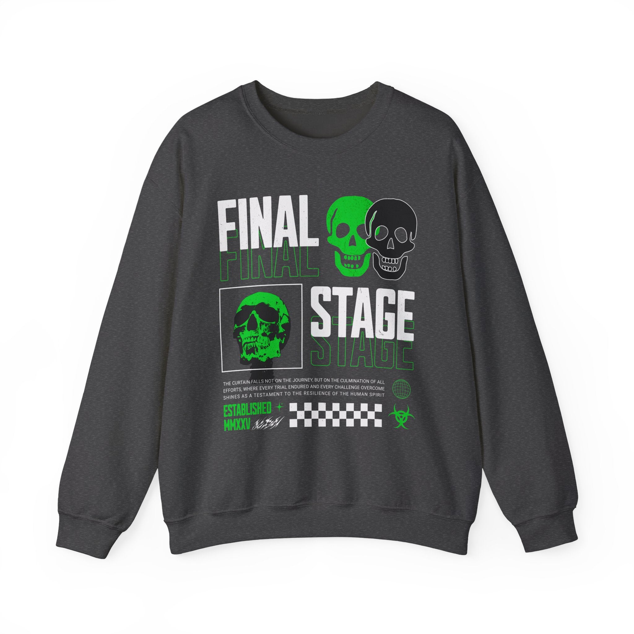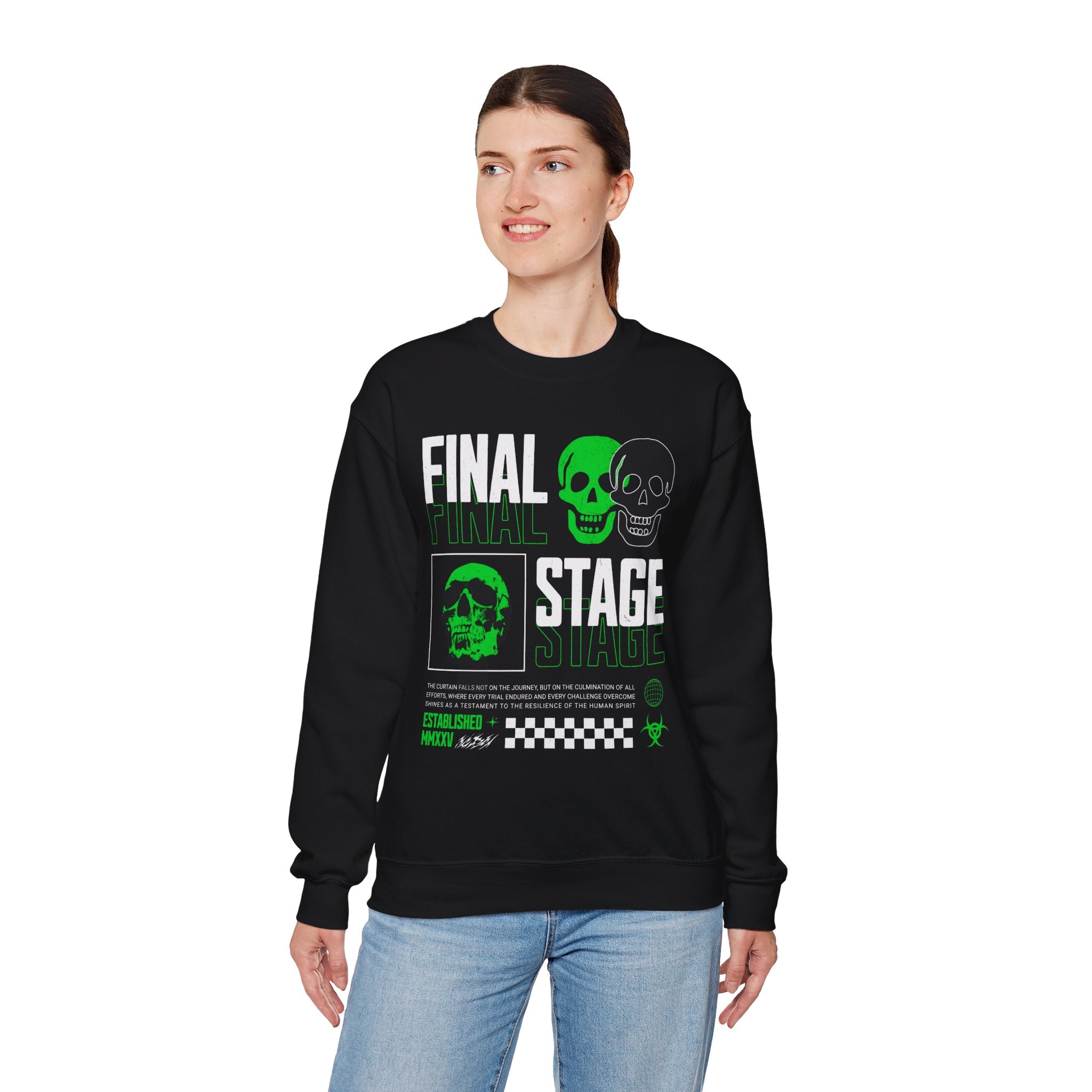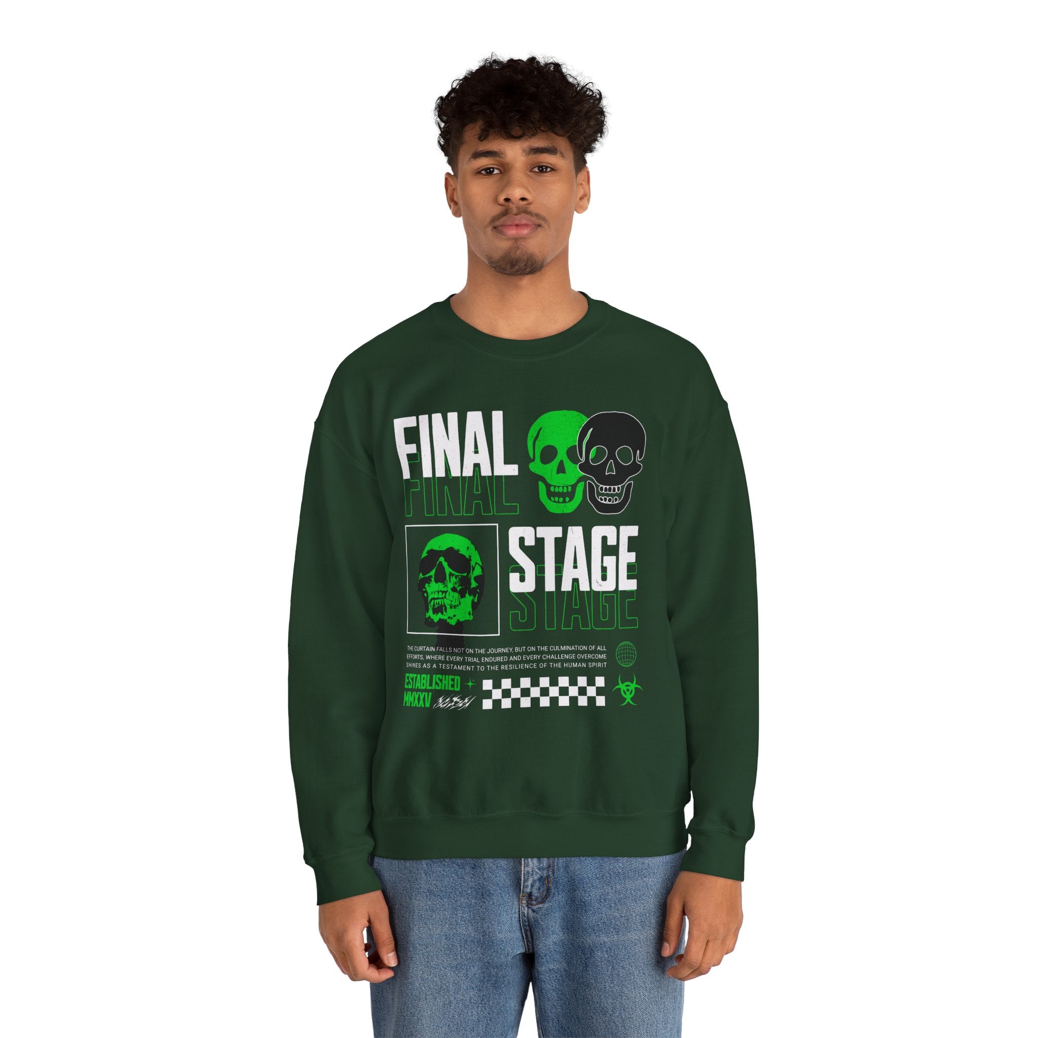 The Final Stage Unisex Heavy Blend™ Crewneck Sweatshirt combines streetwear edge, bold skull graphics, and cyberpunk inspiration. With its neon green and monochrome skull artwork paired with futuristic typography, this pullover is a reminder of resilience, grit, and determination to overcome the final challenge.