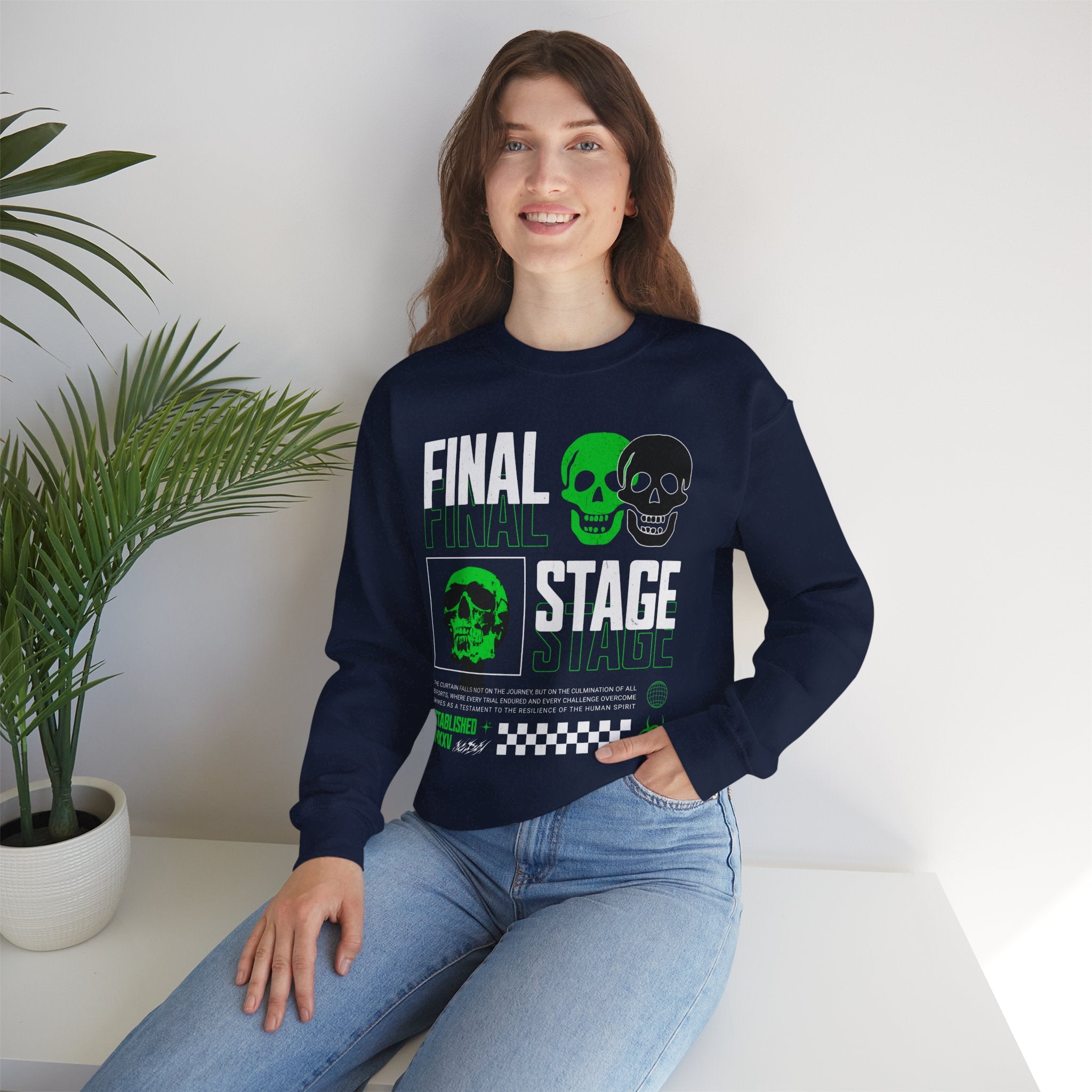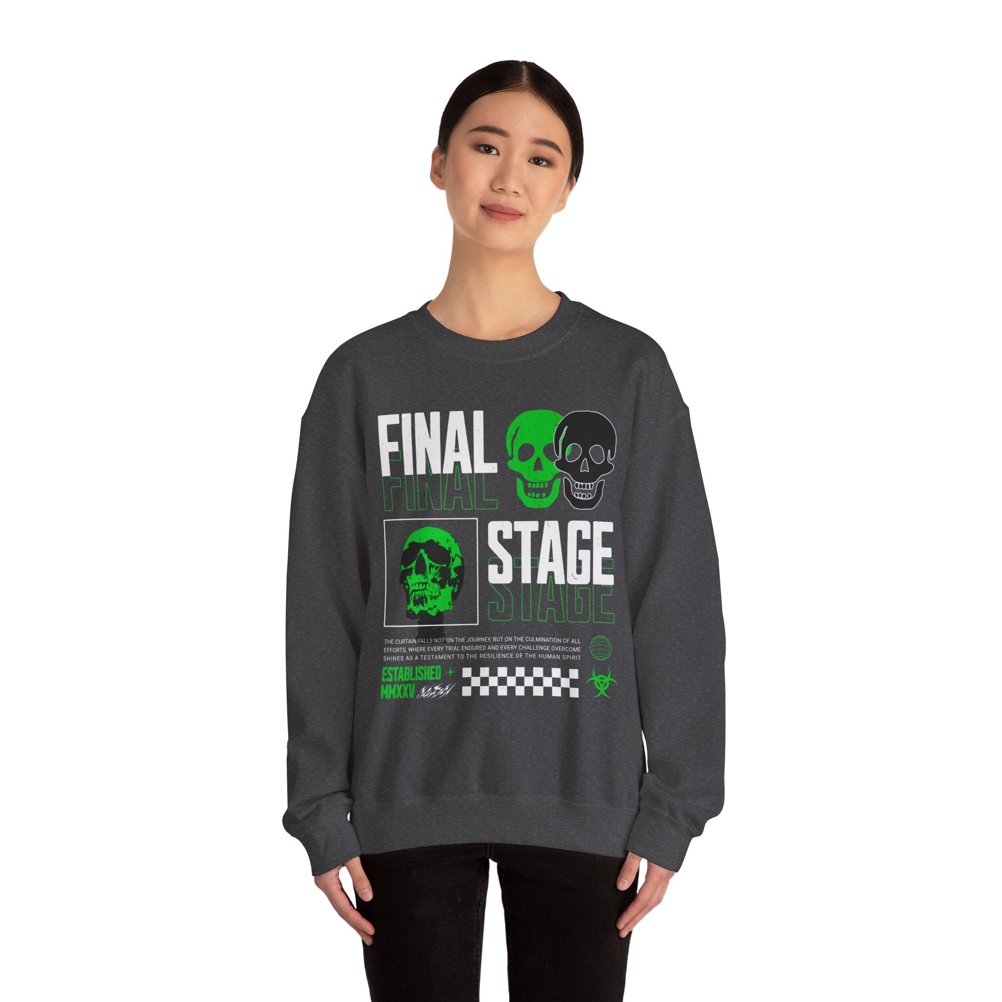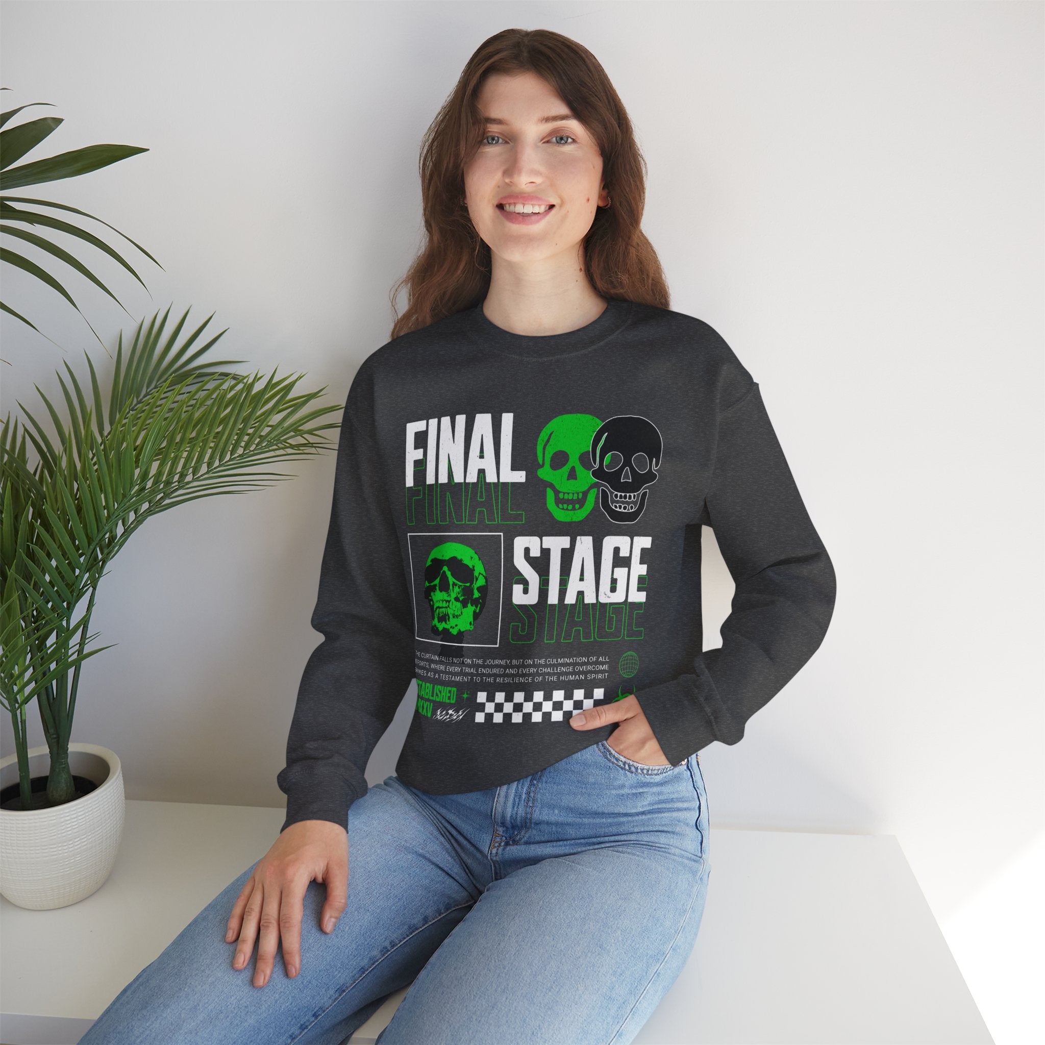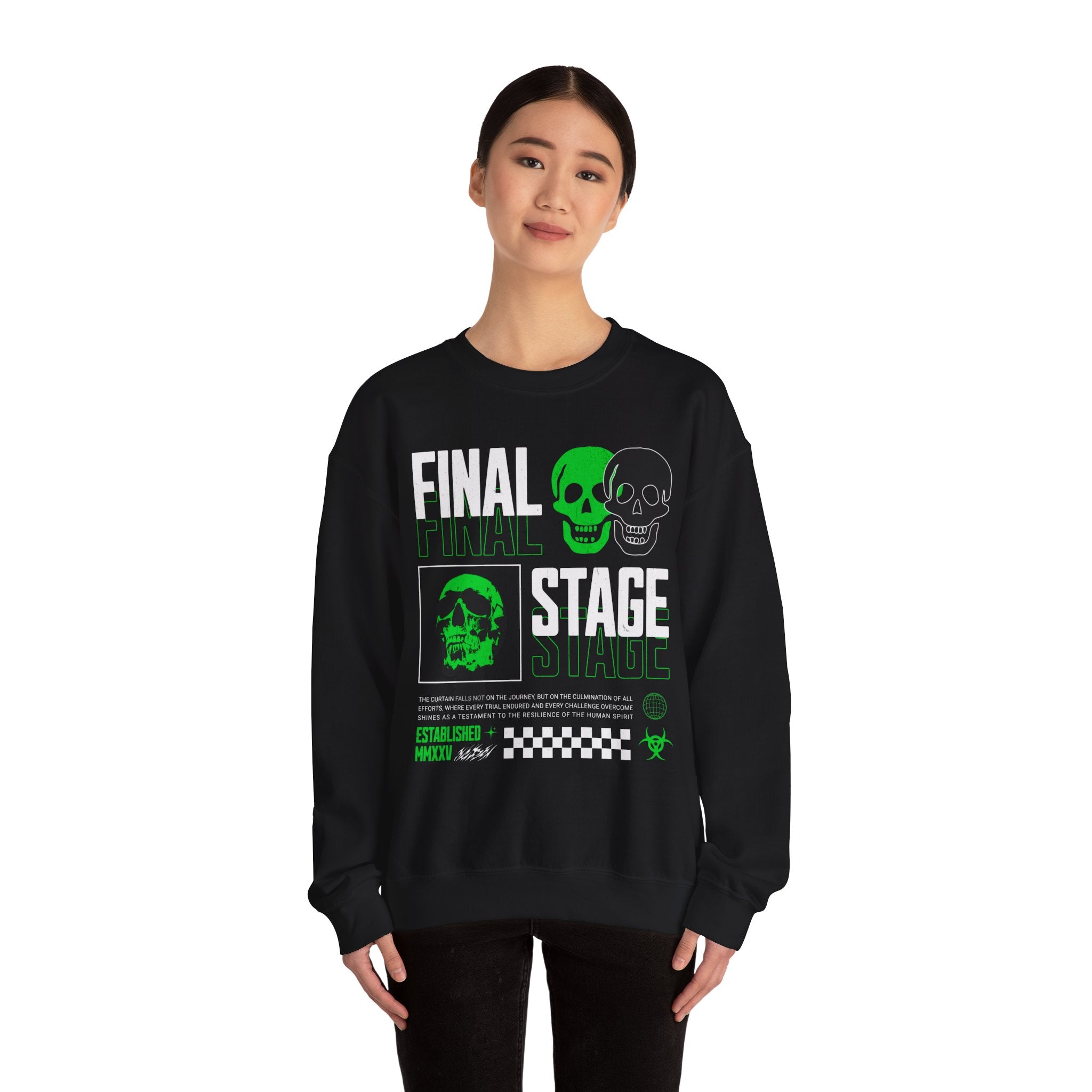 The Final Stage Unisex Heavy Blend™ Crewneck Sweatshirt combines streetwear edge, bold skull graphics, and cyberpunk inspiration. With its neon green and monochrome skull artwork paired with futuristic typography, this pullover is a reminder of resilience, grit, and determination to overcome the final challenge.