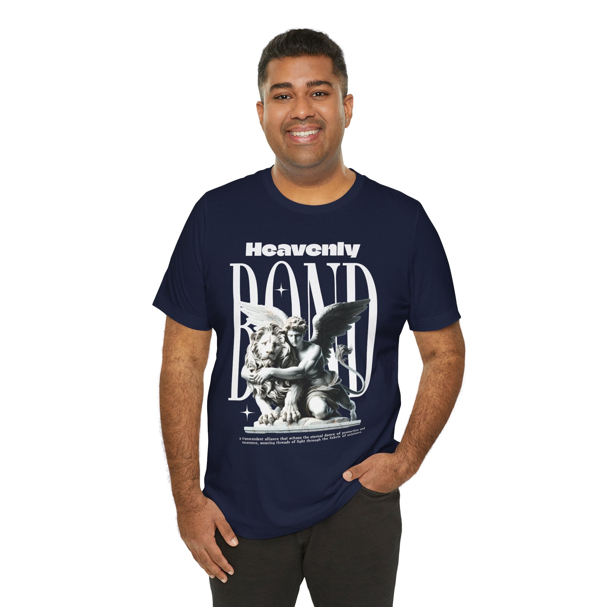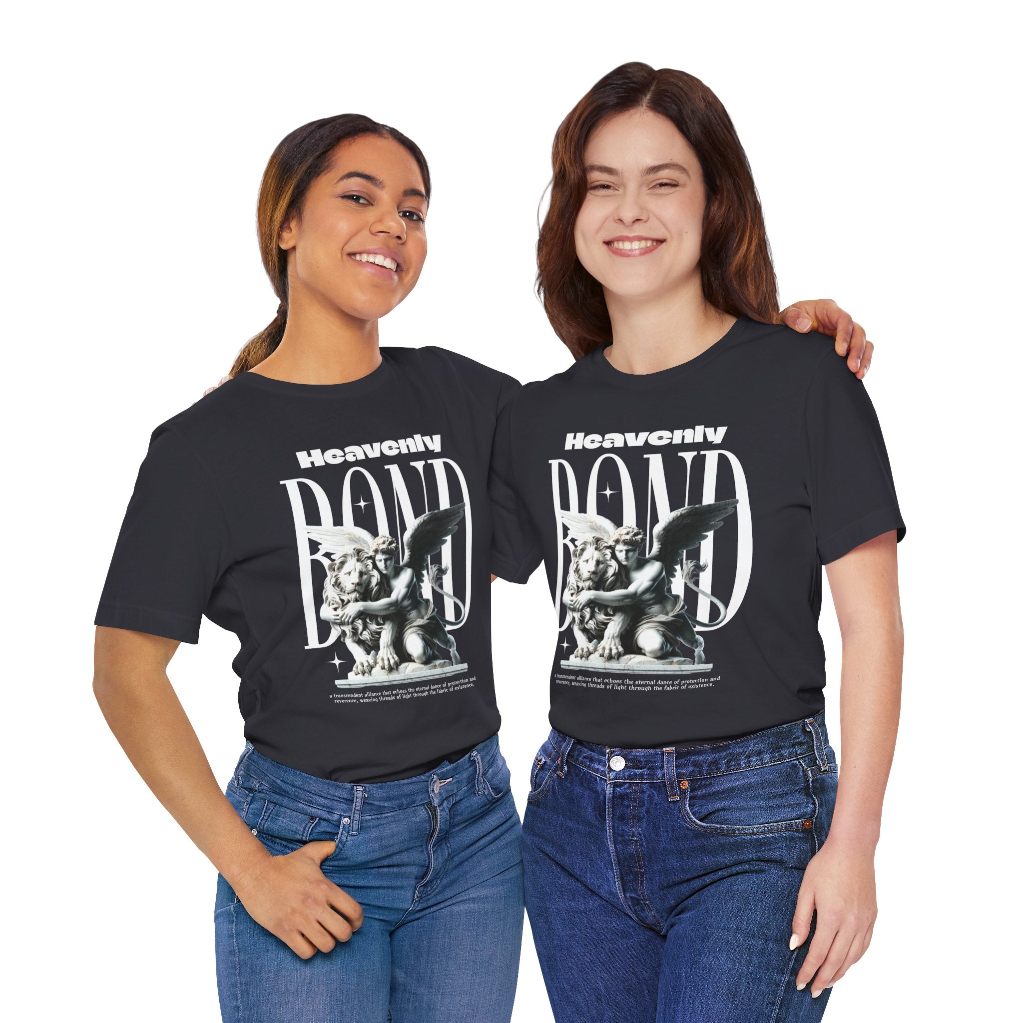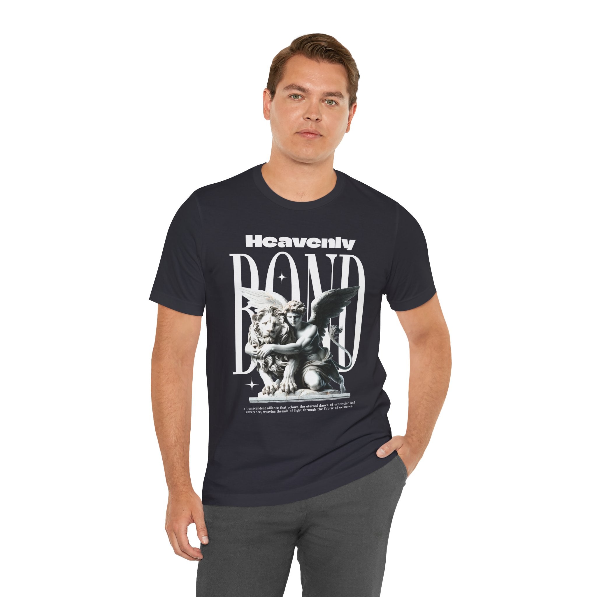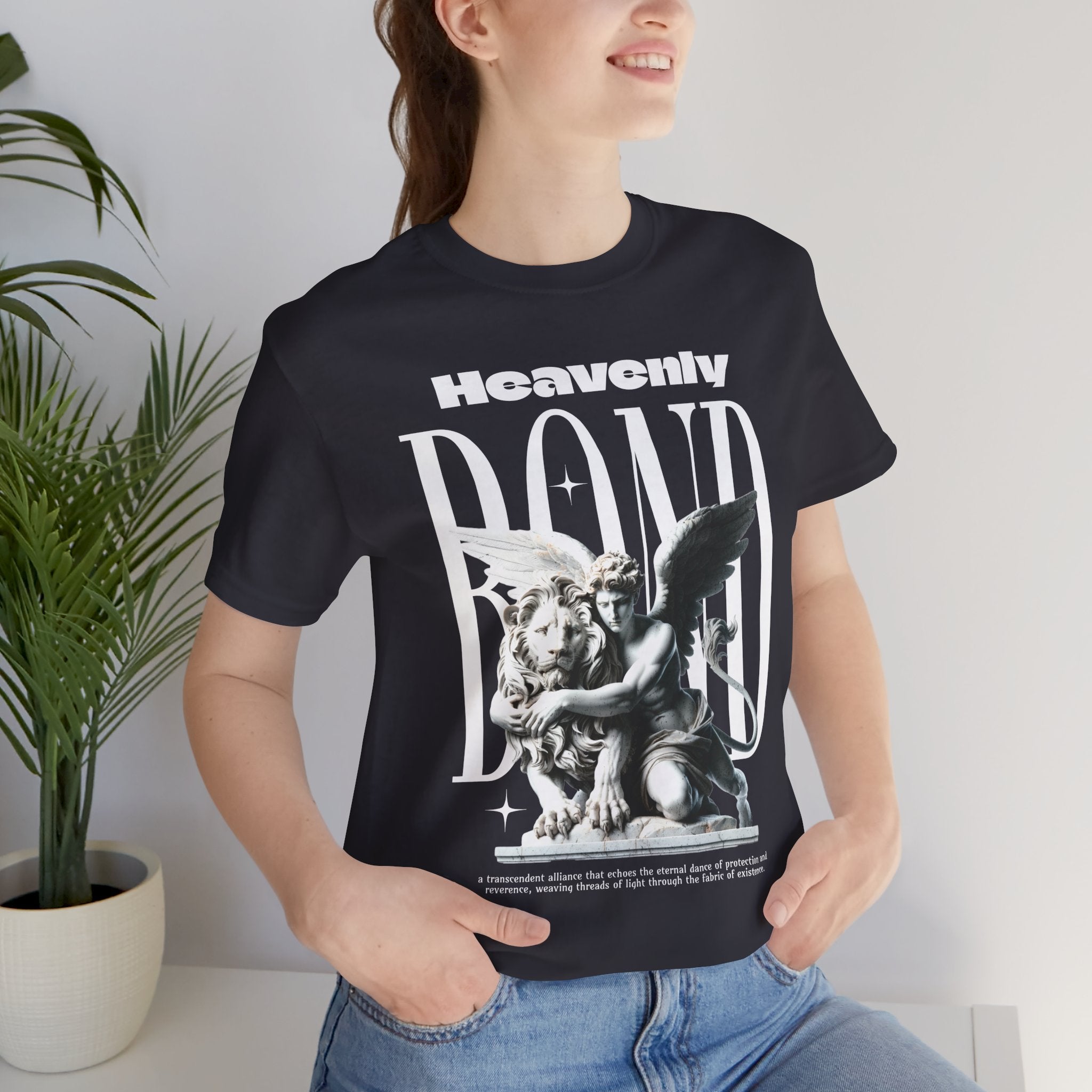 The Heavenly Bond Unisex Jersey Short Sleeve Tee captures the eternal connection between courage and divinity. Featuring a majestic statue-inspired design of an angel embracing a lion, this graphic represents protection, strength, and a transcendent alliance.