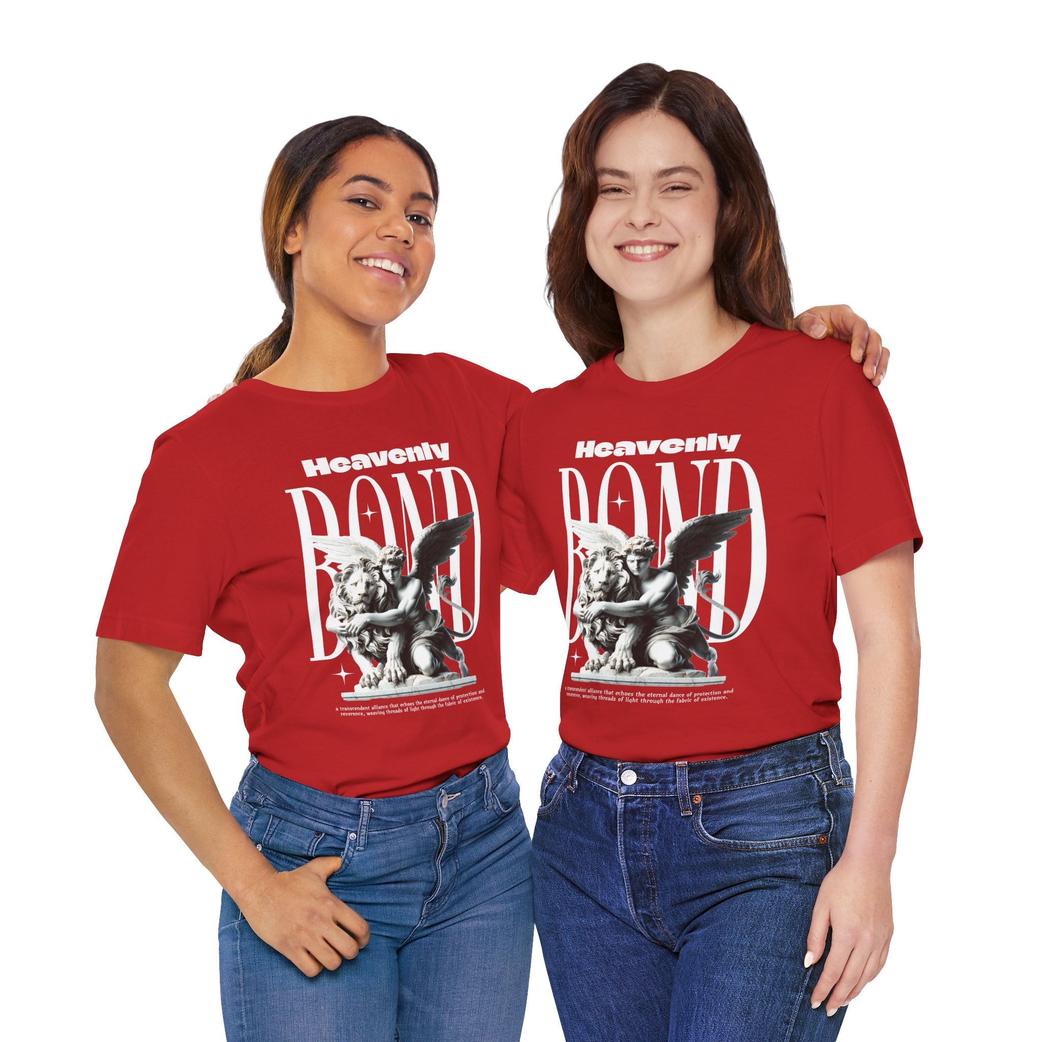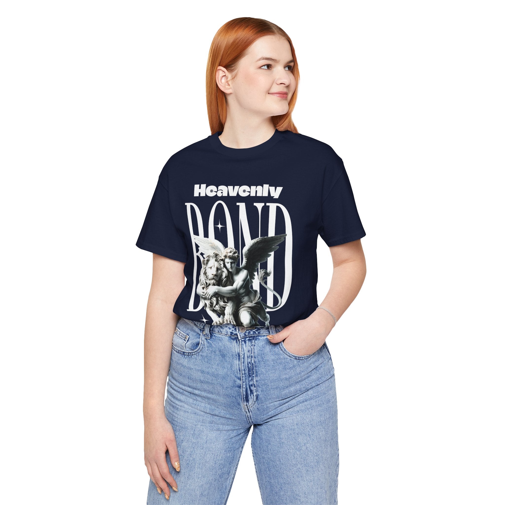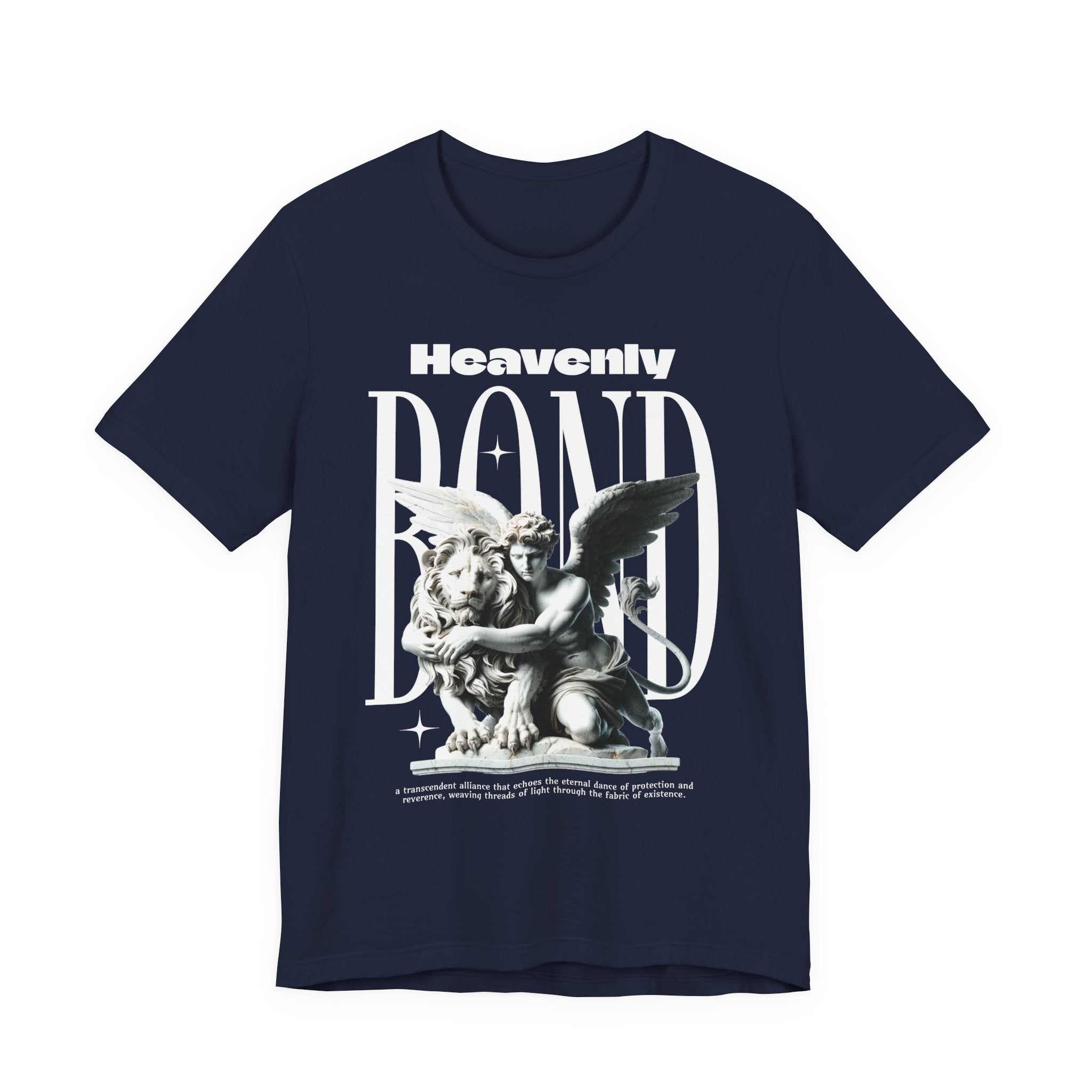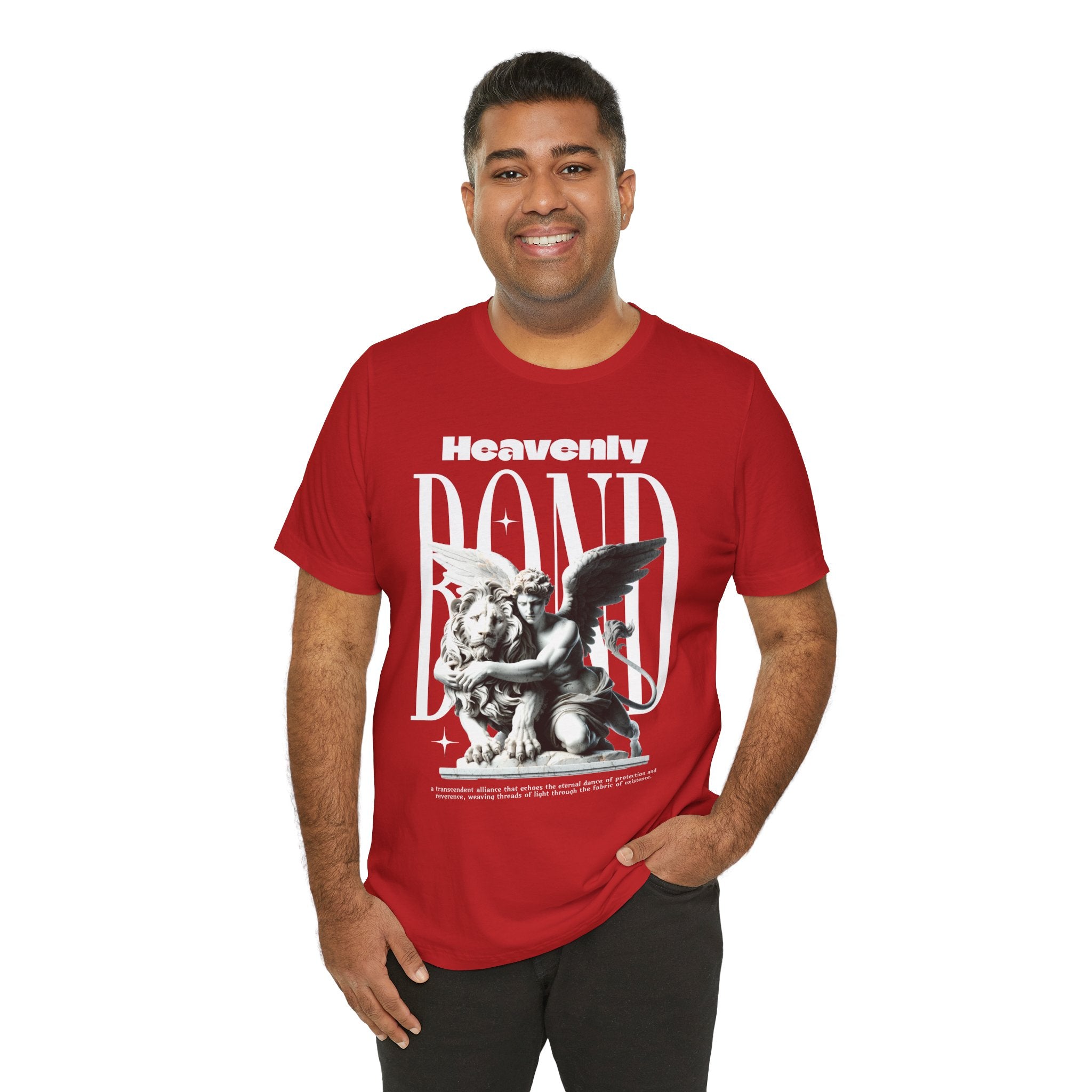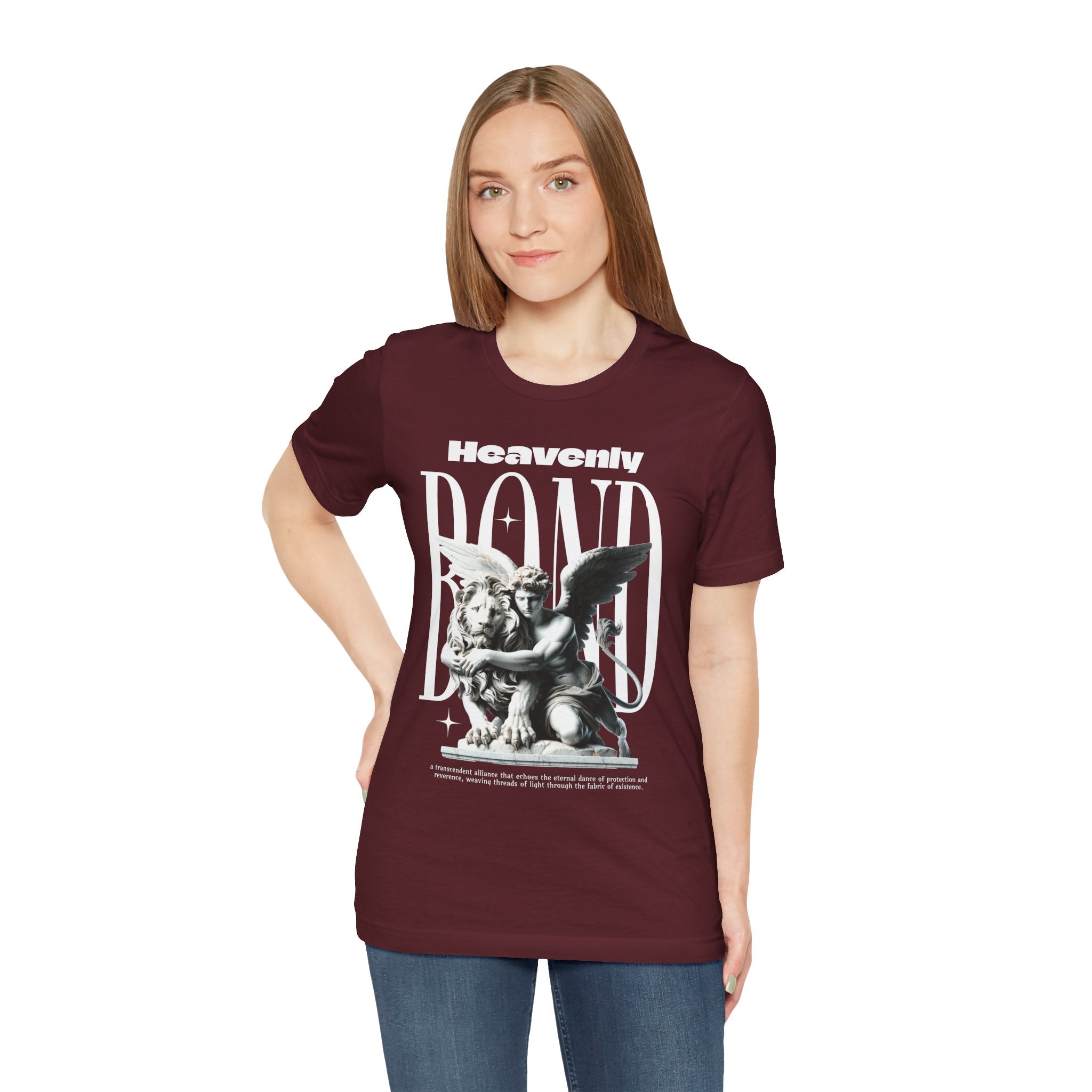 The Heavenly Bond Unisex Jersey Short Sleeve Tee captures the eternal connection between courage and divinity. Featuring a majestic statue-inspired design of an angel embracing a lion, this graphic represents protection, strength, and a transcendent alliance.