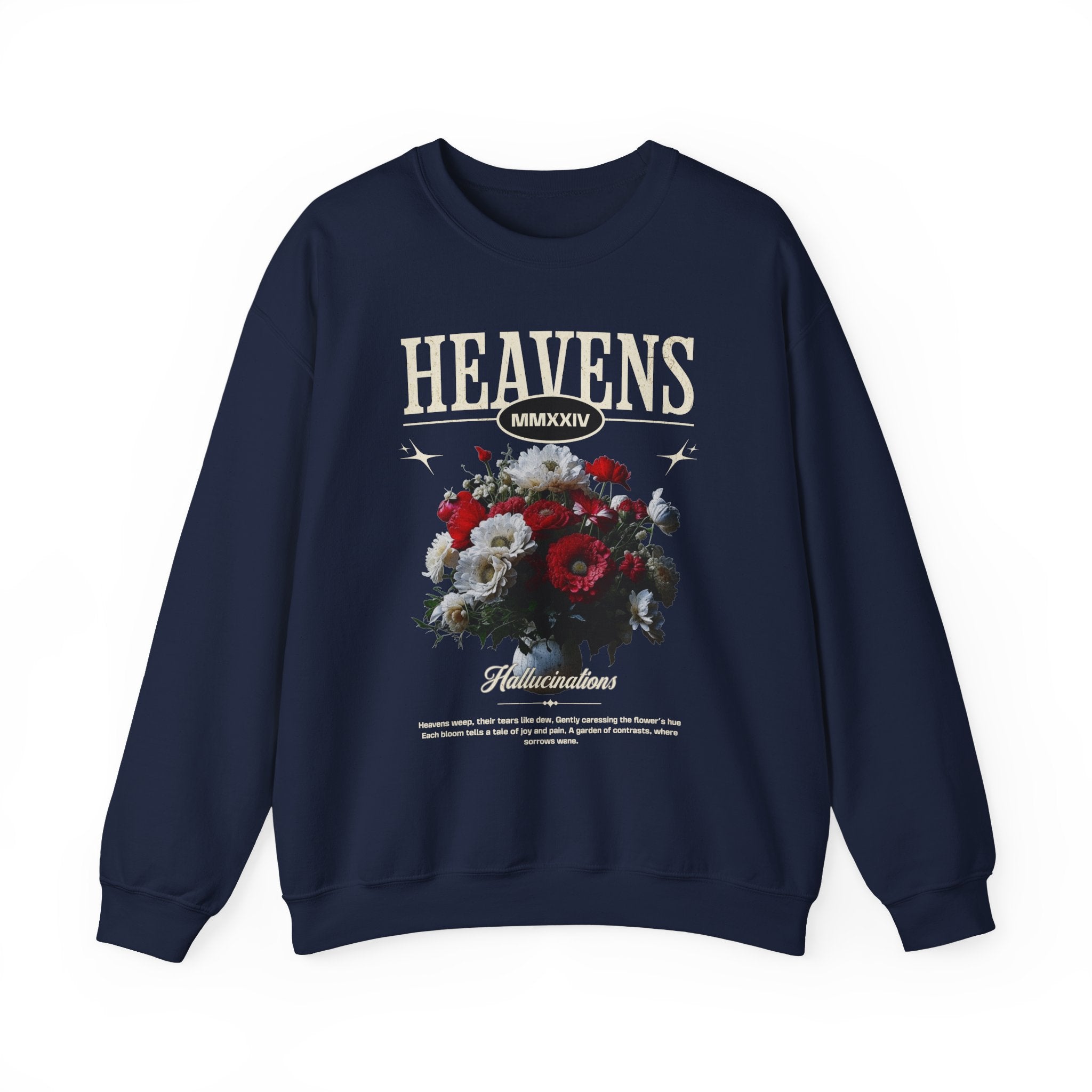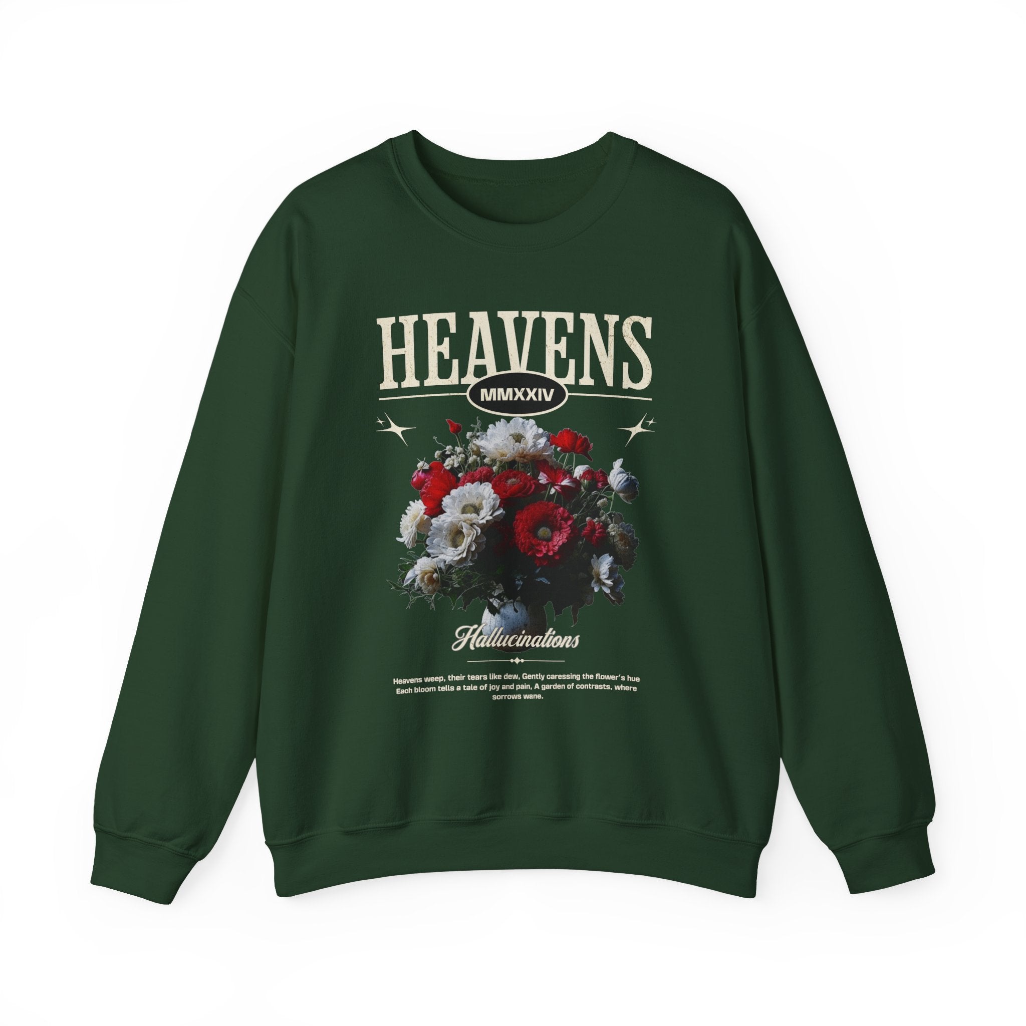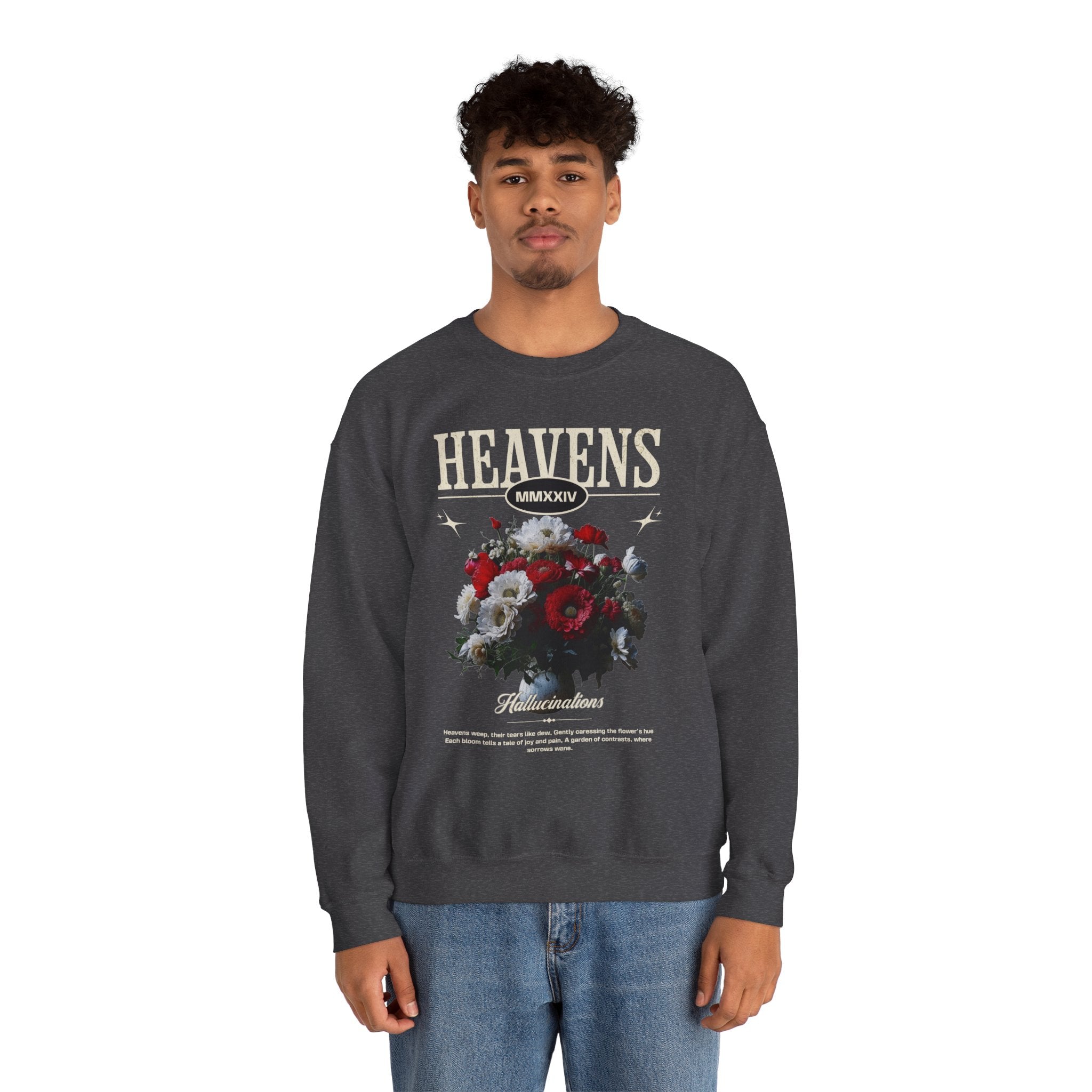 Bring art and comfort together with the Heavens Hallucinations Crewneck Sweatshirt. This striking piece features a bold “Heavens” headline paired with an intricate floral bouquet graphic—symbolizing both joy and sorrow, resilience and fragility. It’s not just a sweatshirt, it’s wearable storytelling.