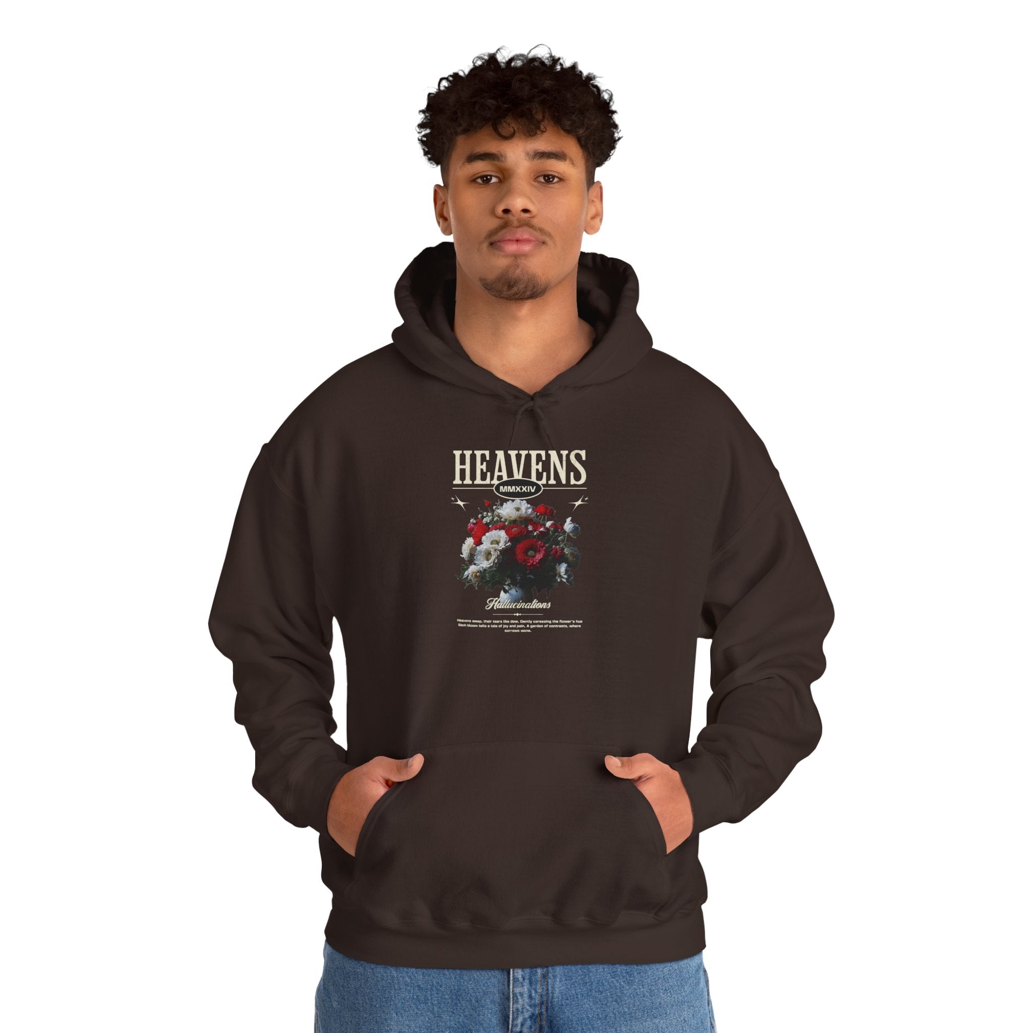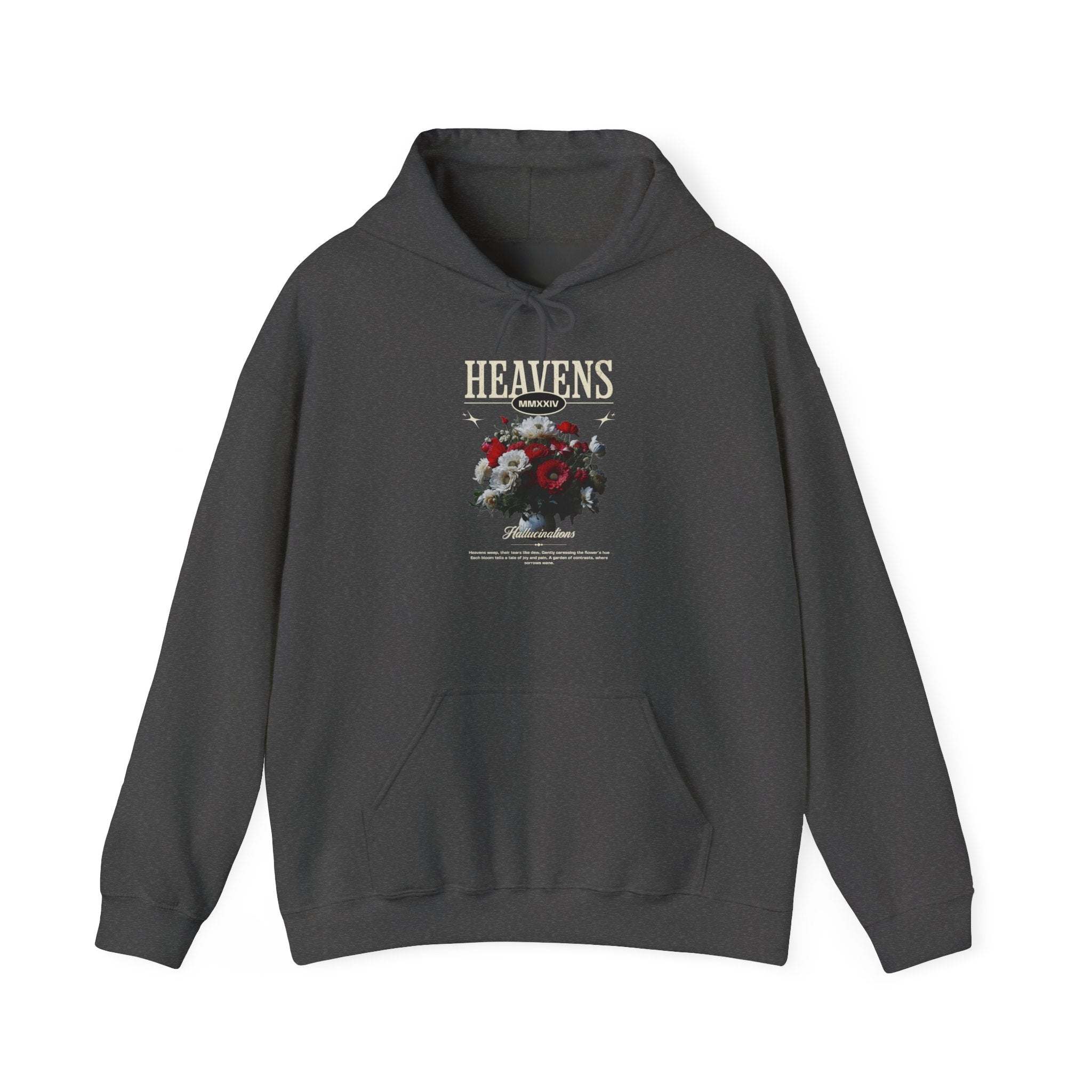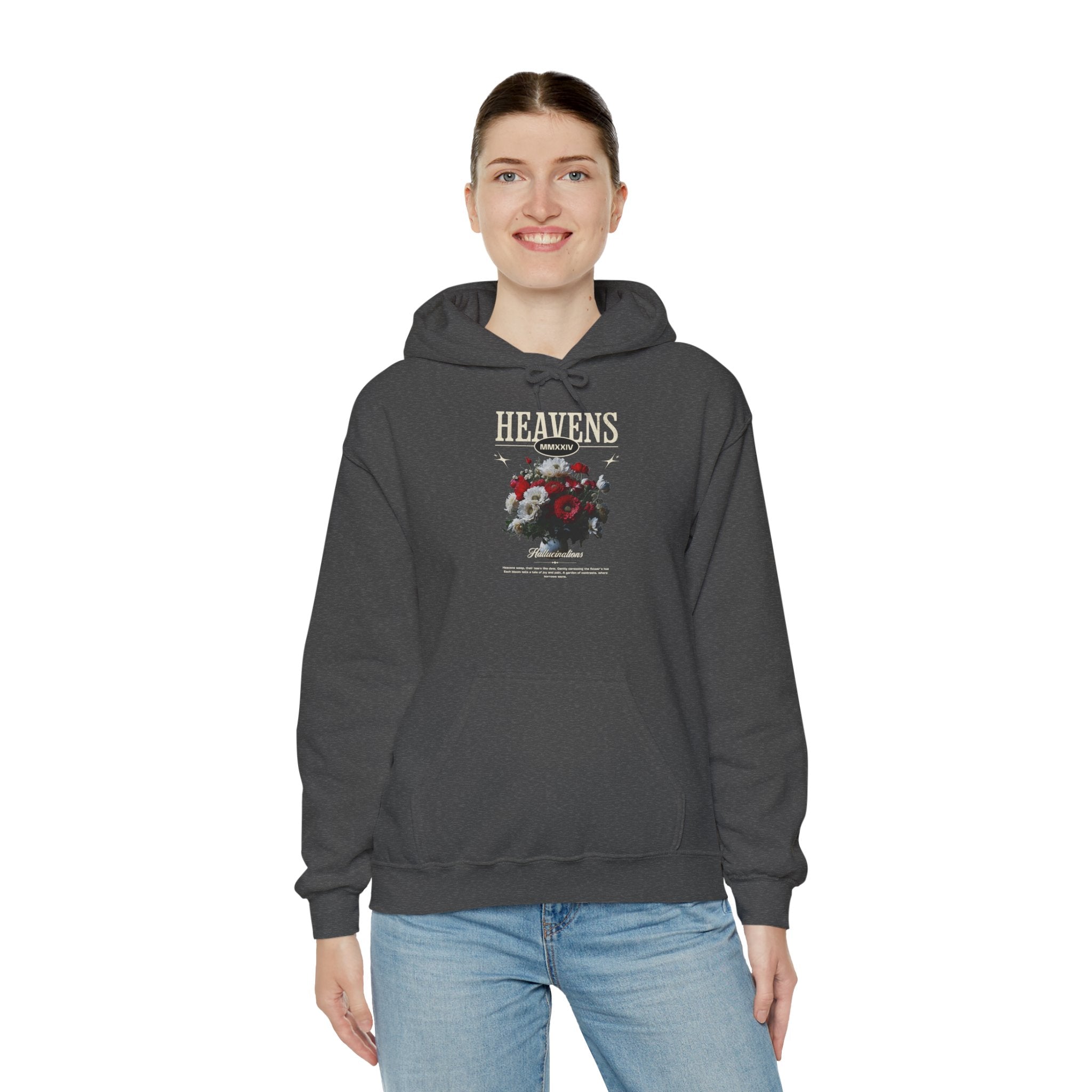 Elevate your wardrobe with the Heavens Hallucinations Hoodie, a striking blend of art and streetwear. The bold “Heavens” typography paired with a symbolic floral bouquet creates a piece that feels both emotional and empowering. Each flower in the design speaks to contrasts—joy, sorrow, resilience—making this hoodie more than just fashion; it’s a statement of self-expression.