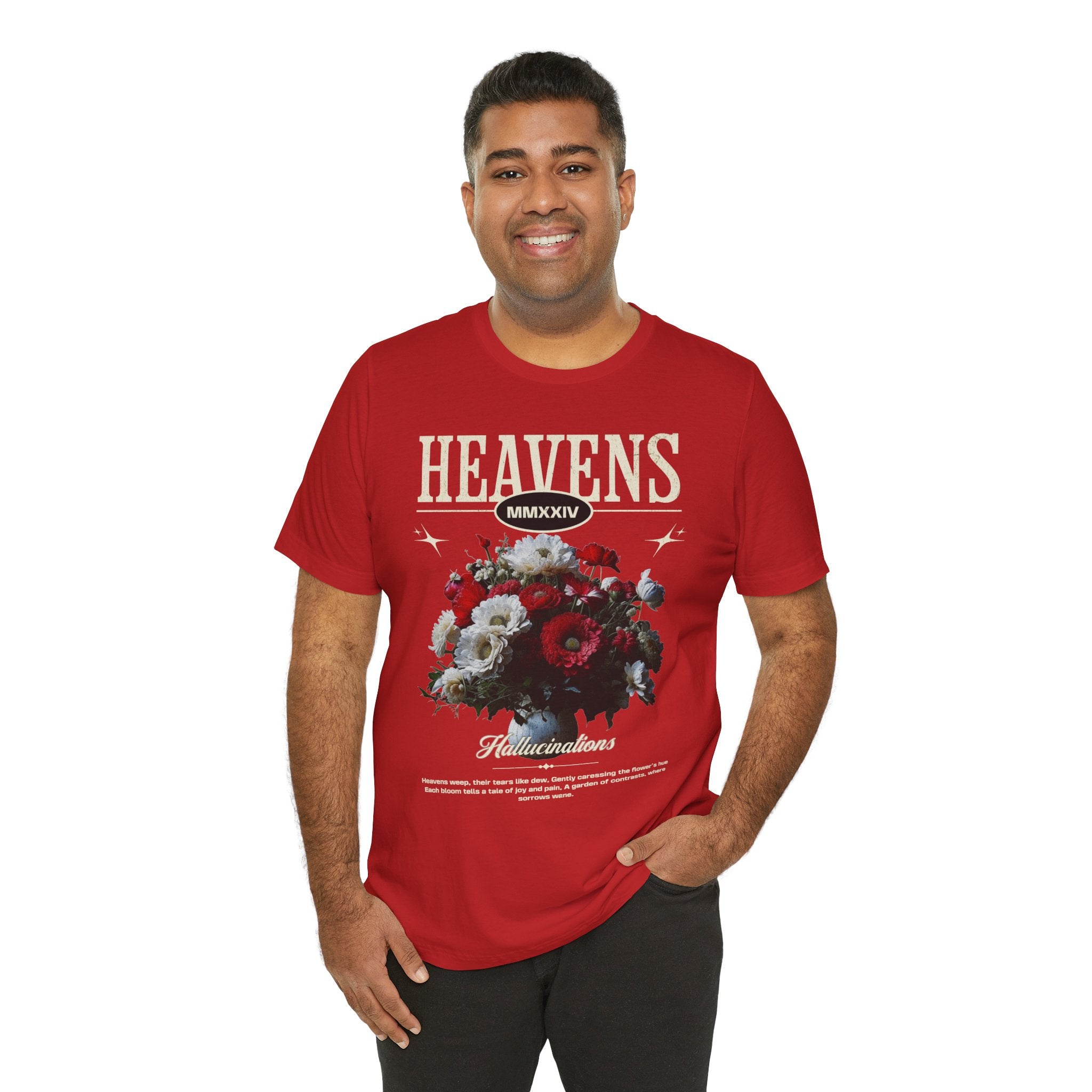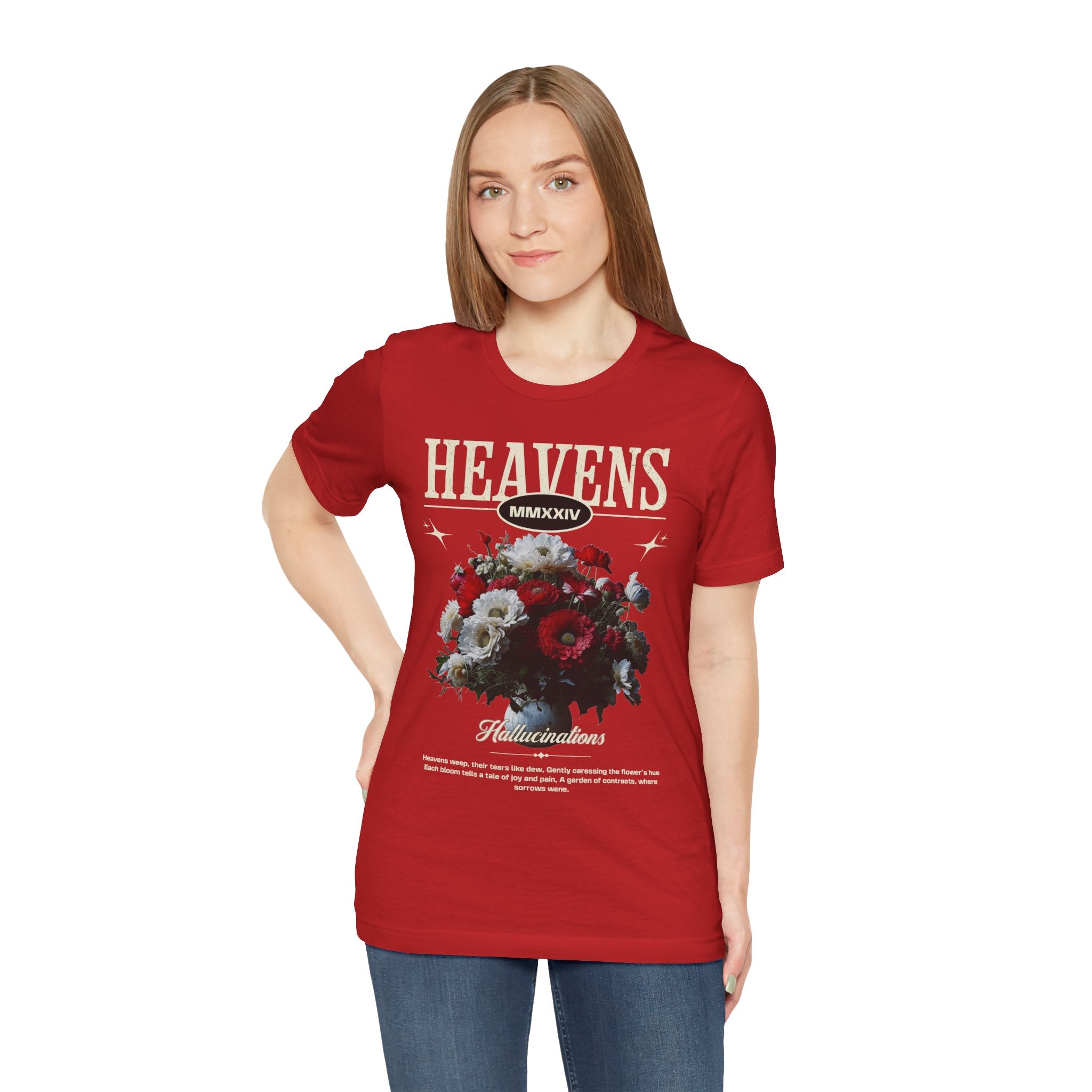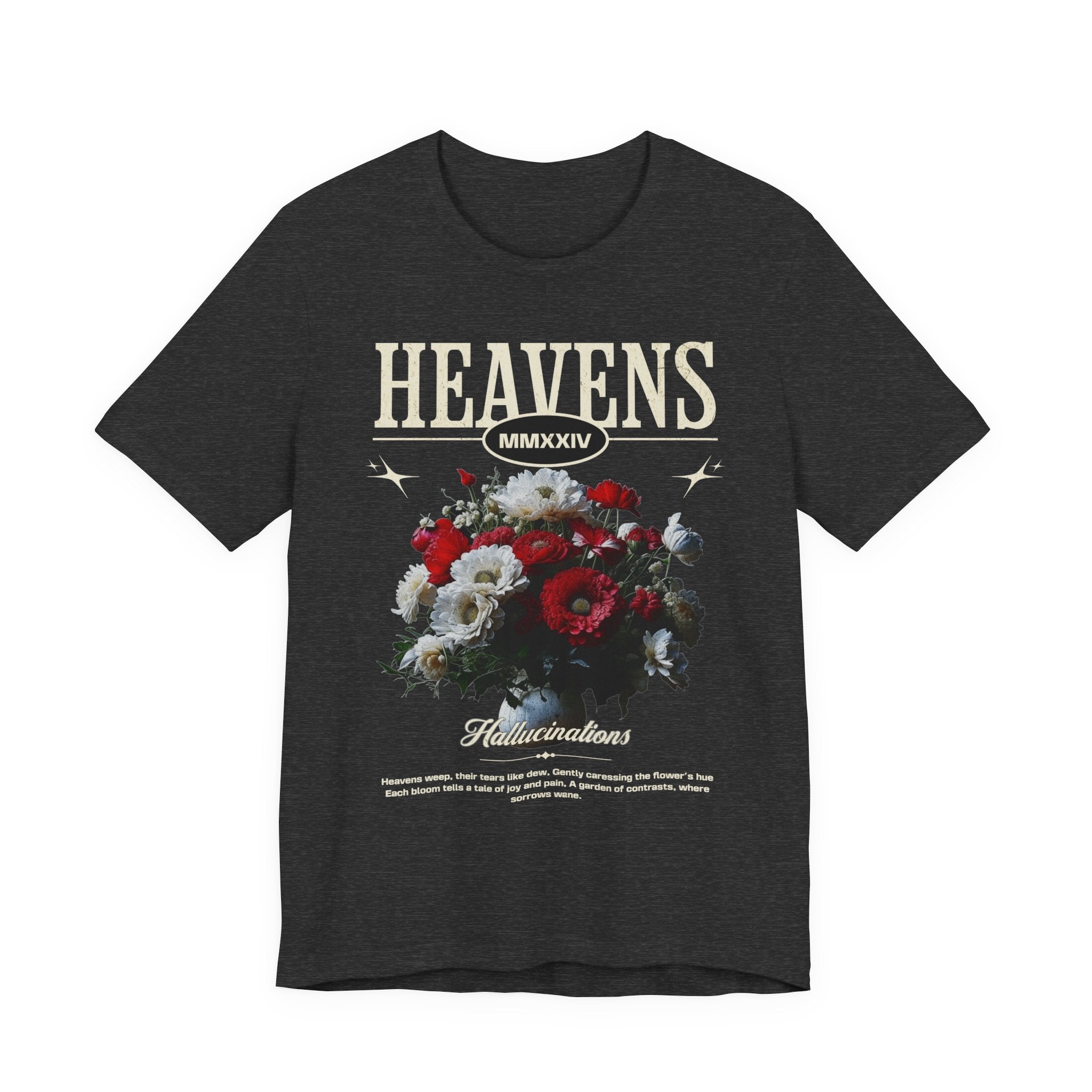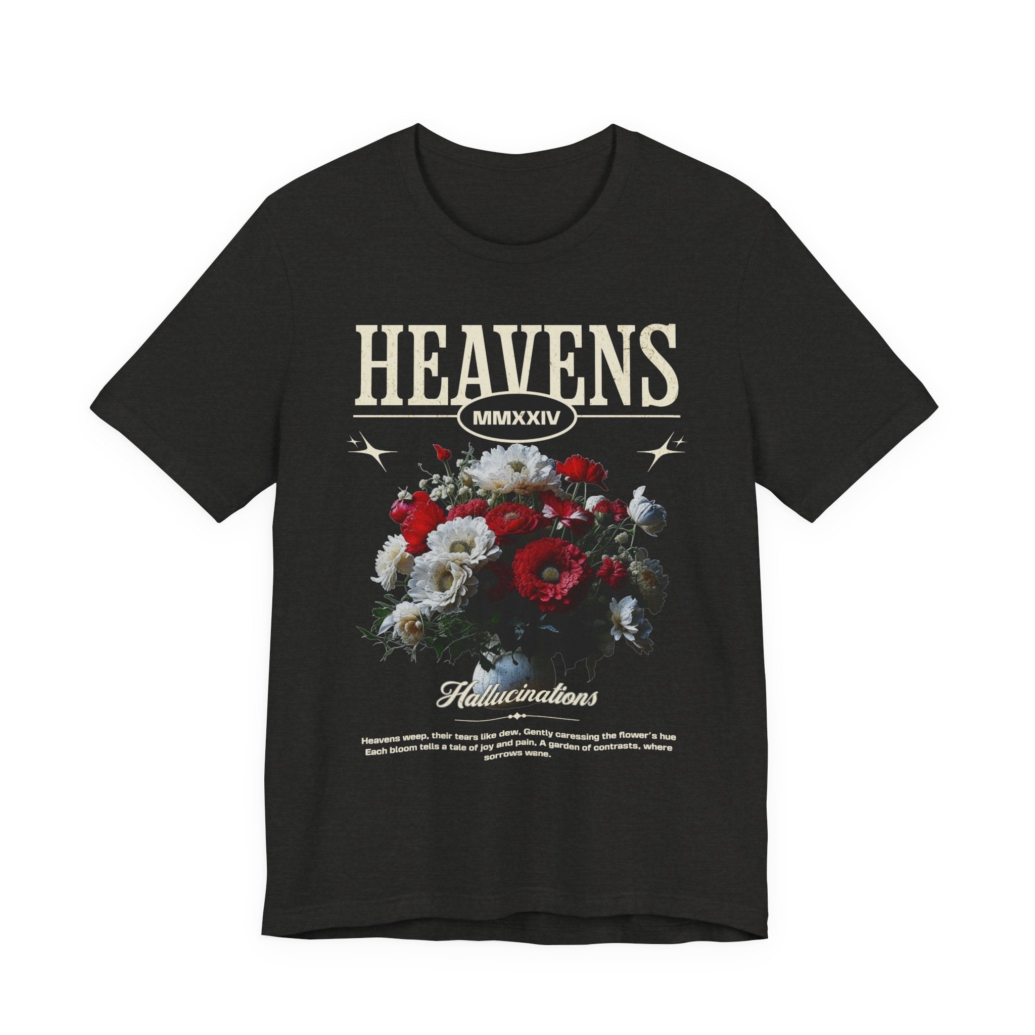 Step into a world of contrasts with the Heavens Hallucinations Unisex Jersey Short Sleeve Tee, a design where beauty and sorrow meet. Featuring an artistic bouquet of red, white, and soft-toned florals beneath the bold “Heavens” typography, this tee tells a story of emotions—joy, grief, and hope intertwined. It’s not just a shirt, but a piece of wearable art that carries meaning.