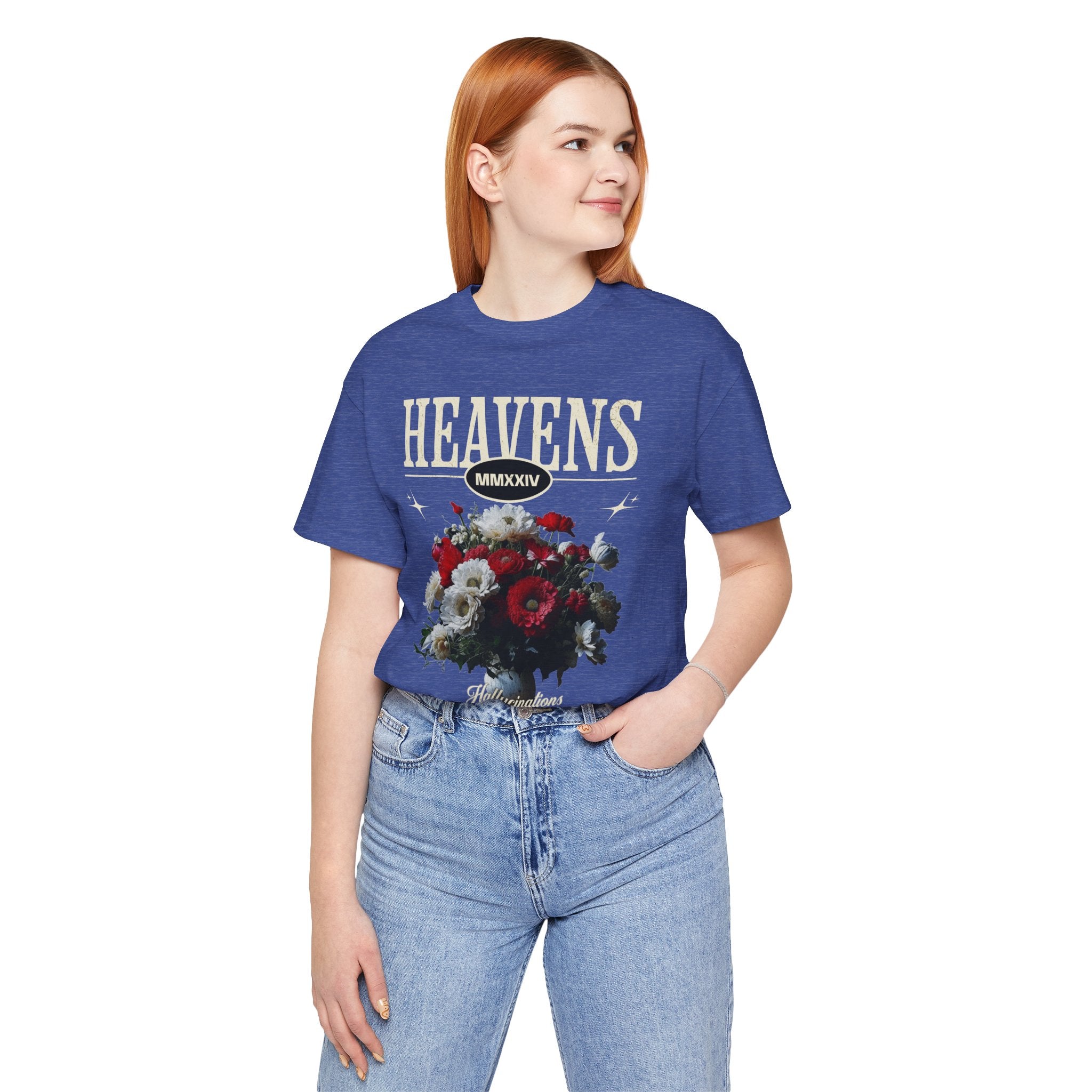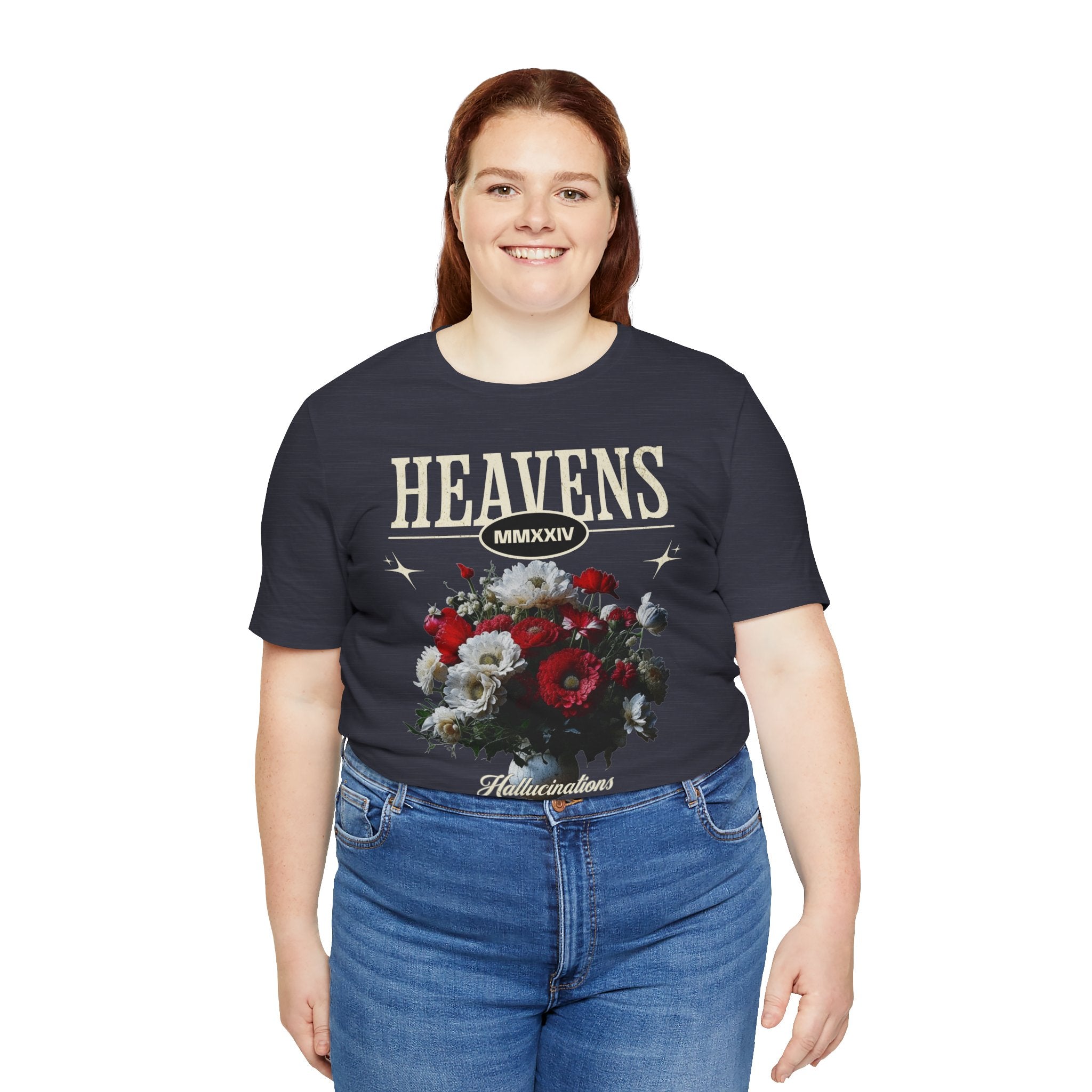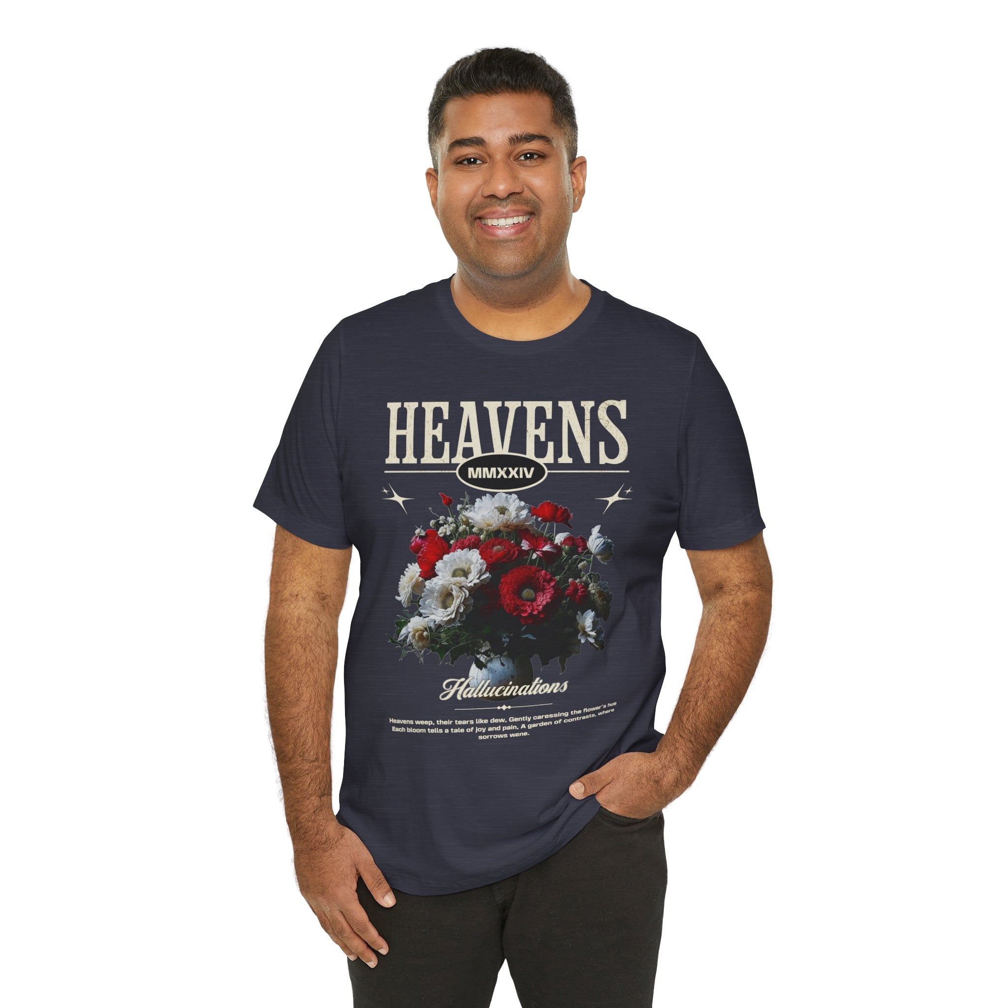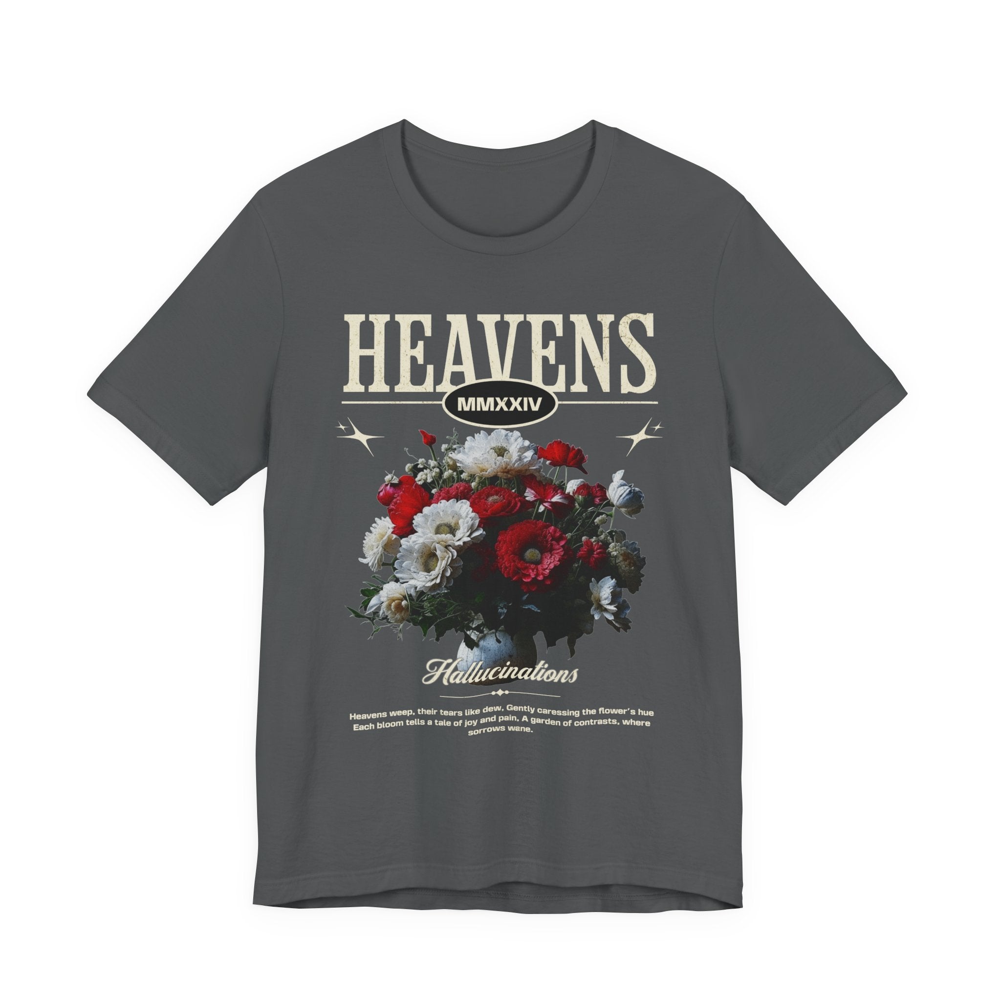 Step into a world of contrasts with the Heavens Hallucinations Unisex Jersey Short Sleeve Tee, a design where beauty and sorrow meet. Featuring an artistic bouquet of red, white, and soft-toned florals beneath the bold “Heavens” typography, this tee tells a story of emotions—joy, grief, and hope intertwined. It’s not just a shirt, but a piece of wearable art that carries meaning.