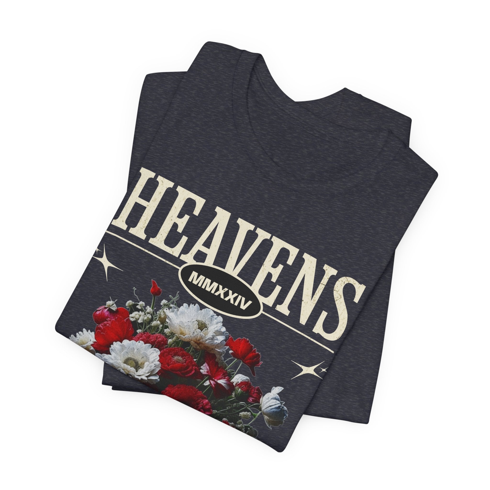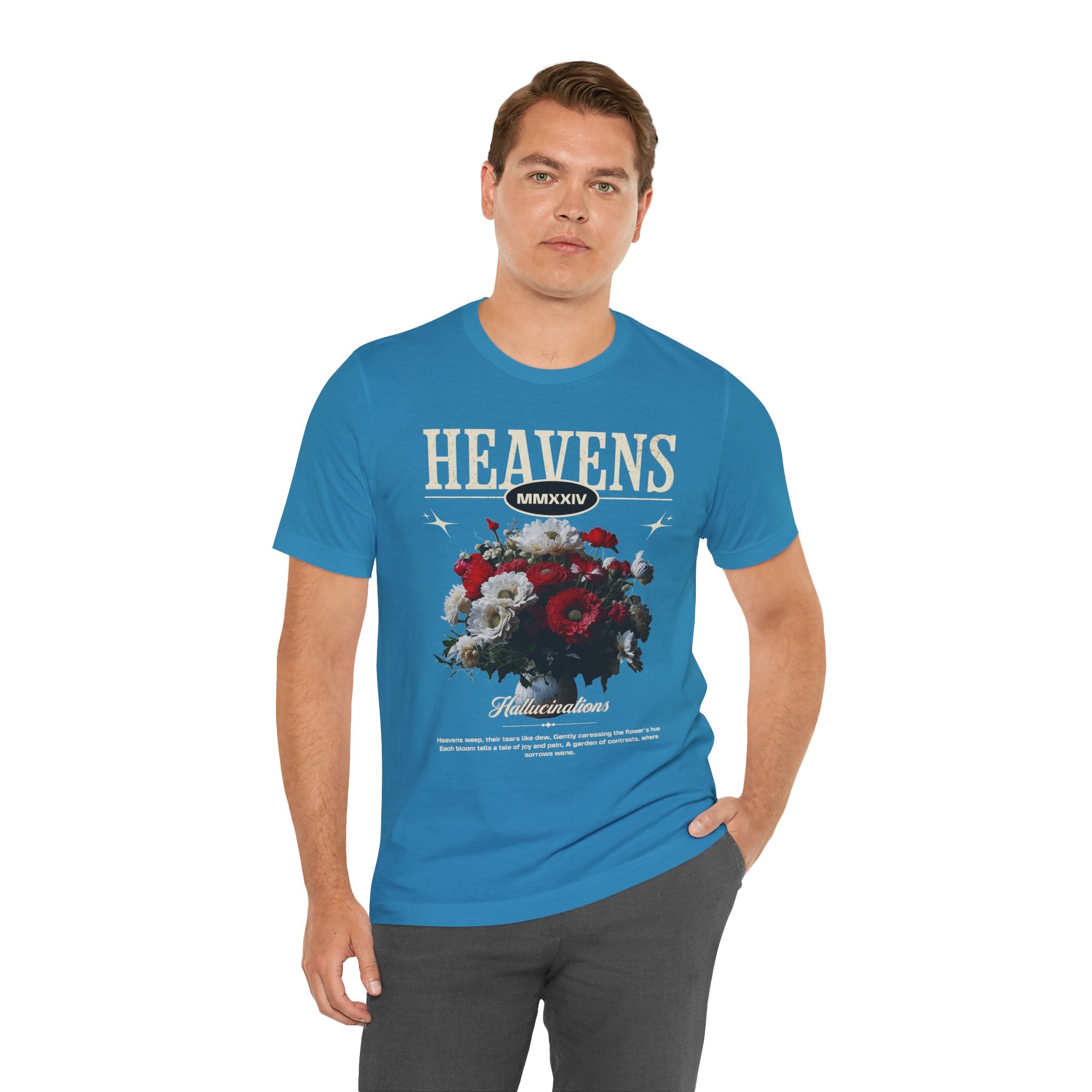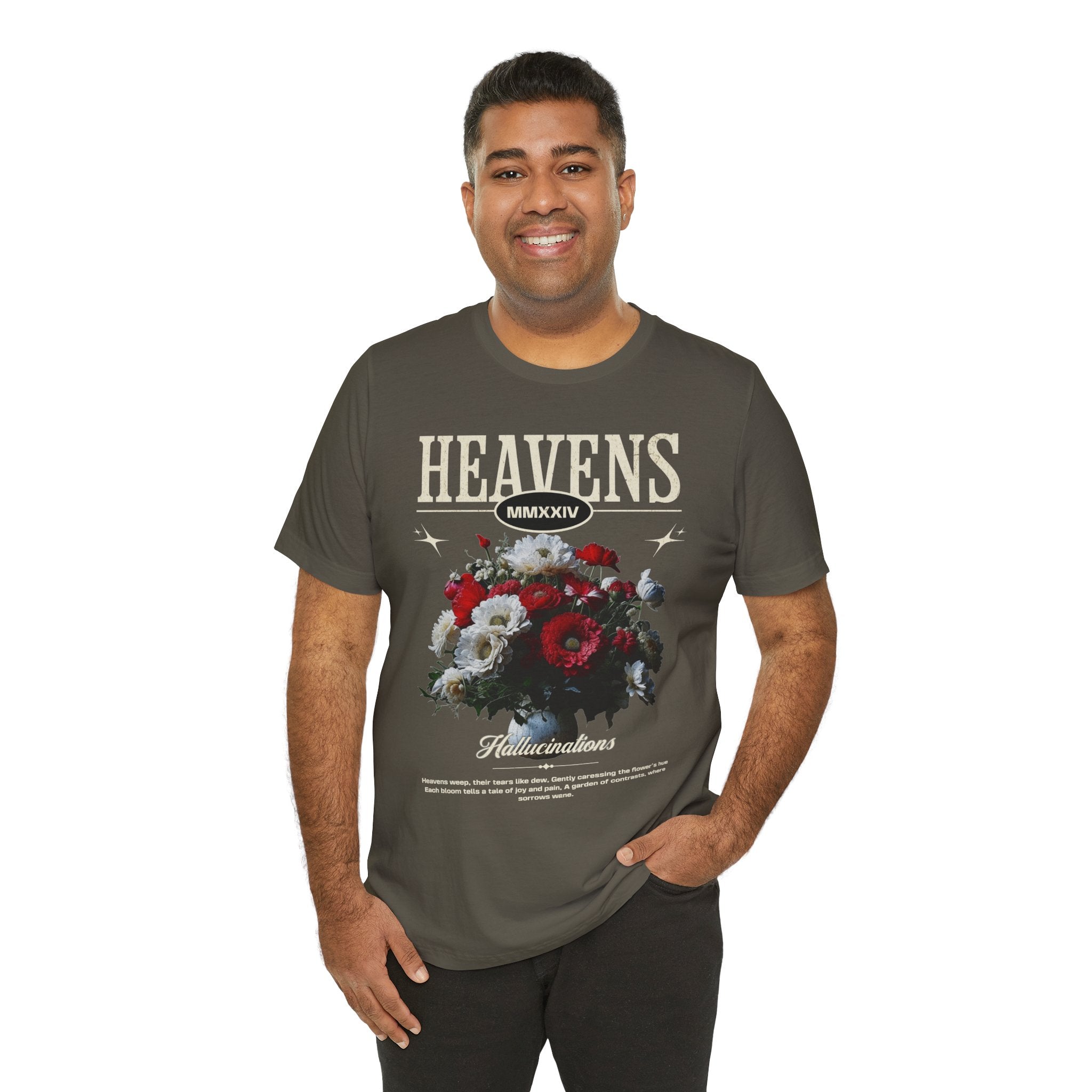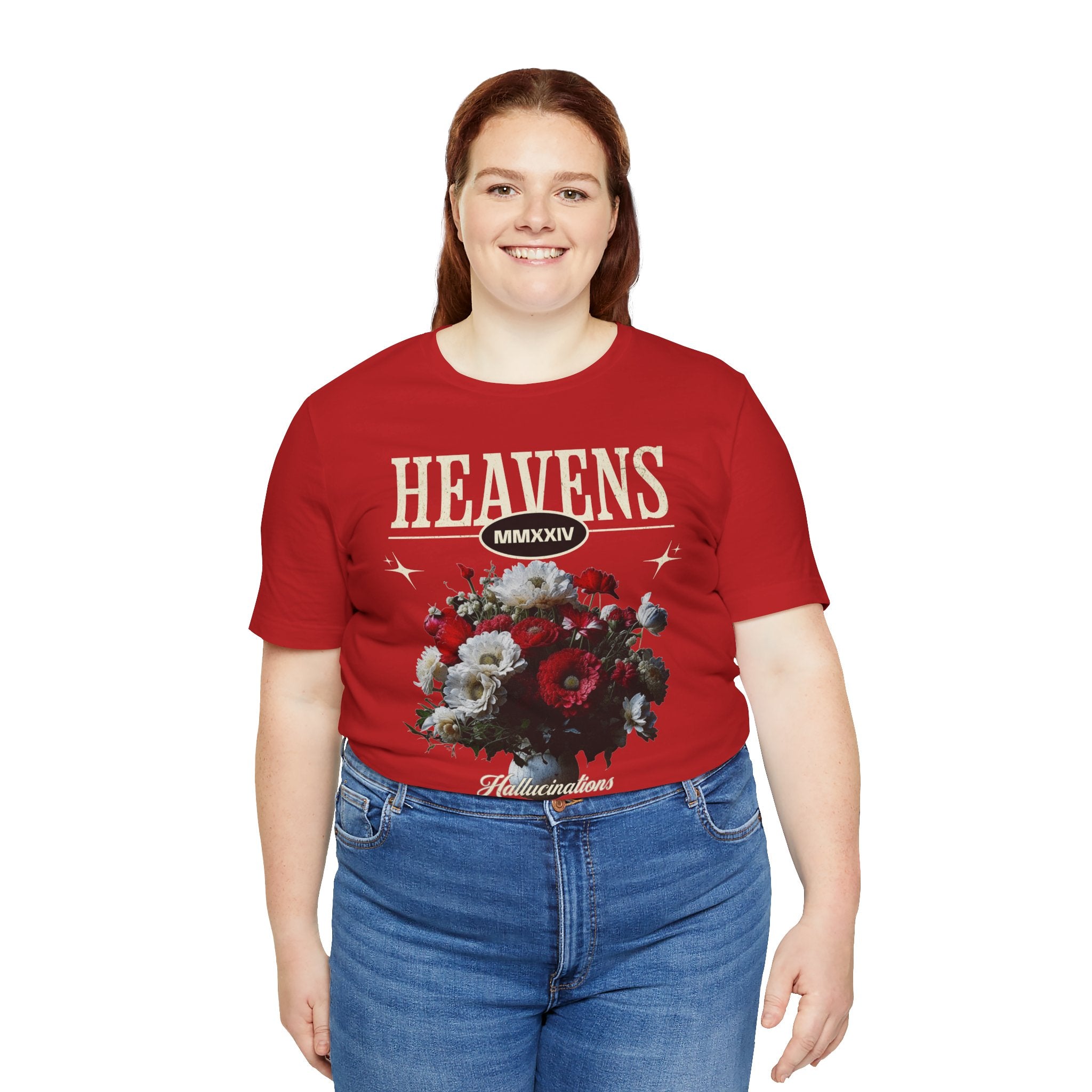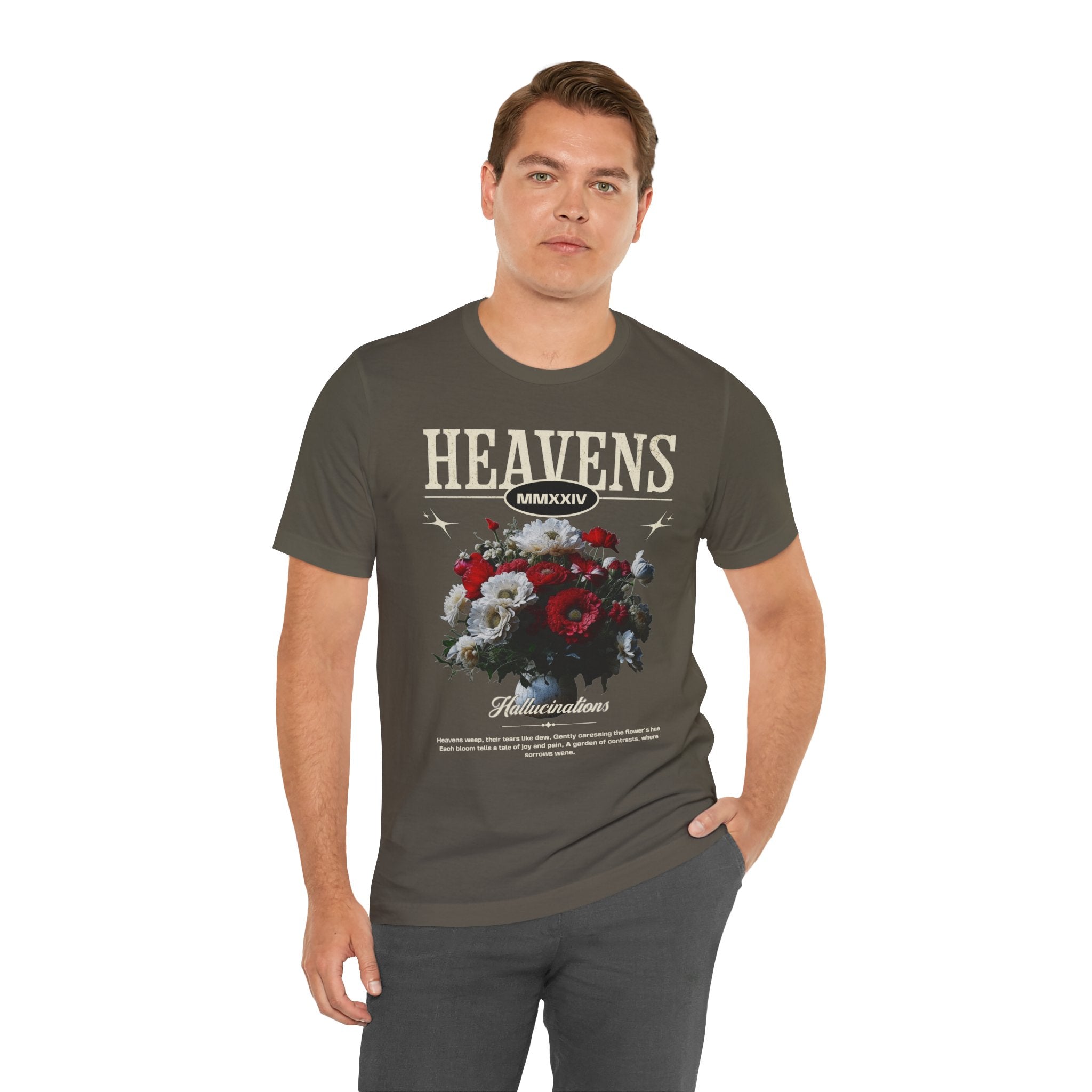 Step into a world of contrasts with the Heavens Hallucinations Unisex Jersey Short Sleeve Tee, a design where beauty and sorrow meet. Featuring an artistic bouquet of red, white, and soft-toned florals beneath the bold “Heavens” typography, this tee tells a story of emotions—joy, grief, and hope intertwined. It’s not just a shirt, but a piece of wearable art that carries meaning.