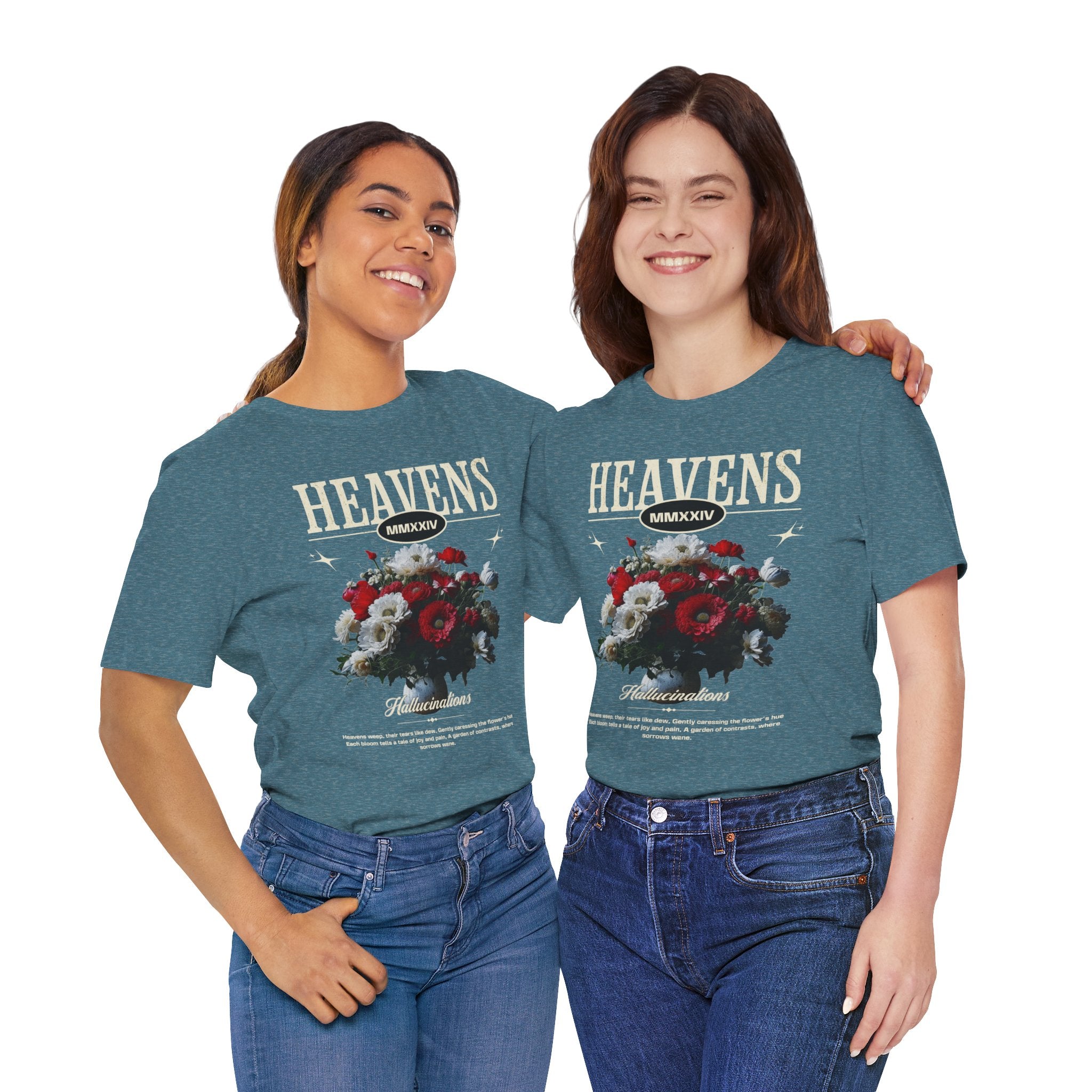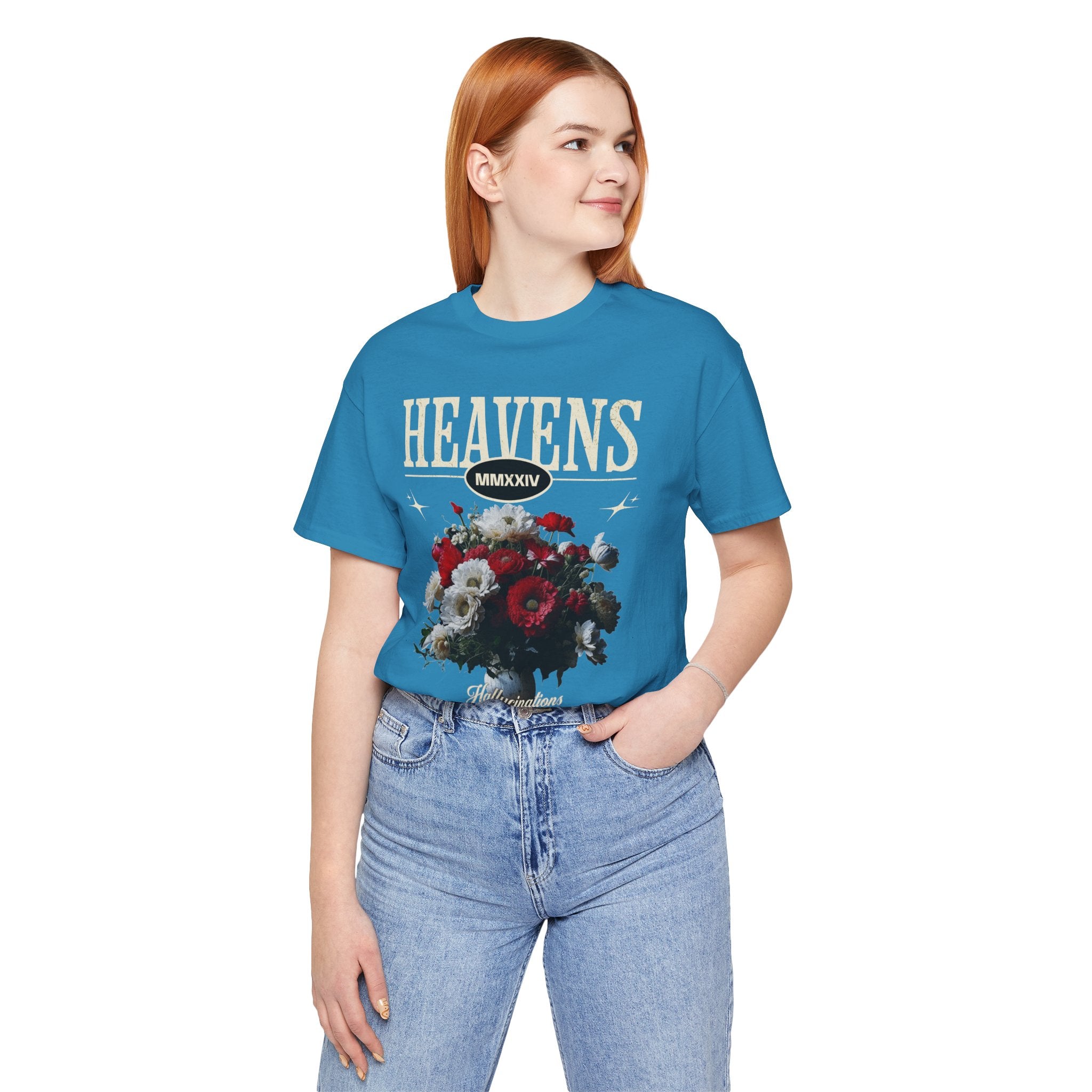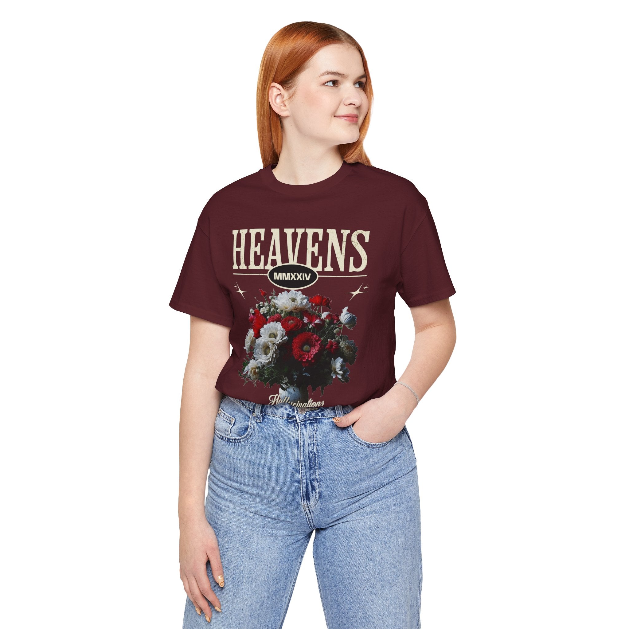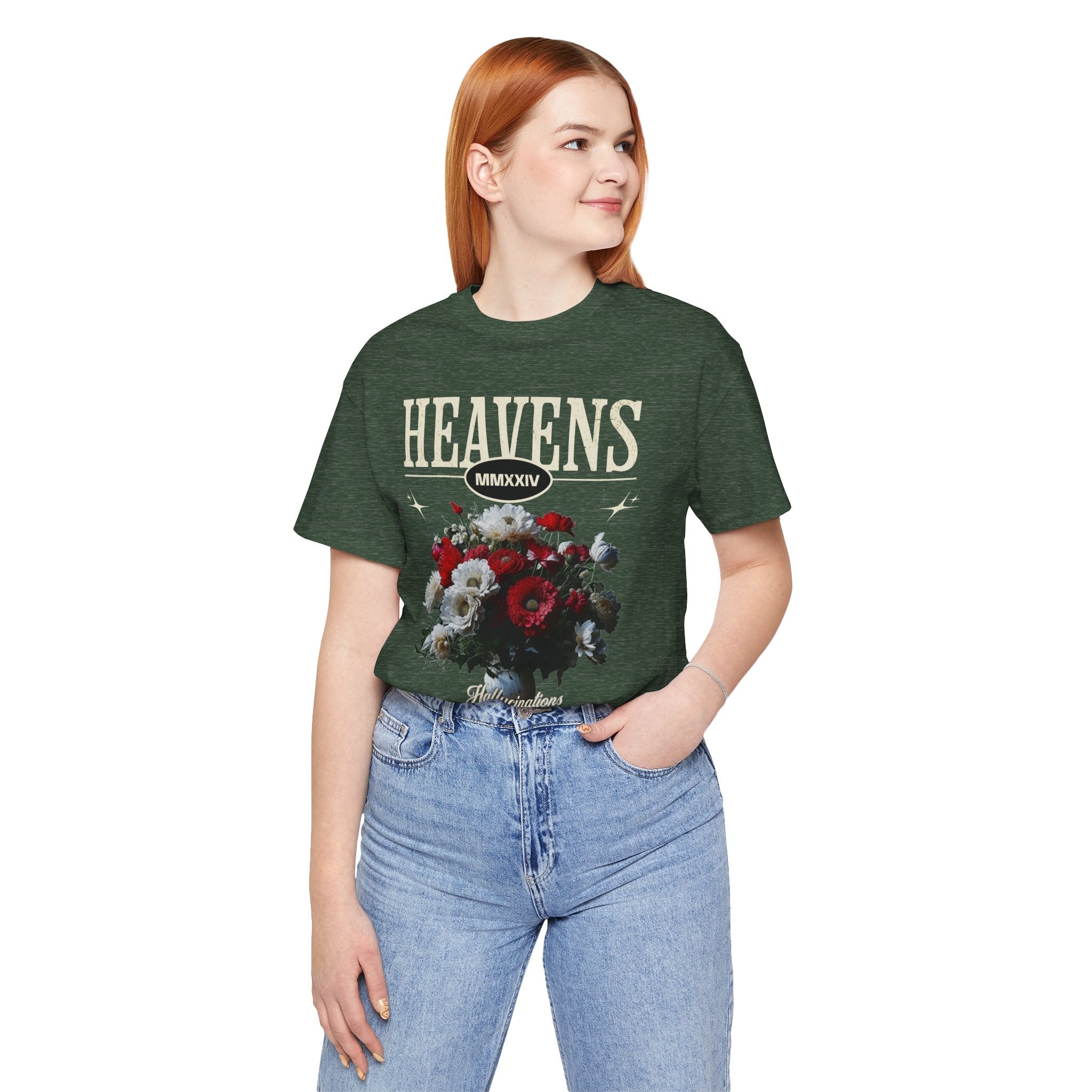 Step into a world of contrasts with the Heavens Hallucinations Unisex Jersey Short Sleeve Tee, a design where beauty and sorrow meet. Featuring an artistic bouquet of red, white, and soft-toned florals beneath the bold “Heavens” typography, this tee tells a story of emotions—joy, grief, and hope intertwined. It’s not just a shirt, but a piece of wearable art that carries meaning.