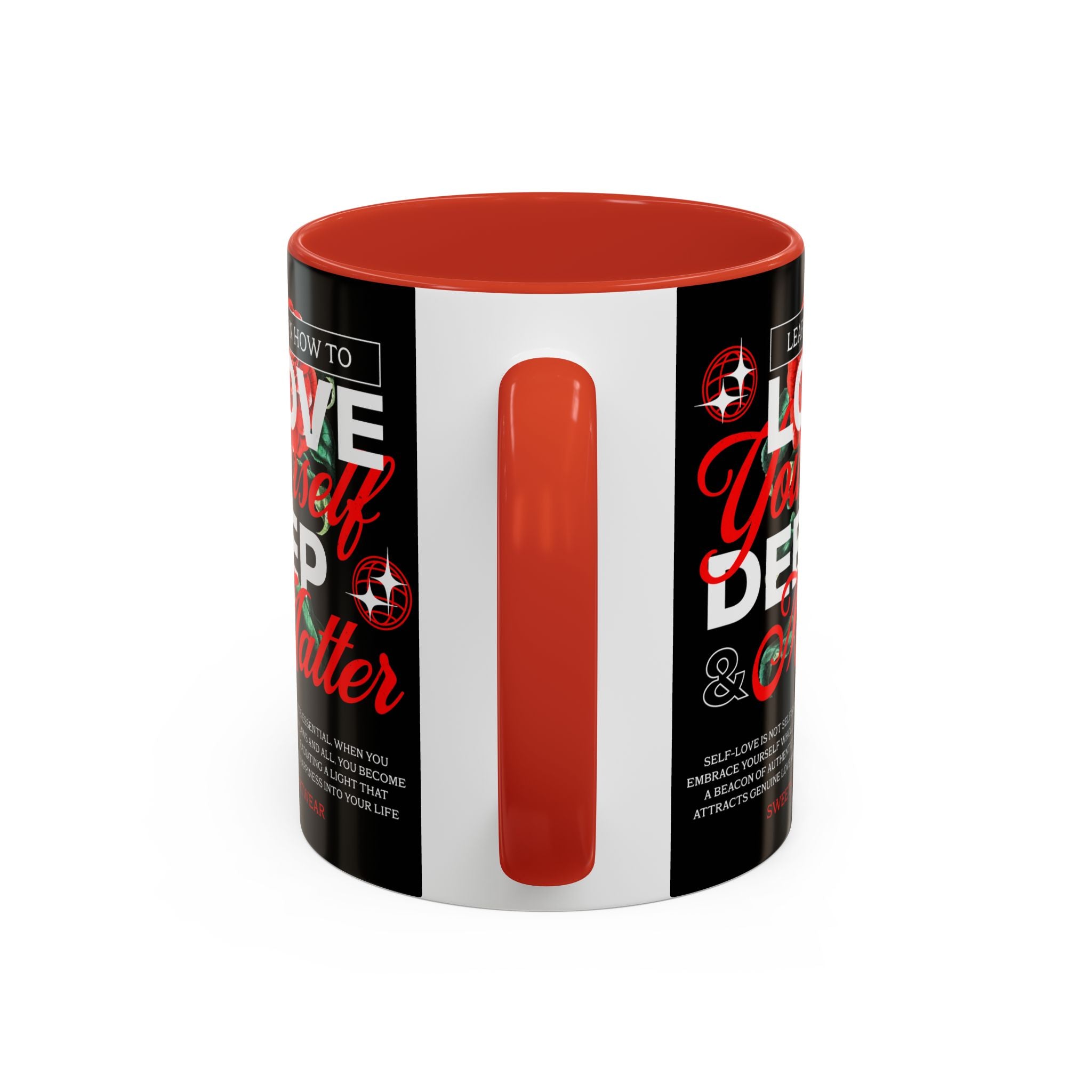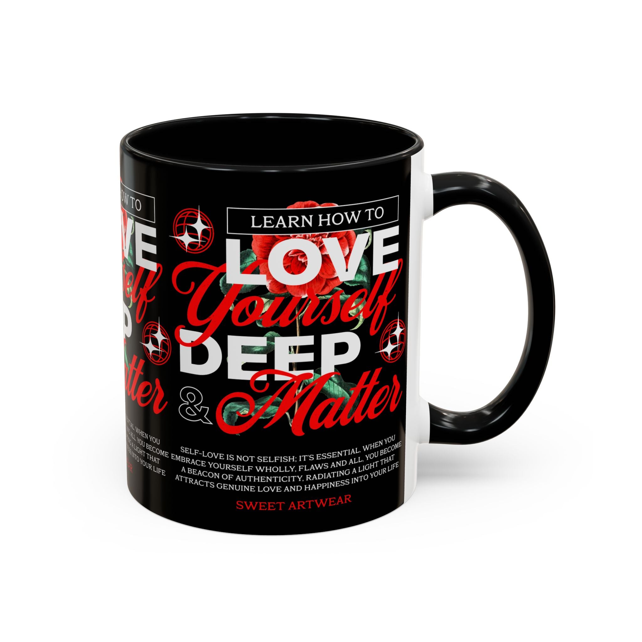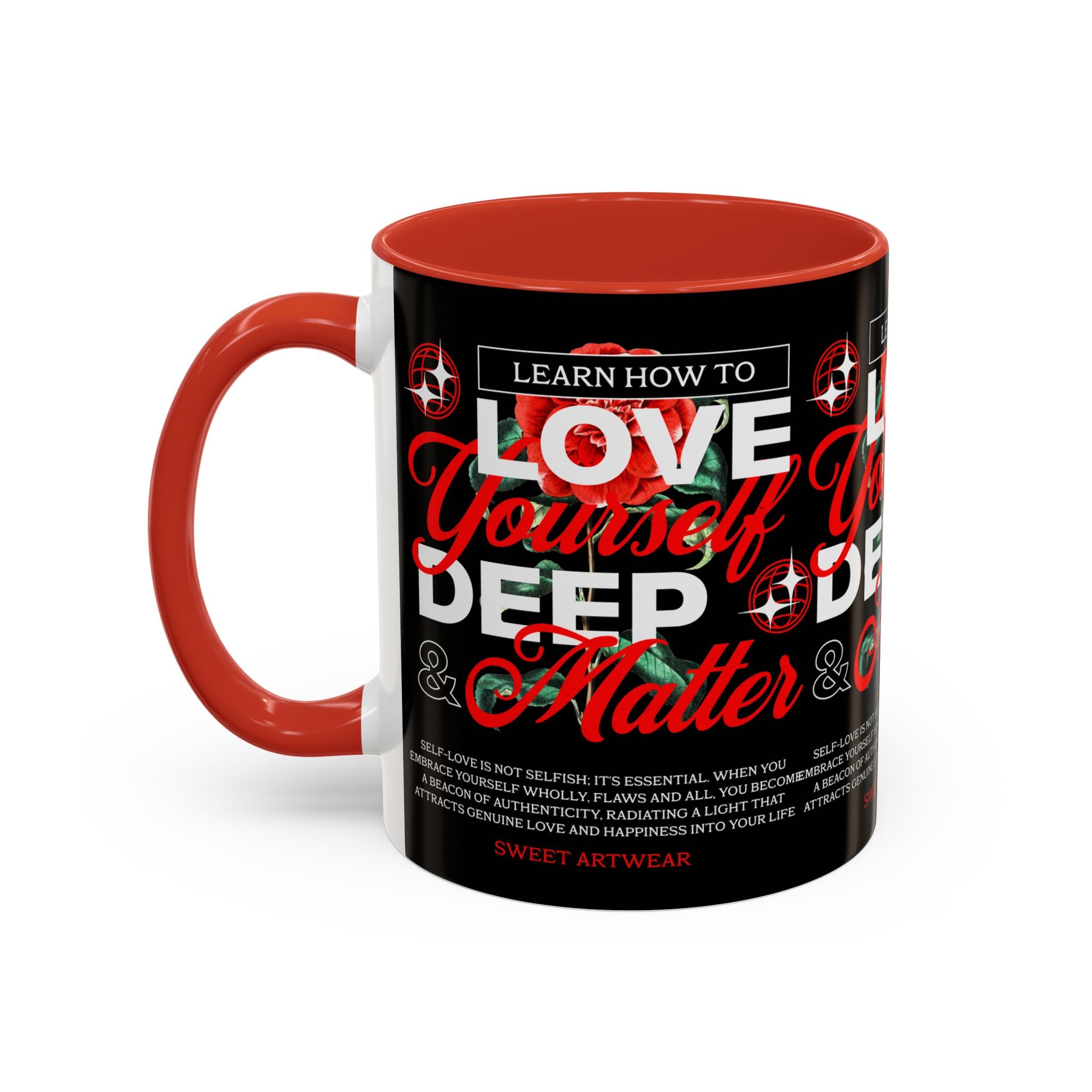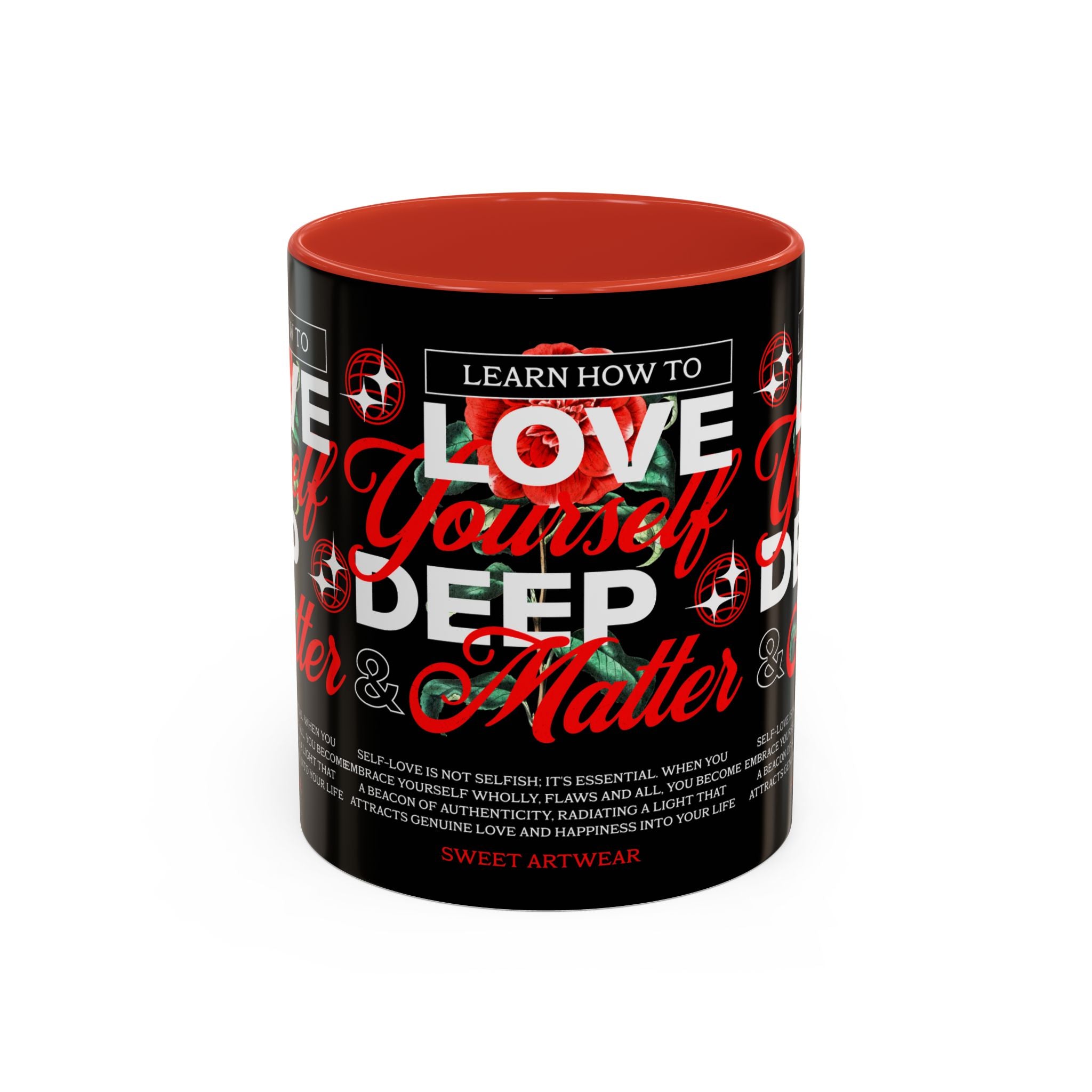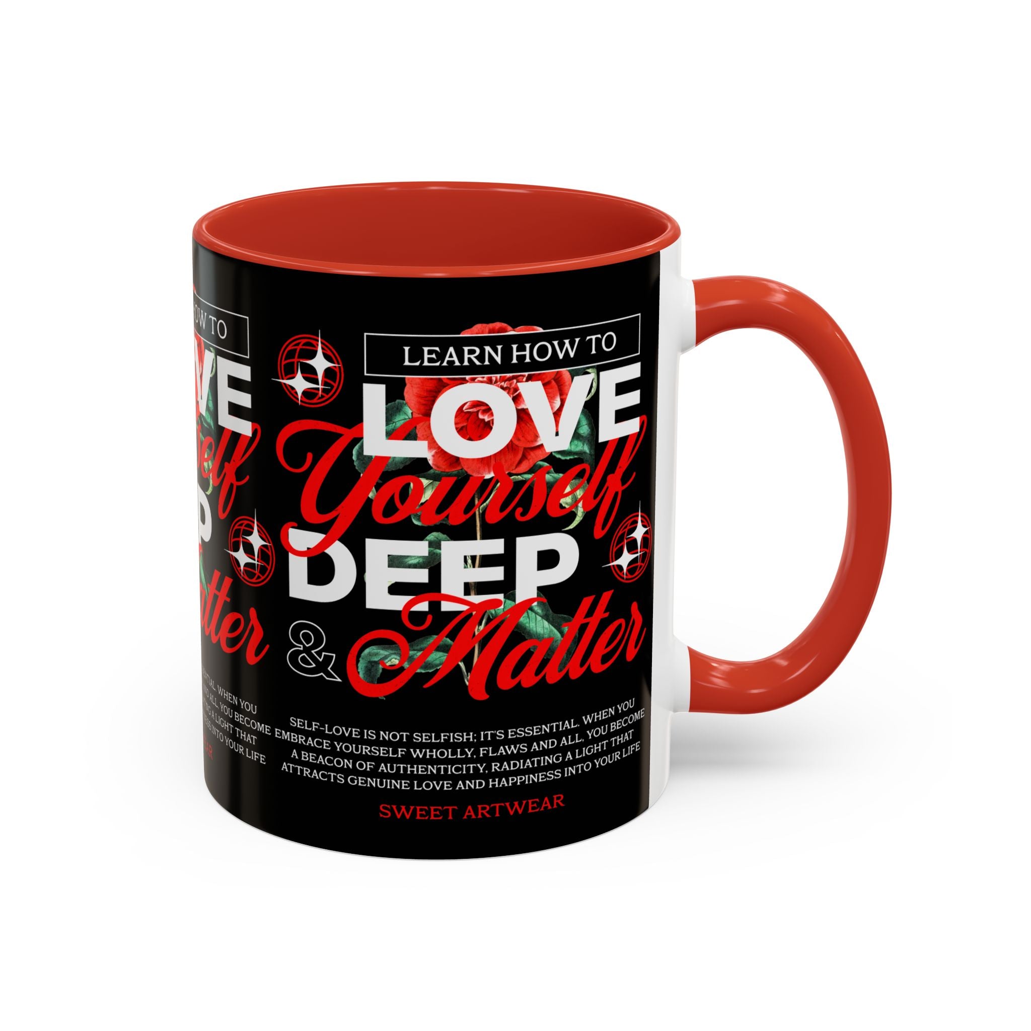 The Love Yourself Deep Accent Coffee Mug is more than just a mug β itβs a daily ritual of positivity and empowerment. Featuring bold typography, a striking red rose design, and motivational words, this mug inspires you to embrace confidence and self-love with every sip.