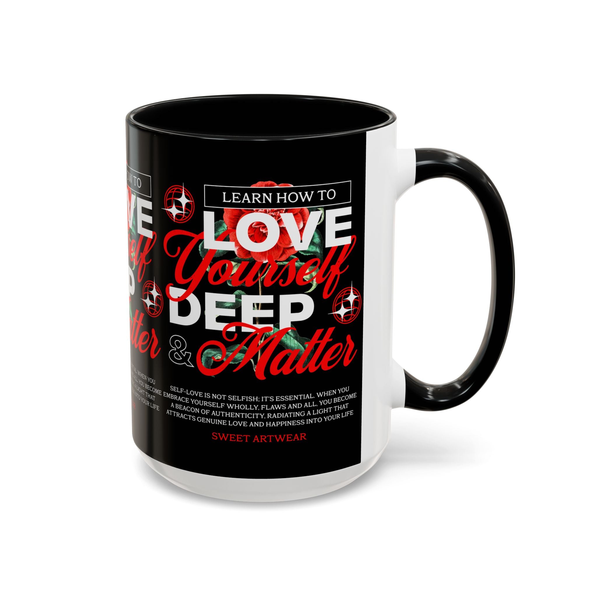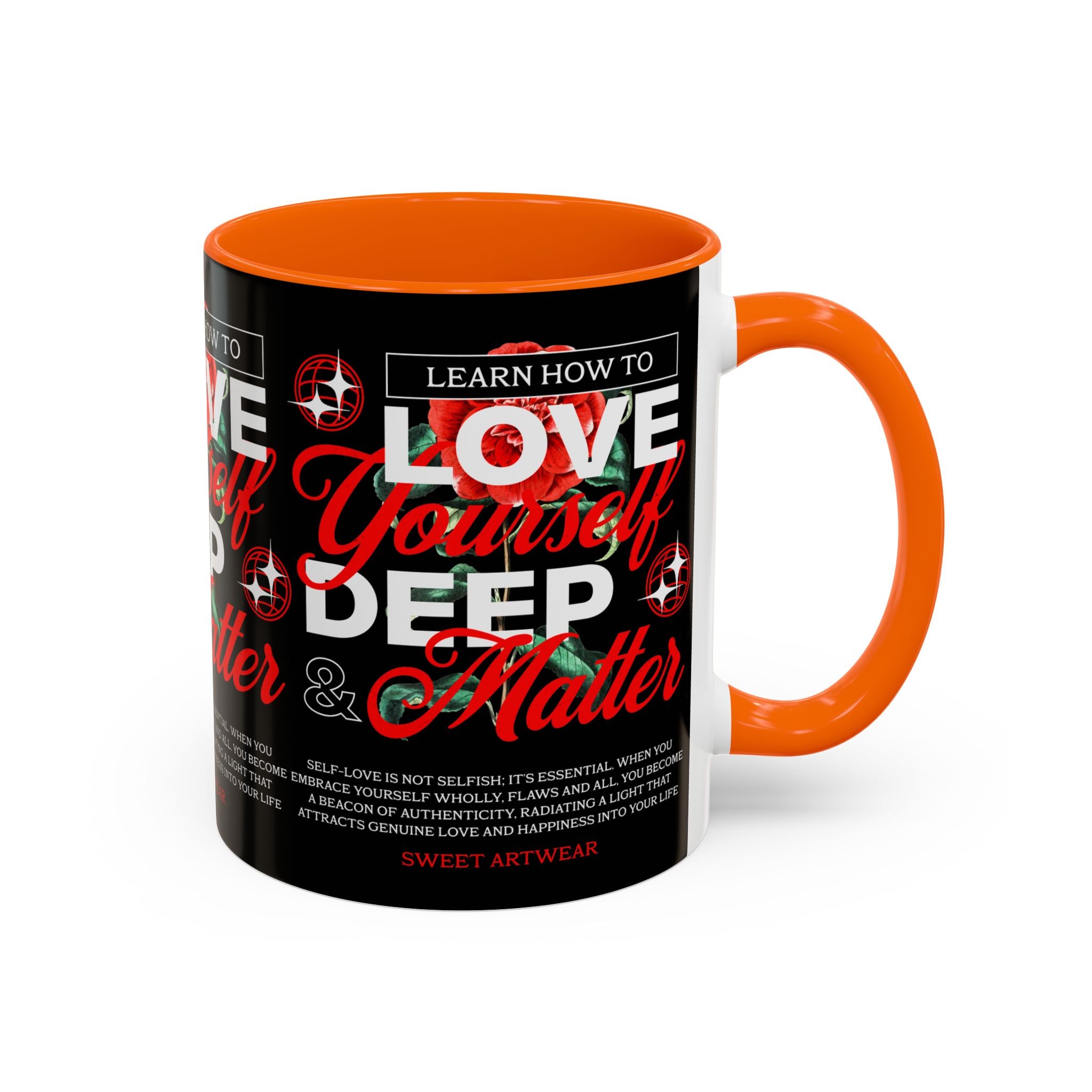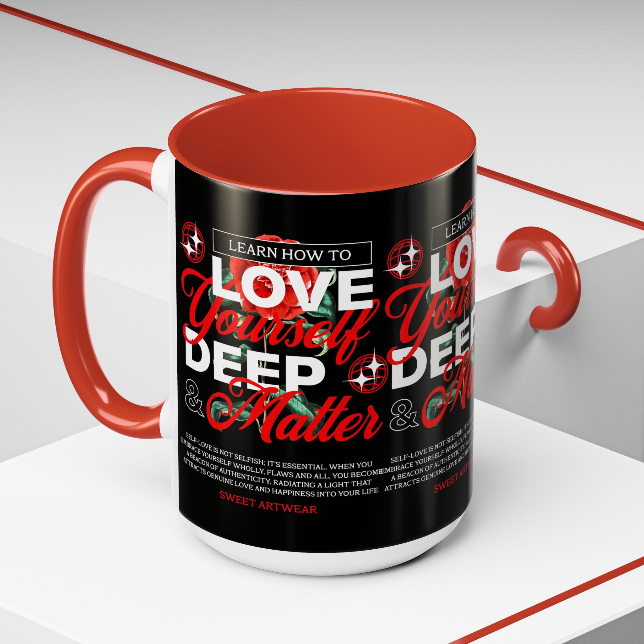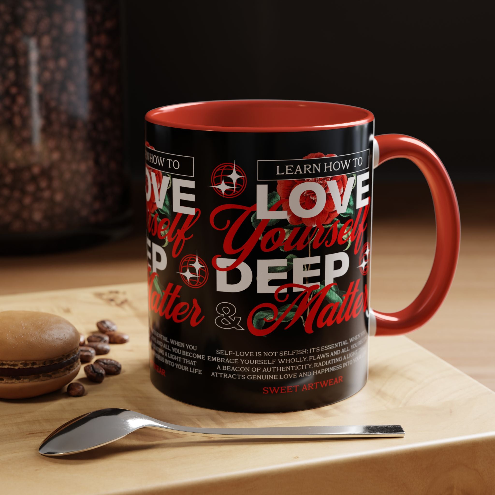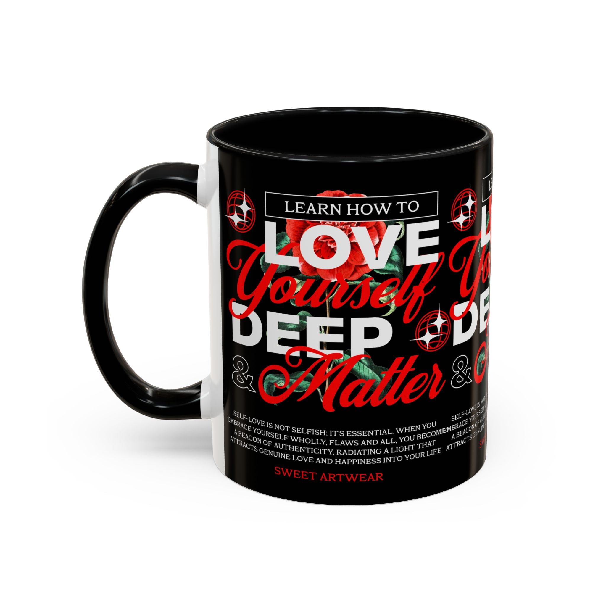 The Love Yourself Deep Accent Coffee Mug is more than just a mug β itβs a daily ritual of positivity and empowerment. Featuring bold typography, a striking red rose design, and motivational words, this mug inspires you to embrace confidence and self-love with every sip.