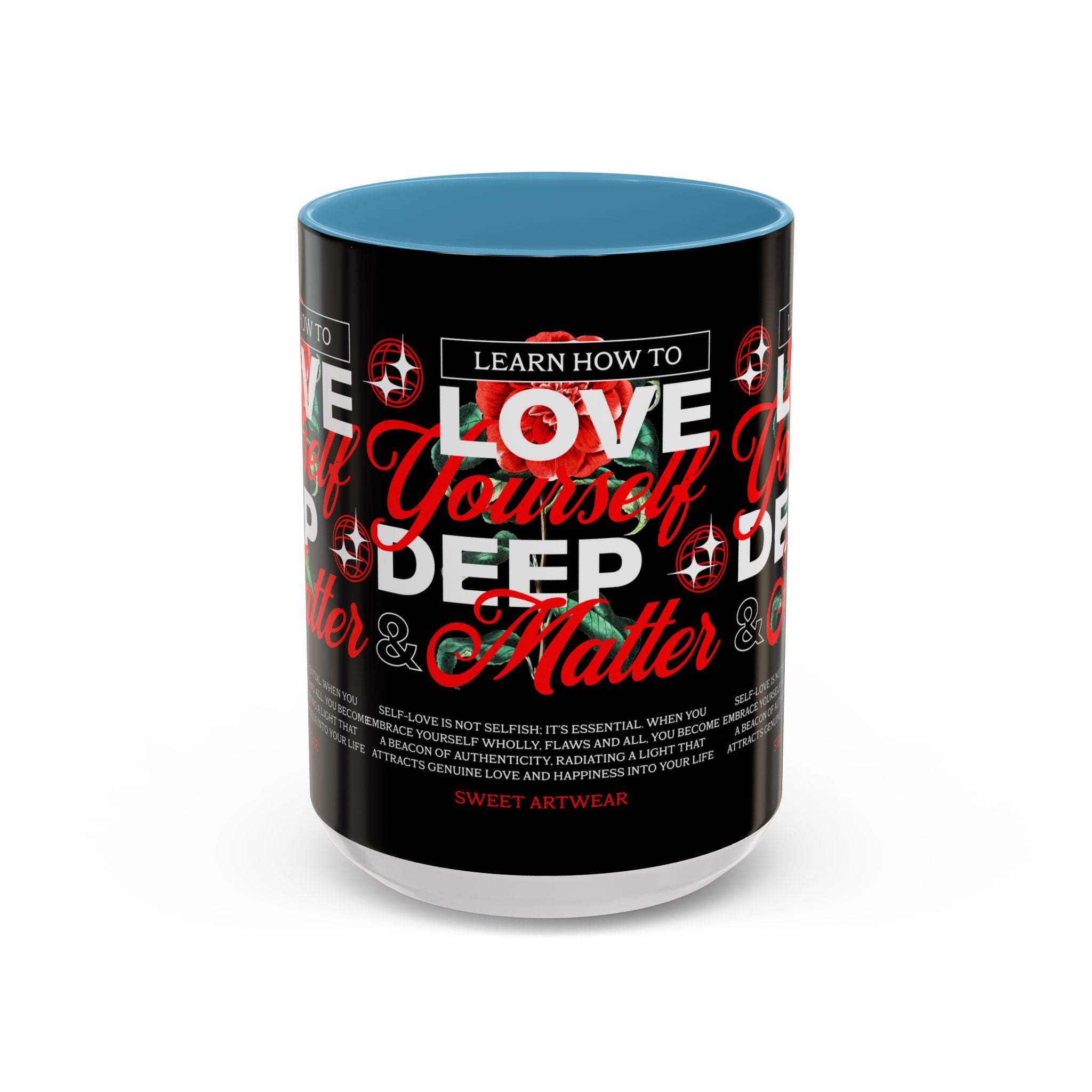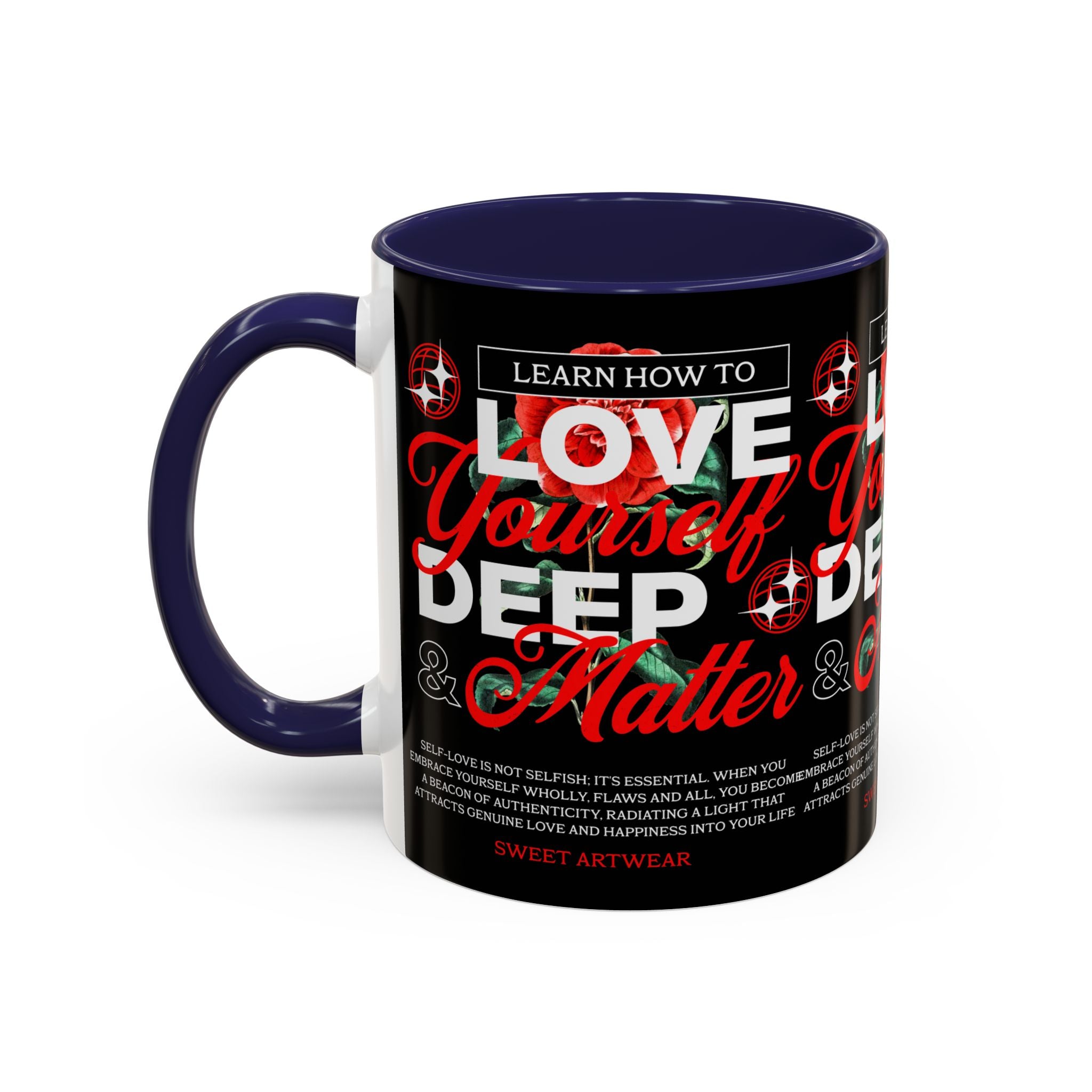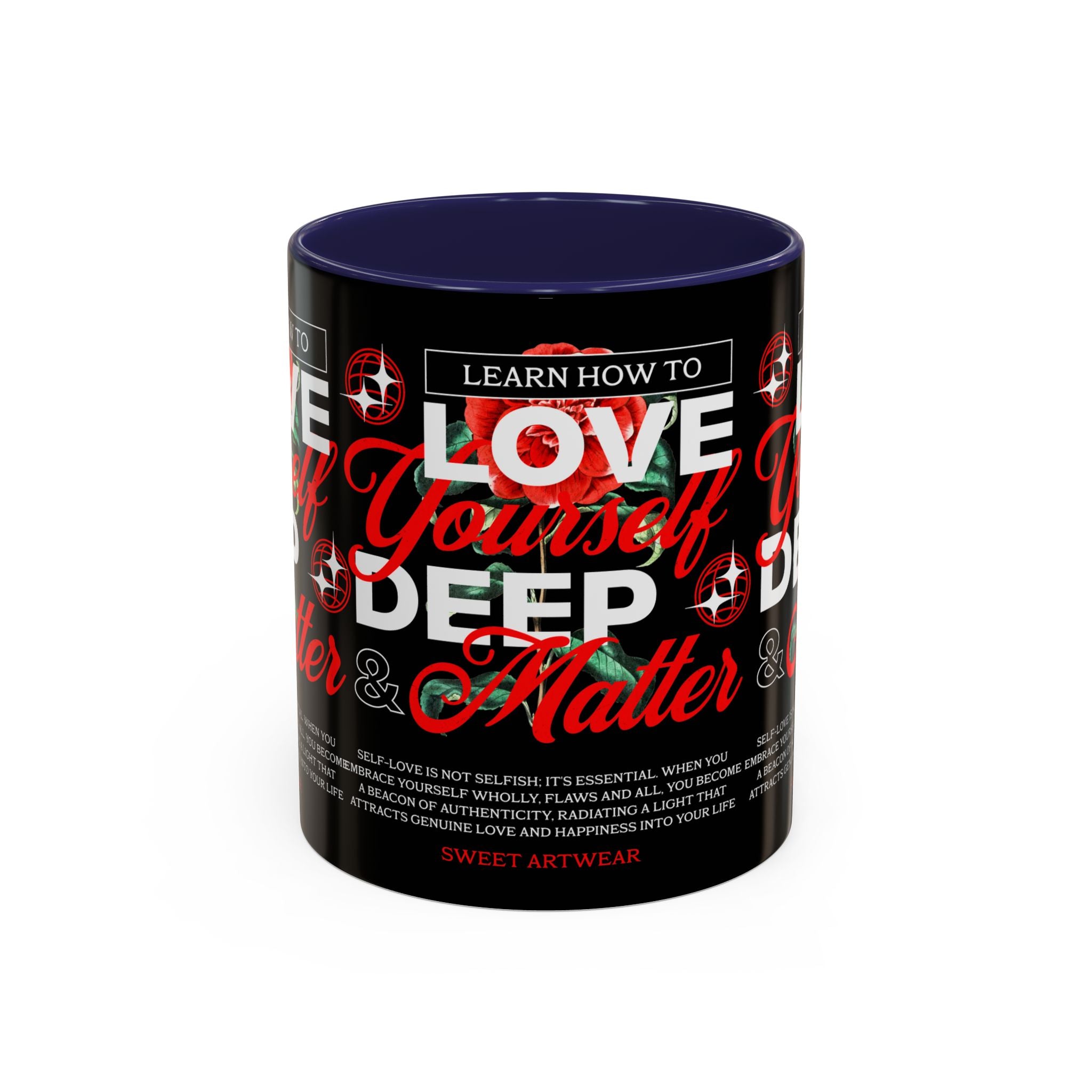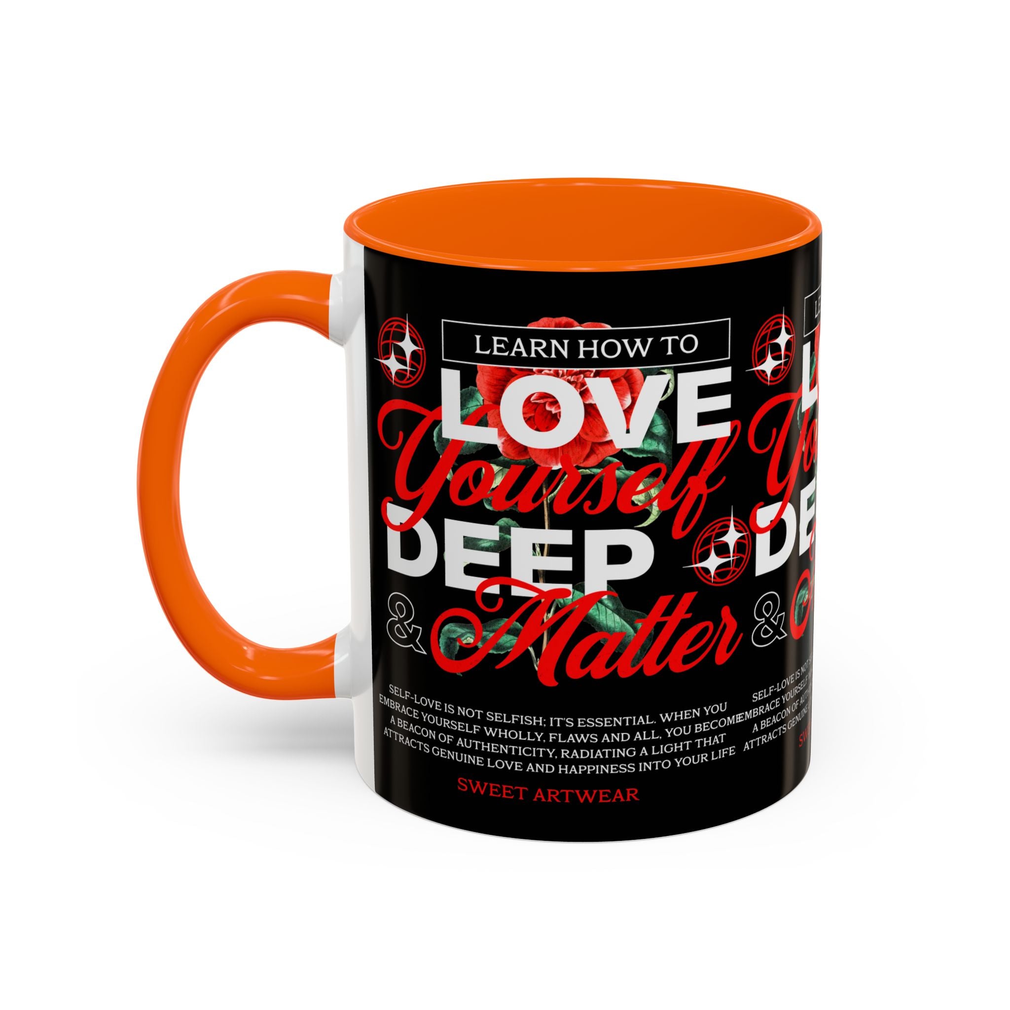 The Love Yourself Deep Accent Coffee Mug is more than just a mug β itβs a daily ritual of positivity and empowerment. Featuring bold typography, a striking red rose design, and motivational words, this mug inspires you to embrace confidence and self-love with every sip.