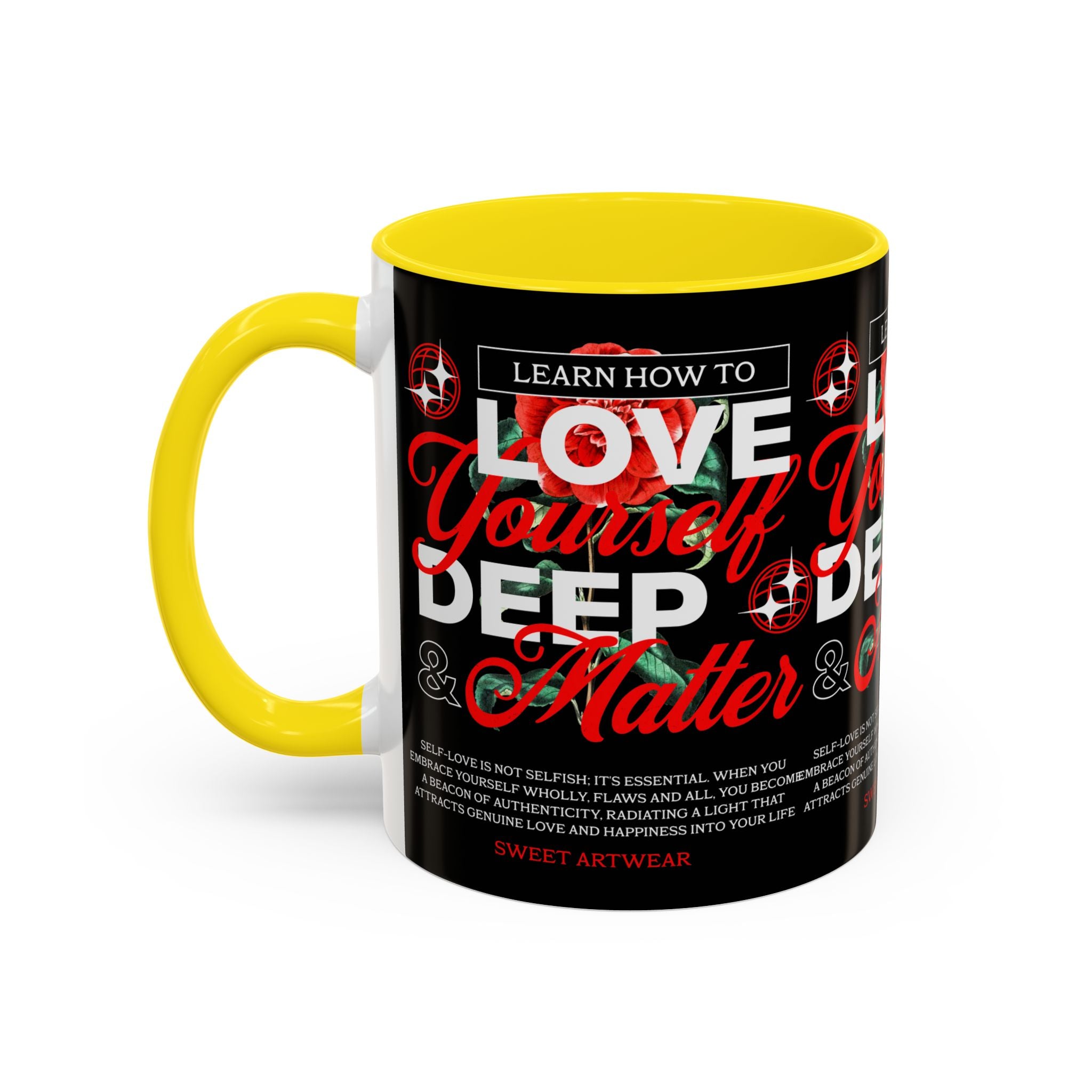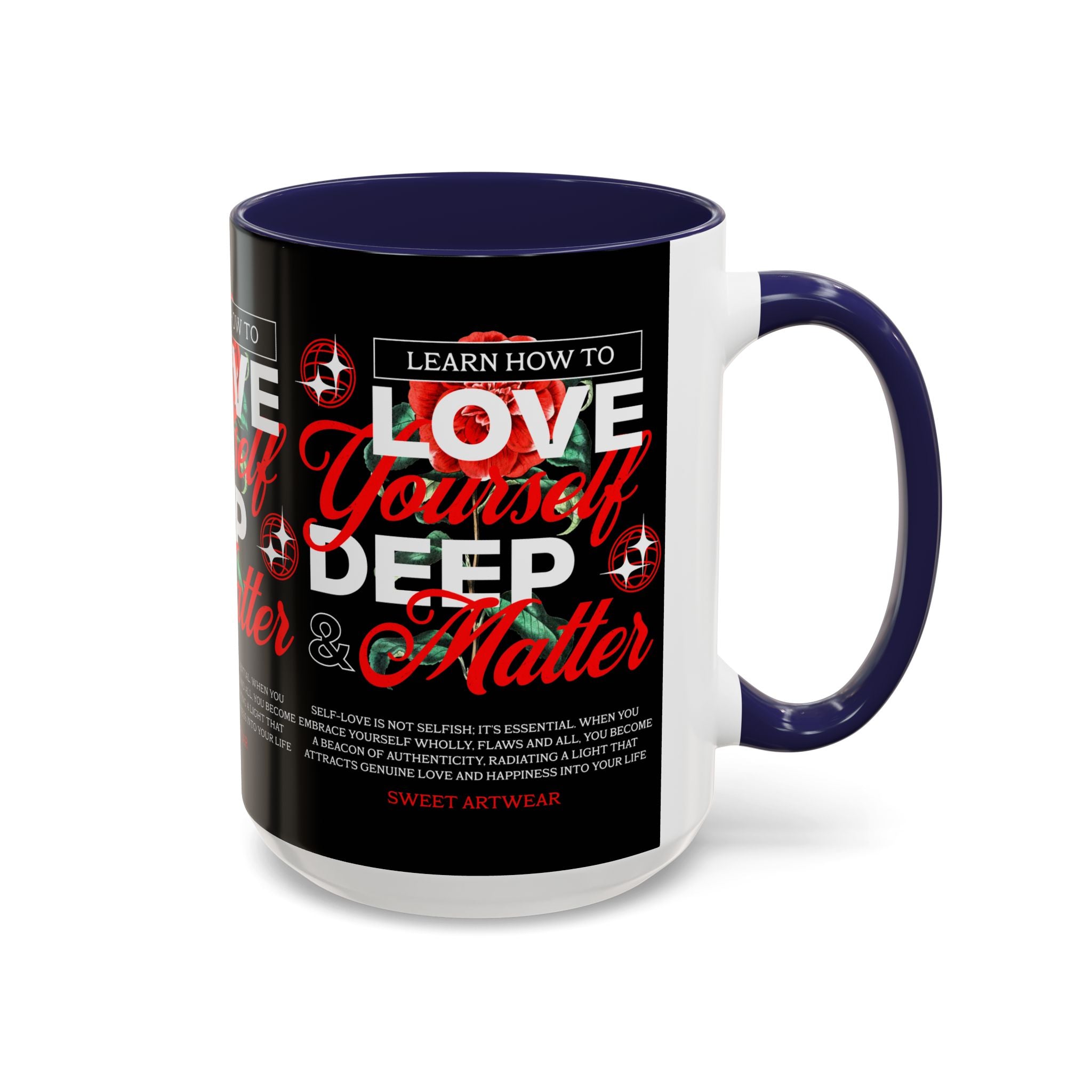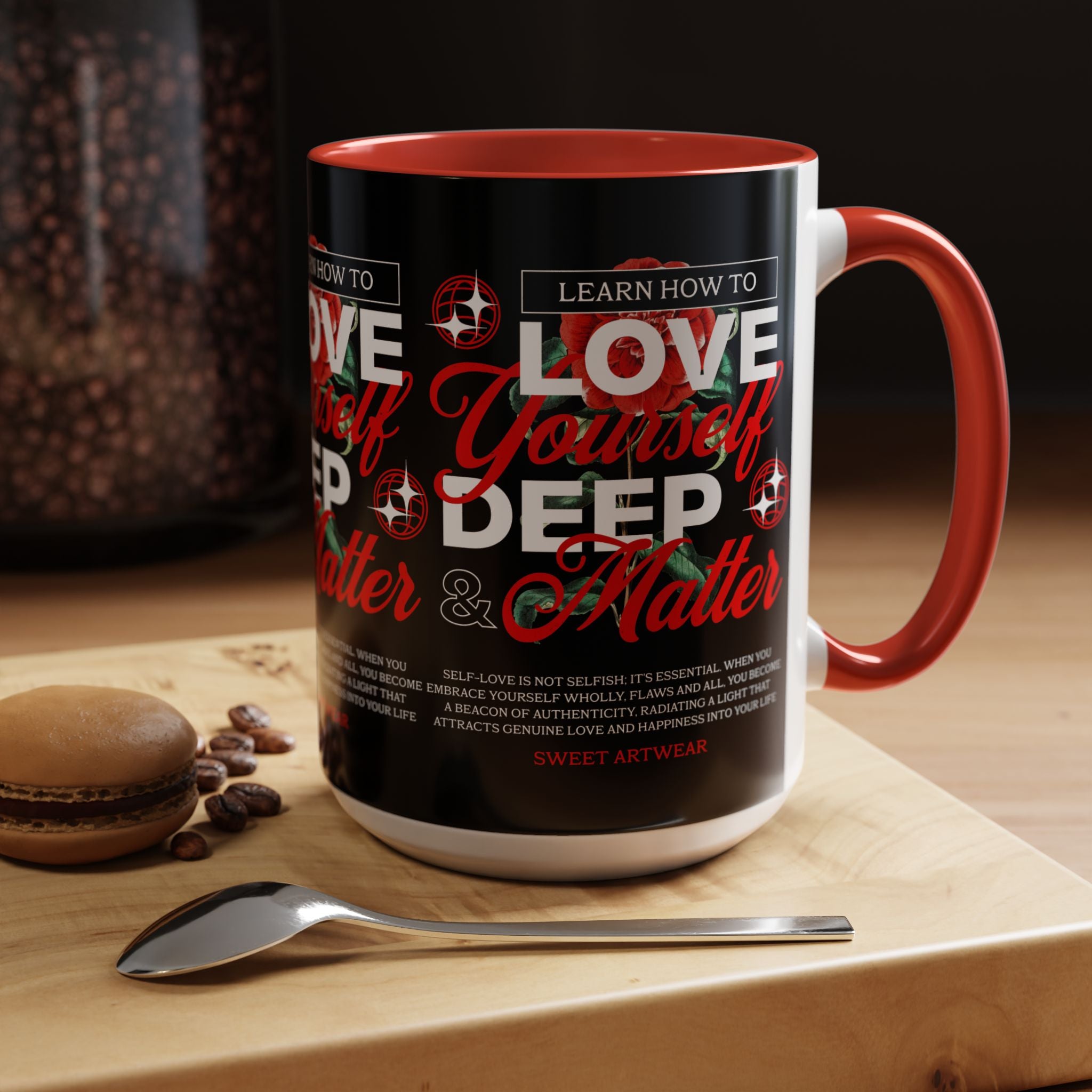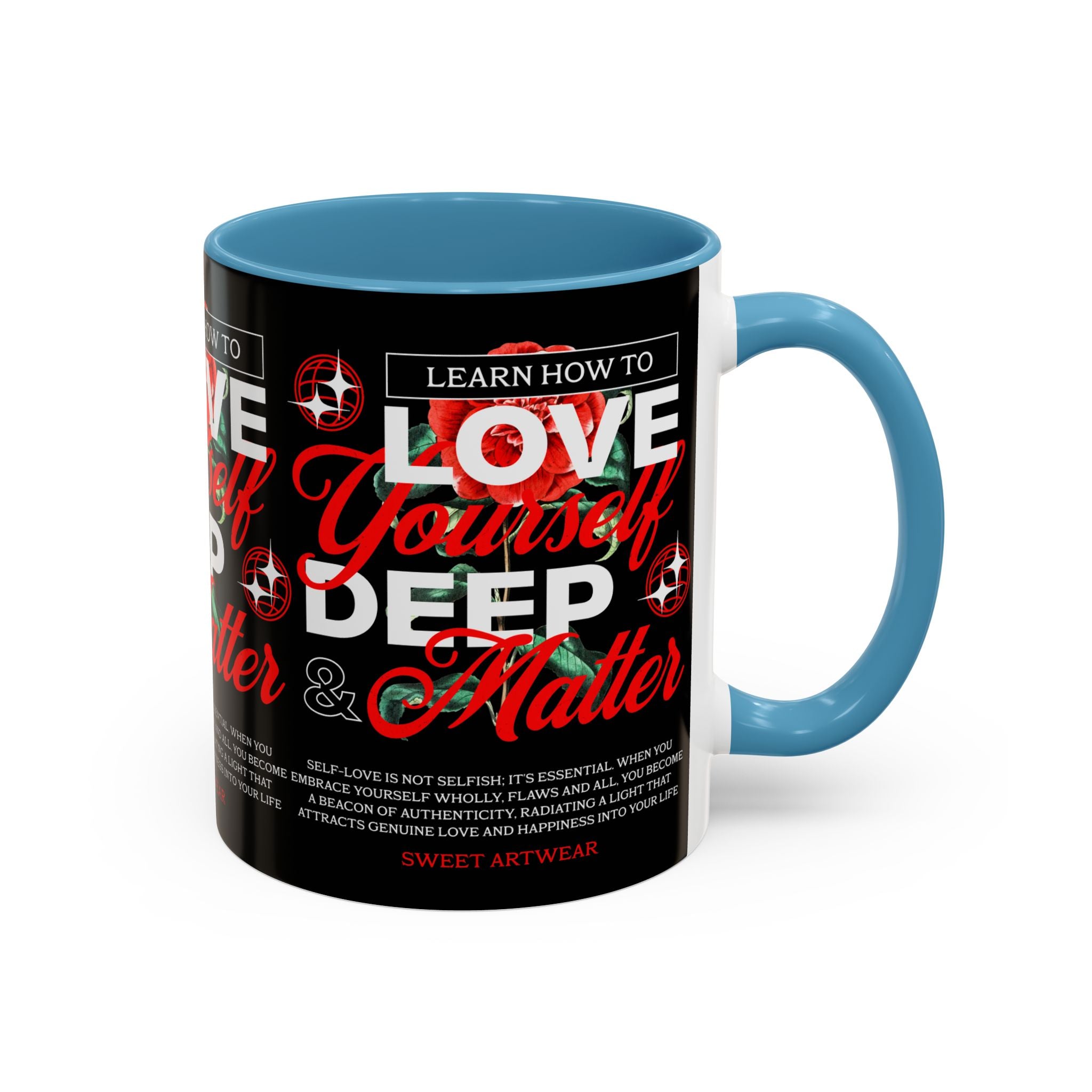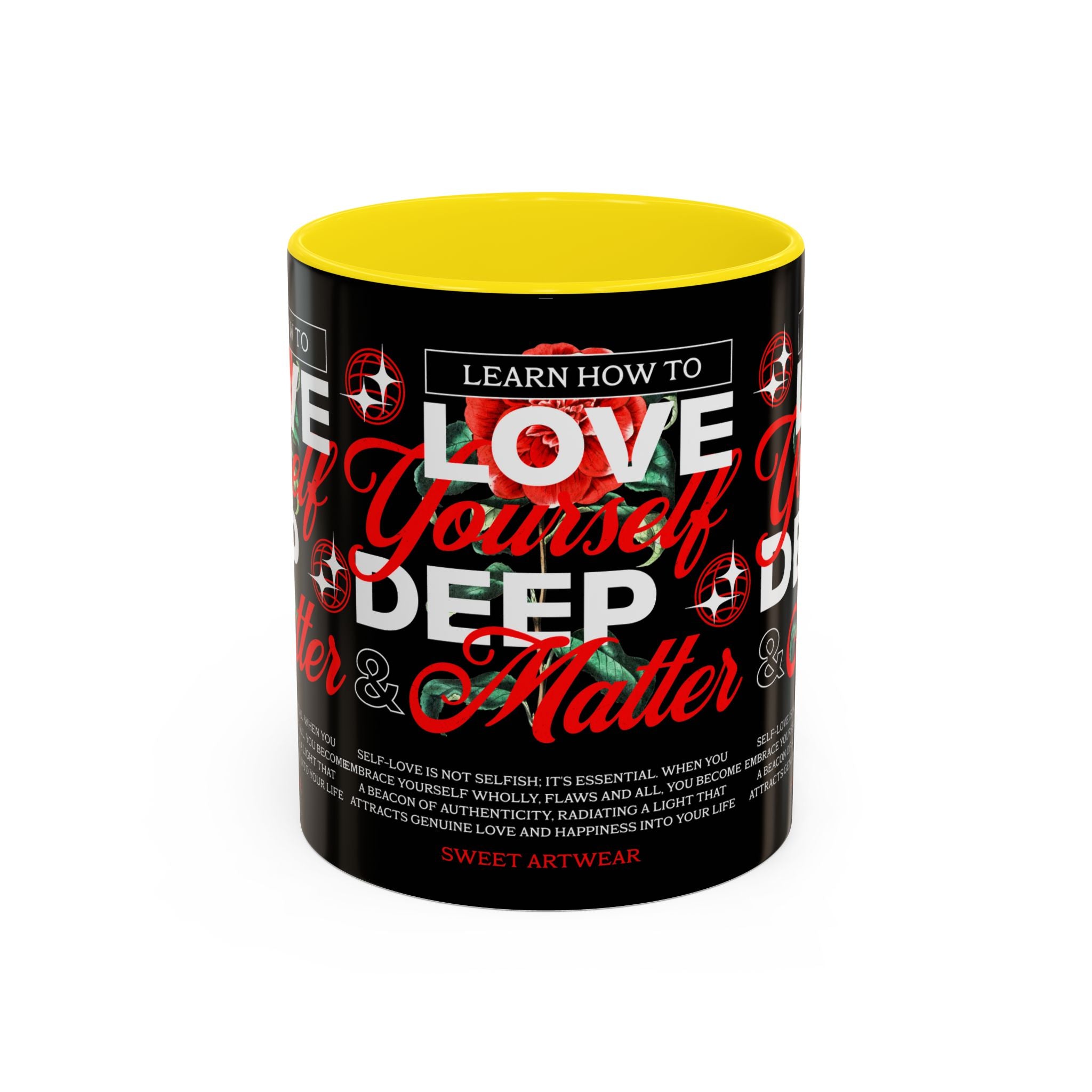 The Love Yourself Deep Accent Coffee Mug is more than just a mug β itβs a daily ritual of positivity and empowerment. Featuring bold typography, a striking red rose design, and motivational words, this mug inspires you to embrace confidence and self-love with every sip.