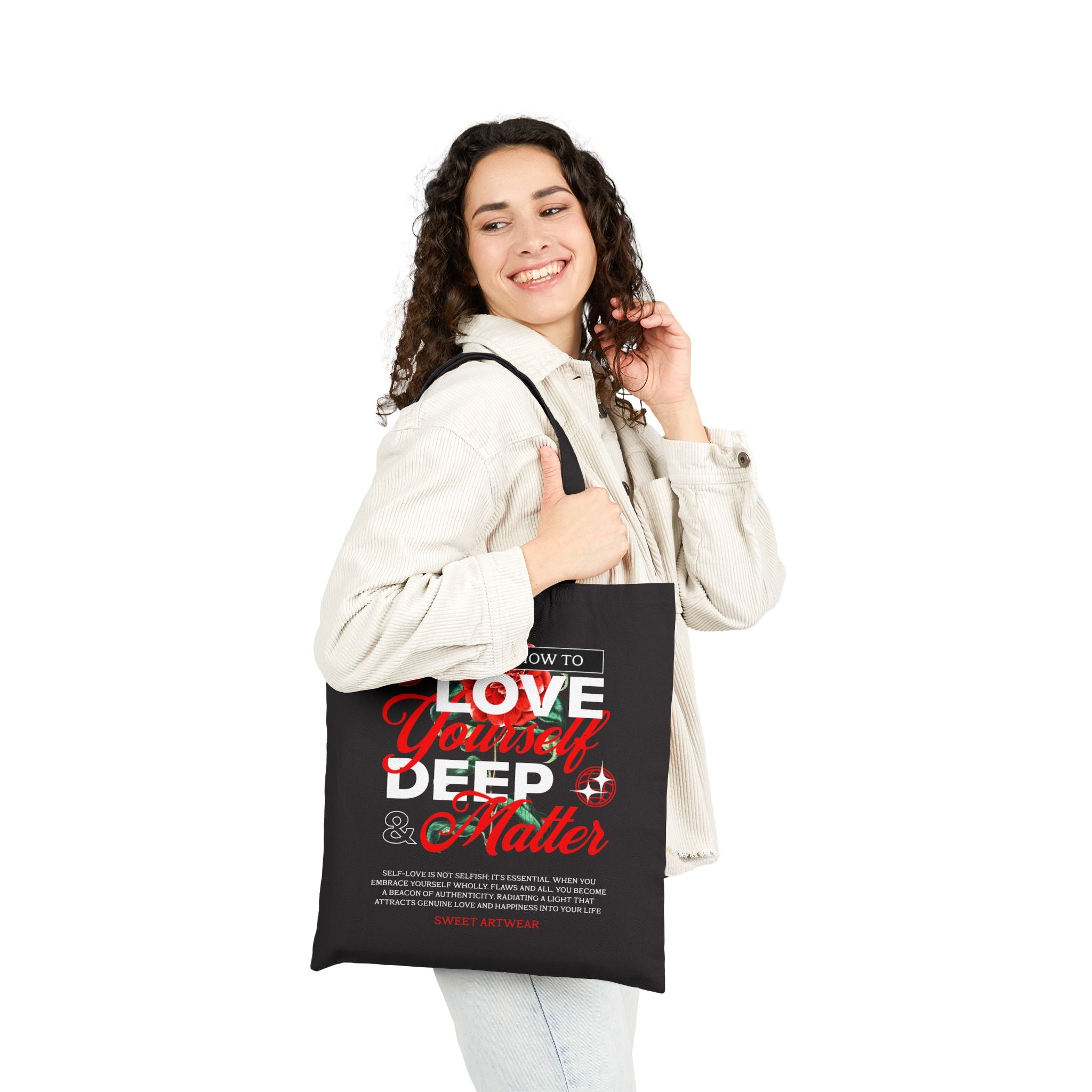 The Love Yourself Deep Cotton Canvas Tote Bag is more than just a bag — it’s a statement of empowerment and positivity. Featuring a bold red rose graphic with motivational self-love typography, this tote is a daily reminder to embrace authenticity and confidence.