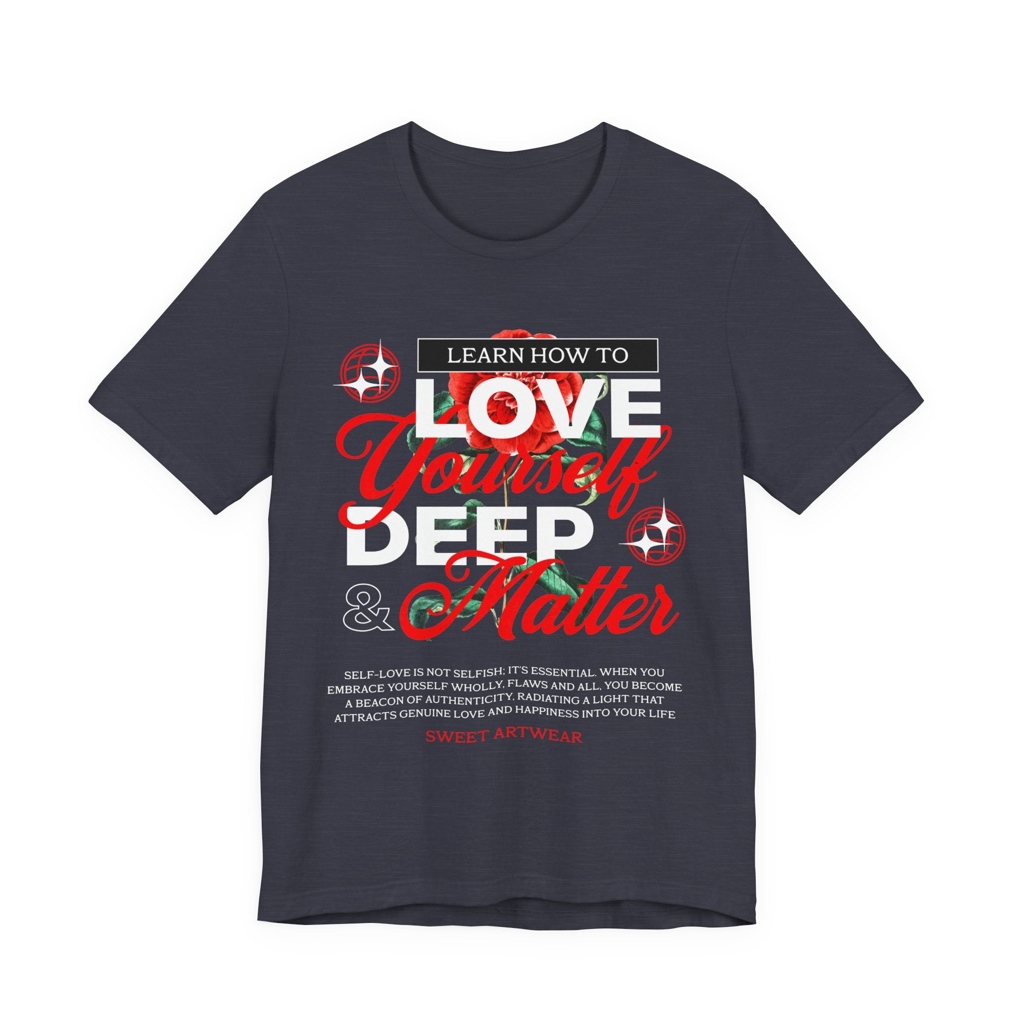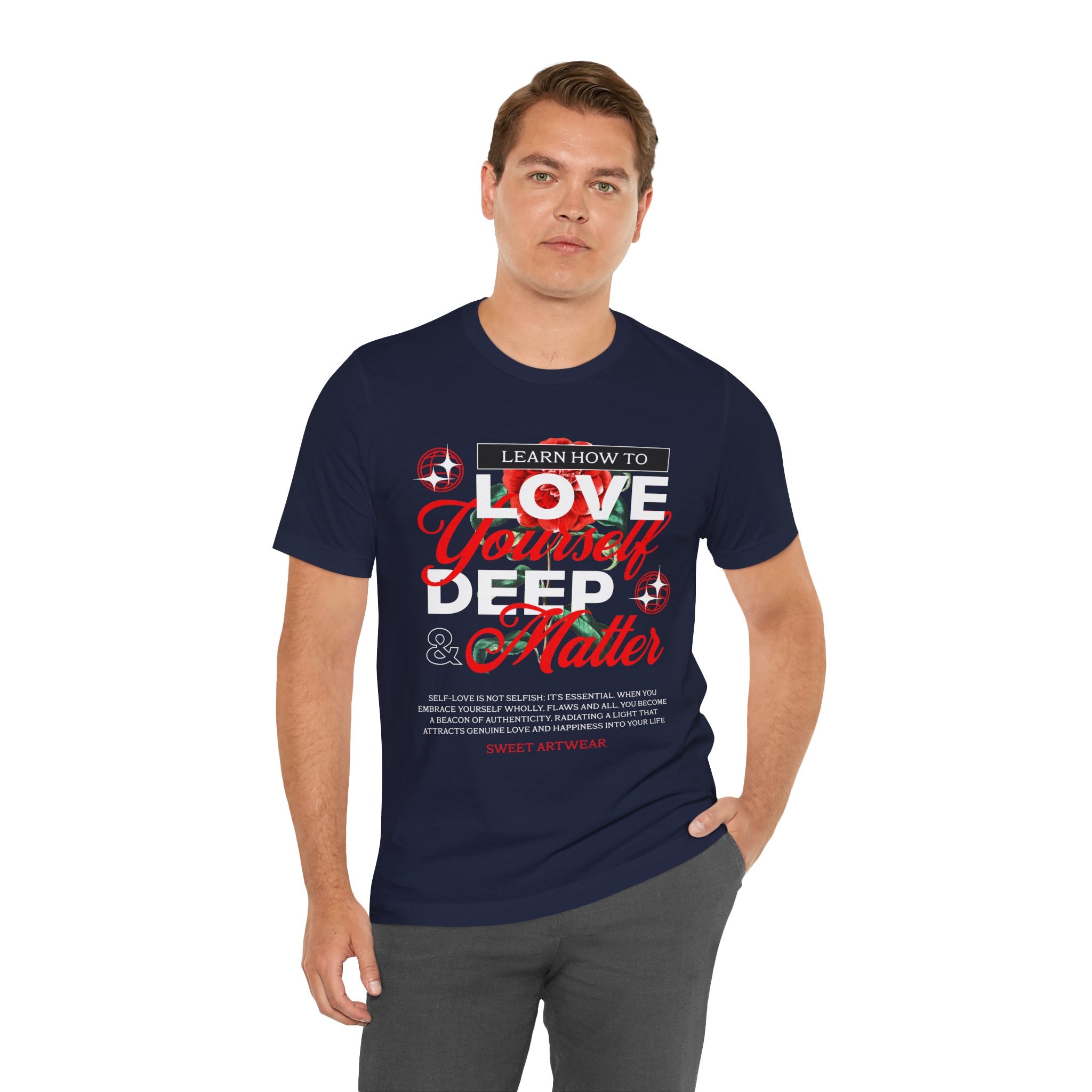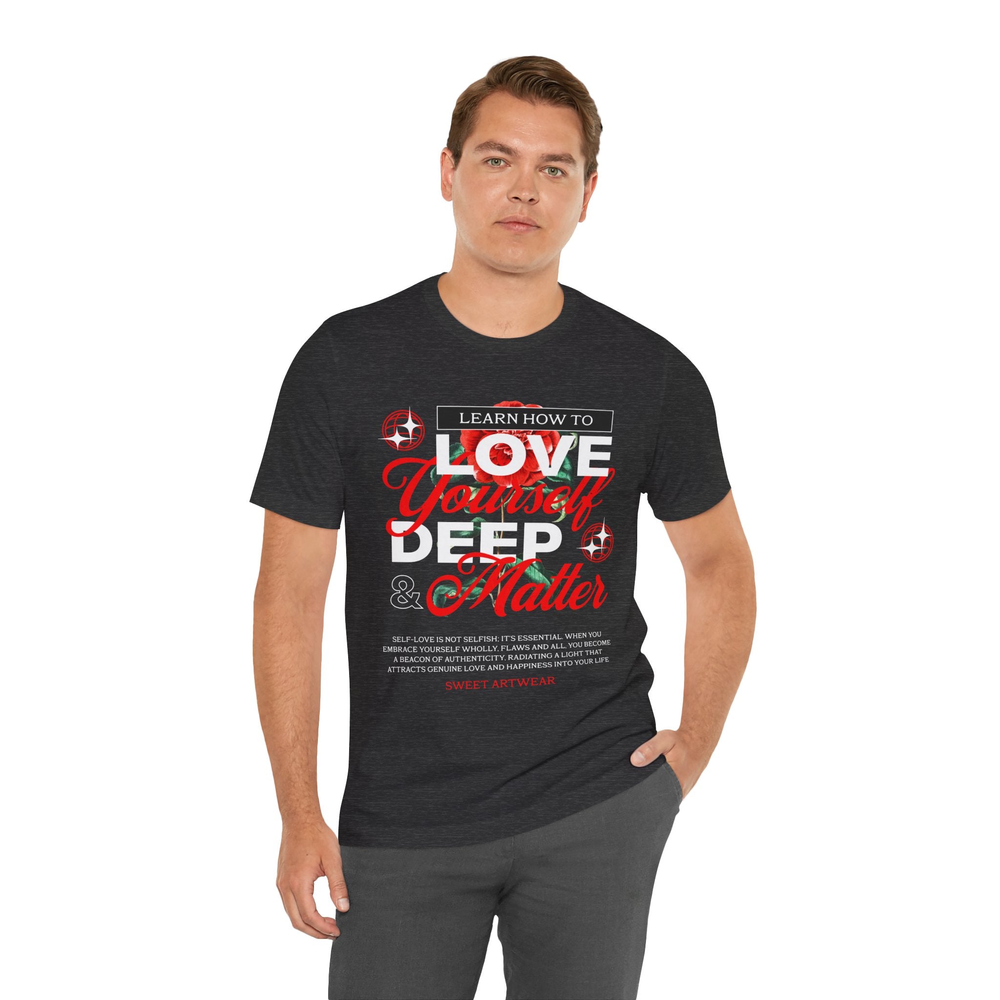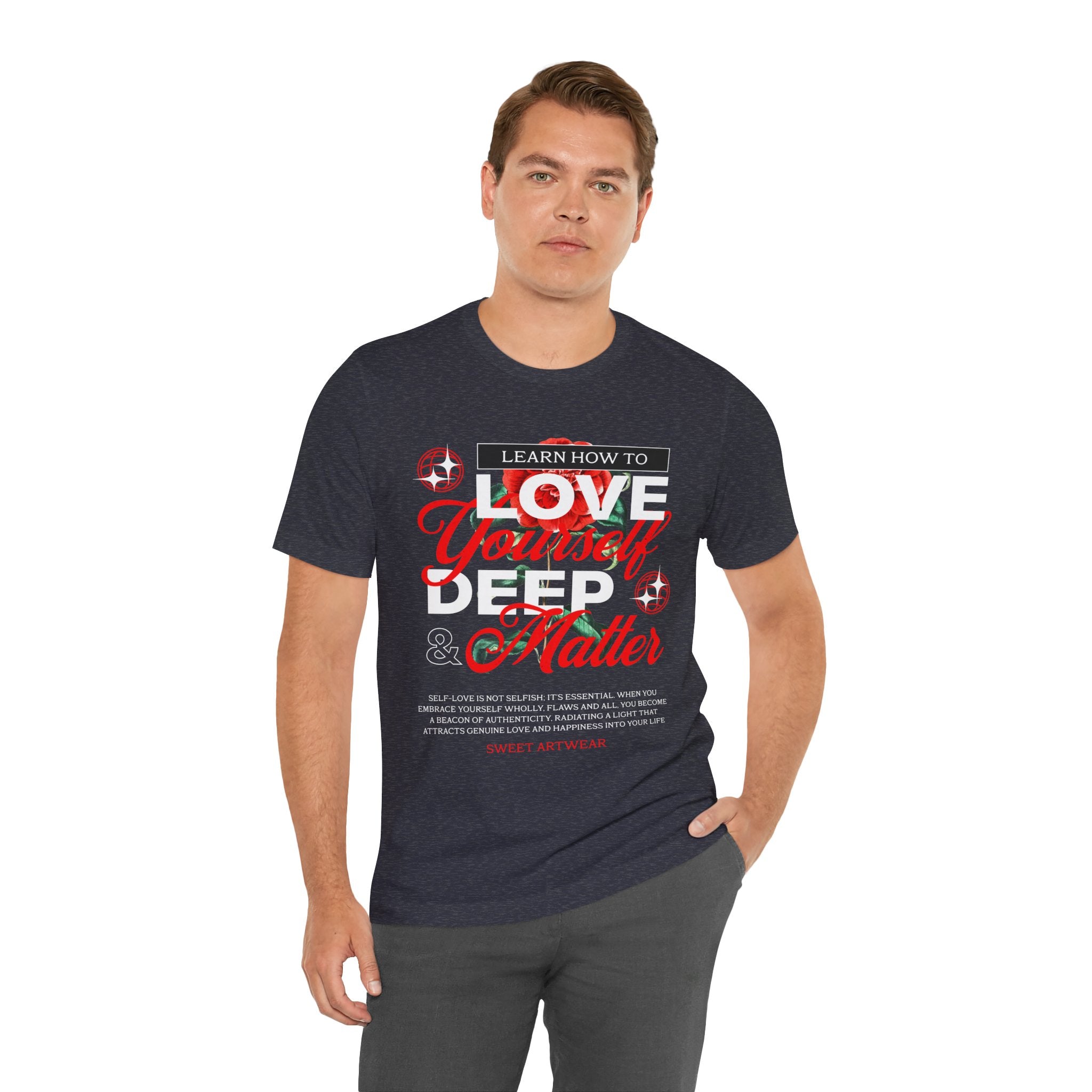 The Love Yourself Deep Unisex Jersey Short Sleeve Tee is a powerful reminder that self-love is strength, not selfishness. Featuring bold typography, a vibrant red rose graphic, and empowering words, this tee blends streetwear edge with motivational energy.
