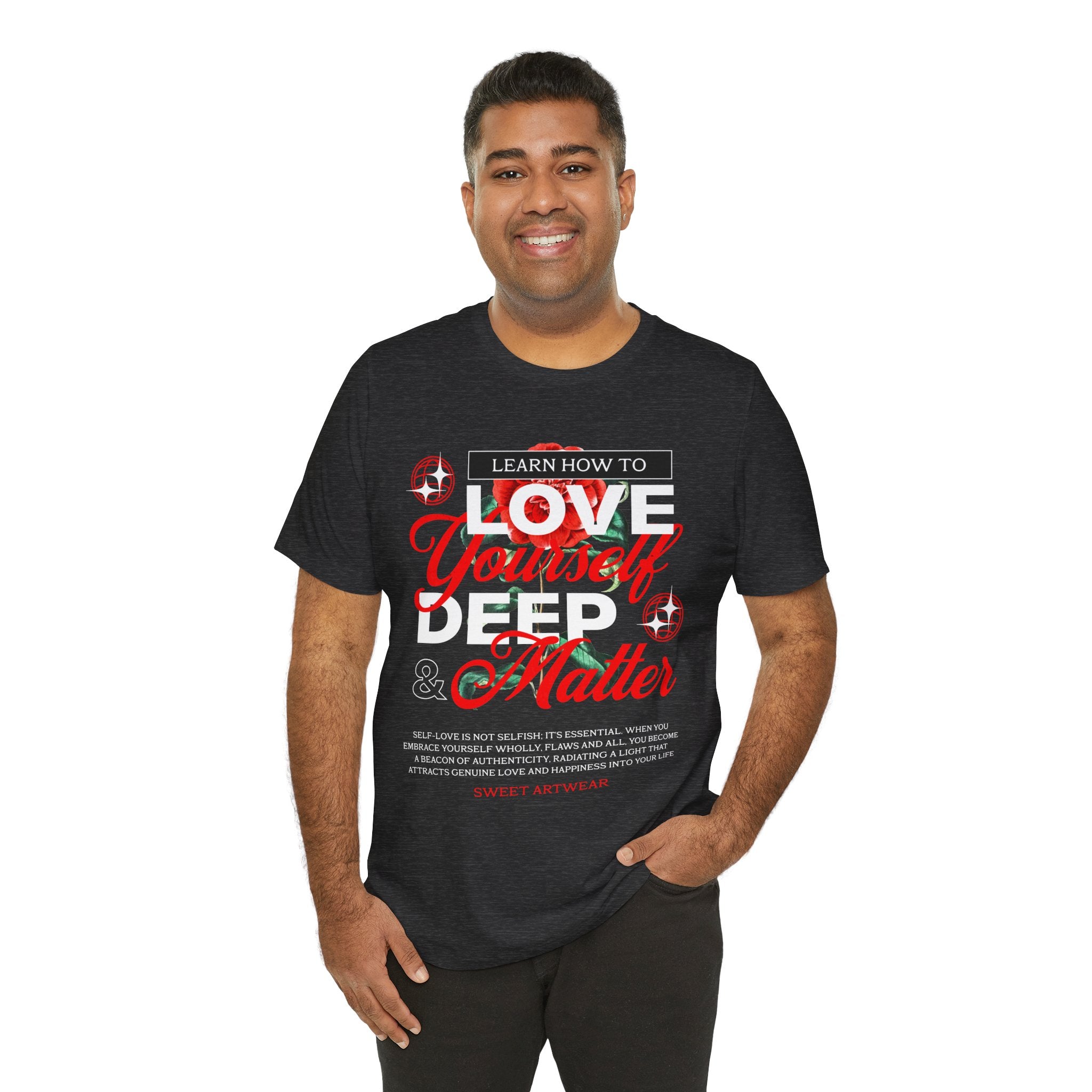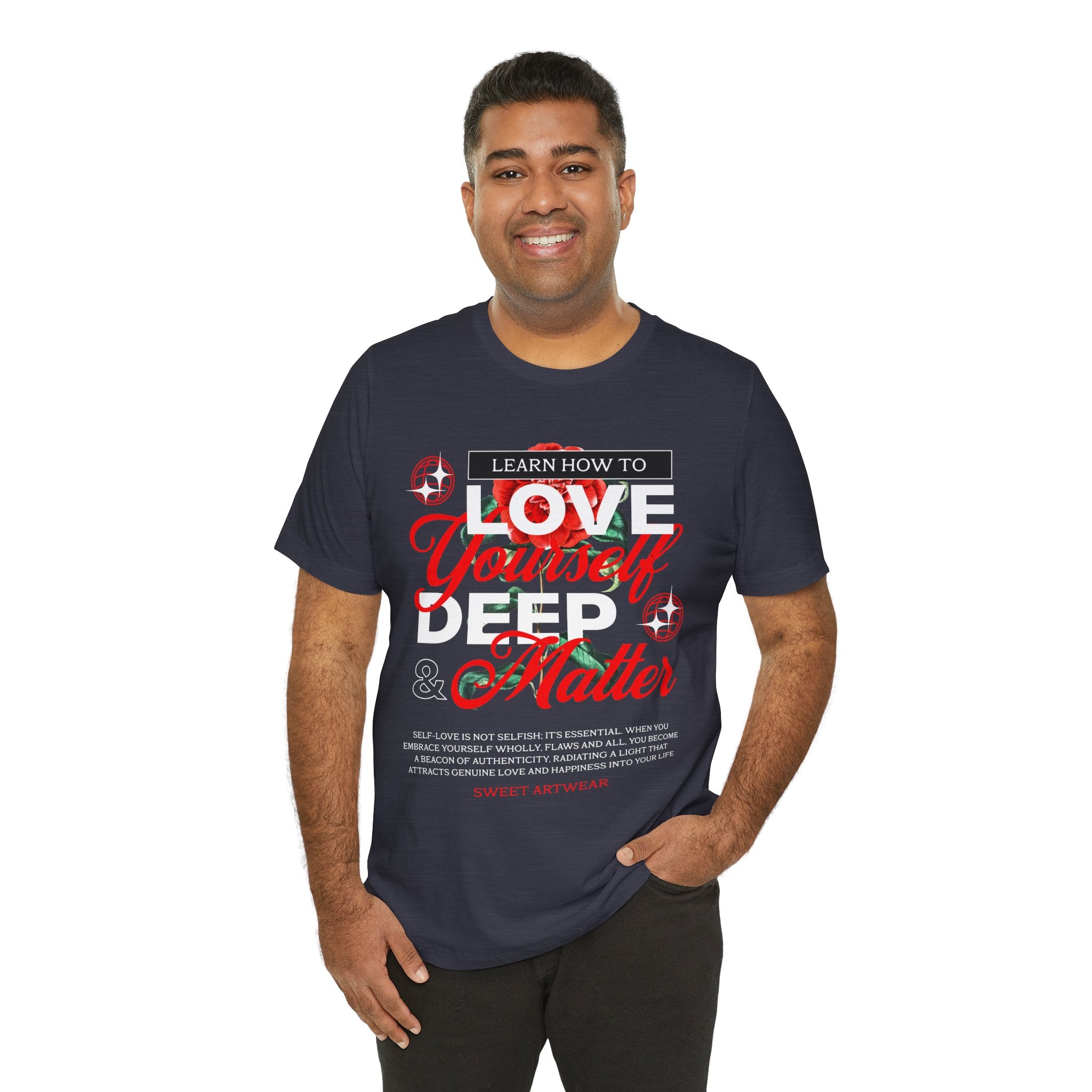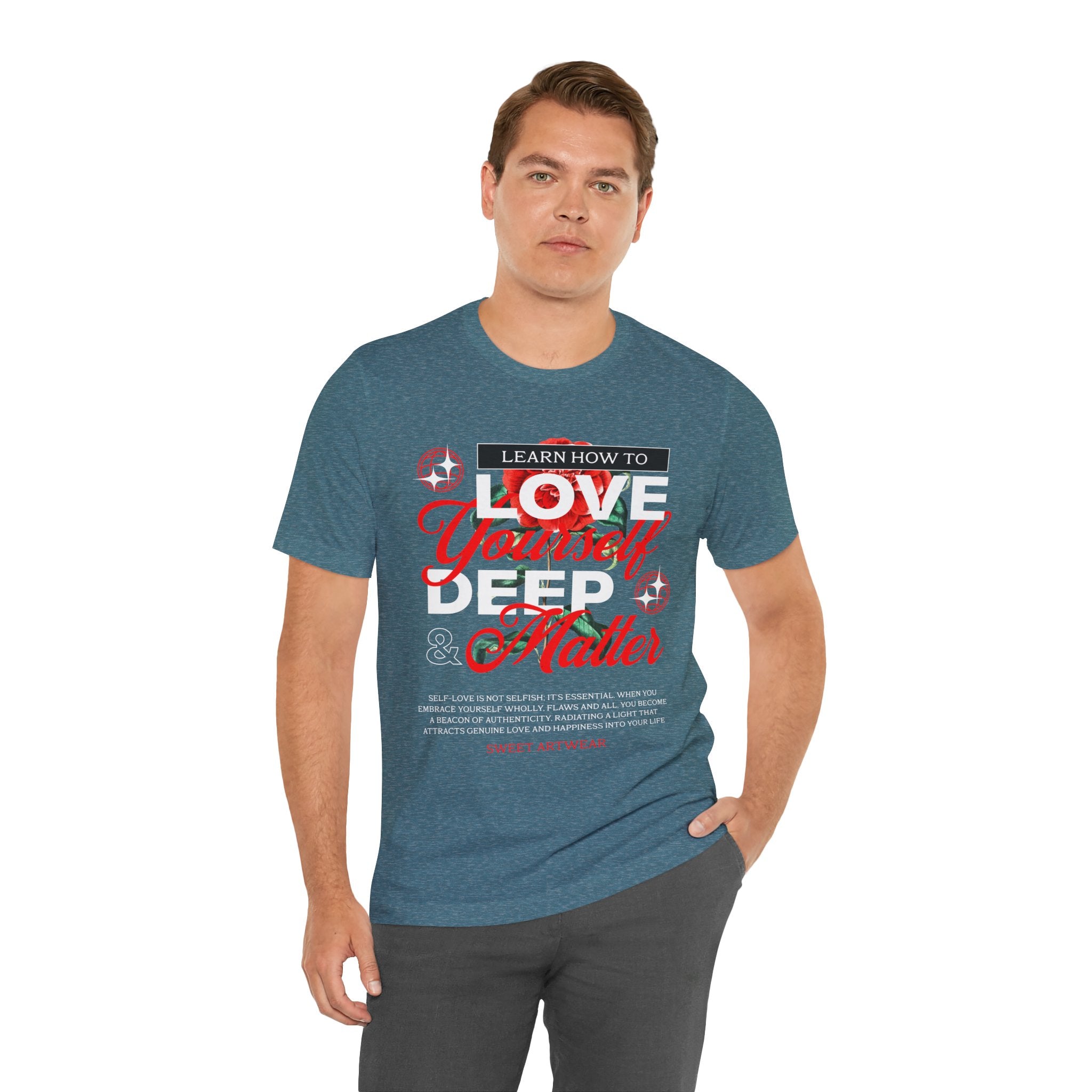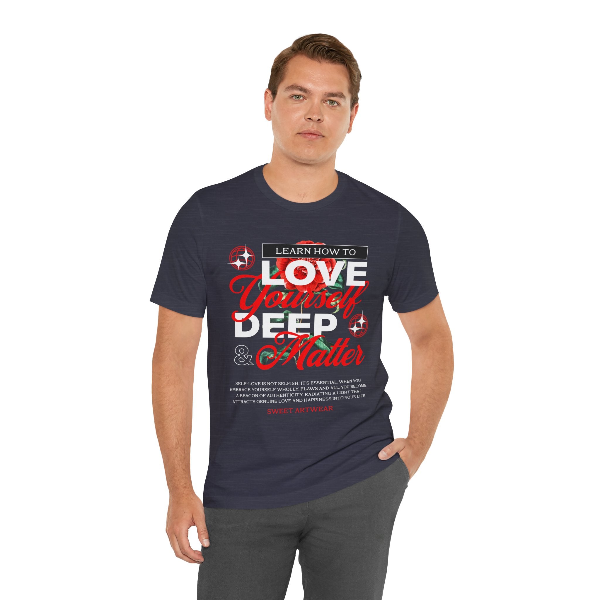 The Love Yourself Deep Unisex Jersey Short Sleeve Tee is a powerful reminder that self-love is strength, not selfishness. Featuring bold typography, a vibrant red rose graphic, and empowering words, this tee blends streetwear edge with motivational energy.